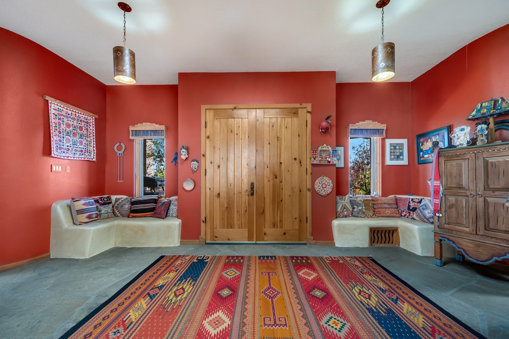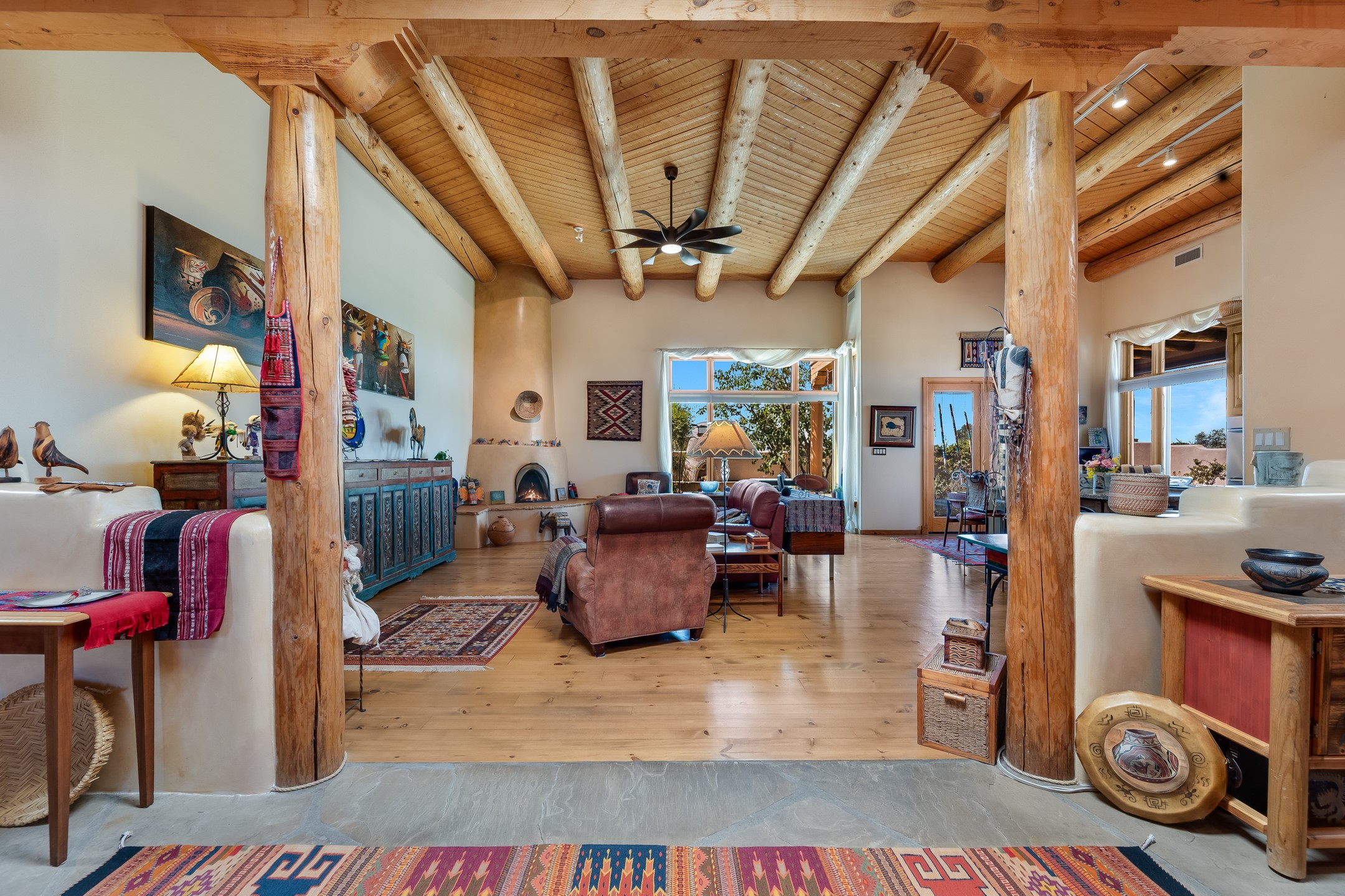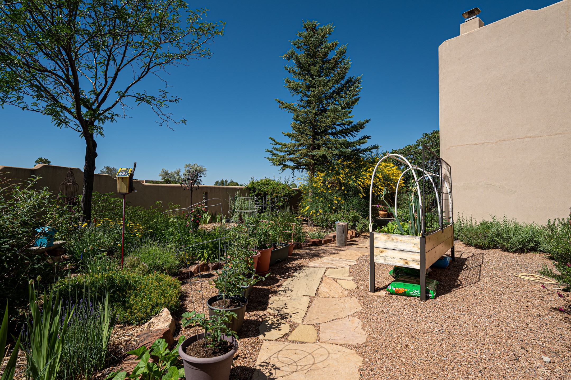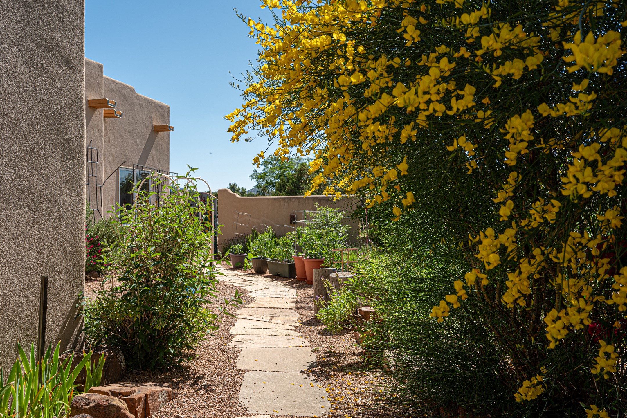 Priced to Sell! Exquisite Eastside Santa Fe 2700 sq.ft home in Eldorado built by Timothy House. Two beautifully landscaped, well established walled gardens create a private oasis on the south, west and north sides offering delightfully colorful views from the long grand 14ft high great room and dining room ceiling with 8ft high Pella windows. French doors lead out onto a large portal and 3 fireplaces including one in the garden for enjoyable outside entertainment. Viga beams, bancos, corbels and nichos add to the Santa Fe ambience and character. A lovely well designed kitchen featuring a large central island, granite counter tops, travertine backsplashes, custom cabinetry and updated appliances. The large owners suite includes a sitting area and kiva fireplace. A new silicone roof was installed in 2023 with a 20 year transferable warranty. A two zone central GFA heating and air-conditioning system on the roof makes for comfortable living year round. The guest area includes a large office which can double as a 3rd bedroom, the Murphy bed is not attached and will not be staying. There is even a secluded area for growing your own veggies. All this with Eldorado amenities close by, local shopping and services only minutes into Santa Fe.