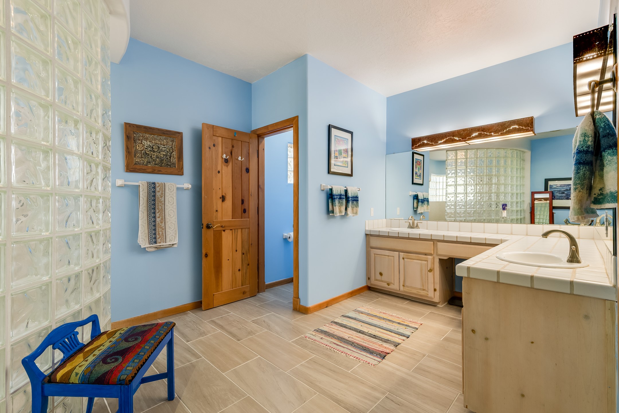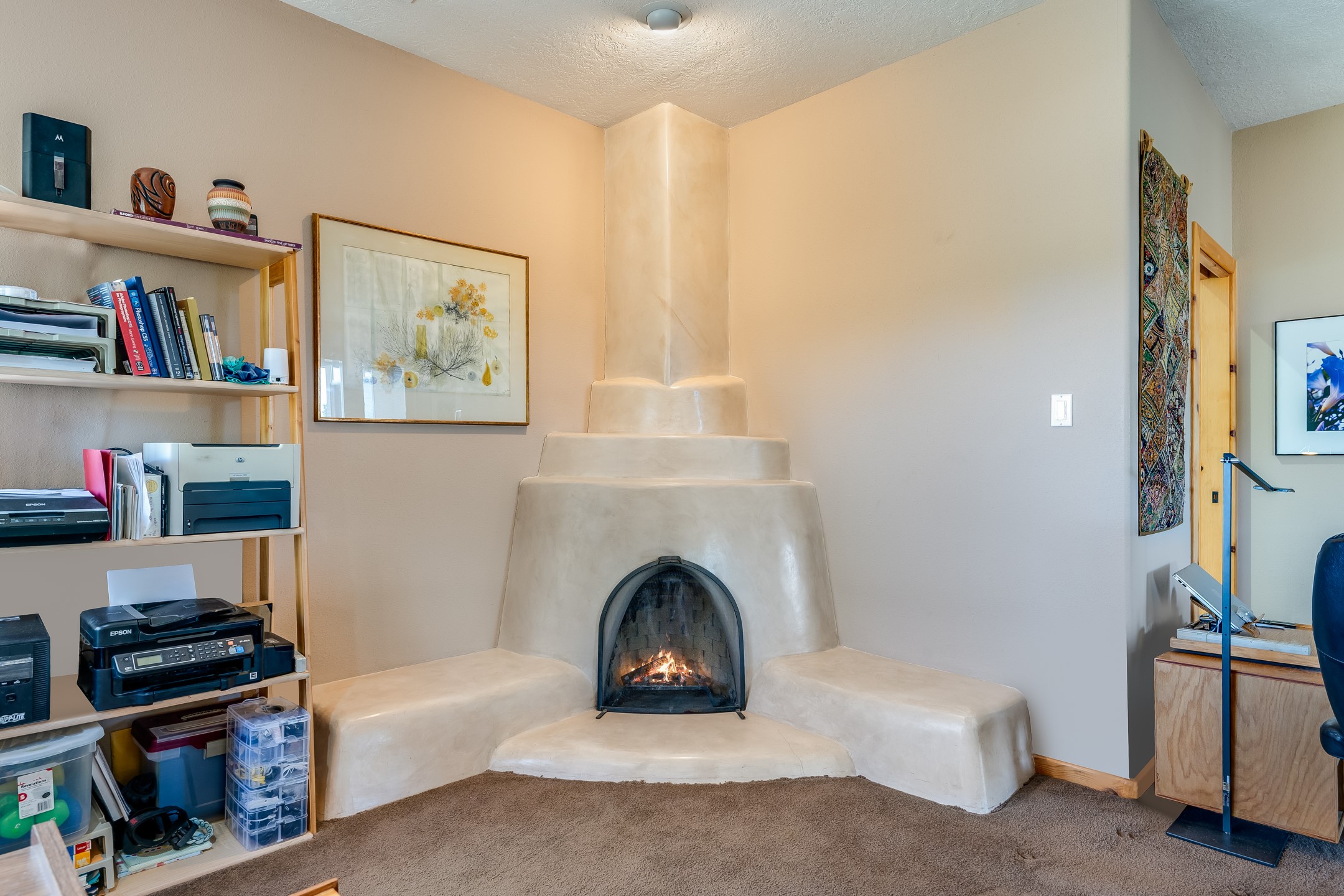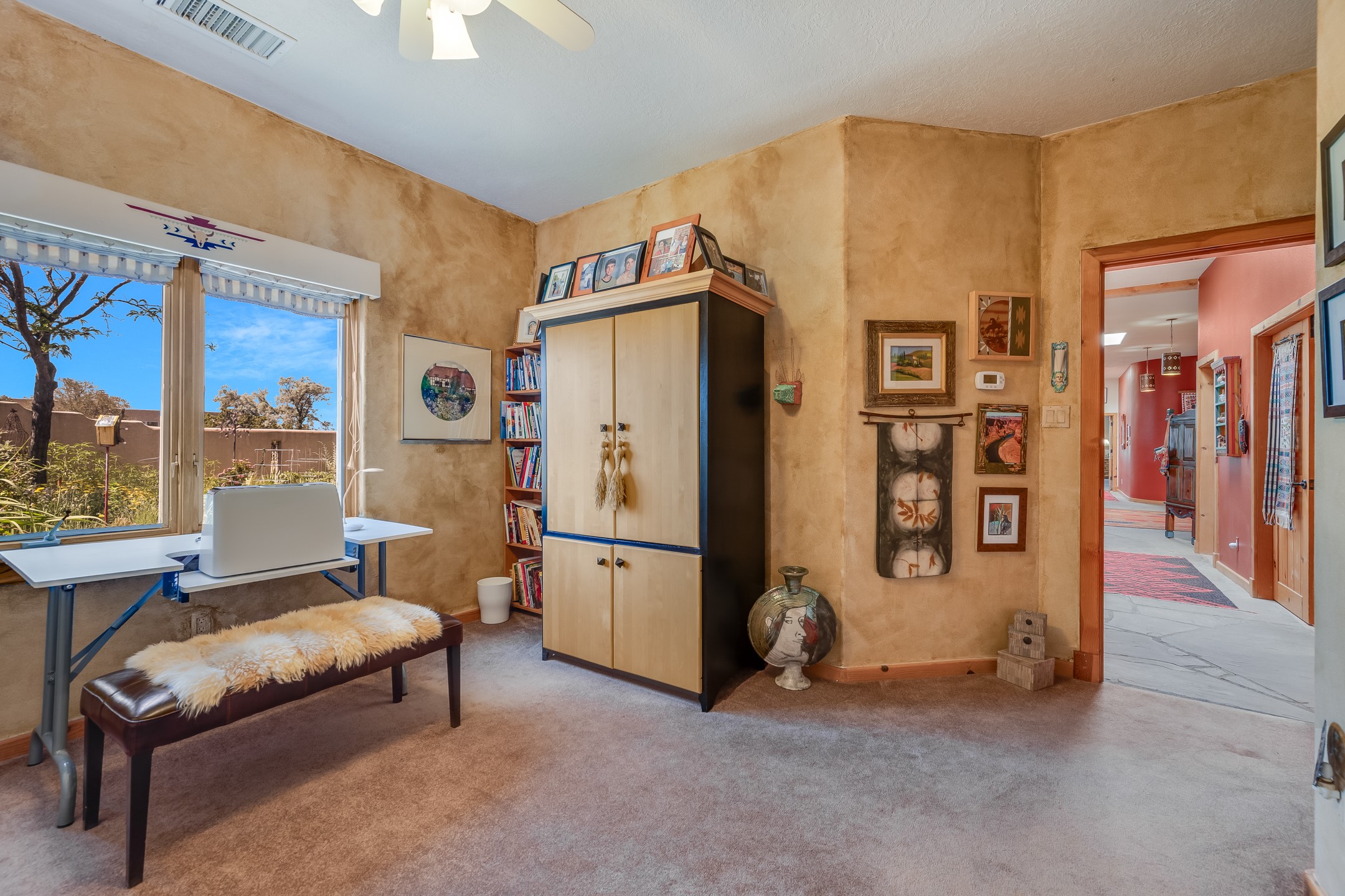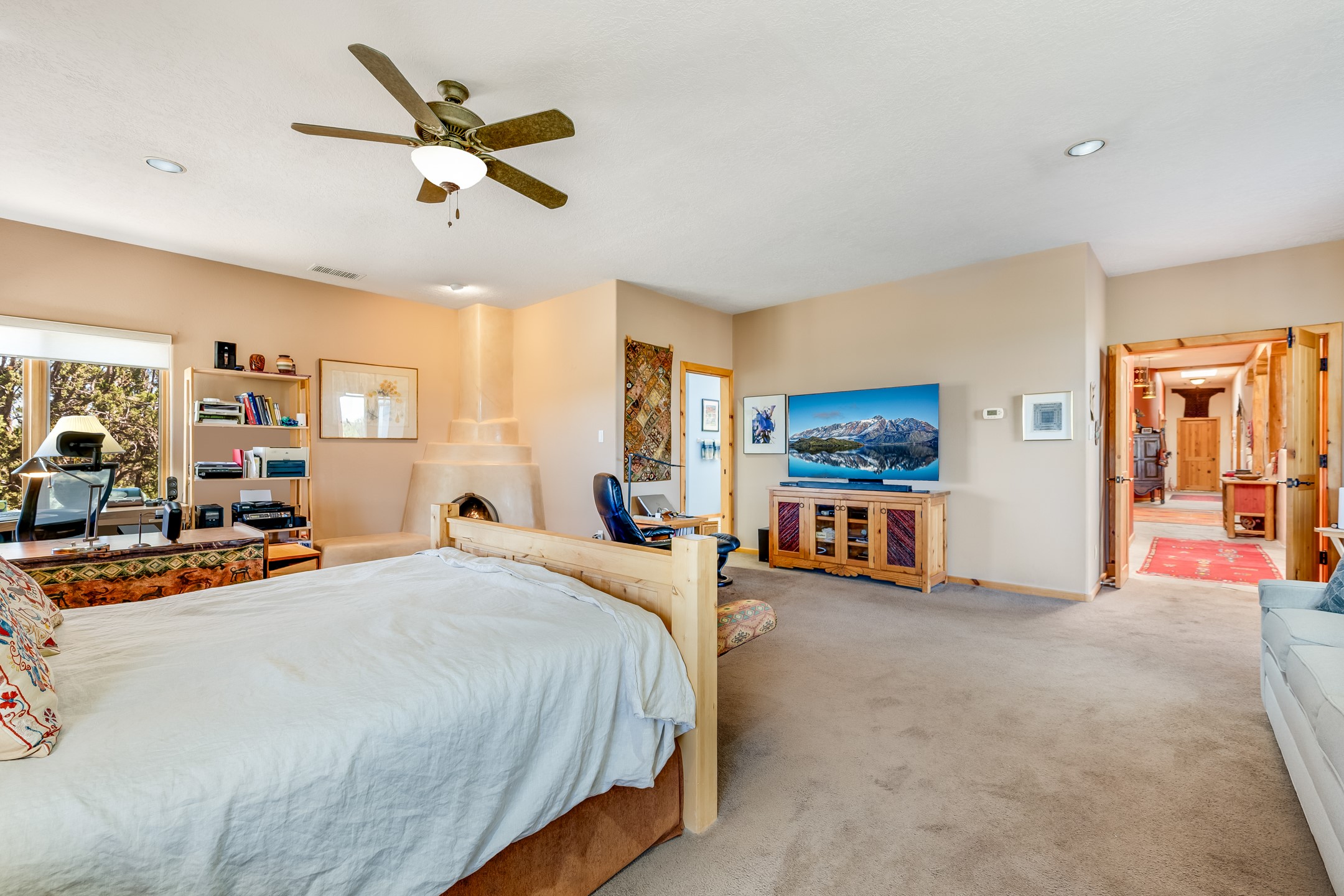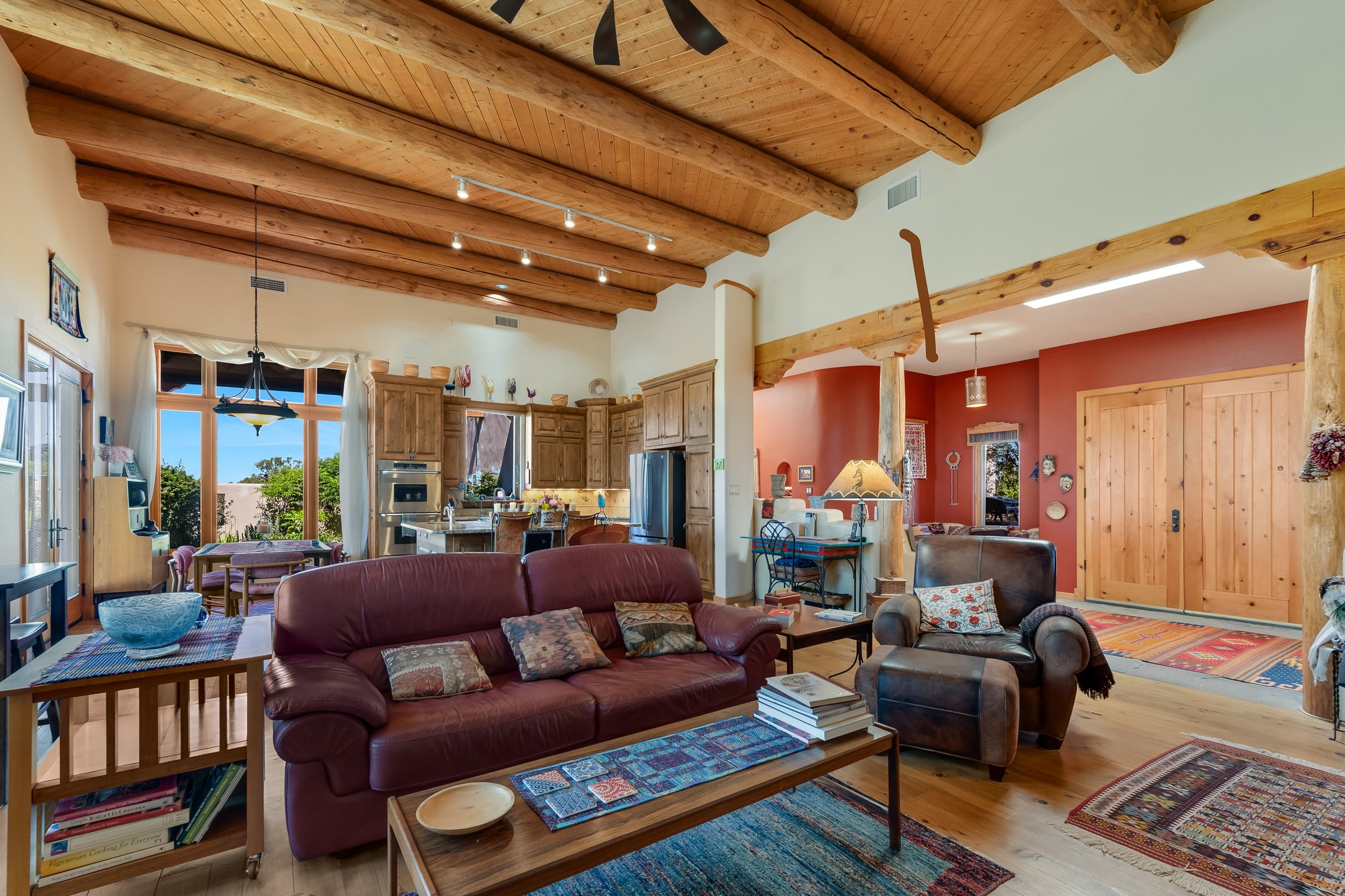 Priced to Sell! Exquisite Eastside Santa Fe 2700 sq.ft home in Eldorado built by Timothy House. Two beautifully landscaped, well established walled gardens create a private oasis on the south, west and north sides offering delightfully colorful views from the long grand 14ft high great room and dining room ceiling with 8ft high Pella windows. French doors lead out onto a large portal and 3 fireplaces including one in the garden for enjoyable outside entertainment. Viga beams, bancos, corbels and nichos add to the Santa Fe ambience and character. A lovely well designed kitchen featuring a large central island, granite counter tops, travertine backsplashes, custom cabinetry and updated appliances. The large owners suite includes a sitting area and kiva fireplace. A new silicone roof was installed in 2023 with a 20 year transferable warranty. A two zone central GFA heating and air-conditioning system on the roof makes for comfortable living year round. The guest area includes a large office which can double as a 3rd bedroom, the Murphy bed is not attached and will not be staying. There is even a secluded area for growing your own veggies. All this with Eldorado amenities close by, local shopping and services only minutes into Santa Fe.