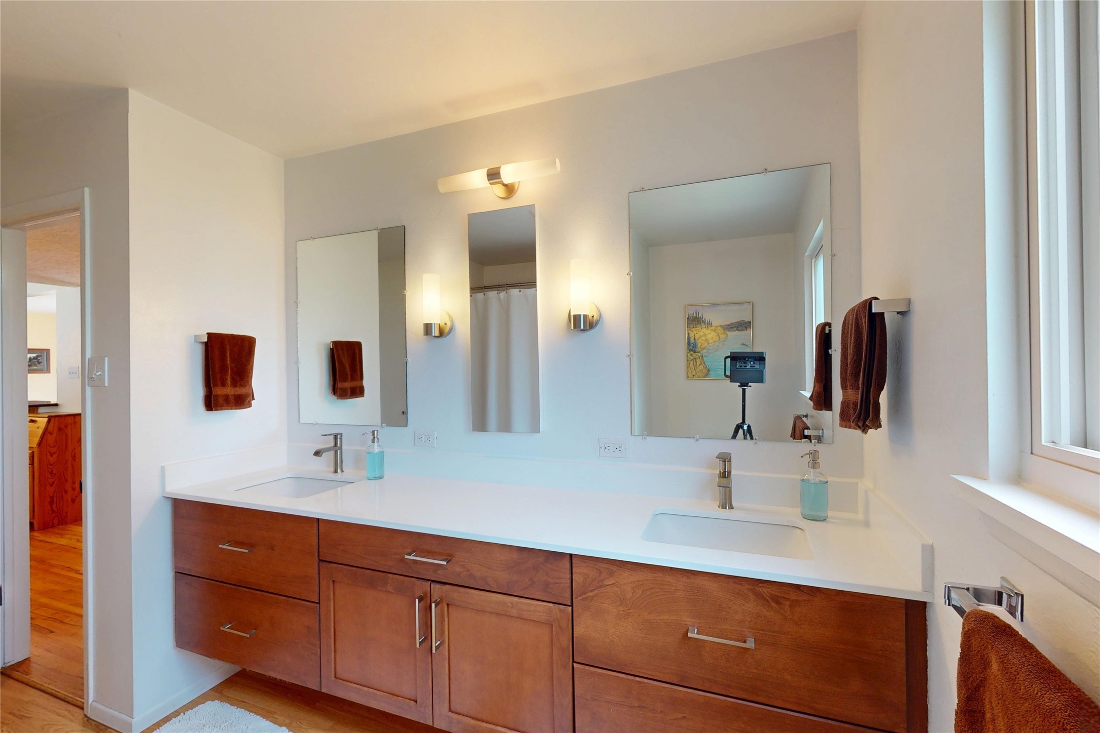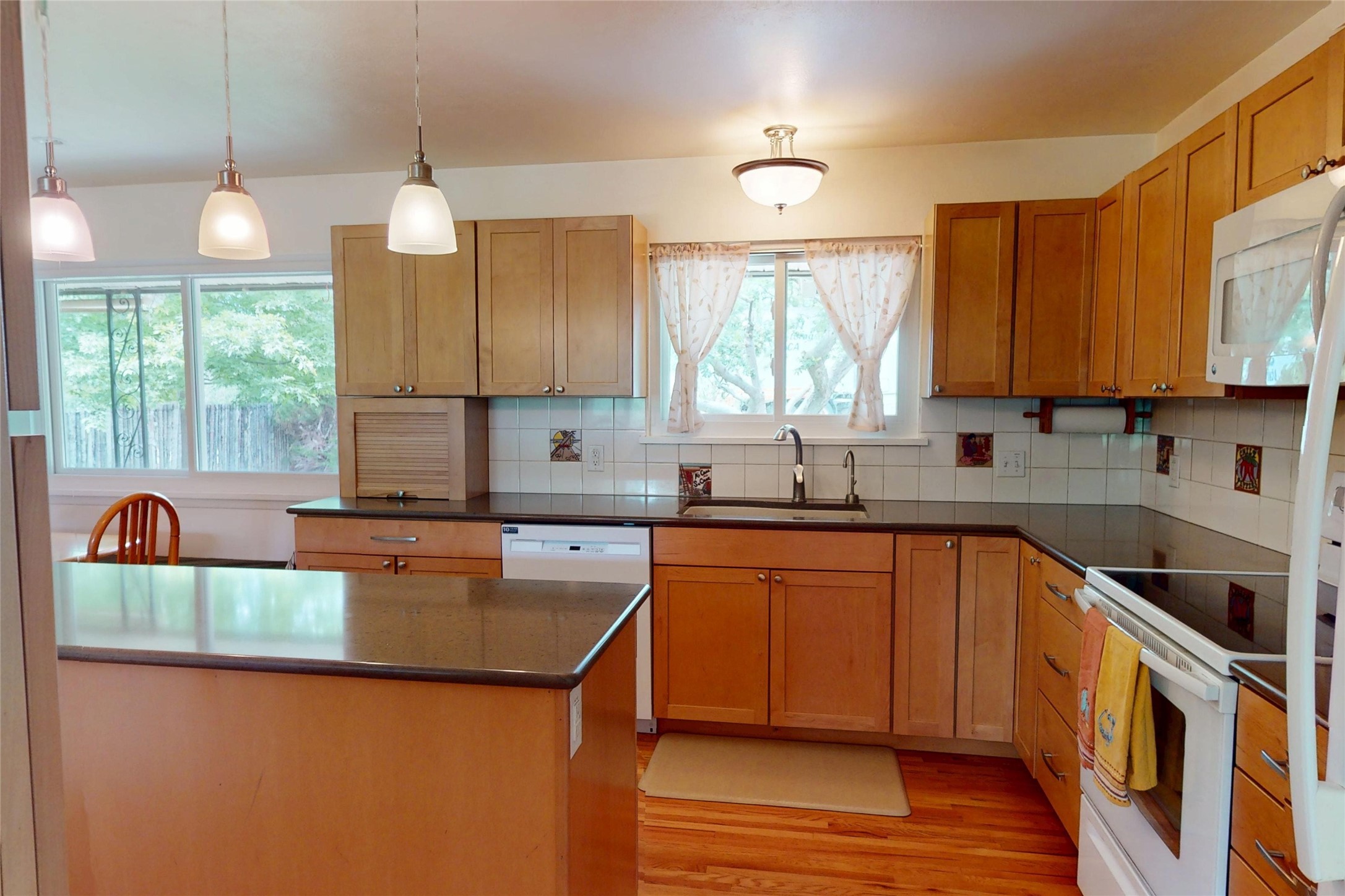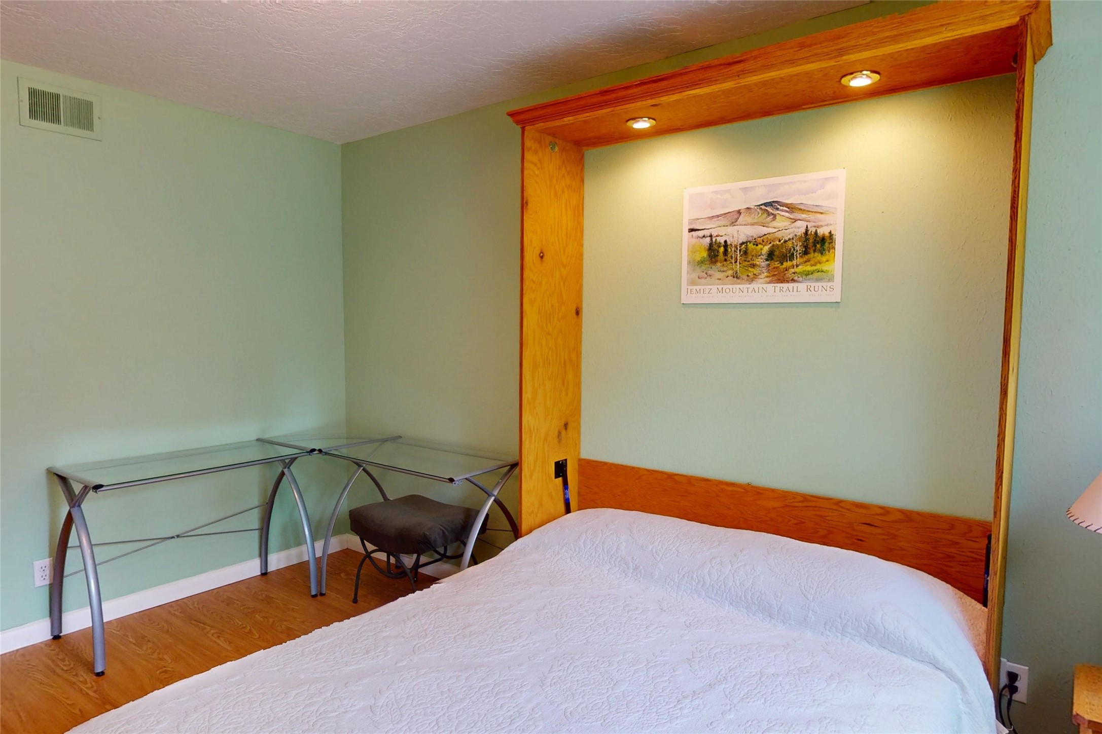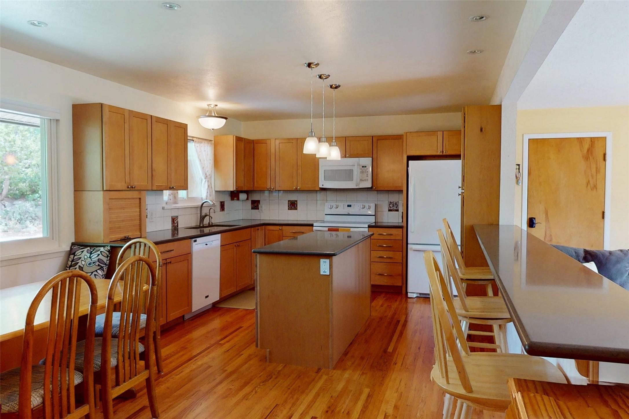 Serene Barranca Mesa Retreat with canyon access from the gently sloping backyard. This is a rare opportunity to own a Stamm-built home on a peaceful cul-de-sac in one of Los Alamos' most sought-after neighborhoods. This well-maintained, smoke-free and pet-free property offers direct access to the county trail system and is just two blocks from Barranca Mesa Elementary. Nestled on over half an acre of lush canyon land, this home invites you to enjoy nature, privacy, and timeless quality. Inside, you'll find 3 bedrooms, 2 bathrooms, and over 2,500 square feet of bright, airy living space. The home is filled with natural light and has been lovingly cared for by only its second owners. Original oak hardwood floors grace the main level, while the downstairs features new laminate flooring and a cozy gas fireplace. The updated kitchen and bathrooms offer modern comfort, and a newly added sunroom provides a wonderful space for relaxing or entertaining year-round. Additional highlights include: new windows and remote-controlled automatic shades for the picture window, minimal carpet for easy maintenance, and a versatile bonus room downstairs--perfect for hobbies or a home office. Outside is your own private sanctuary - a stunning half acre lot, teeming with mature trees and birds. The professionally landscaped front yard features irrigation, while the backyard is beautifully natural with drip irrigation in place. A relaxing gazebo, a well-maintained hot tub, and extra driveway space for RV parking complete the picture. With a durable metal roof, quiet surroundings, and a genuine connection to the outdoors, this canyon-side property offers the perfect balance of comfort, convenience, and tranquility. Don't miss your chance to own this gem in Barranca Mesa--schedule your showing today.