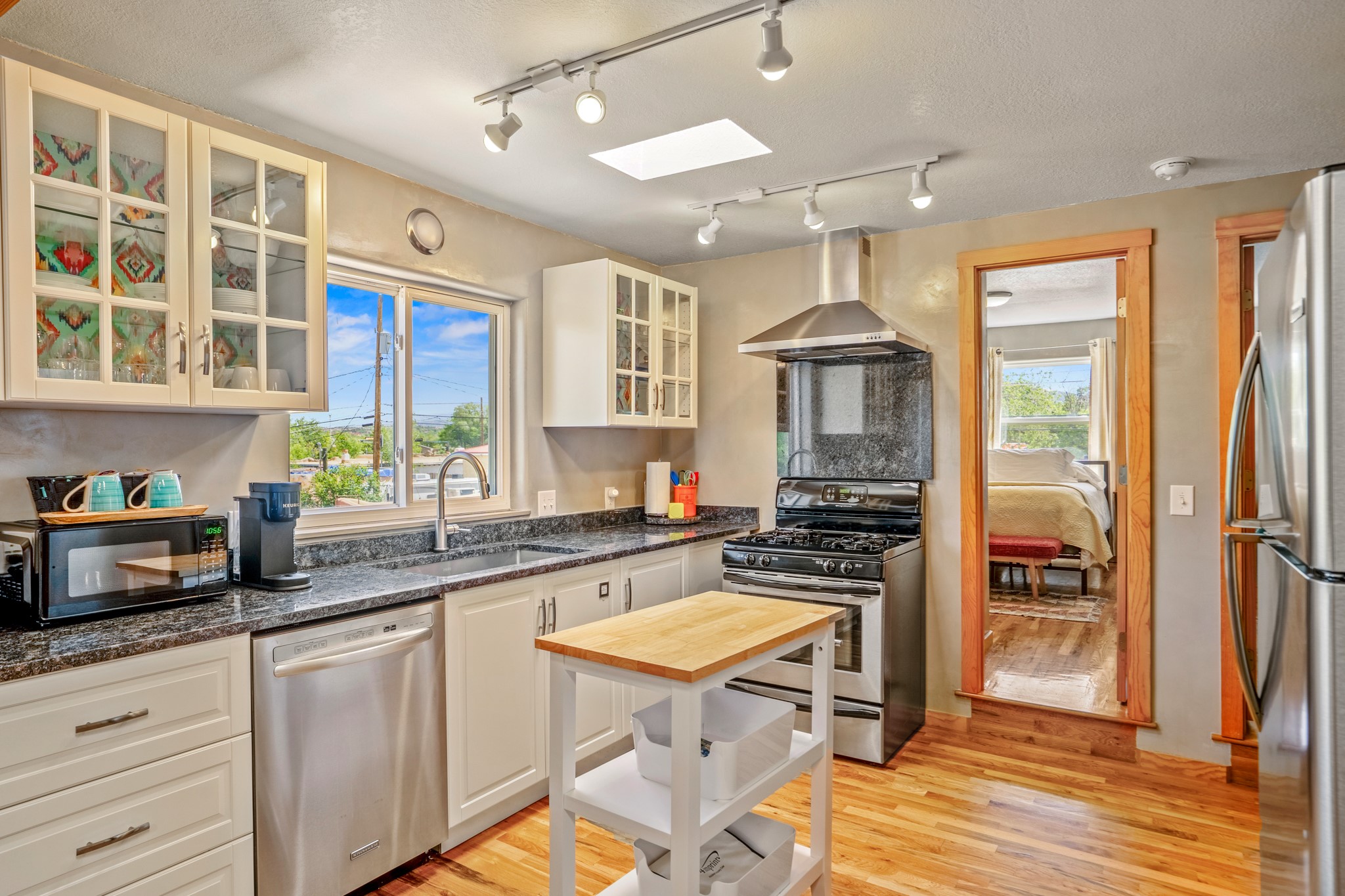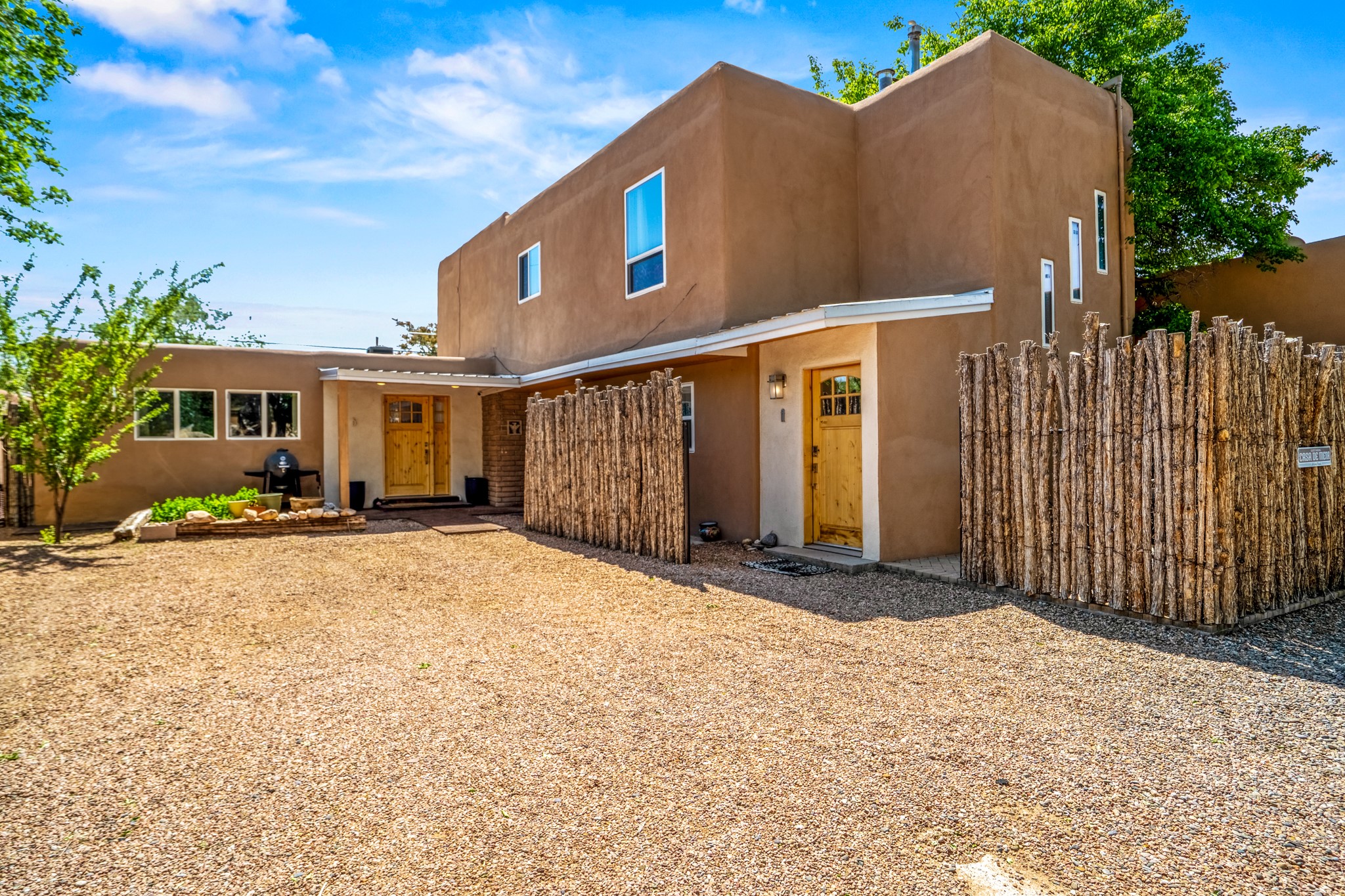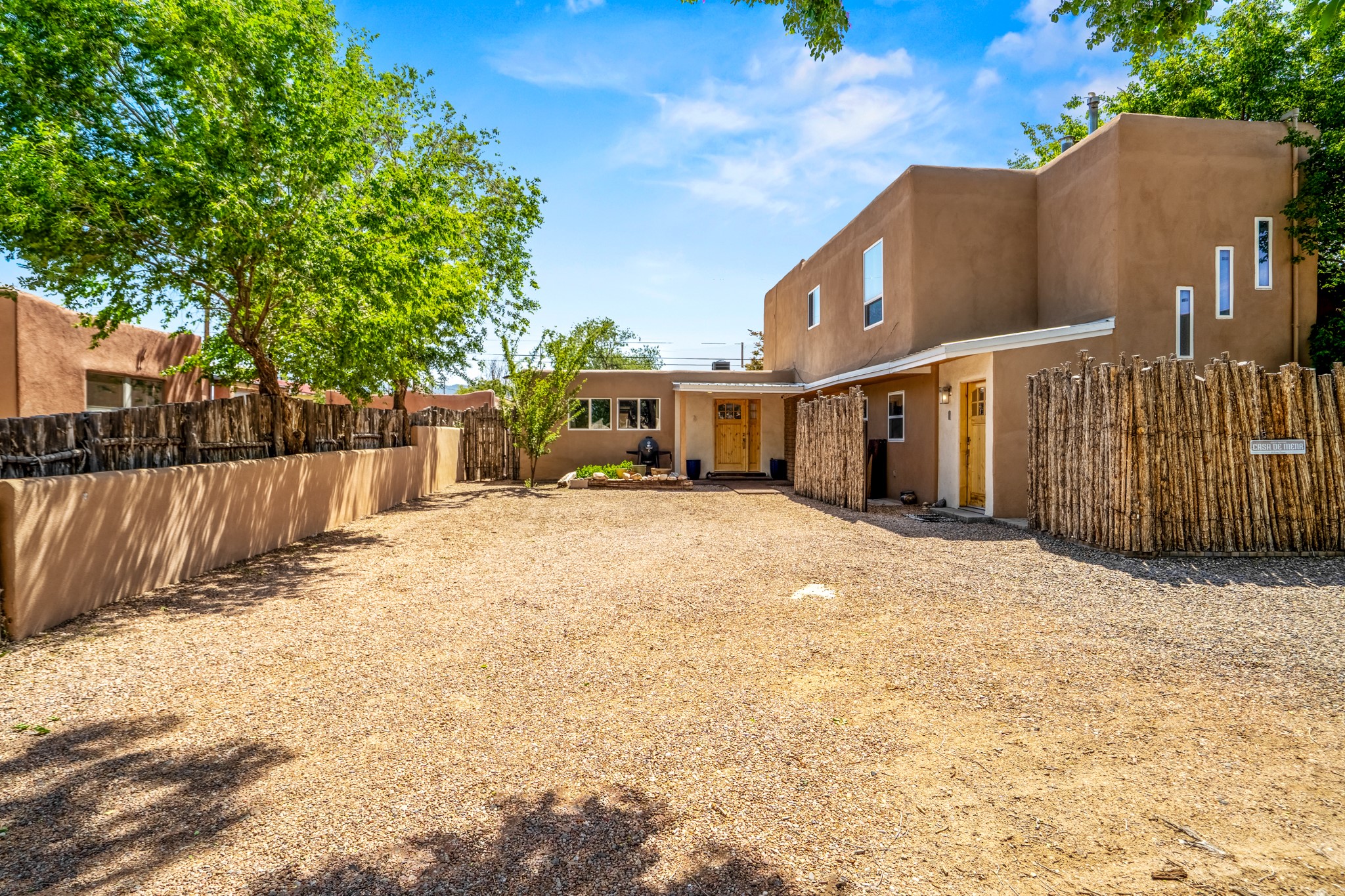 Versatile Income Property Just One Block from the Railyard District! Just steps from the vibrant Santa Fe Railyard, this thoughtfully renovated compound offers flexibility, privacy, and excellent income potential. The single-level 3-bedroom, 2-bathroom main residence spans 1,487 sq. ft., with an open-concept kitchen/living/ dining area featuring beautiful Venetian plaster walls, butcher block countertops, and direct access to a private back courtyard. The primary suite includes a spacious walk-in closet and its own secluded patio. Comfort is ensured year-round with in-floor radiant heating and central A/C. Set to the side for maximum privacy, the 1,192 sq. ft. guest house offers 3 bedrooms, 2 bathrooms, a full kitchen, its own laundry, and a serene courtyard shaded by tall trees--an ideal retreat for guests or a proven income-producing rental. Separating the two dwellings is a 300 sq. ft. workshop/storage room that adds even more functionality to the property.This is a rare opportunity to live just one block from the Railyard--with space to live, host, create, or invest.