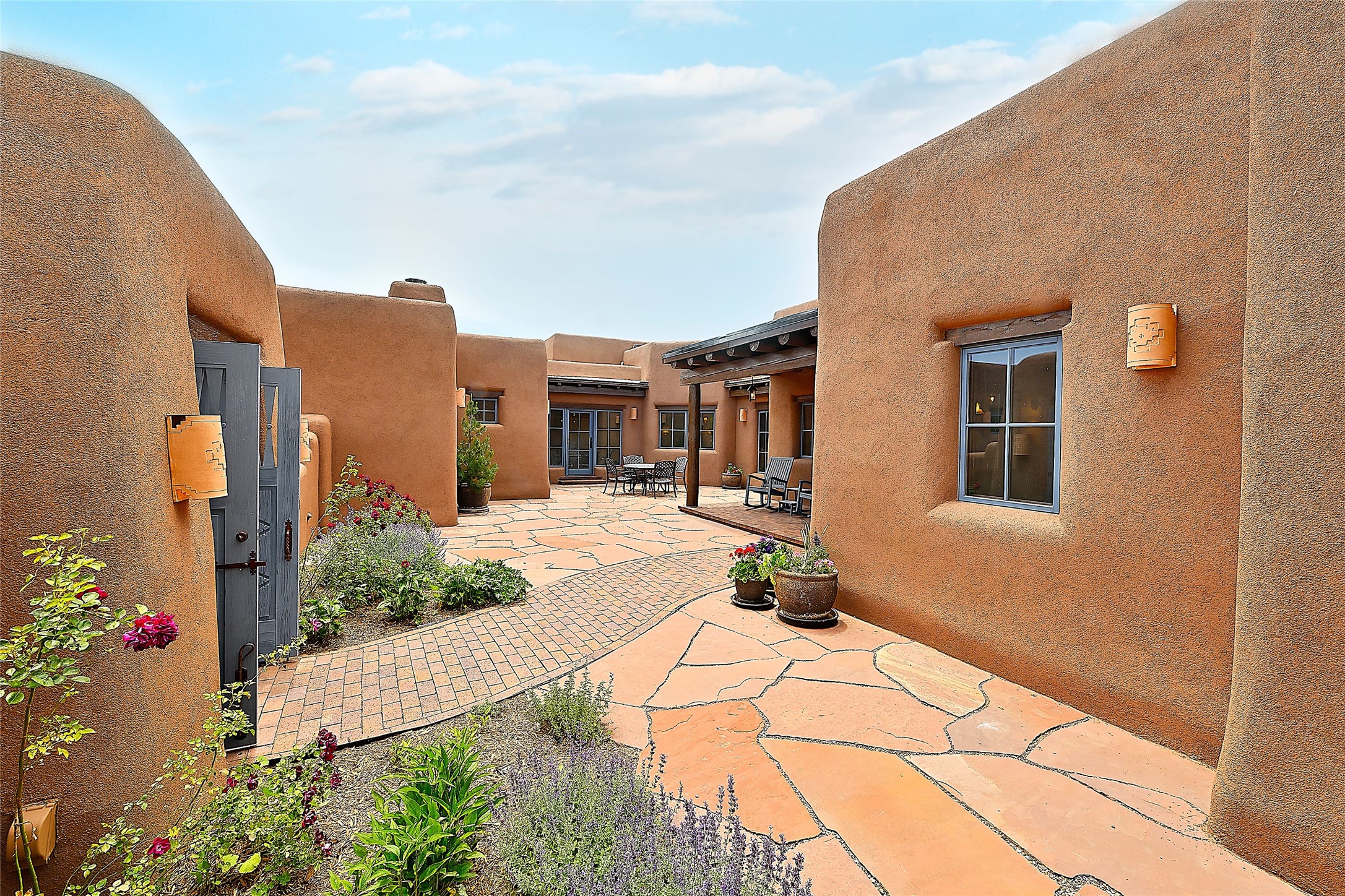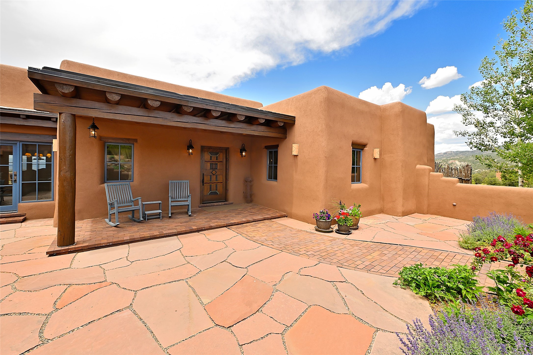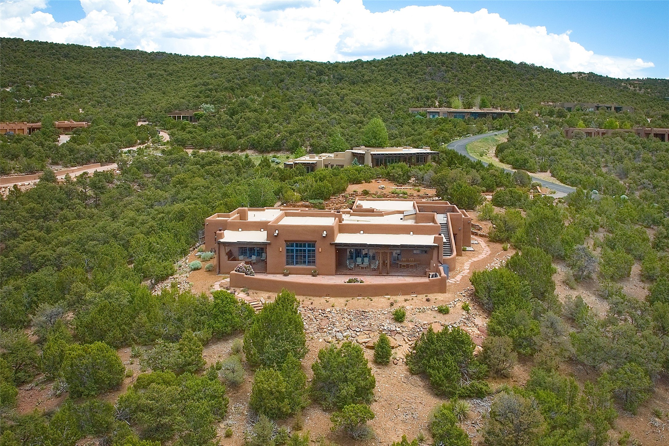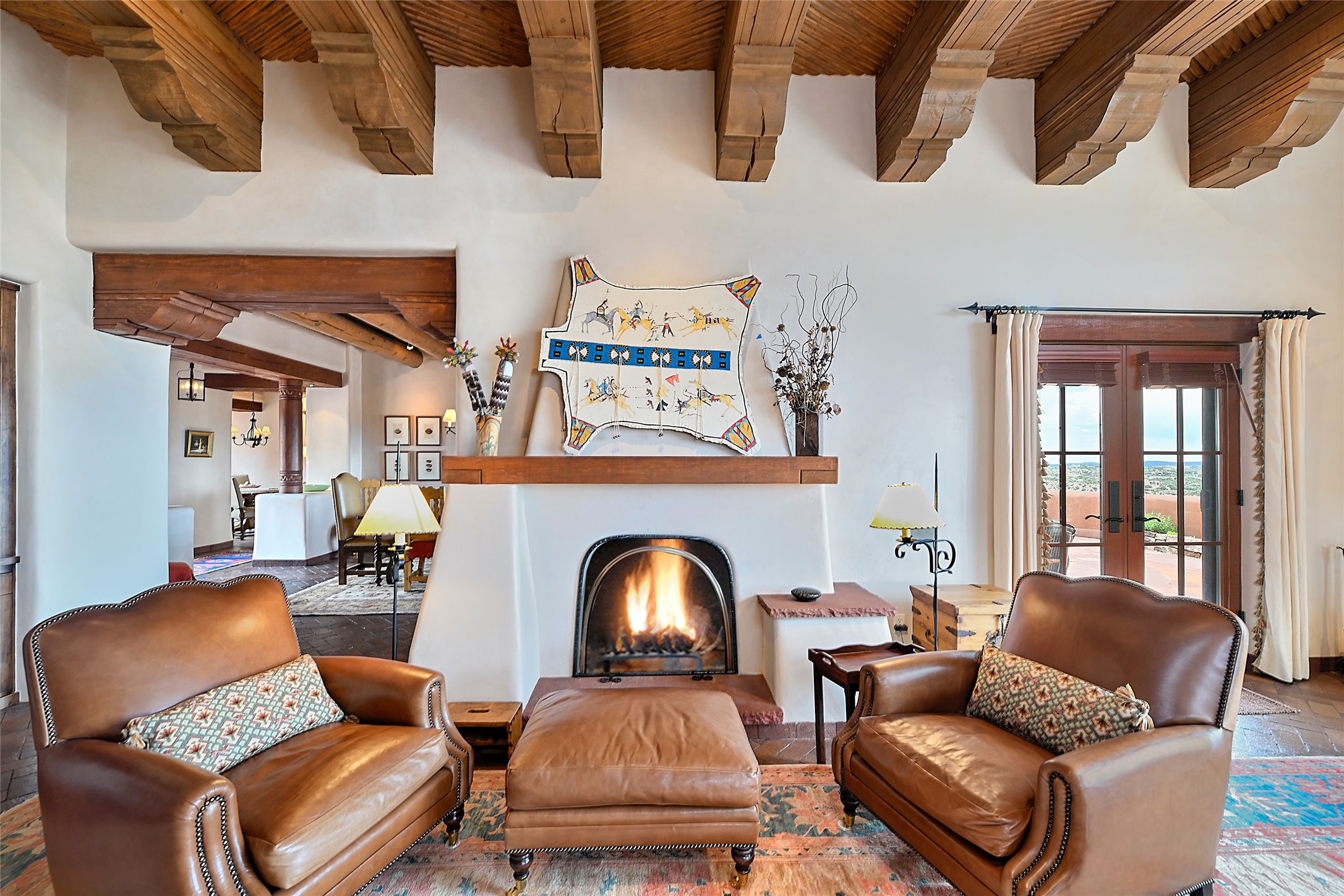 A true masterpiece of Spanish Pueblo architecture, this exceptional residence in Bishop's Lodge Hills is a stunning collaboration between acclaimed architect Ed Boniface and master builder Will Prull. Designed and constructed in 2007 for the current owner, with meticulous attention to detail, this home seamlessly blends traditional craftsmanship with modern luxury, all while capturing commanding views of the surrounding mountains and breathtaking sunsets. Upon entering the foyer, guests are enveloped in a space inspired by the sacred geometry of a Navajo Hogan, setting the tone for the rich architectural heritage woven throughout the home. The grand living room boasts soaring beamed ceilings supported by hand-carved corbels, while a striking fireplace design--borrowed from ancient traditions--serves as a warm and welcoming focal point. The formal dining area opens gracefully onto the Grand Portal, which leads to an expansive rooftop deck, offering panoramic vistas that define Santa Fe's unparalleled beauty. The chef's kitchen is a showpiece of authenticity and elegance, featuring antiqued custom cabinetry, classic tile countertops and custom carved backsplashes, and top-of-the-line Viking Stainless appliances. At its heart sits a black walnut-topped center island--both functional and visually stunning--complemented by an adjacent breakfast room that overlooks the walled entry courtyard, creating an intimate space for morning gatherings. The luxurious primary suite is a retreat unto itself, complete with a charming gas Kiva fireplace, two spa-like baths, and two walk-in closets. A separate office, situated within the primary wing, provides the perfect setting for focus and creativity. On the opposite wing, comfortable guest suites ensure privacy and tranquility, making this home an ideal sanctuary for both residents and visitors alike. Every aspect of this home's design and construction reflects an extraordinary commitment to craftsmanship, authenticity, and architectural excellence.