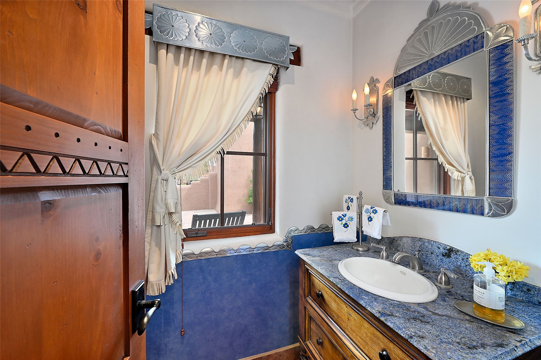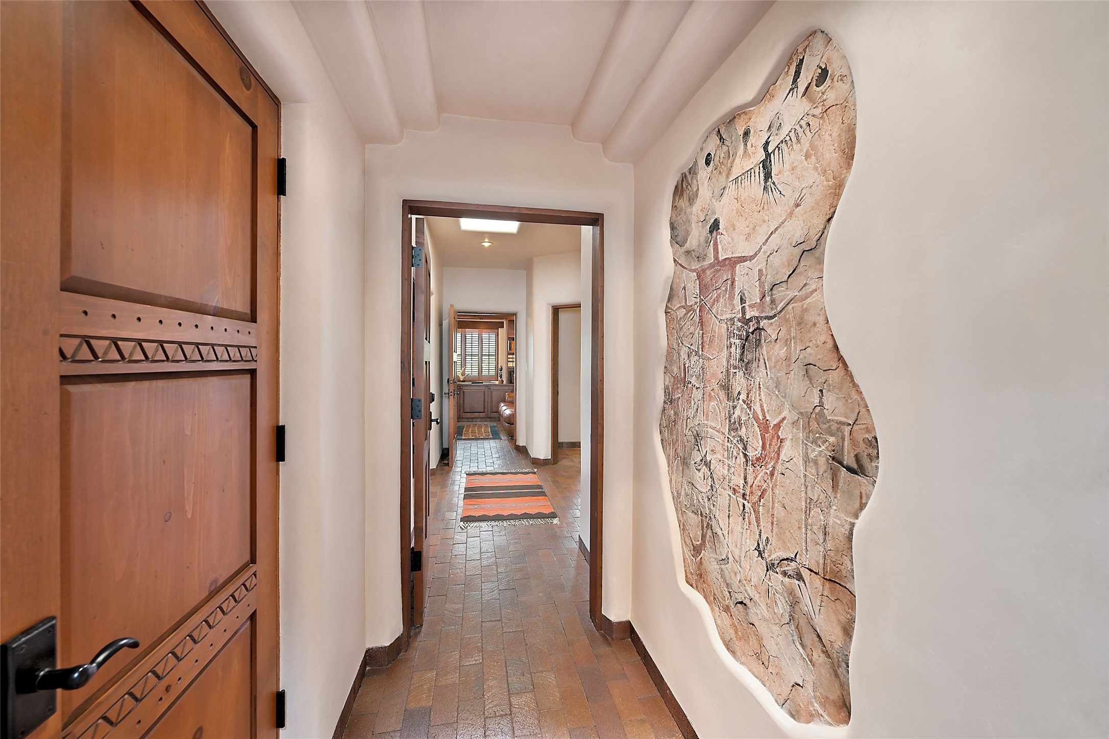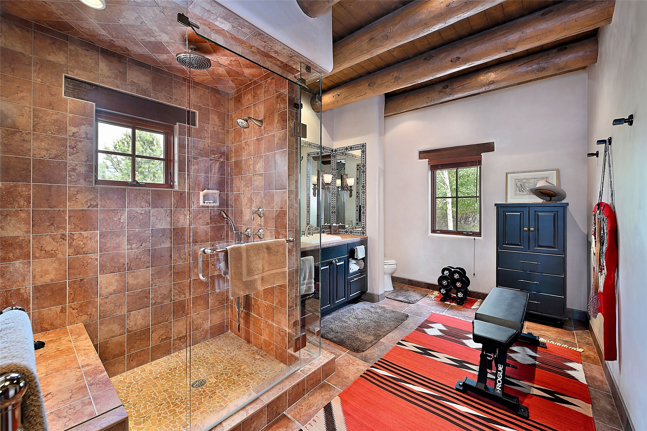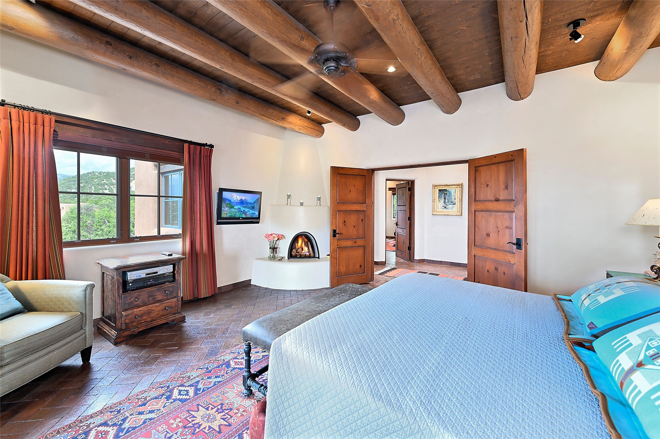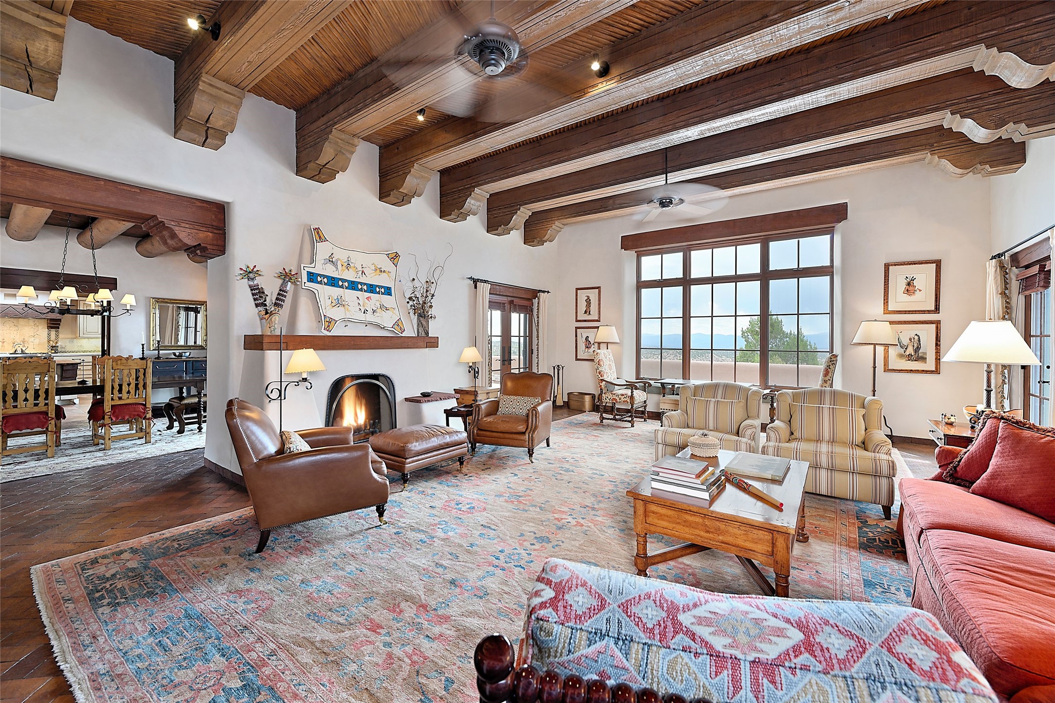 A true masterpiece of Spanish Pueblo architecture, this exceptional residence in Bishop's Lodge Hills is a stunning collaboration between acclaimed architect Ed Boniface and master builder Will Prull. Designed and constructed in 2007 for the current owner, with meticulous attention to detail, this home seamlessly blends traditional craftsmanship with modern luxury, all while capturing commanding views of the surrounding mountains and breathtaking sunsets. Upon entering the foyer, guests are enveloped in a space inspired by the sacred geometry of a Navajo Hogan, setting the tone for the rich architectural heritage woven throughout the home. The grand living room boasts soaring beamed ceilings supported by hand-carved corbels, while a striking fireplace design--borrowed from ancient traditions--serves as a warm and welcoming focal point. The formal dining area opens gracefully onto the Grand Portal, which leads to an expansive rooftop deck, offering panoramic vistas that define Santa Fe's unparalleled beauty. The chef's kitchen is a showpiece of authenticity and elegance, featuring antiqued custom cabinetry, classic tile countertops and custom carved backsplashes, and top-of-the-line Viking Stainless appliances. At its heart sits a black walnut-topped center island--both functional and visually stunning--complemented by an adjacent breakfast room that overlooks the walled entry courtyard, creating an intimate space for morning gatherings. The luxurious primary suite is a retreat unto itself, complete with a charming gas Kiva fireplace, two spa-like baths, and two walk-in closets. A separate office, situated within the primary wing, provides the perfect setting for focus and creativity. On the opposite wing, comfortable guest suites ensure privacy and tranquility, making this home an ideal sanctuary for both residents and visitors alike. Every aspect of this home's design and construction reflects an extraordinary commitment to craftsmanship, authenticity, and architectural excellence.