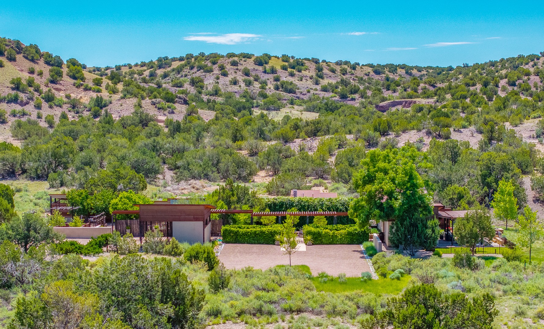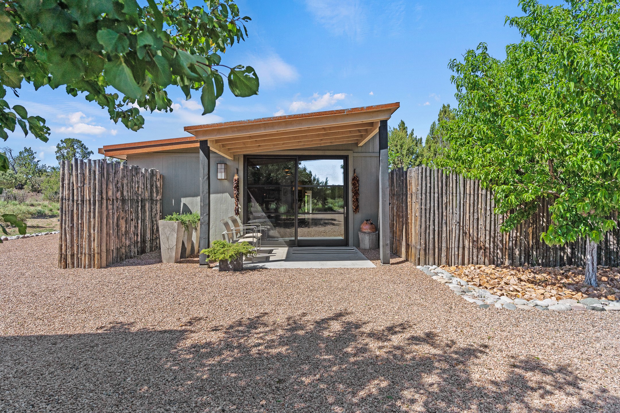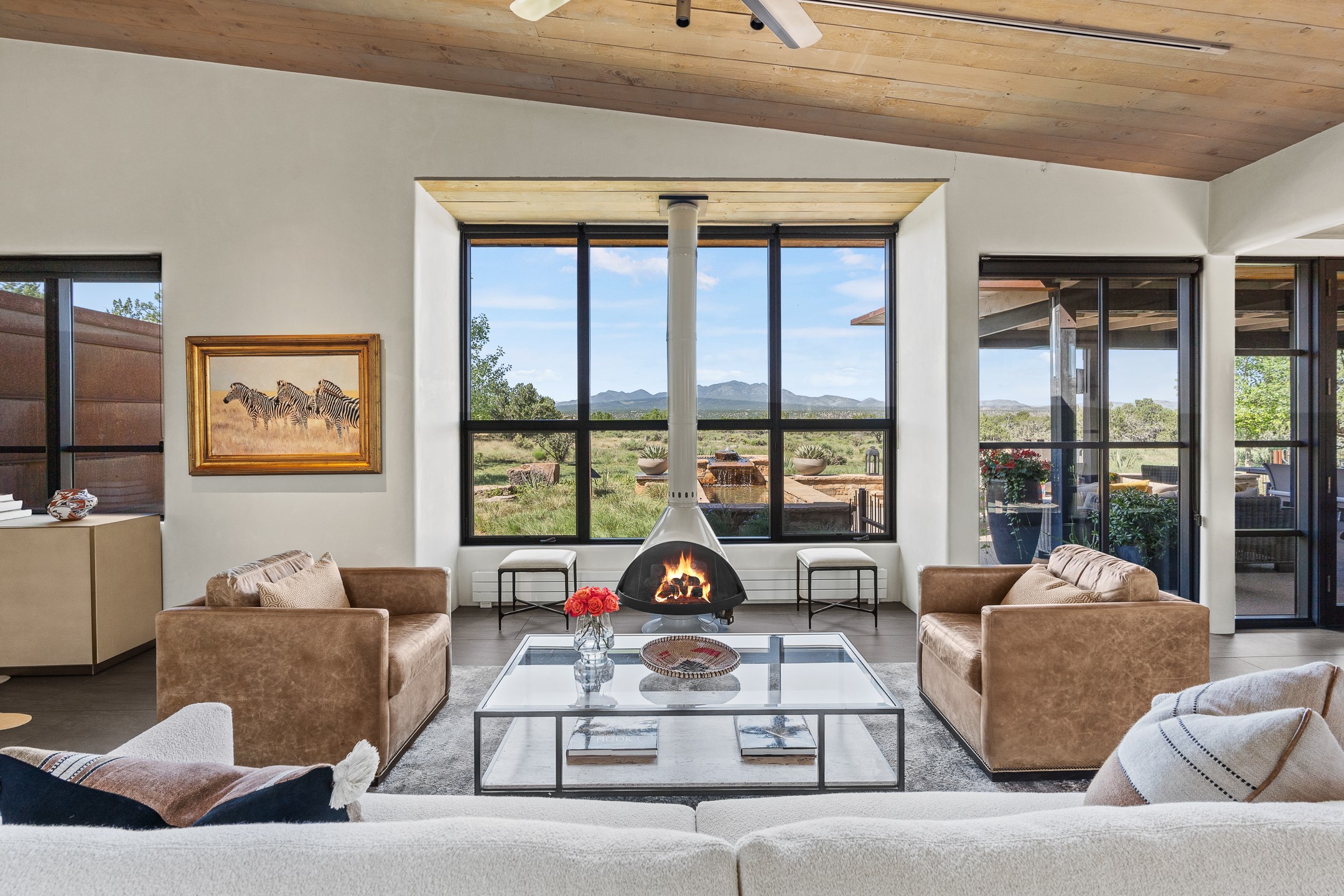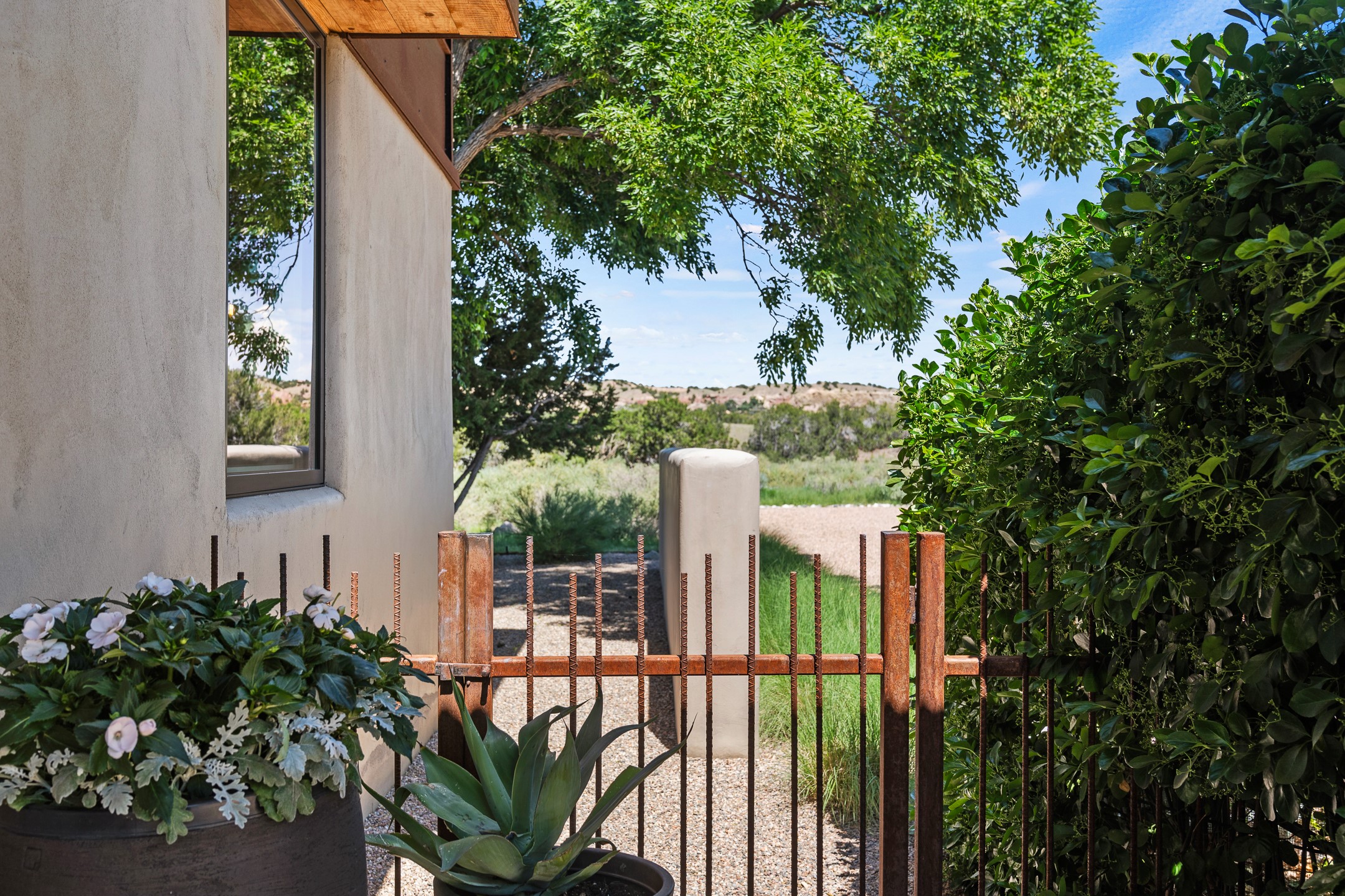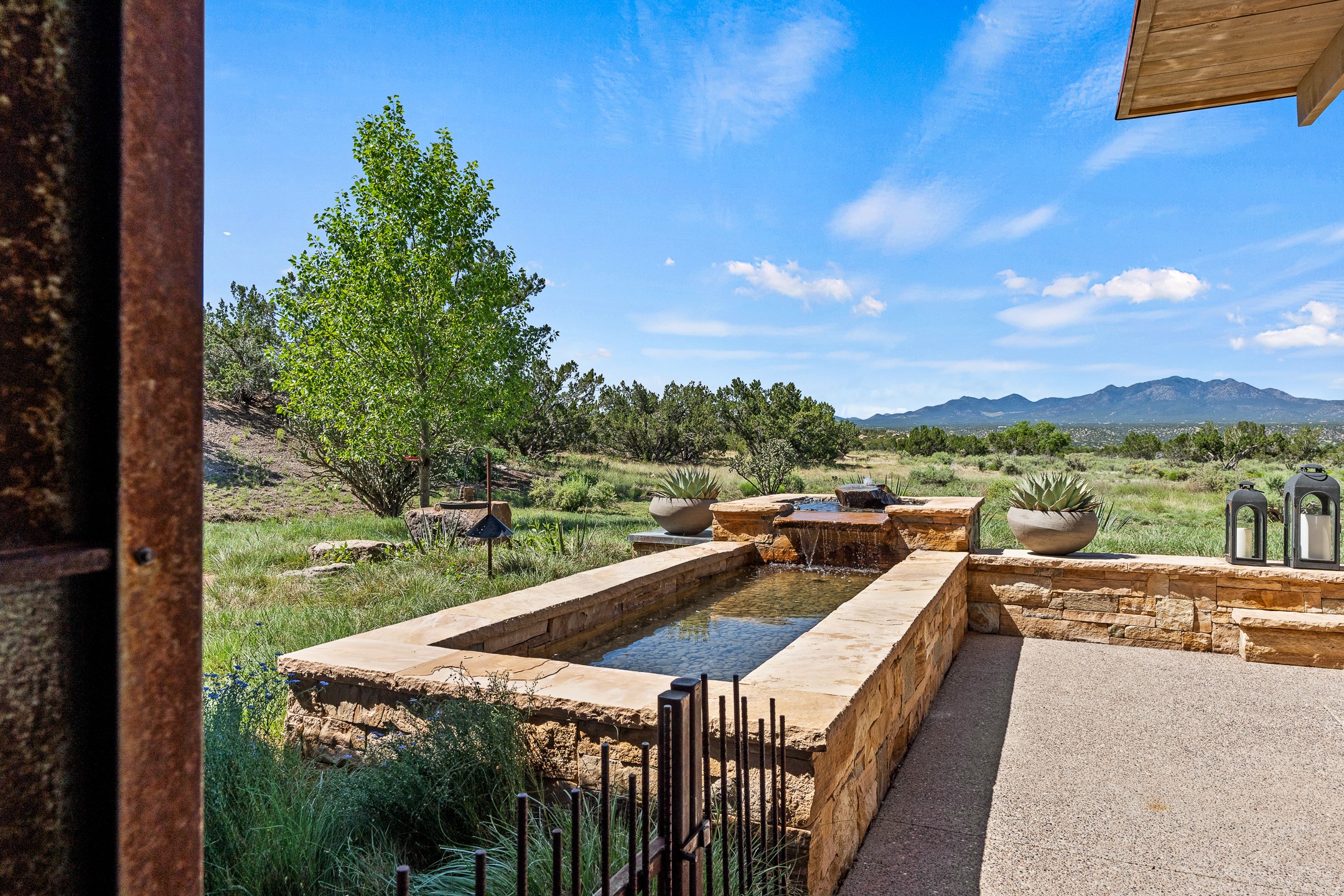 Architect-Designed Sanctuary on 44 Acres with Sweeping Ortiz Mountain ViewsSet on 44 pristine acres in the heart of Garden of the Gods rock formations, this architect-designed home is a striking fusion of form, function, and landscape. Completed in 2019 by its architect-owners, the residence reflects a deep sensitivity to place - modern in its lines, yet timeless in its connection to the land and its mesmerizing views of the Ortiz Mountains.The layout offers both simplicity and flexibility, with two bedrooms and a third space perfectly suited for a guest suite, office, or creative studio. Every detail is intentional--custom built-ins and integrated storage maintain clean lines without sacrificing utility. Expansive ceilings and precisely placed windows draw in natural light and frame breathtaking panoramas from nearly every room. The chef's kitchen is a showpiece of design and performance, anchored by a La Cornue range, Sub-Zero refrigerator and freezer, and Miele dishwasher. Raked German oak cabinetry and honed Taj Mahal marble countertops offer a warm, sculptural backdrop for both cooking and gathering. The primary suite is a peaceful retreat, complete with a spa-like bath featuring a Caldara salt-water hot tub, a custom walnut vanity with black Caesarstone counters, and a beautifully crafted walk-in shower. Seamless indoor-outdoor living defines the home. A welcoming entry courtyard, stone patios and covered areas extend the living space, perfectly oriented for sunrise coffee and sunset gatherings. A custom water feature adds a meditative element and is fed by a 12,000 gallon rain-catchment system that also supports the landscaping and garden irrigation. A 52-inch propane firepit, built-in pizza oven, and drought-tolerant yet lush landscaping complete the inviting feel of the exterior spaces. A 21 gal/min private well ensures abundant, high-quality water. A fenced and irrigated raised-bed vegetable garden/orchard and equipment/tractor workshop are adjacent to the 2 car carport (with EV car charger). The perimeter of the acreage is fenced and offers a perfect setting for equestrian facilities, including over two miles of scenic private riding/hiking trails that wind through rolling high desert terrain. An adjacent 20 acre parcel is also available for those seeking even more space and privacy. Rarely does a property of this architectural caliber and ecological sensitivity come to market. This is an extraordinary opportunity to own a soulful, design-forward retreat in one of Northern New Mexico's most scenic and serene settings. Only 10 minutes to Madrid and 20 minutes to Santa Fe.