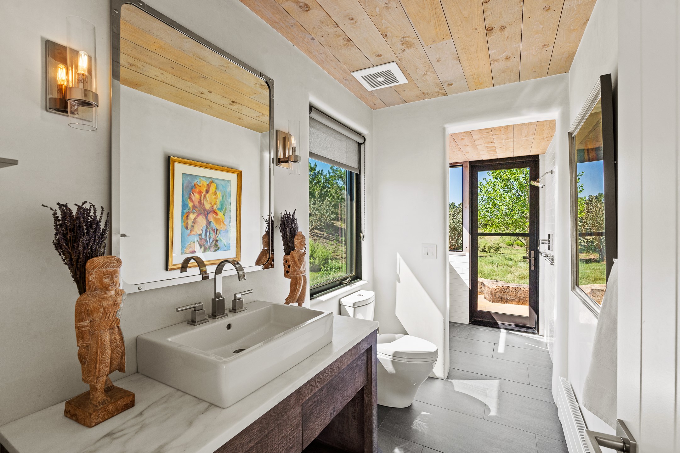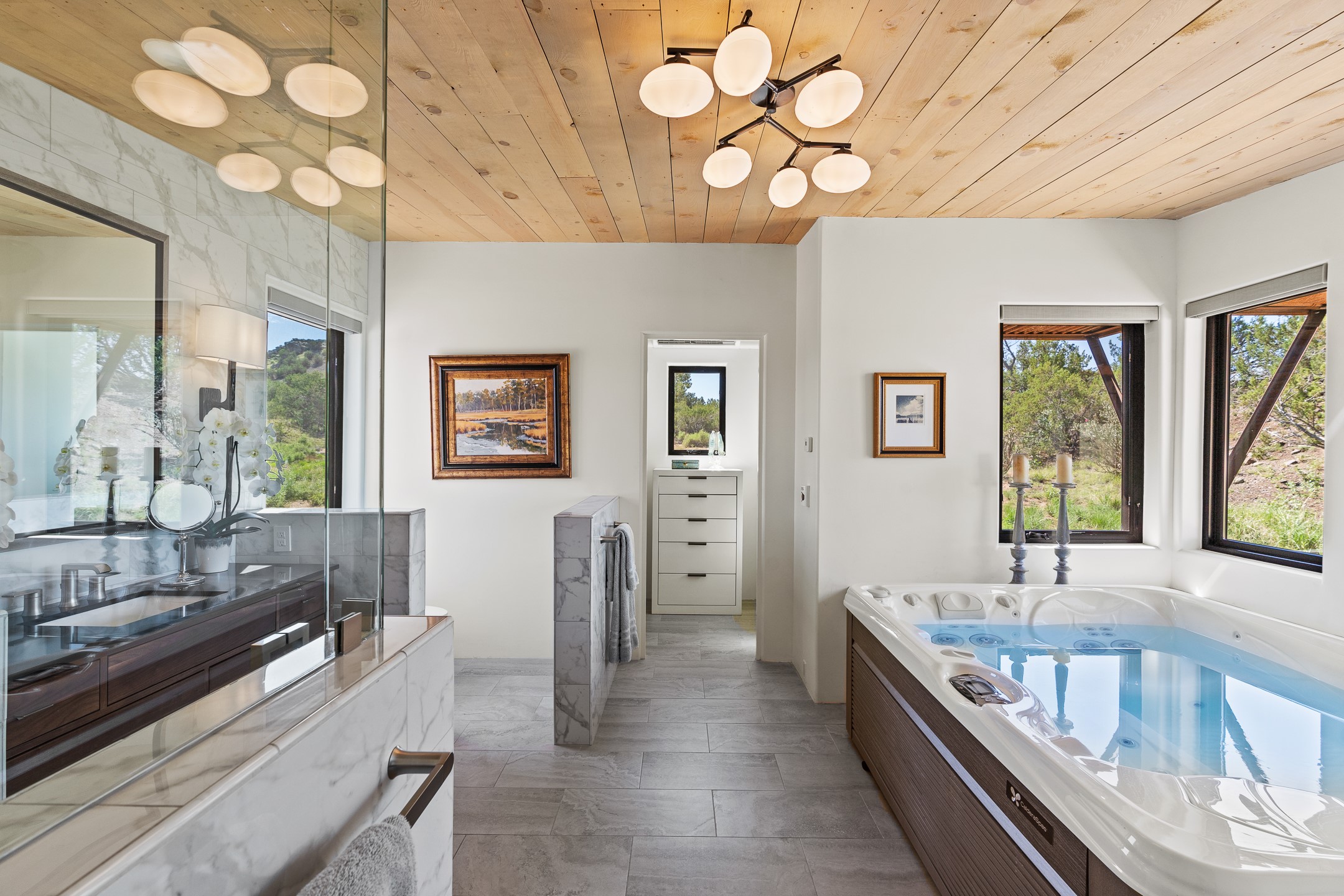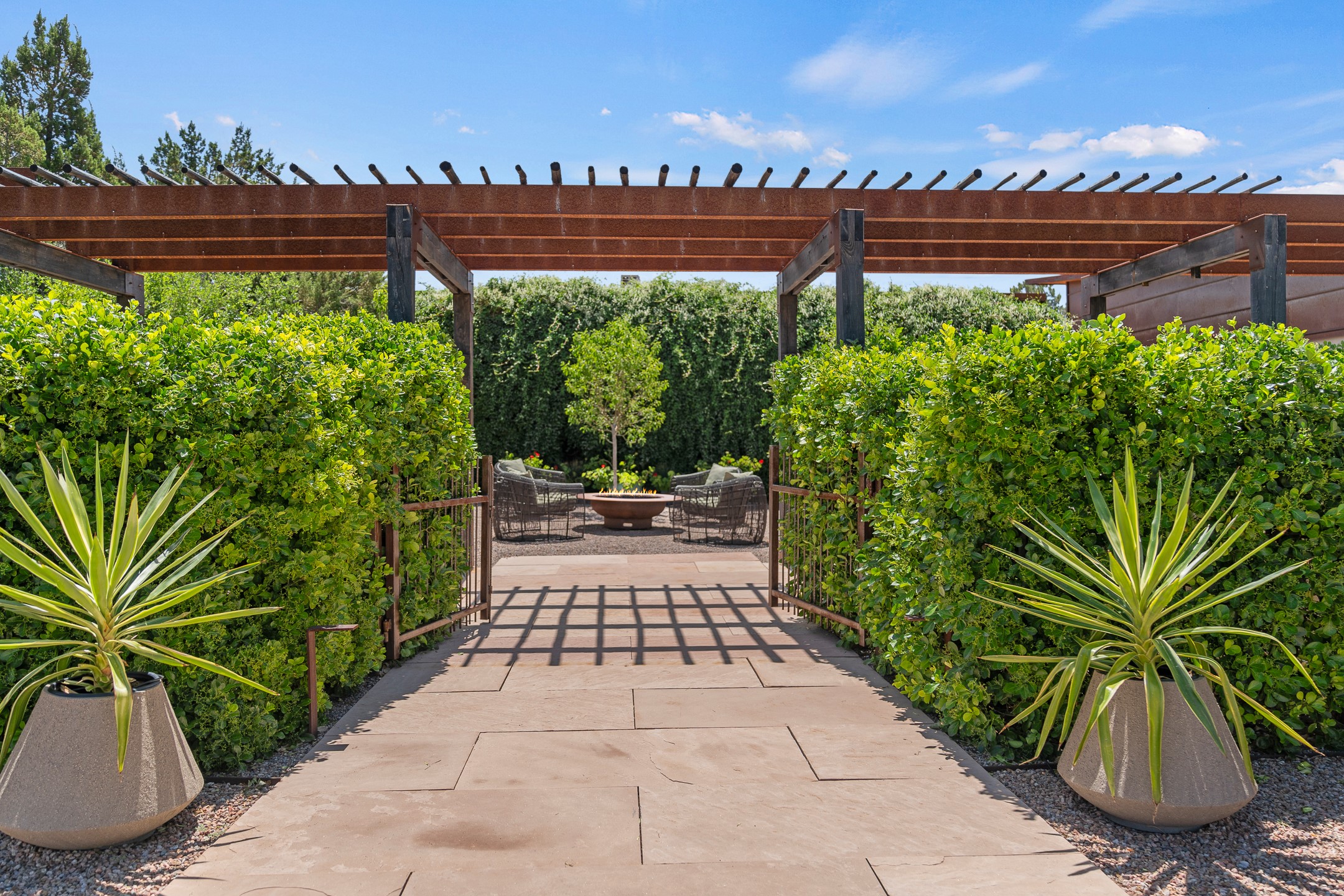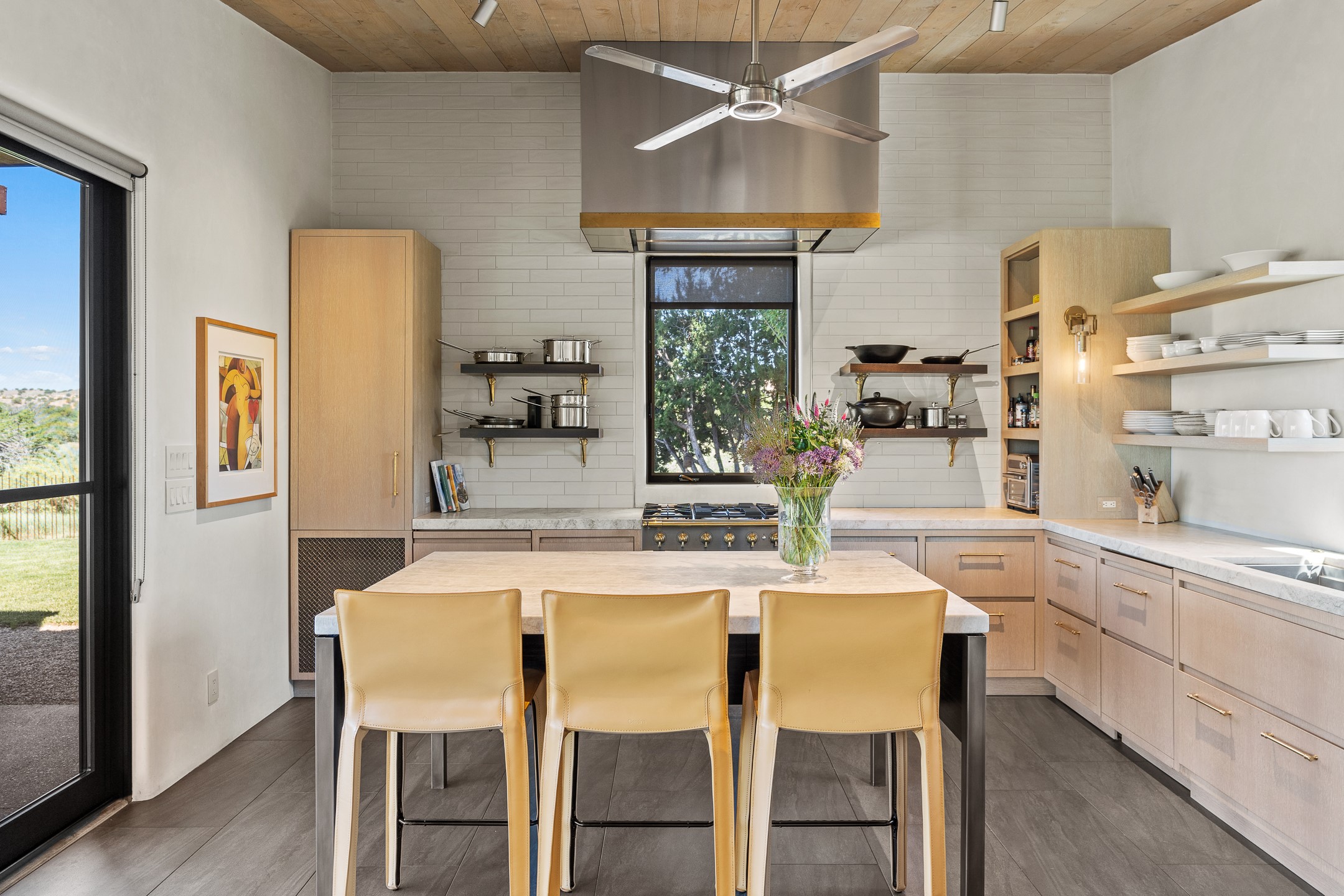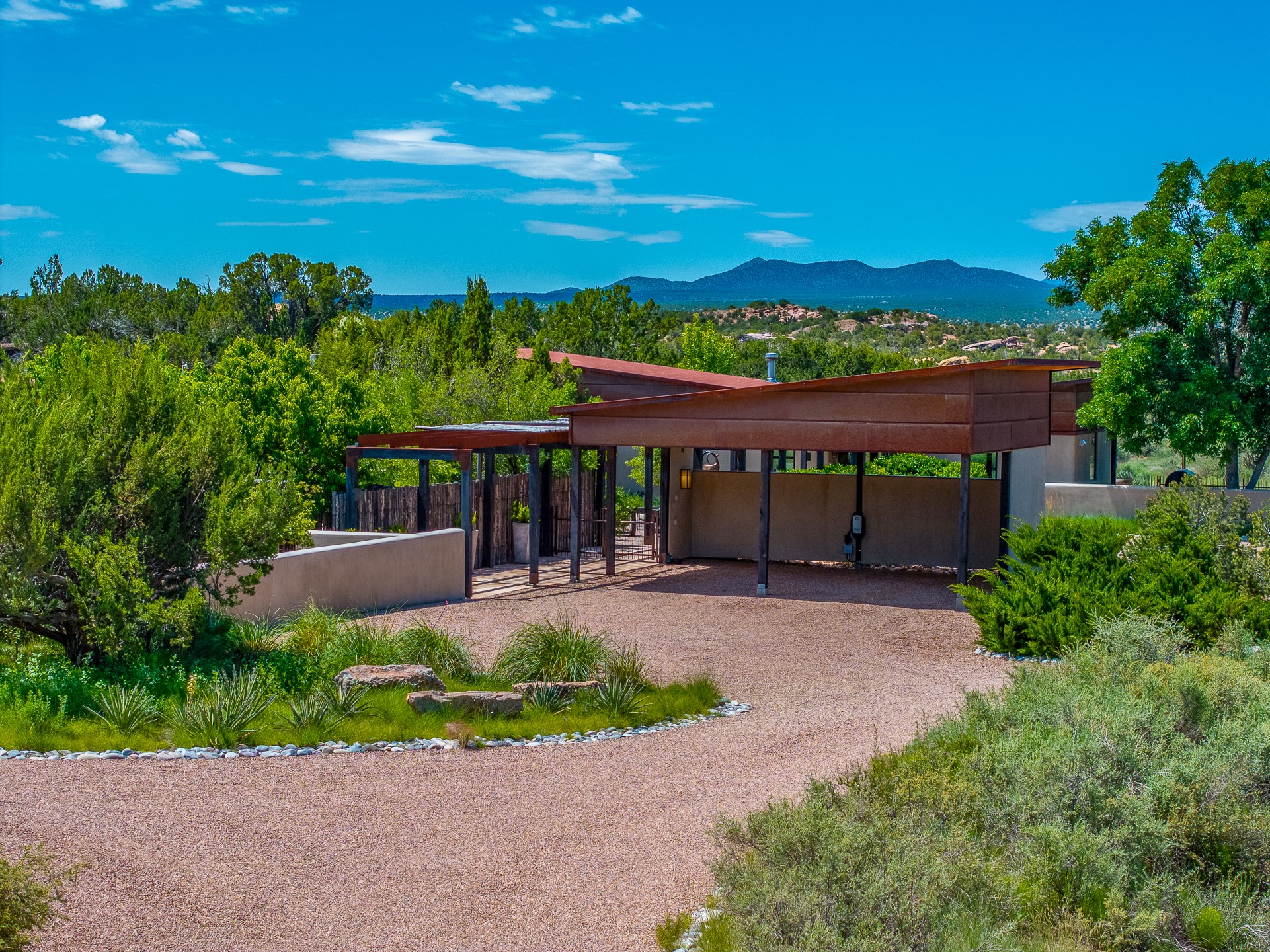 Architect-Designed Sanctuary on 44 Acres with Sweeping Ortiz Mountain ViewsSet on 44 pristine acres in the heart of Garden of the Gods rock formations, this architect-designed home is a striking fusion of form, function, and landscape. Completed in 2019 by its architect-owners, the residence reflects a deep sensitivity to place - modern in its lines, yet timeless in its connection to the land and its mesmerizing views of the Ortiz Mountains.The layout offers both simplicity and flexibility, with two bedrooms and a third space perfectly suited for a guest suite, office, or creative studio. Every detail is intentional--custom built-ins and integrated storage maintain clean lines without sacrificing utility. Expansive ceilings and precisely placed windows draw in natural light and frame breathtaking panoramas from nearly every room. The chef's kitchen is a showpiece of design and performance, anchored by a La Cornue range, Sub-Zero refrigerator and freezer, and Miele dishwasher. Raked German oak cabinetry and honed Taj Mahal marble countertops offer a warm, sculptural backdrop for both cooking and gathering. The primary suite is a peaceful retreat, complete with a spa-like bath featuring a Caldara salt-water hot tub, a custom walnut vanity with black Caesarstone counters, and a beautifully crafted walk-in shower. Seamless indoor-outdoor living defines the home. A welcoming entry courtyard, stone patios and covered areas extend the living space, perfectly oriented for sunrise coffee and sunset gatherings. A custom water feature adds a meditative element and is fed by a 12,000 gallon rain-catchment system that also supports the landscaping and garden irrigation. A 52-inch propane firepit, built-in pizza oven, and drought-tolerant yet lush landscaping complete the inviting feel of the exterior spaces. A 21 gal/min private well ensures abundant, high-quality water. A fenced and irrigated raised-bed vegetable garden/orchard and equipment/tractor workshop are adjacent to the 2 car carport (with EV car charger). The perimeter of the acreage is fenced and offers a perfect setting for equestrian facilities, including over two miles of scenic private riding/hiking trails that wind through rolling high desert terrain. An adjacent 20 acre parcel is also available for those seeking even more space and privacy. Rarely does a property of this architectural caliber and ecological sensitivity come to market. This is an extraordinary opportunity to own a soulful, design-forward retreat in one of Northern New Mexico's most scenic and serene settings. Only 10 minutes to Madrid and 20 minutes to Santa Fe.