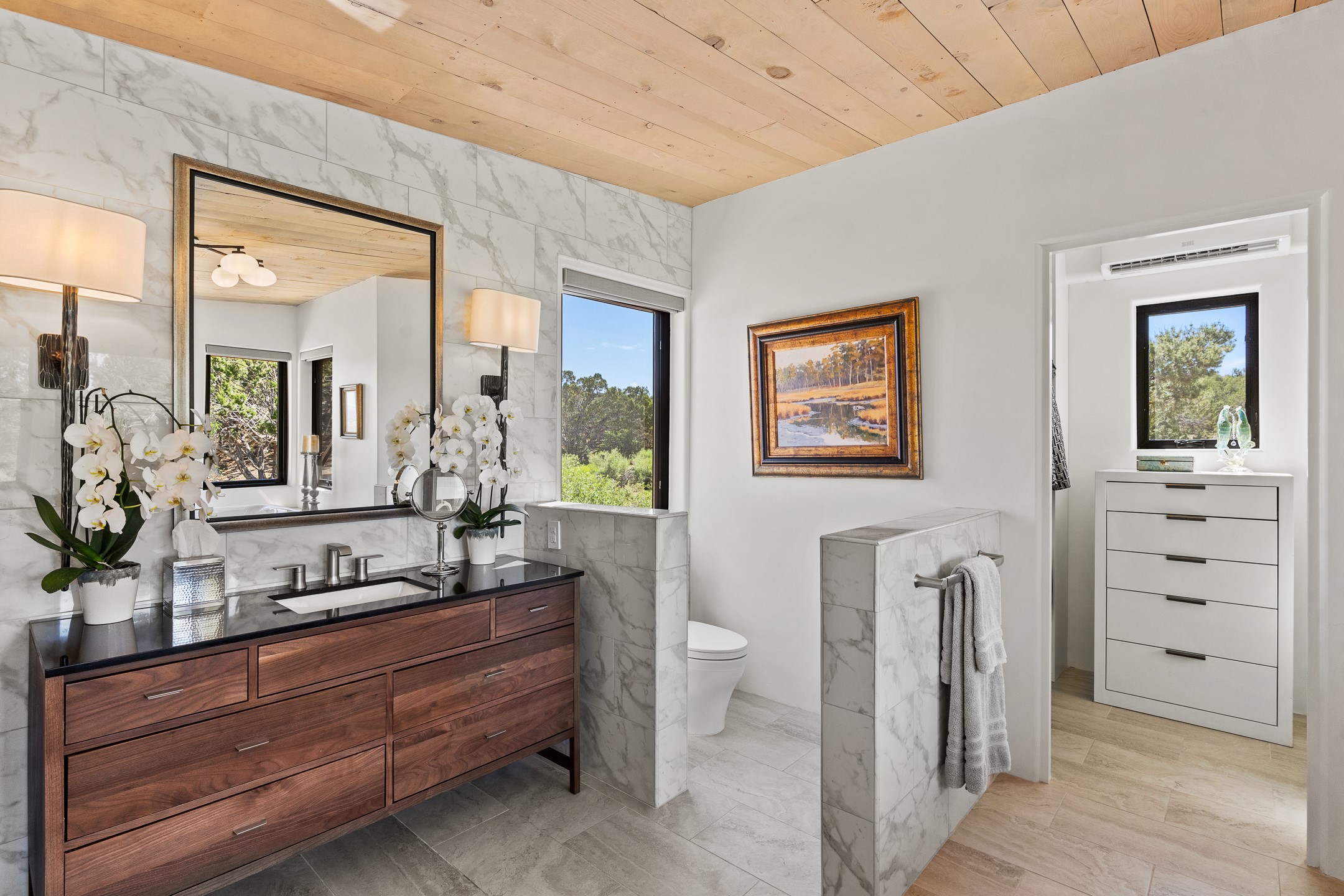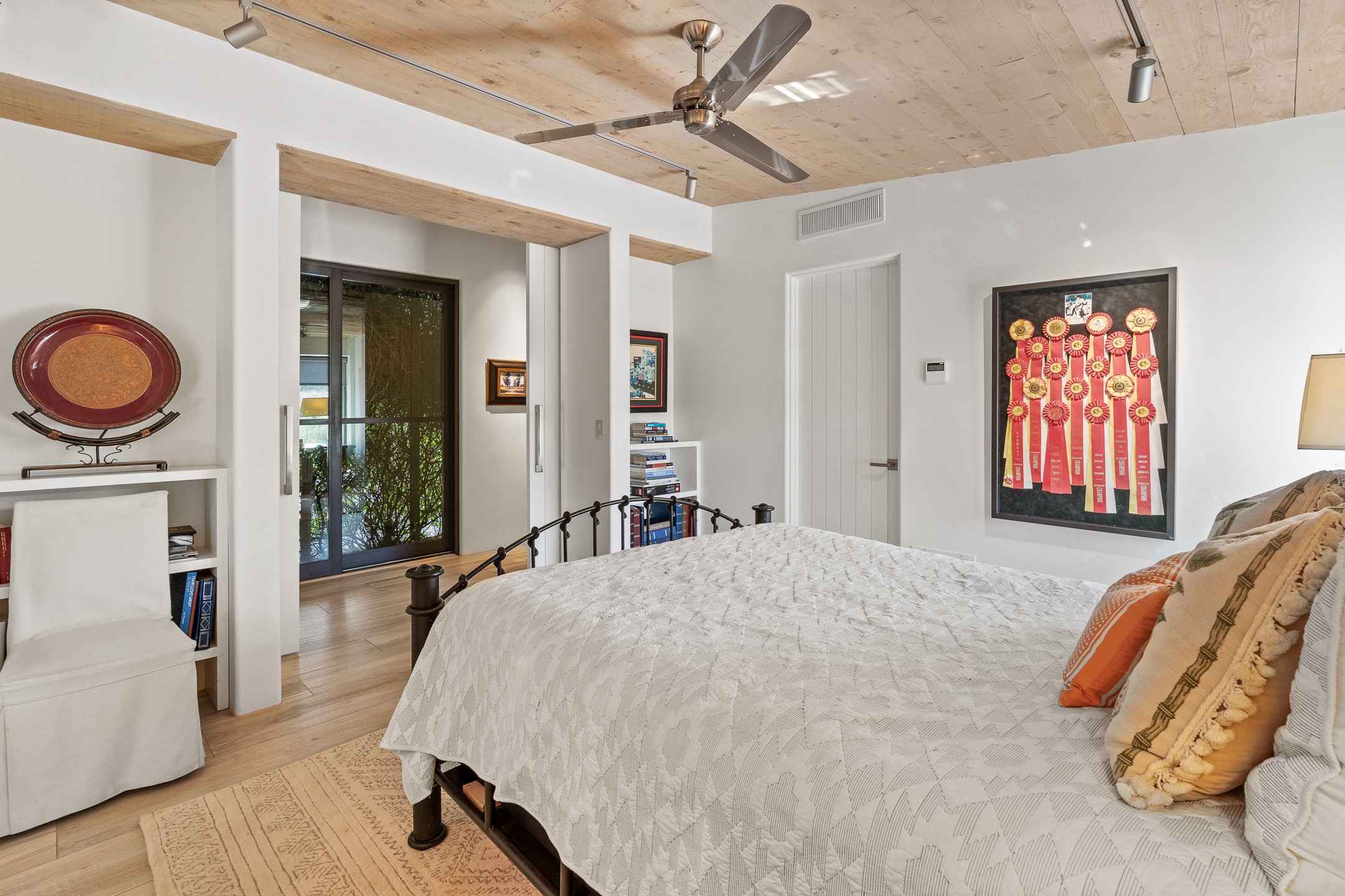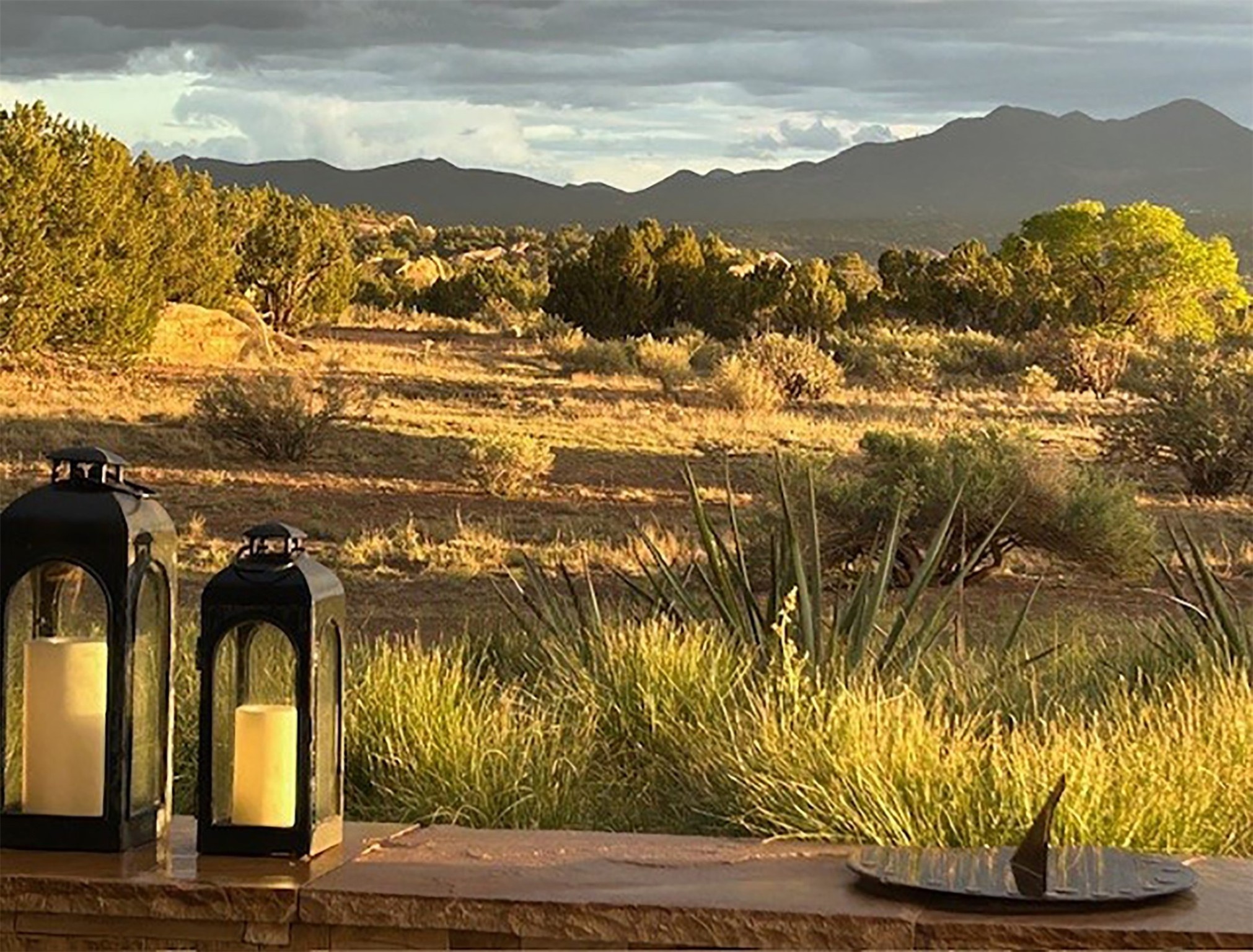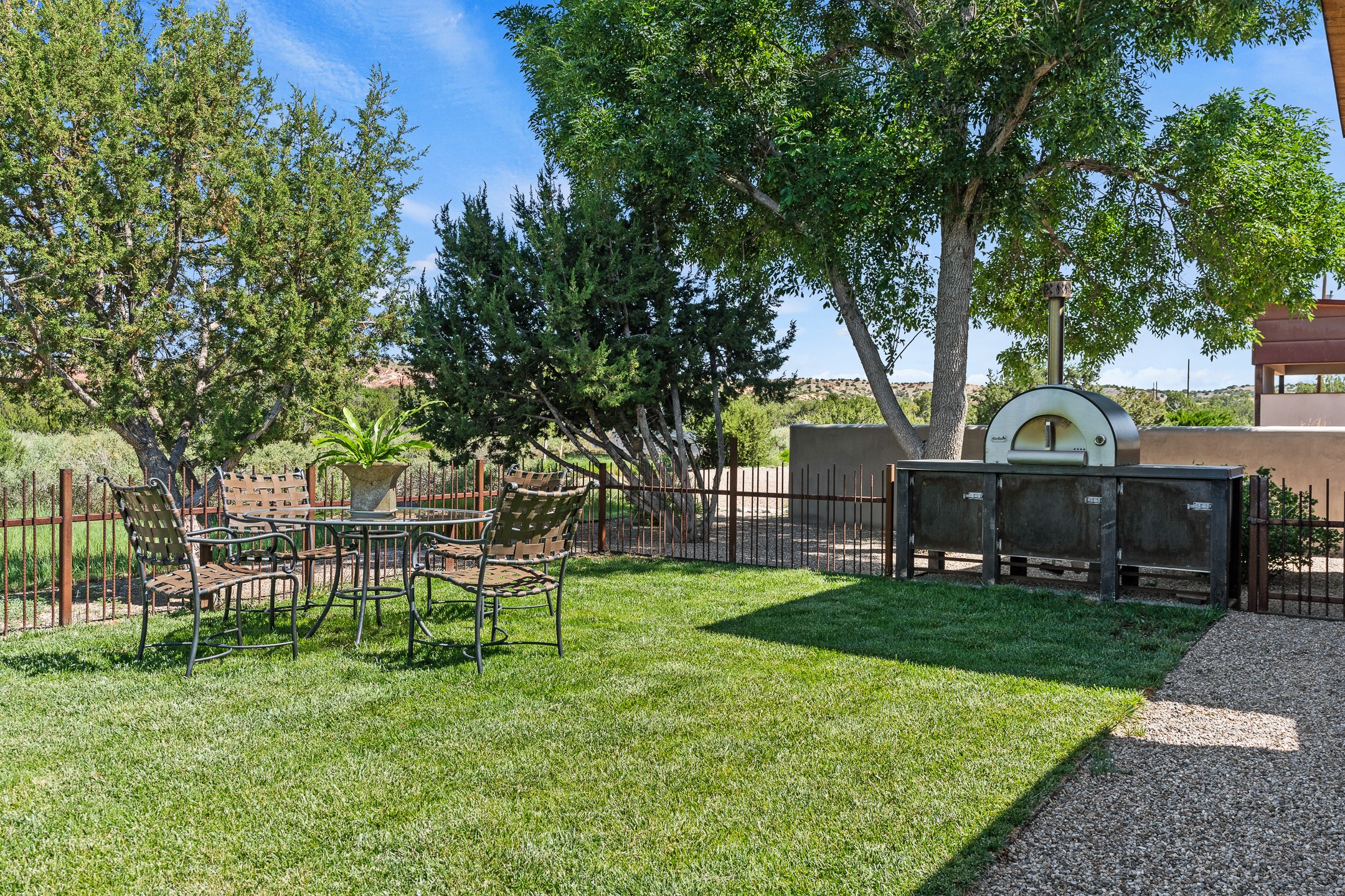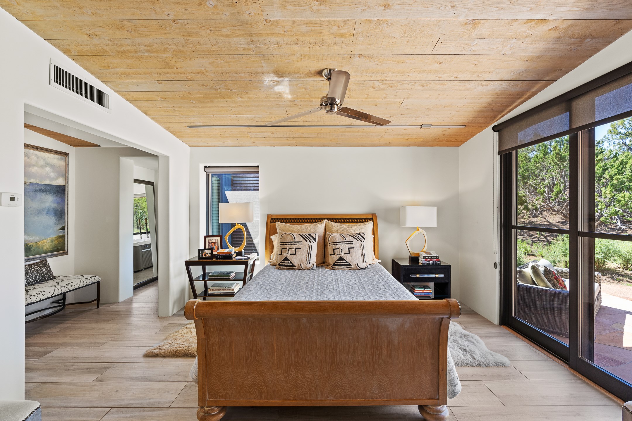 Architect-Designed Sanctuary on 44 Acres with Sweeping Ortiz Mountain ViewsSet on 44 pristine acres in the heart of Garden of the Gods rock formations, this architect-designed home is a striking fusion of form, function, and landscape. Completed in 2019 by its architect-owners, the residence reflects a deep sensitivity to place - modern in its lines, yet timeless in its connection to the land and its mesmerizing views of the Ortiz Mountains.The layout offers both simplicity and flexibility, with two bedrooms and a third space perfectly suited for a guest suite, office, or creative studio. Every detail is intentional--custom built-ins and integrated storage maintain clean lines without sacrificing utility. Expansive ceilings and precisely placed windows draw in natural light and frame breathtaking panoramas from nearly every room. The chef's kitchen is a showpiece of design and performance, anchored by a La Cornue range, Sub-Zero refrigerator and freezer, and Miele dishwasher. Raked German oak cabinetry and honed Taj Mahal marble countertops offer a warm, sculptural backdrop for both cooking and gathering. The primary suite is a peaceful retreat, complete with a spa-like bath featuring a Caldara salt-water hot tub, a custom walnut vanity with black Caesarstone counters, and a beautifully crafted walk-in shower. Seamless indoor-outdoor living defines the home. A welcoming entry courtyard, stone patios and covered areas extend the living space, perfectly oriented for sunrise coffee and sunset gatherings. A custom water feature adds a meditative element and is fed by a 12,000 gallon rain-catchment system that also supports the landscaping and garden irrigation. A 52-inch propane firepit, built-in pizza oven, and drought-tolerant yet lush landscaping complete the inviting feel of the exterior spaces. A 21 gal/min private well ensures abundant, high-quality water. A fenced and irrigated raised-bed vegetable garden/orchard and equipment/tractor workshop are adjacent to the 2 car carport (with EV car charger). The perimeter of the acreage is fenced and offers a perfect setting for equestrian facilities, including over two miles of scenic private riding/hiking trails that wind through rolling high desert terrain. An adjacent 20 acre parcel is also available for those seeking even more space and privacy. Rarely does a property of this architectural caliber and ecological sensitivity come to market. This is an extraordinary opportunity to own a soulful, design-forward retreat in one of Northern New Mexico's most scenic and serene settings. Only 10 minutes to Madrid and 20 minutes to Santa Fe.