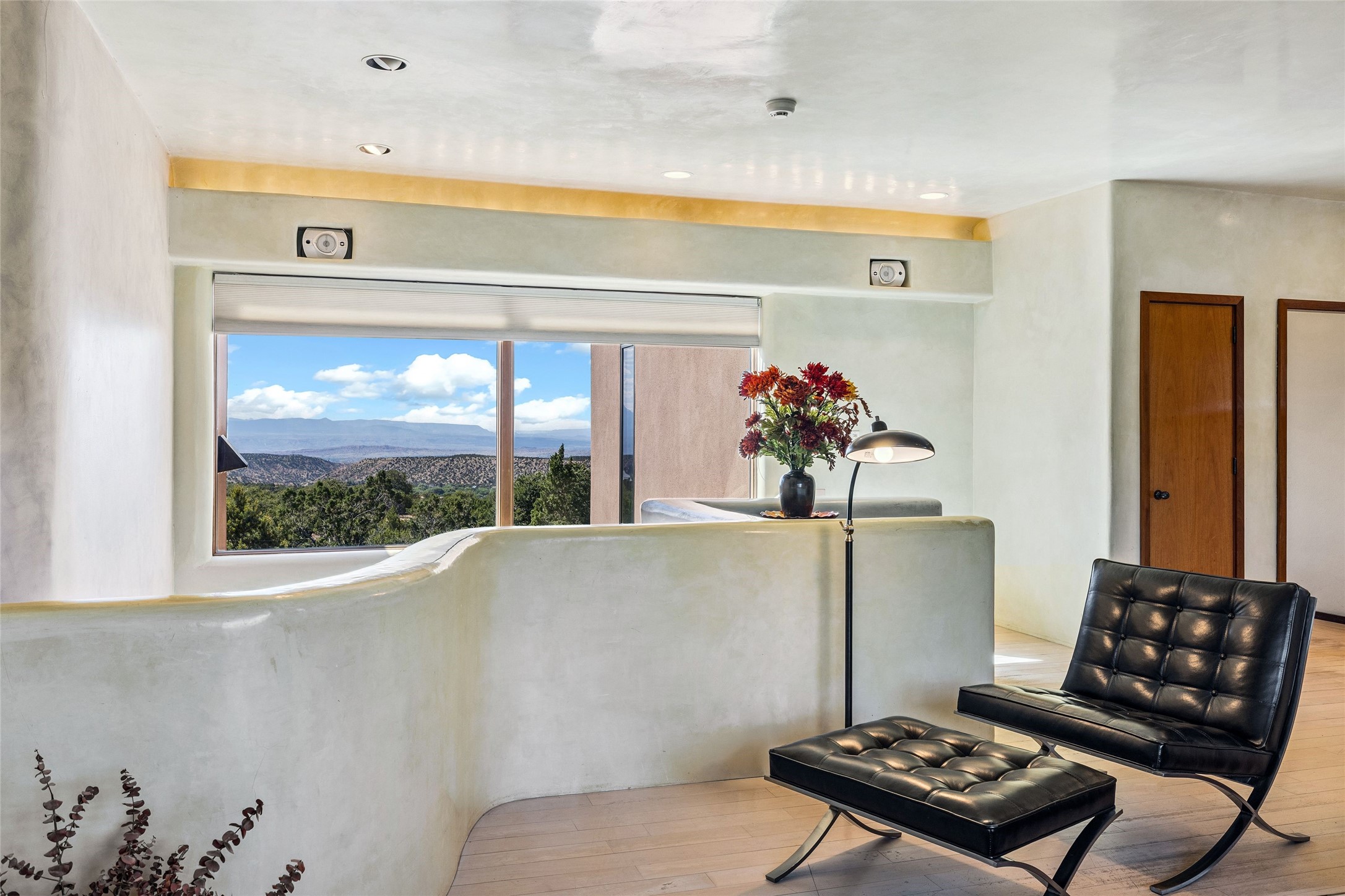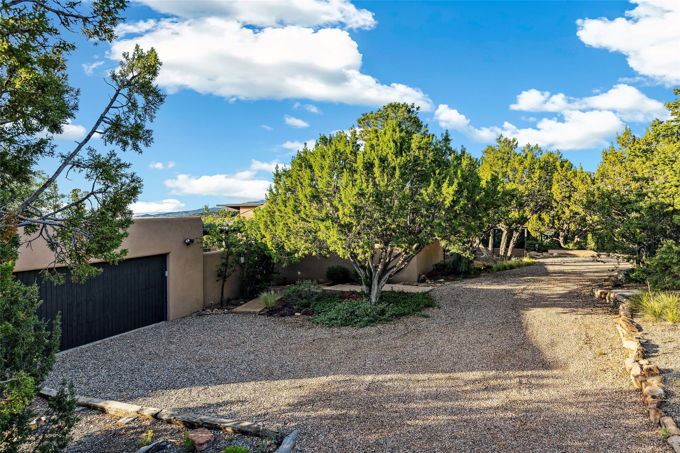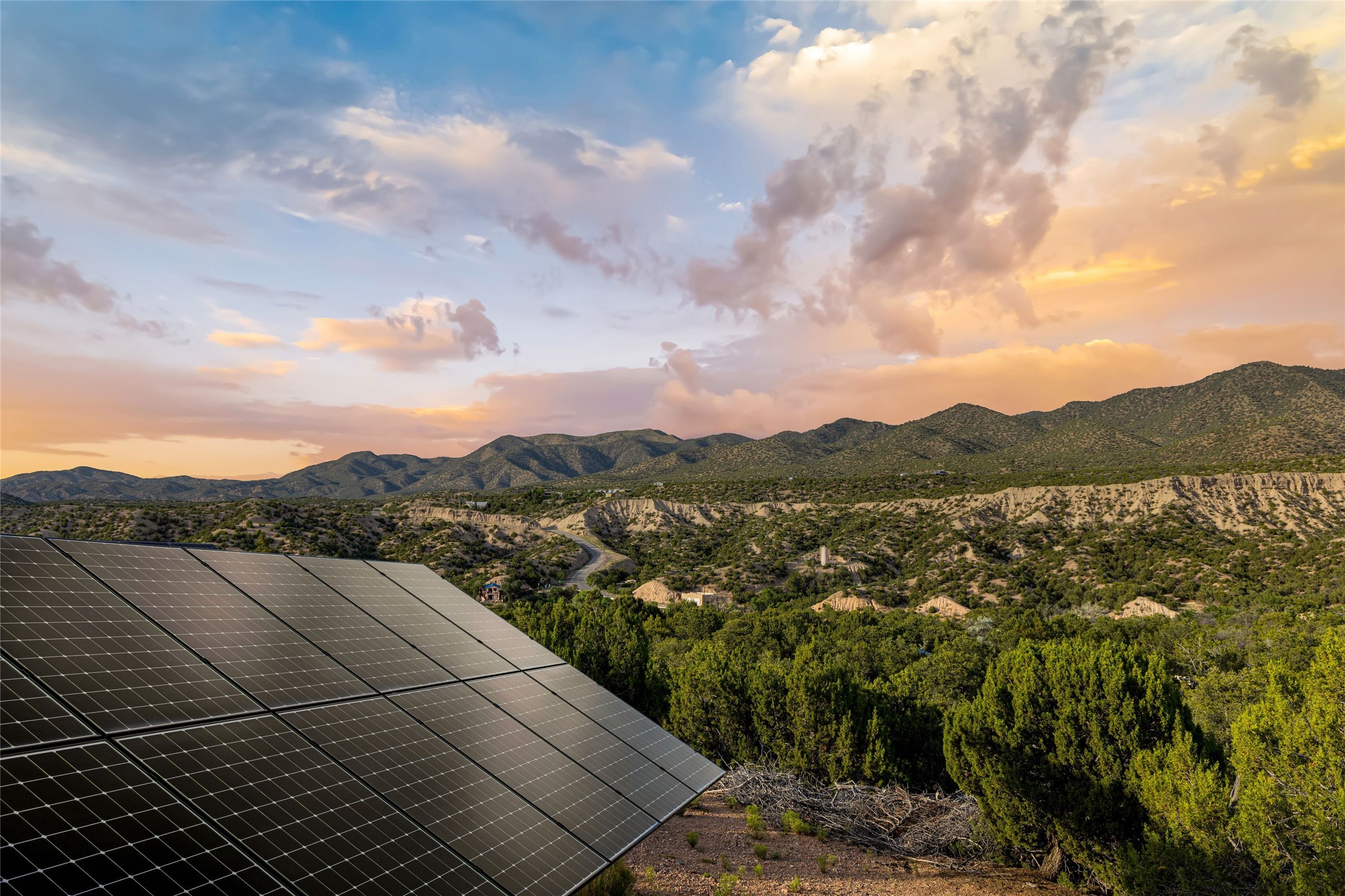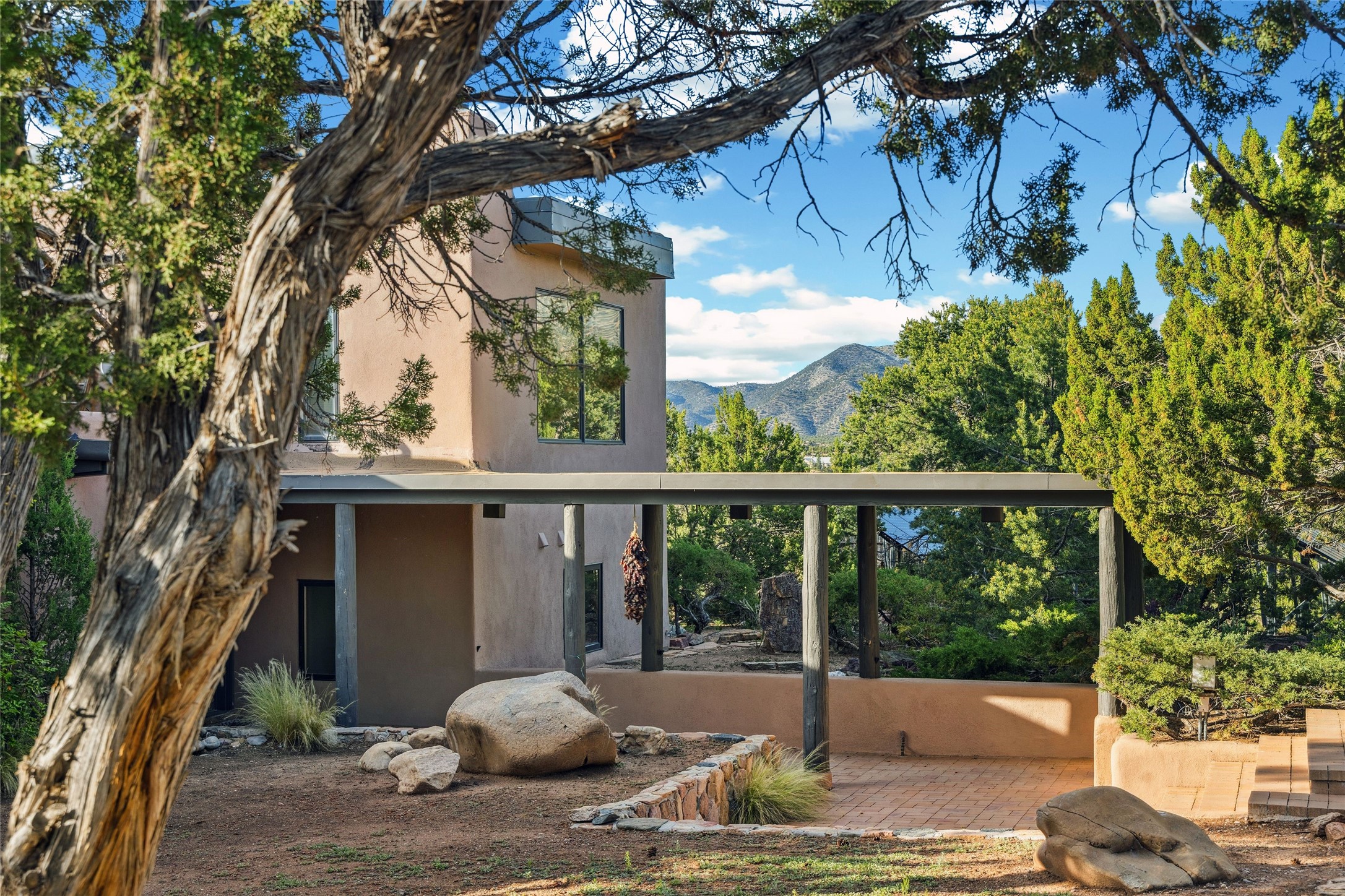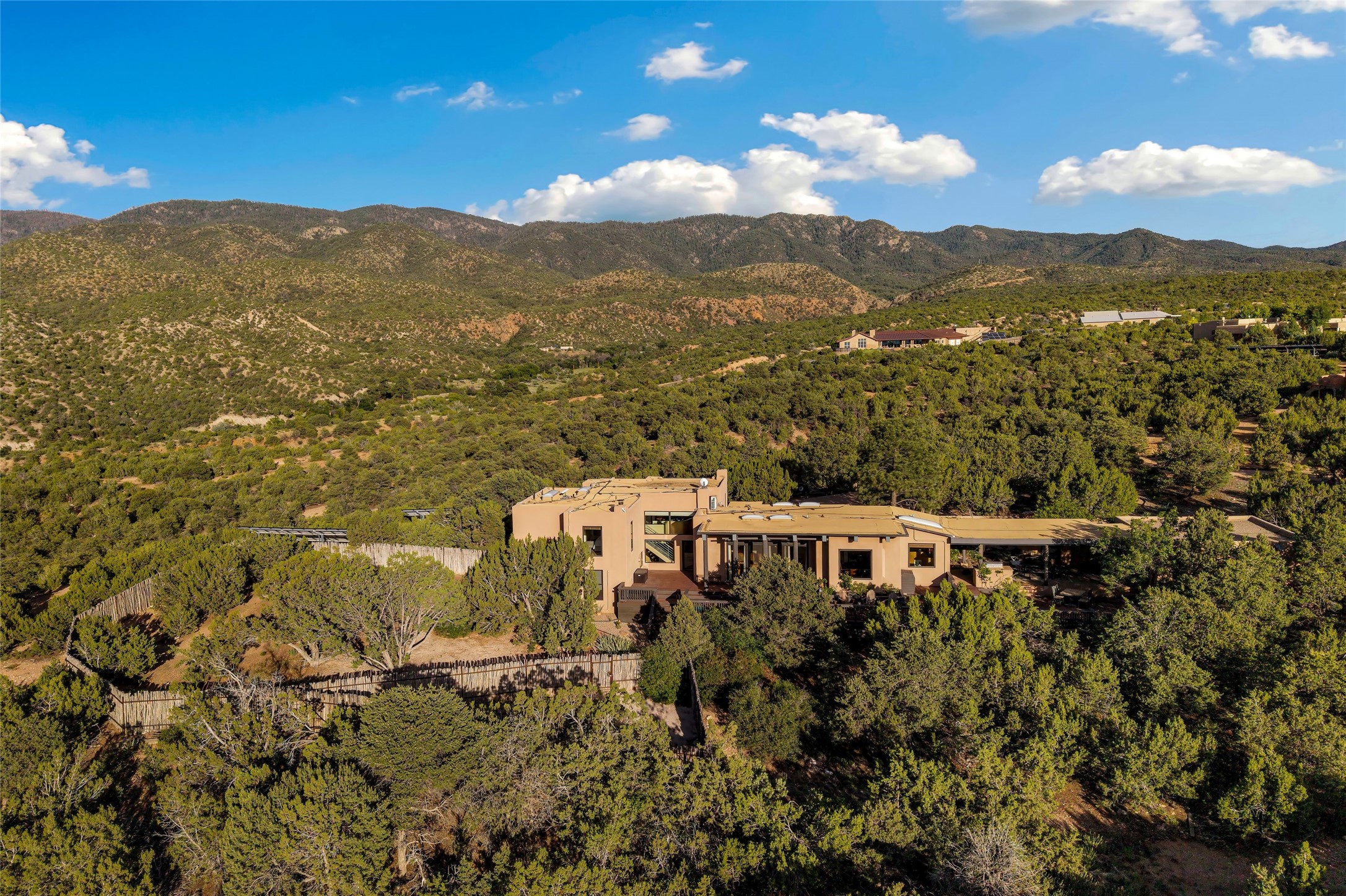 Contemporary Serenity with Panoramic Mountain Views in Vista Redonda: This gated sanctuary sits on 5.08 acres in the sought-after Vista Redonda neighborhood which is perched high on its own mesa. 54 Paseo Encantado offers awe-inspiring vistas of both the rugged Sangre de Cristo range to the east and the dramatic Jemez Mountains to the west--from sunrise to sunset, the views are nothing short of breathtaking.This architect designed 4-bedroom, 3-bath home spans 3,489 square feet and reflects a timeless contemporary design that complements its natural surroundings. With only three owners since its construction in 1973, it retains much of its original character and charm and was carefully maintained and thoughtfully preserved for over 21 years by the current owners. The layout is both functional and inviting. The main level features grand living and dining spaces that flow naturally to multiple outdoor living areas, including a deep covered portal ideal for al fresco dining. Just a few steps above the main floor is the spacious primary suite which includes a second living room with kiva fireplace and bar--perfect for quiet evenings or morning coffee with a view. Below the main level are three guest bedrooms and two baths, creating separation and privacy for family or visitors.The property includes a winding gravel drive, a two-car garage connected to the covered portal, mature native landscaping and ample flat buildable space should one wish to add a casita, guest house, or studio.A large solar array, installed in 2019, brings an added layer of energy efficiency to the property. Located just minutes from the Santa Fe National Forest, Four Seasons Resort Rancho Encantado, the Santa Fe Opera, Tesuque Village Market and approximately 15 minutes to all the cultural amenities of downtown Santa Fe, this rare offering in Vista Redonda is a private retreat with enduring style and soul.