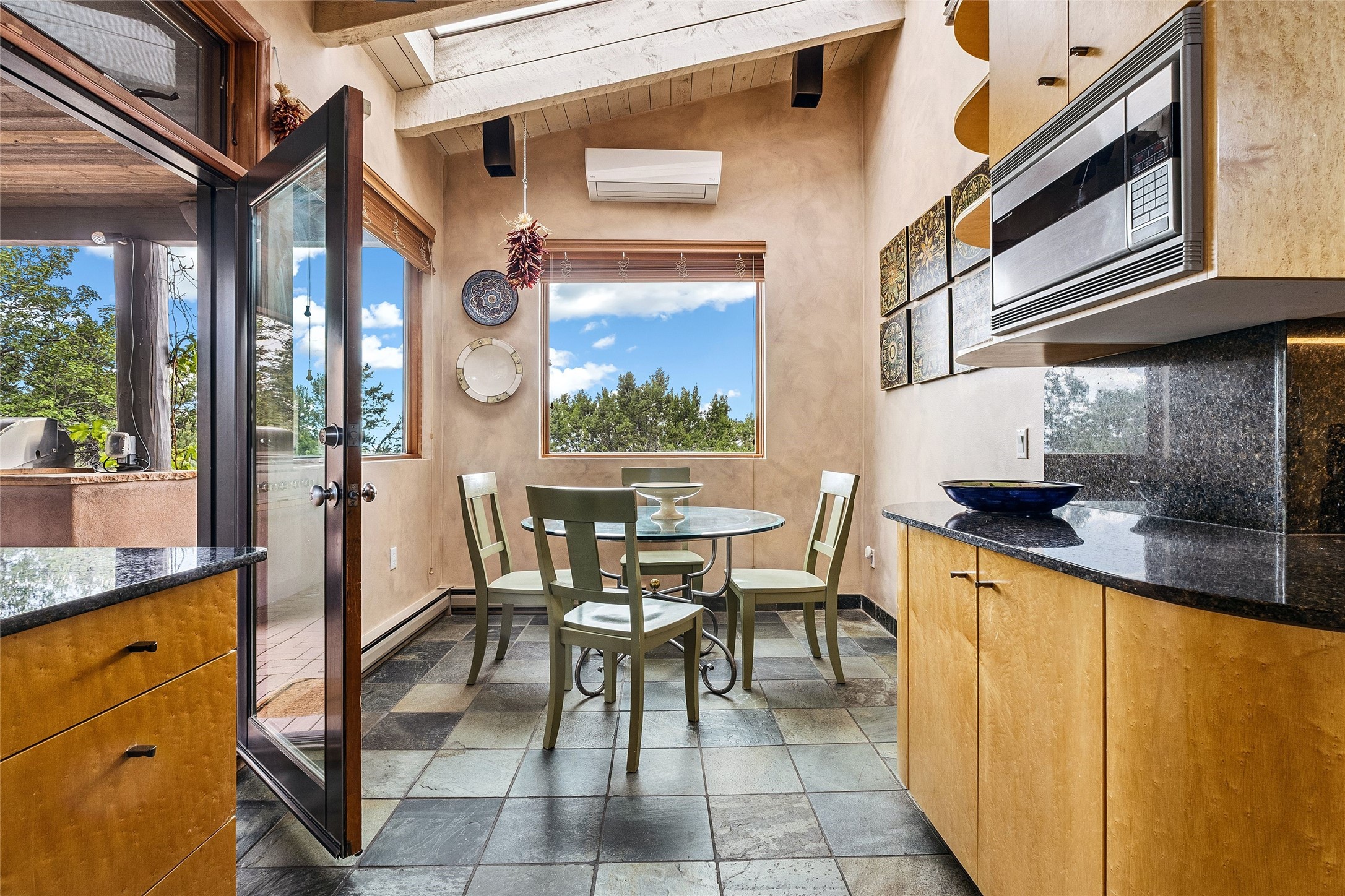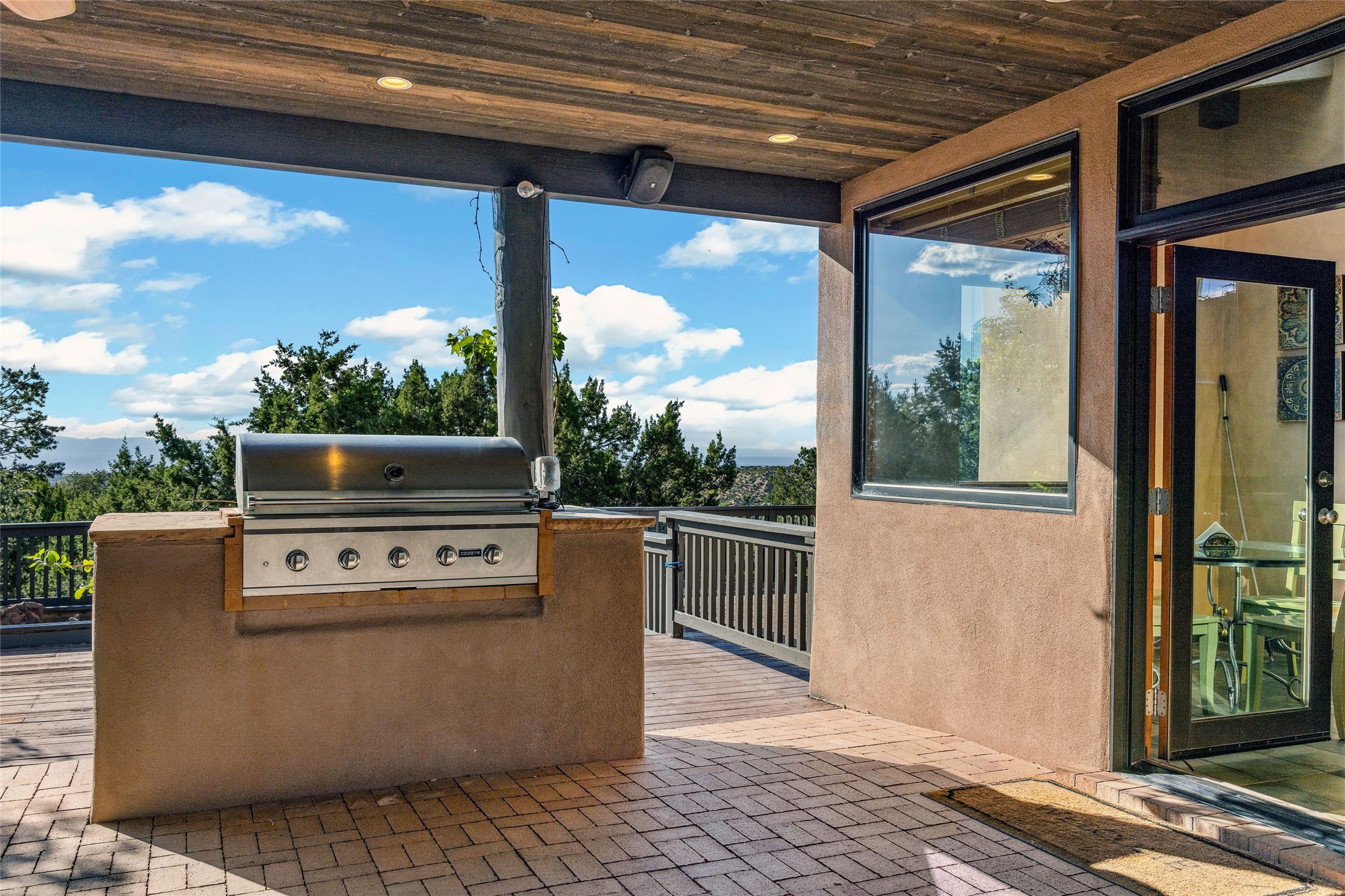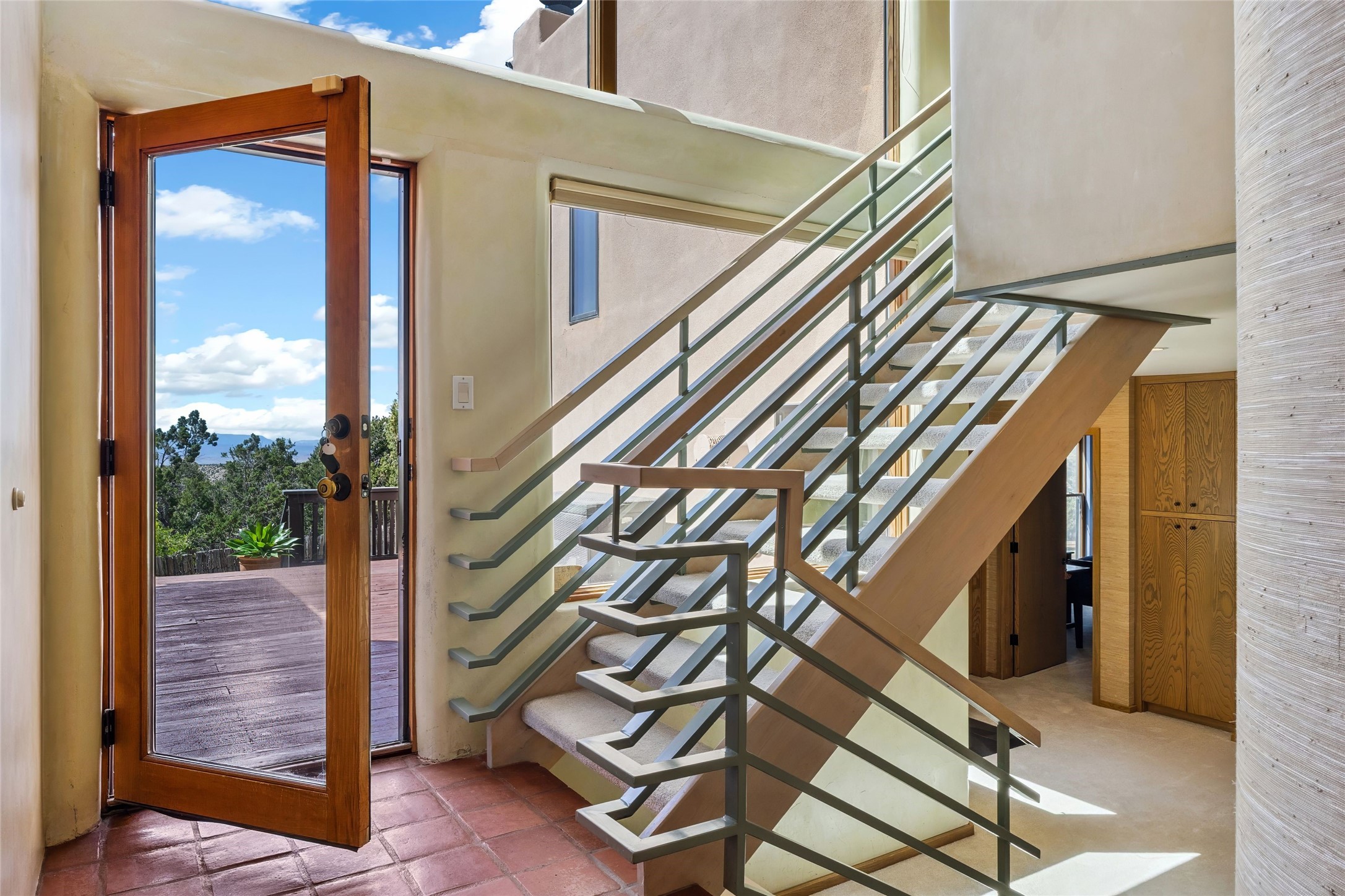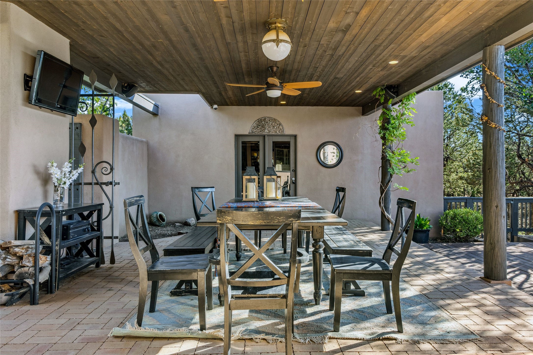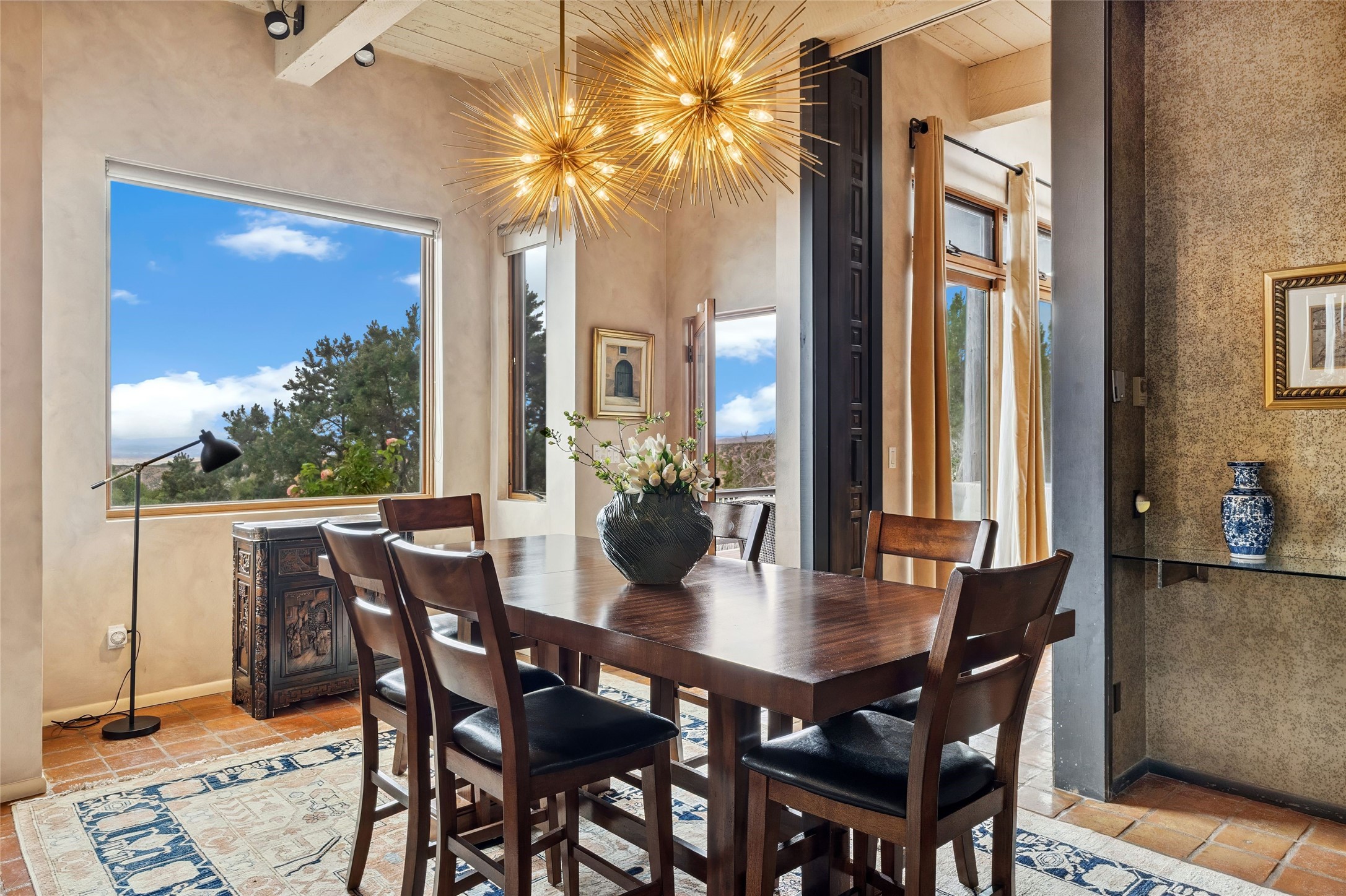 Contemporary Serenity with Panoramic Mountain Views in Vista Redonda: This gated sanctuary sits on 5.08 acres in the sought-after Vista Redonda neighborhood which is perched high on its own mesa. 54 Paseo Encantado offers awe-inspiring vistas of both the rugged Sangre de Cristo range to the east and the dramatic Jemez Mountains to the west--from sunrise to sunset, the views are nothing short of breathtaking.This architect designed 4-bedroom, 3-bath home spans 3,489 square feet and reflects a timeless contemporary design that complements its natural surroundings. With only three owners since its construction in 1973, it retains much of its original character and charm and was carefully maintained and thoughtfully preserved for over 21 years by the current owners. The layout is both functional and inviting. The main level features grand living and dining spaces that flow naturally to multiple outdoor living areas, including a deep covered portal ideal for al fresco dining. Just a few steps above the main floor is the spacious primary suite which includes a second living room with kiva fireplace and bar--perfect for quiet evenings or morning coffee with a view. Below the main level are three guest bedrooms and two baths, creating separation and privacy for family or visitors.The property includes a winding gravel drive, a two-car garage connected to the covered portal, mature native landscaping and ample flat buildable space should one wish to add a casita, guest house, or studio.A large solar array, installed in 2019, brings an added layer of energy efficiency to the property. Located just minutes from the Santa Fe National Forest, Four Seasons Resort Rancho Encantado, the Santa Fe Opera, Tesuque Village Market and approximately 15 minutes to all the cultural amenities of downtown Santa Fe, this rare offering in Vista Redonda is a private retreat with enduring style and soul.