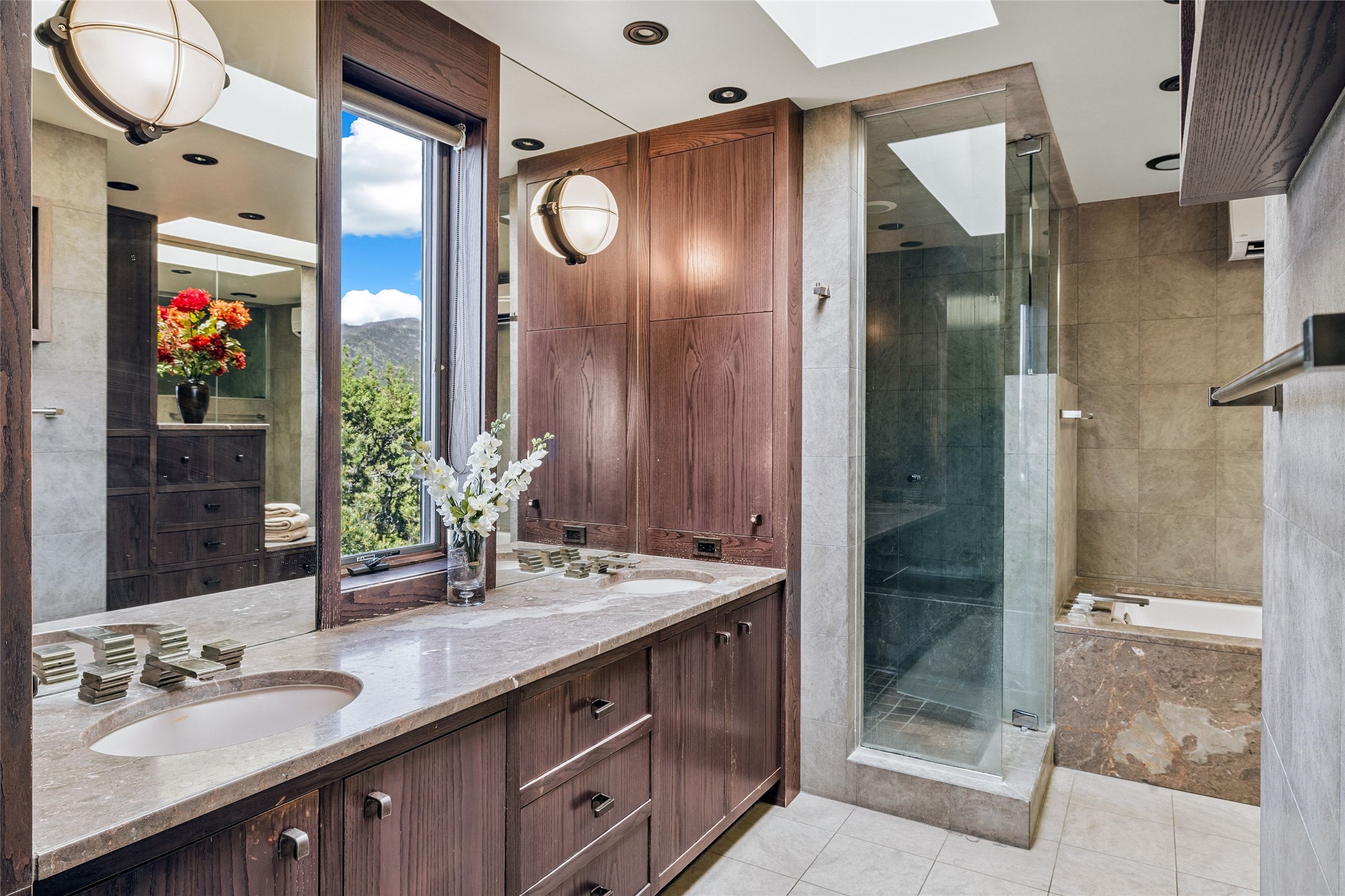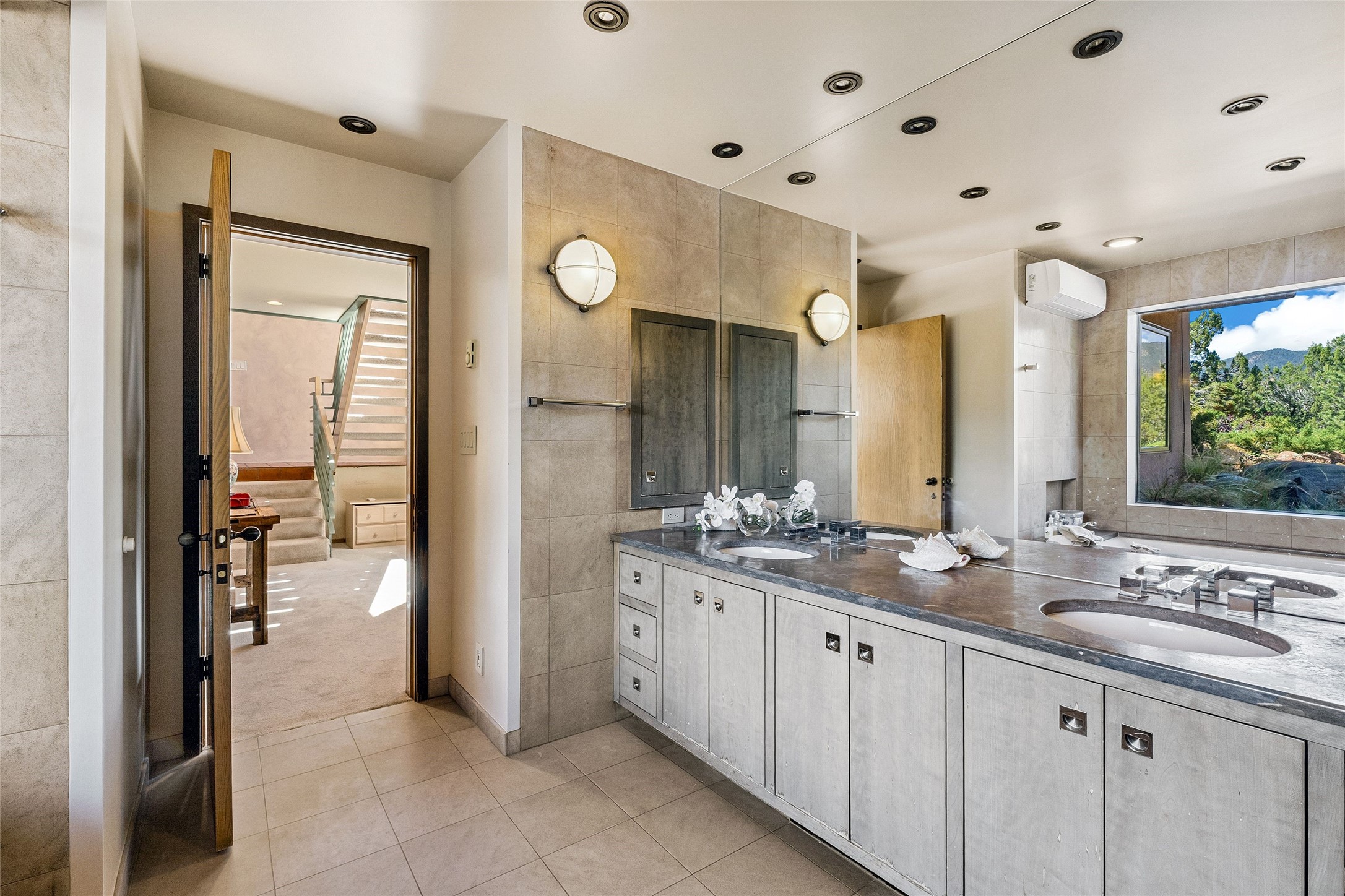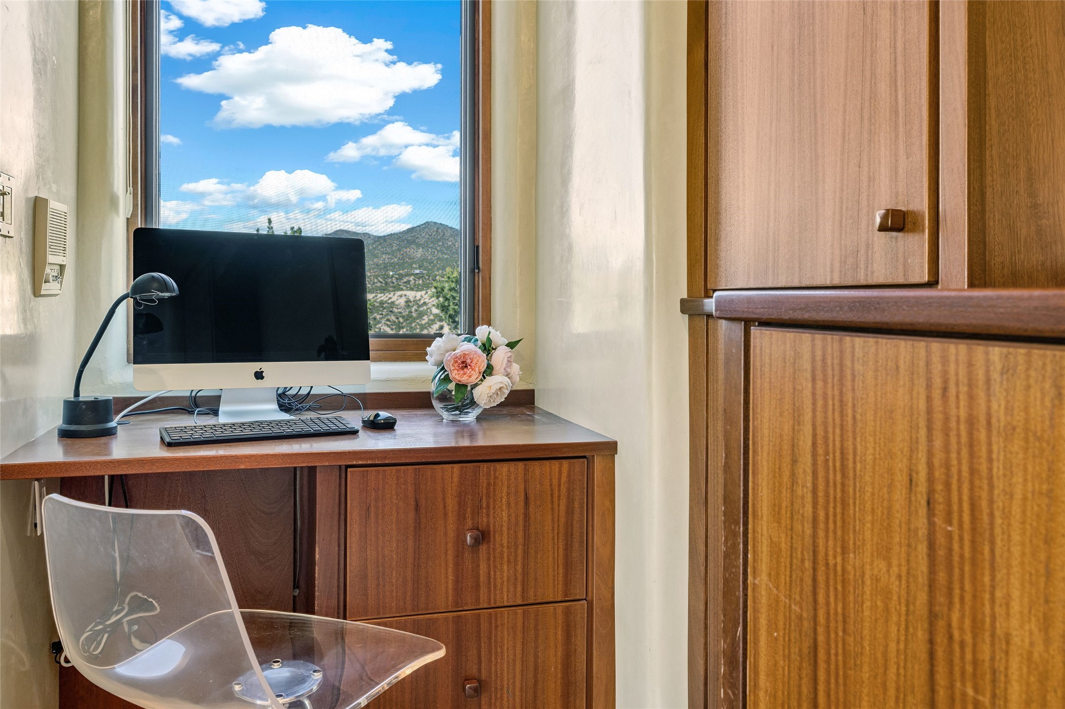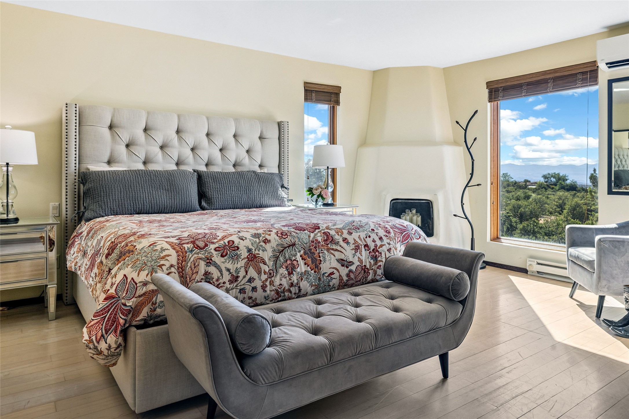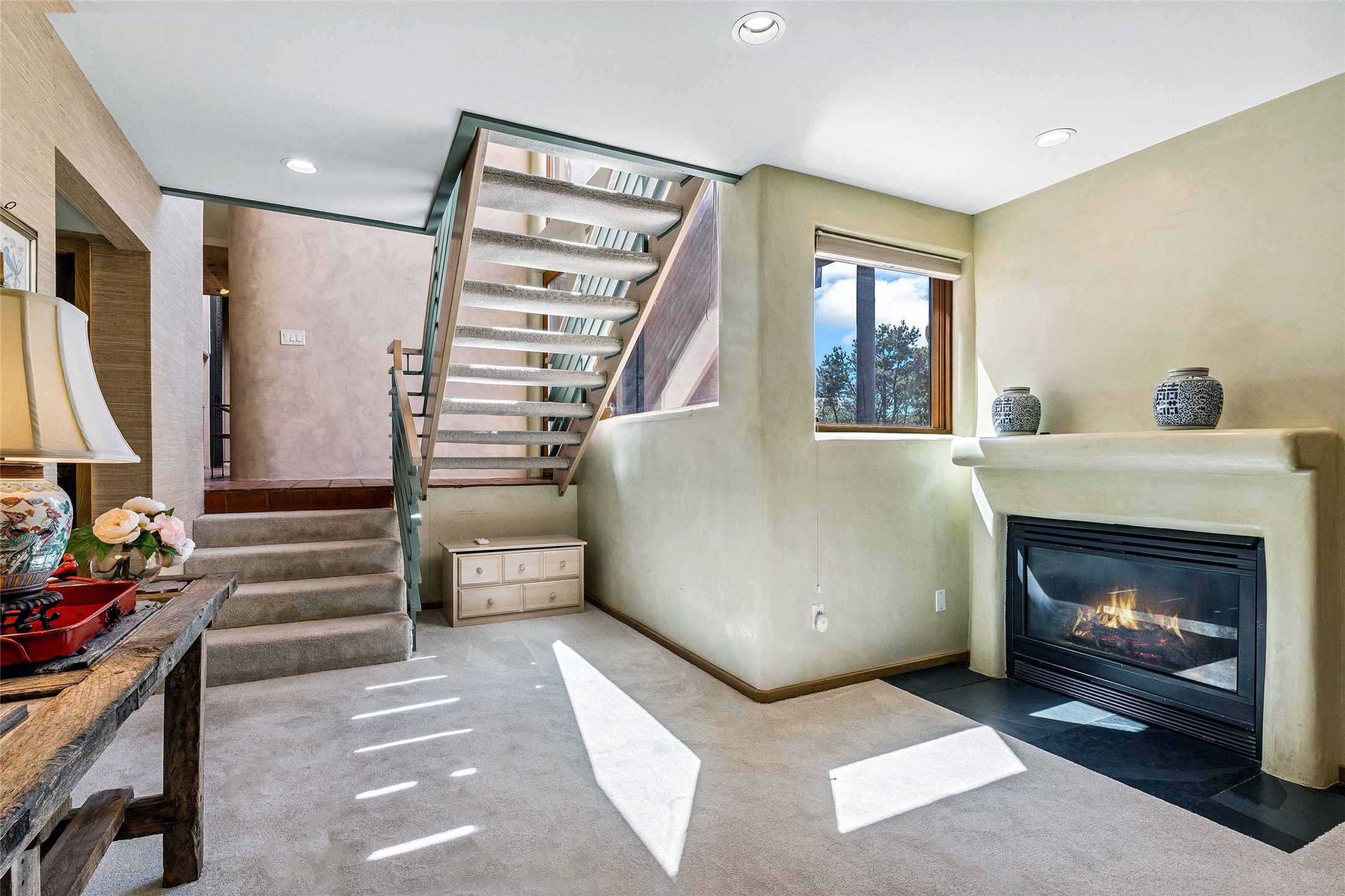 Contemporary Serenity with Panoramic Mountain Views in Vista Redonda: This gated sanctuary sits on 5.08 acres in the sought-after Vista Redonda neighborhood which is perched high on its own mesa. 54 Paseo Encantado offers awe-inspiring vistas of both the rugged Sangre de Cristo range to the east and the dramatic Jemez Mountains to the west--from sunrise to sunset, the views are nothing short of breathtaking.This architect designed 4-bedroom, 3-bath home spans 3,489 square feet and reflects a timeless contemporary design that complements its natural surroundings. With only three owners since its construction in 1973, it retains much of its original character and charm and was carefully maintained and thoughtfully preserved for over 21 years by the current owners. The layout is both functional and inviting. The main level features grand living and dining spaces that flow naturally to multiple outdoor living areas, including a deep covered portal ideal for al fresco dining. Just a few steps above the main floor is the spacious primary suite which includes a second living room with kiva fireplace and bar--perfect for quiet evenings or morning coffee with a view. Below the main level are three guest bedrooms and two baths, creating separation and privacy for family or visitors.The property includes a winding gravel drive, a two-car garage connected to the covered portal, mature native landscaping and ample flat buildable space should one wish to add a casita, guest house, or studio.A large solar array, installed in 2019, brings an added layer of energy efficiency to the property. Located just minutes from the Santa Fe National Forest, Four Seasons Resort Rancho Encantado, the Santa Fe Opera, Tesuque Village Market and approximately 15 minutes to all the cultural amenities of downtown Santa Fe, this rare offering in Vista Redonda is a private retreat with enduring style and soul.