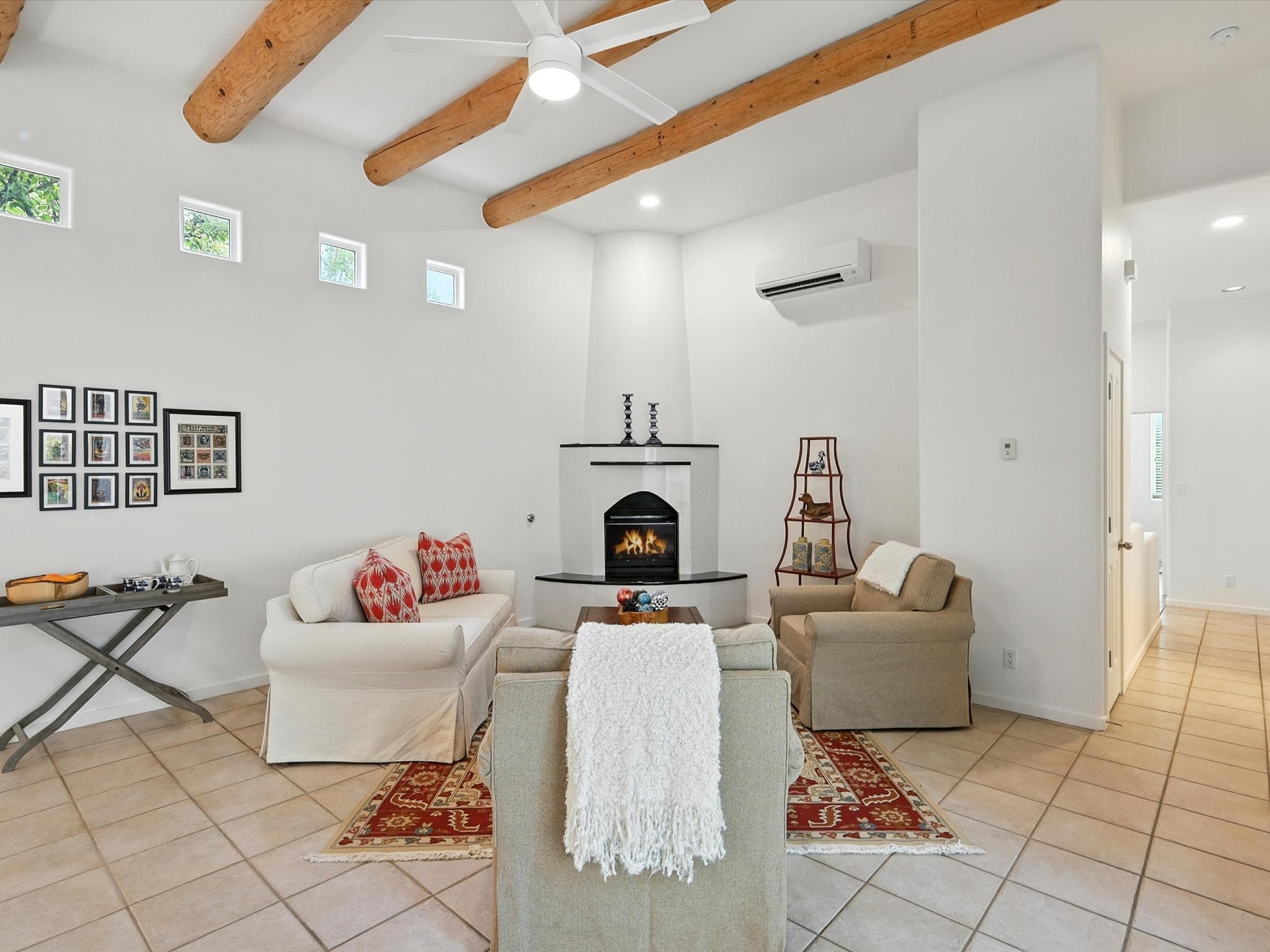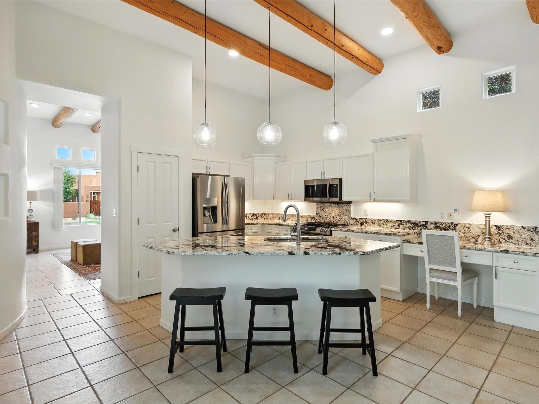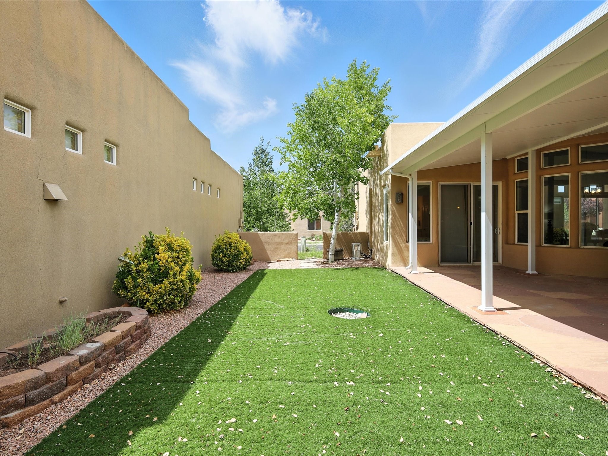 Newly staged and great new price, take another look! Exceptional property in Rancho Viejo, near trail access! Meticulously cared-for home greets you with Santa Fe charm, showcased by the stunning exposed Vigas & expansive ceilings in the living room. The seamless flow from the living room to the formal dining area boasts picturesque windows that overlook a beautifully landscaped backyard, inviting an abundance of natural light. Retreat to the primary suite, conveniently located off the living room, where you'll find direct access to a covered patio & the serene backyard. The luxurious primary bathroom features a separate jetted tub, a stylish shower, granite countertops with dual sinks, & a spacious walk-in closet. Discover a gorgeous kitchen that is both spacious & functional - highlighted by granite countertops, undermount lighting, stainless steel appliances, & a large island. This culinary haven opens to a generous family room, exposed Vigas & a cozy corner gas fireplace, creating the perfect setting for gatherings. Sliding doors from the family room lead to the expansive covered patio, ideal for entertaining. The other wing has a guest bathroom with granite countertops and a custom tub/shower, along with two well-appointed guest bedrooms that provide excellent separation from the primary suite. There is also a versatile bonus room suitable for an office, gym, theater, or other uses. The laundry room boasts upper cabinets & a utility sink, with direct access to both the garage & a secondary walled-in yard. The outdoor space of this property is truly a highlight, featuring a custom covered patio spanning over 600 sq. ft., perfect for entertaining, seamlessly flowing into a beautifully landscaped yard complete with artificial turf, lush shrubs, & an aspen tree. NEW ROOF IN 2024! Located within the Rancho Viejo community, enjoy access to parks, miles of scenic walking trails, and breathtaking views. Come experience the beauty of this Santa Fe gem today!