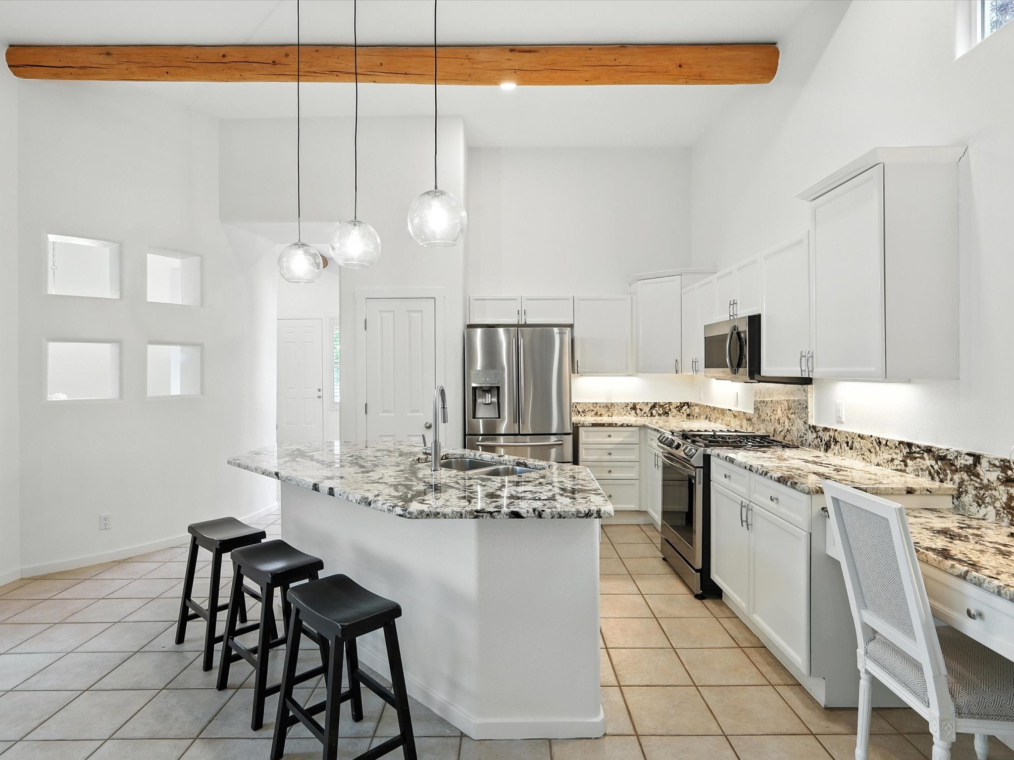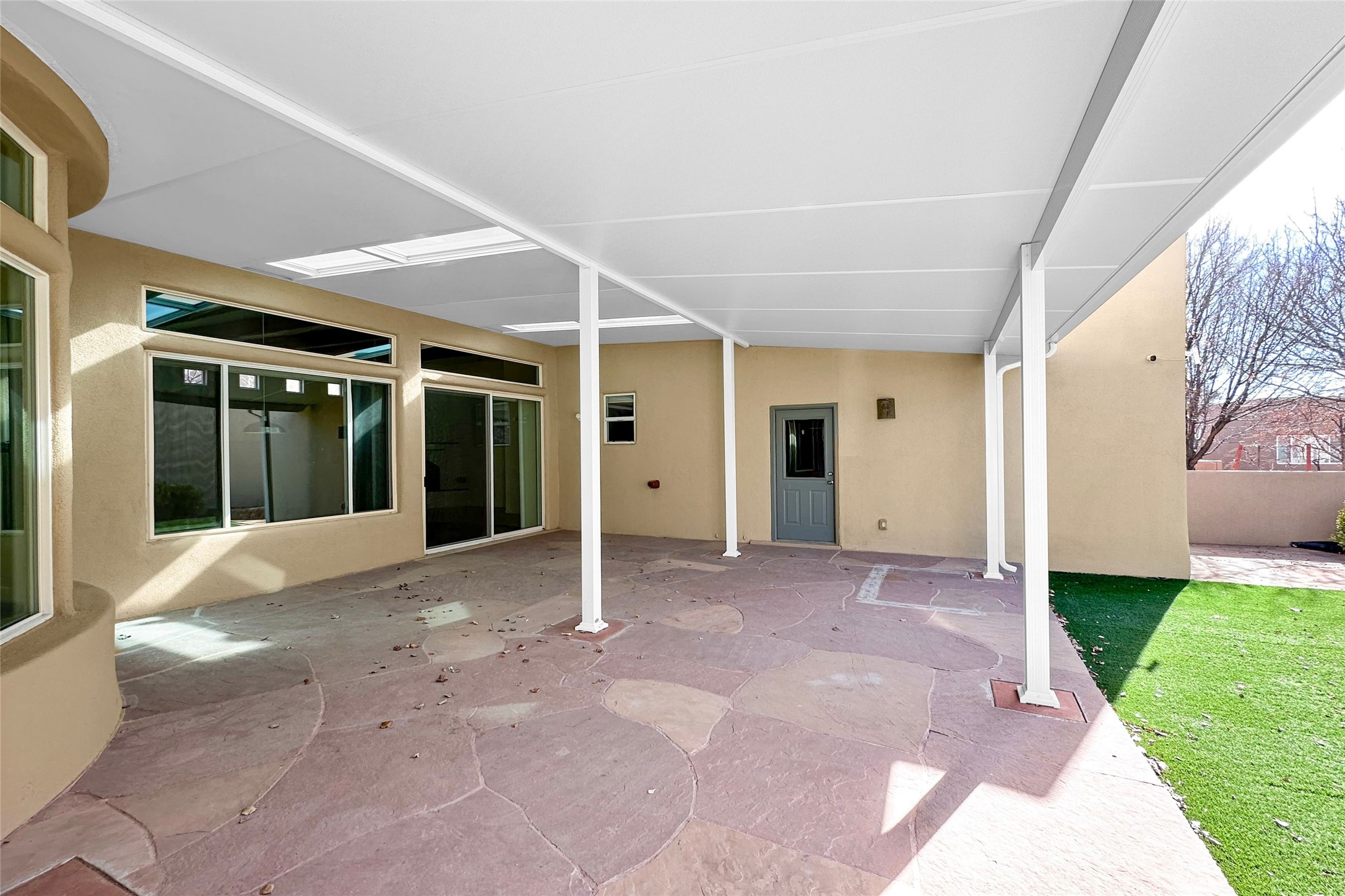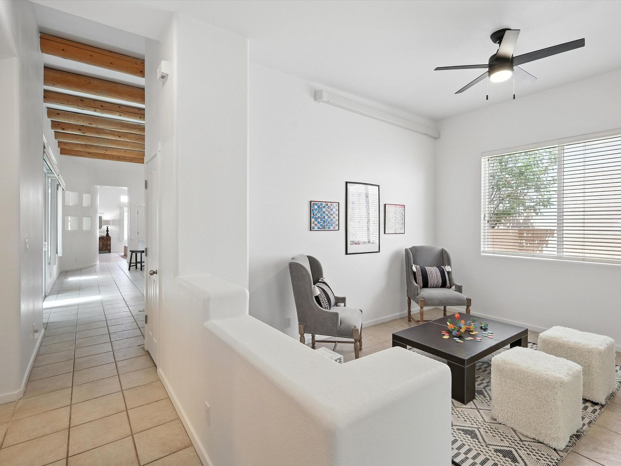 Newly staged and great new price, take another look! Exceptional property in Rancho Viejo, near trail access! Meticulously cared-for home greets you with Santa Fe charm, showcased by the stunning exposed Vigas & expansive ceilings in the living room. The seamless flow from the living room to the formal dining area boasts picturesque windows that overlook a beautifully landscaped backyard, inviting an abundance of natural light. Retreat to the primary suite, conveniently located off the living room, where you'll find direct access to a covered patio & the serene backyard. The luxurious primary bathroom features a separate jetted tub, a stylish shower, granite countertops with dual sinks, & a spacious walk-in closet. Discover a gorgeous kitchen that is both spacious & functional - highlighted by granite countertops, undermount lighting, stainless steel appliances, & a large island. This culinary haven opens to a generous family room, exposed Vigas & a cozy corner gas fireplace, creating the perfect setting for gatherings. Sliding doors from the family room lead to the expansive covered patio, ideal for entertaining. The other wing has a guest bathroom with granite countertops and a custom tub/shower, along with two well-appointed guest bedrooms that provide excellent separation from the primary suite. There is also a versatile bonus room suitable for an office, gym, theater, or other uses. The laundry room boasts upper cabinets & a utility sink, with direct access to both the garage & a secondary walled-in yard. The outdoor space of this property is truly a highlight, featuring a custom covered patio spanning over 600 sq. ft., perfect for entertaining, seamlessly flowing into a beautifully landscaped yard complete with artificial turf, lush shrubs, & an aspen tree. NEW ROOF IN 2024! Located within the Rancho Viejo community, enjoy access to parks, miles of scenic walking trails, and breathtaking views. Come experience the beauty of this Santa Fe gem today!