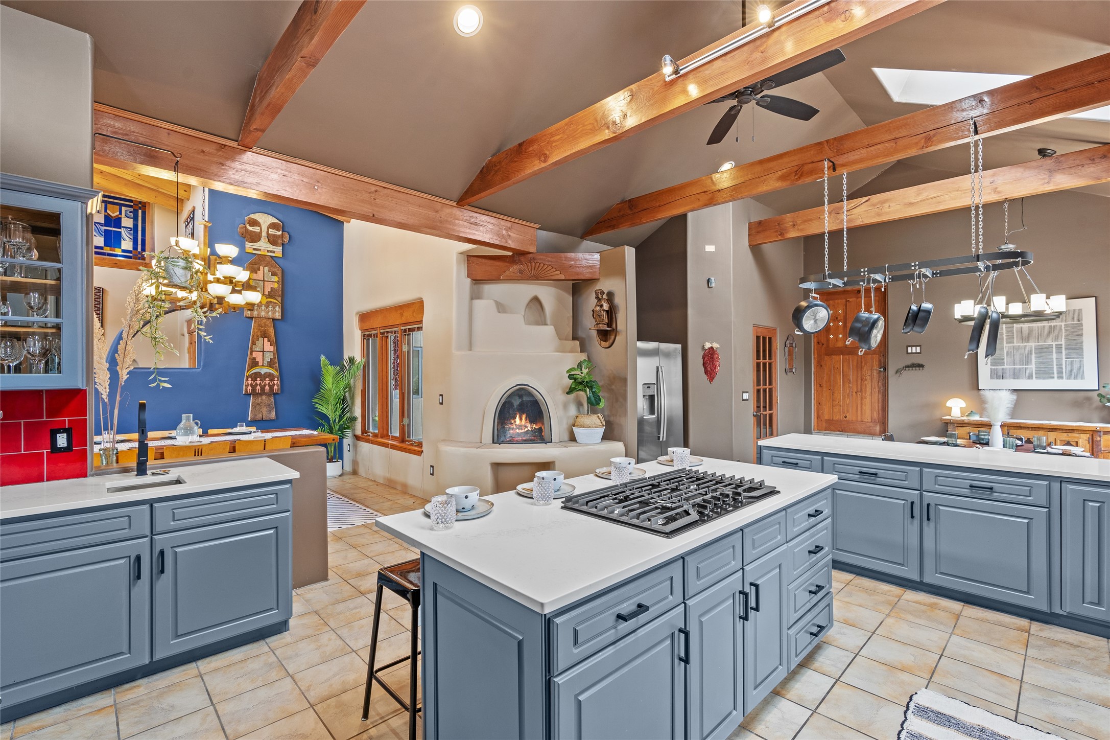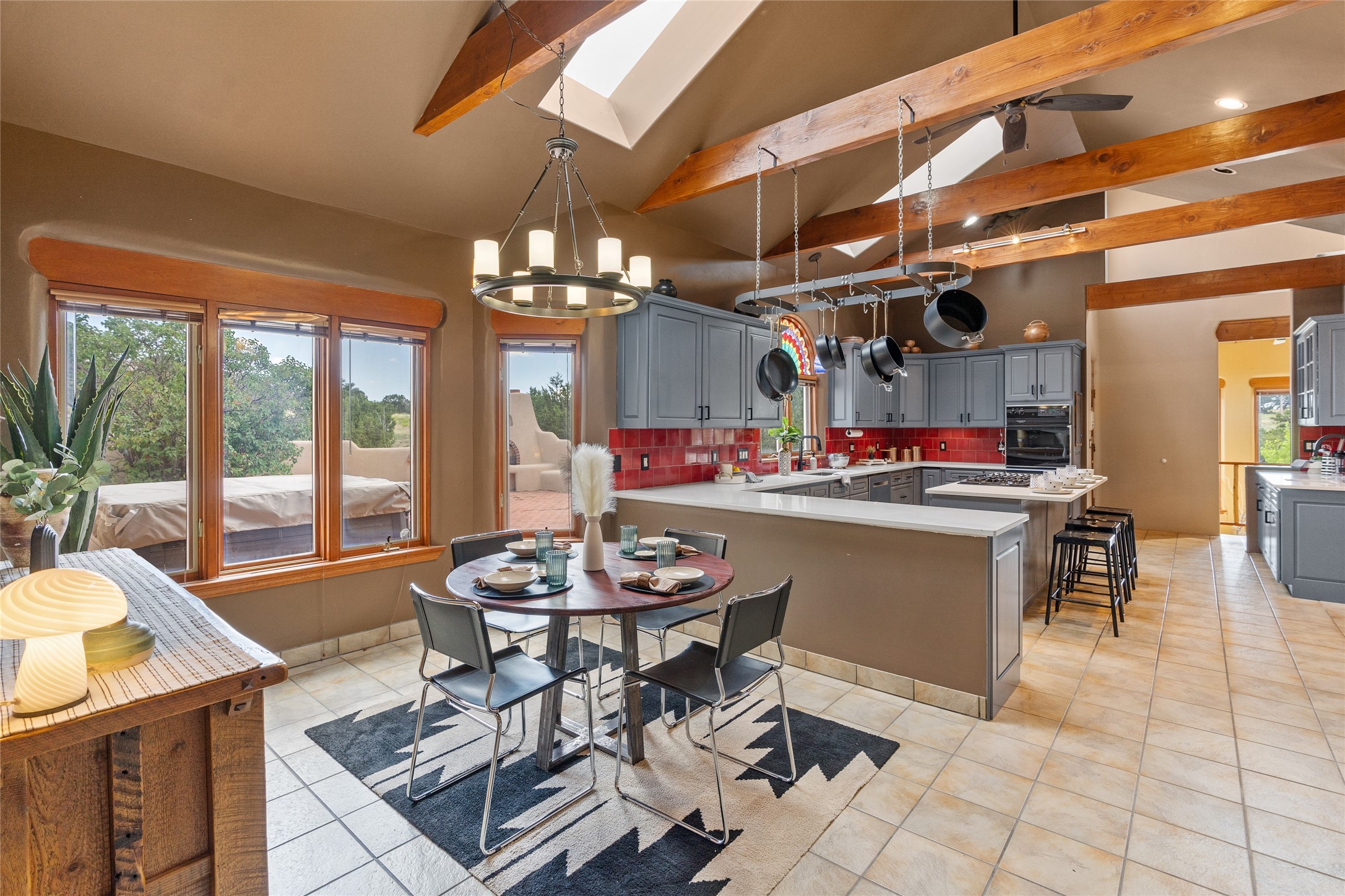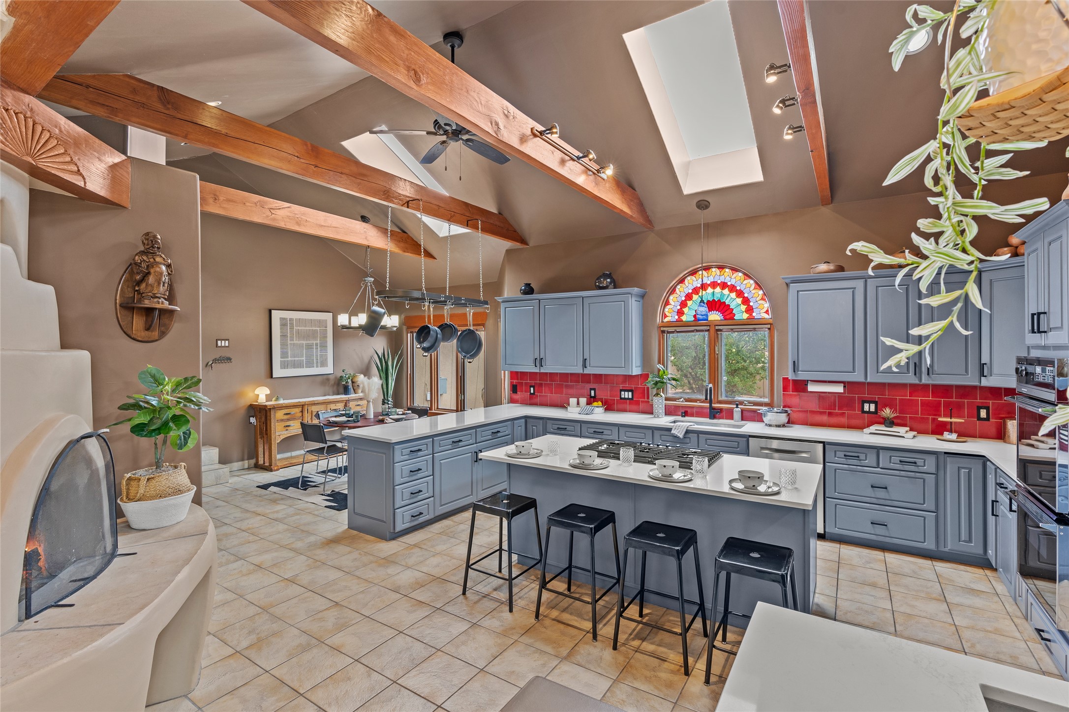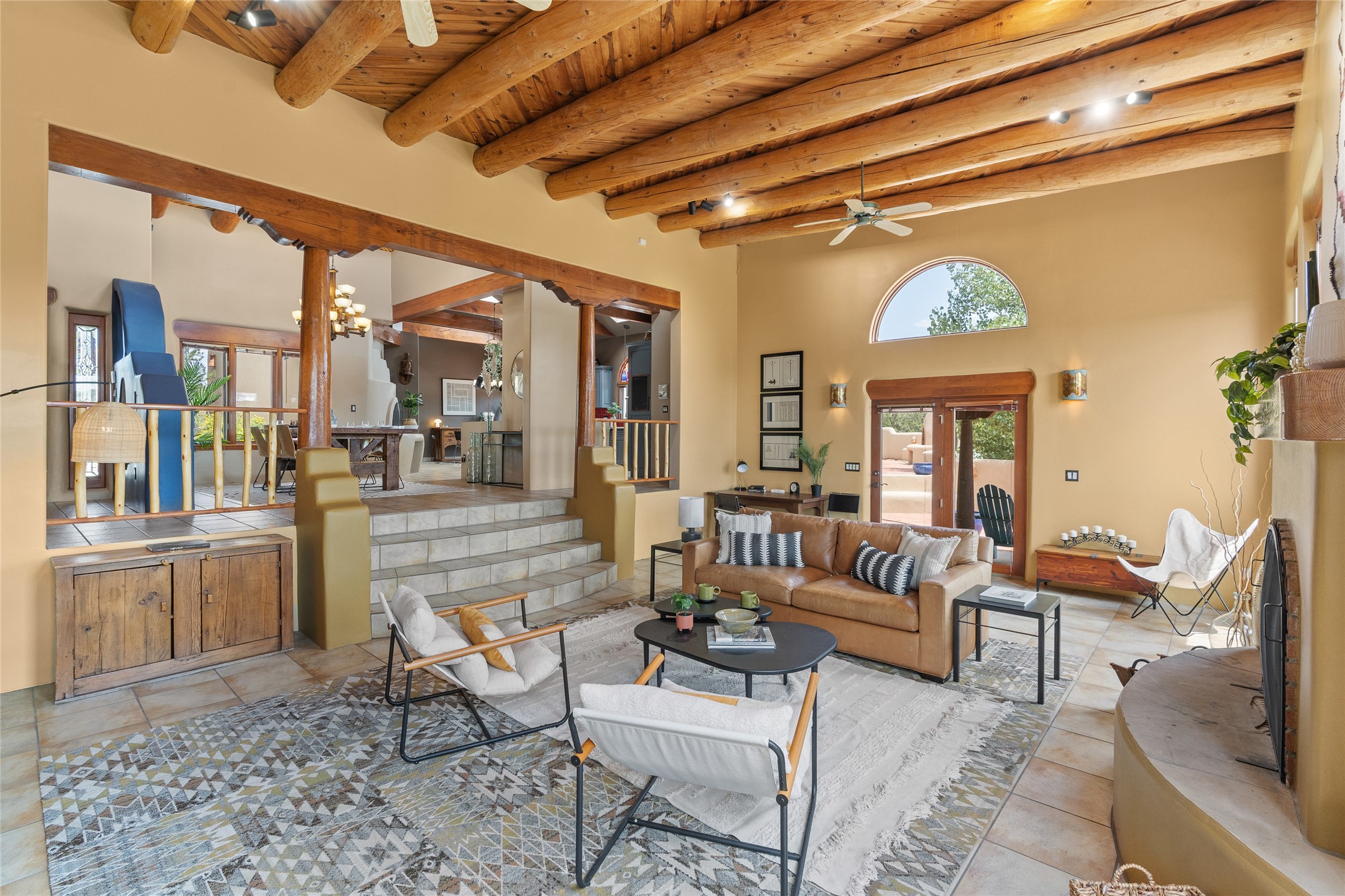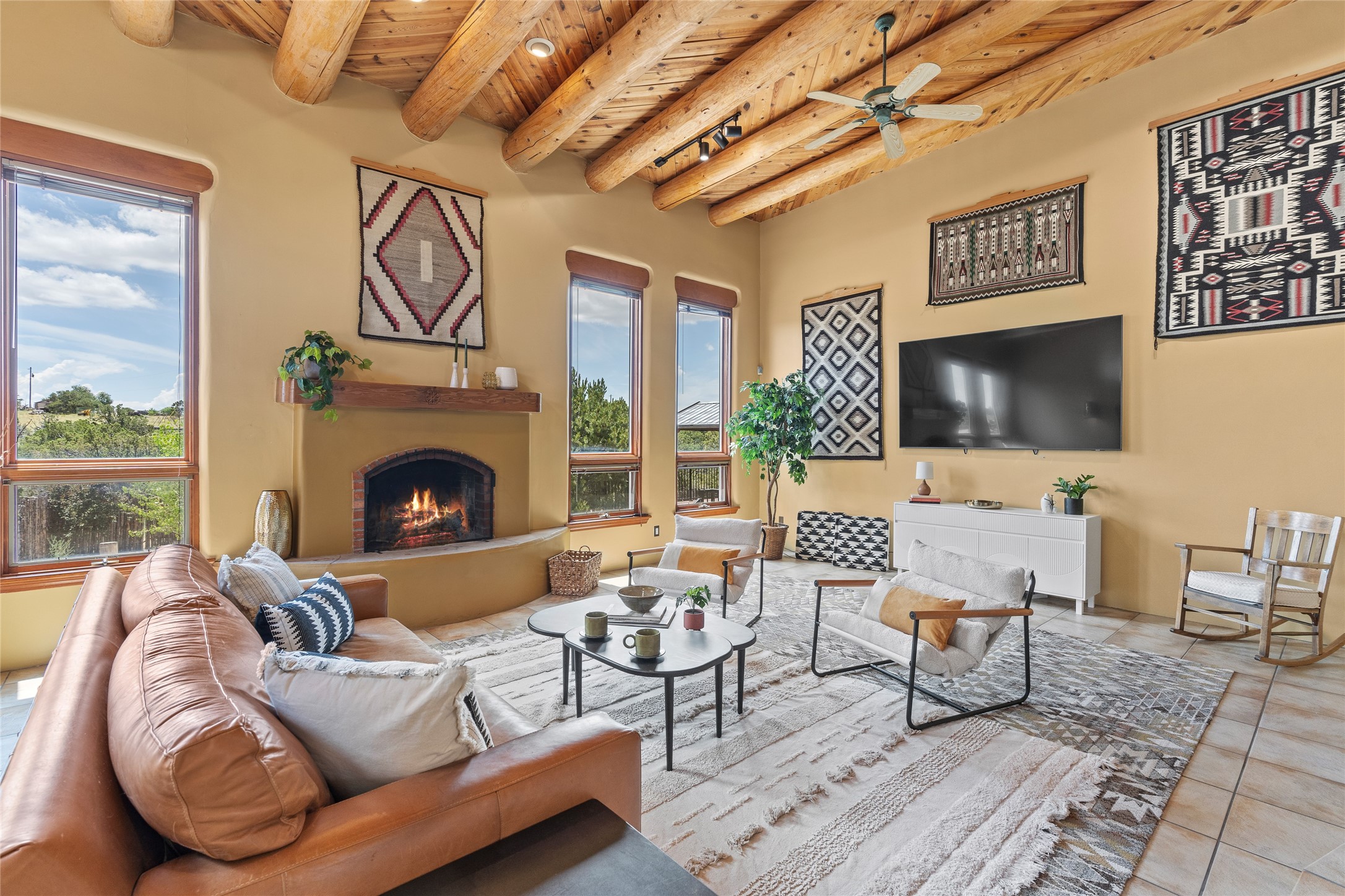 Just 10 minutes from downtown Santa Fe, this 3,255 sq. ft. 4-bedroom, 2.5-bath home on 2.5 acres offers the perfect blend of country living and city convenience. With a private well, a 3-car garage plus storage area, and rich Southwestern character, this one-of-a-kind property is a peaceful retreat with personality and presence. Step inside to soaring spaces and abundant natural light. The open-concept living, kitchen, and dining areas are unified yet distinct, each defined by vaulted ceilings and architectural detail. The main living room--anchored by a striking fireplace--features 14-foot viga ceilings and generous windows that fill the space with natural light. The formal dining room, with its vaulted ceiling of vigas and latillas, is illuminated by dramatic clerestory windows. A raised kiva fireplace creates a warm connection between the dining room and kitchen. The kitchen is both vibrant and functional, featuring a vaulted, beamed ceiling, extensive countertops, a central cooking island with bar seating, and a colorful half-circle stained glass window that echoes the kitchen's playful palette. A connected breakfast nook offers the perfect spot for casual dining. The spacious primary suite is a private sanctuary with soaring ceilings, a floor-to-ceiling kiva fireplace, and a 650 sq. ft. private deck with a cozy gazebo for relaxing outdoors. The ensuite bath features high ceilings, vivid blue tile, and a dramatic walk-in shower that feels like a personal spa. The guest wing offers three additional bedrooms--one currently serving as a game room with a pool table--and a beautifully updated full bathroom.With privacy, style, and unmistakable Southwestern charm, this exceptional property is a rare opportunity just minutes from the heart of Santa Fe.