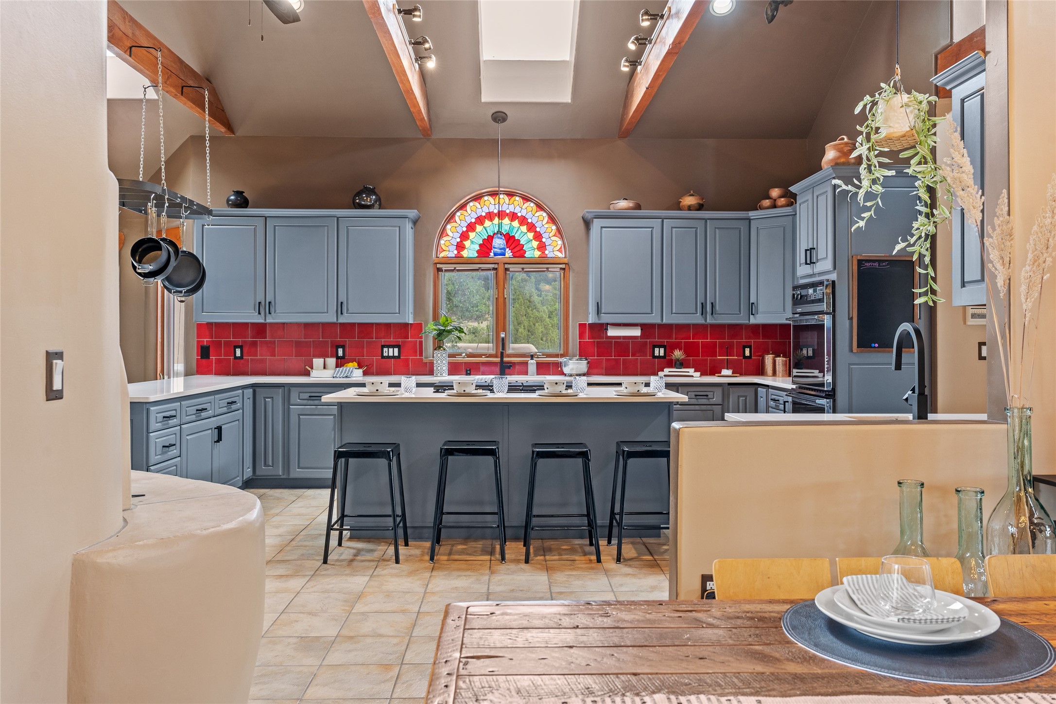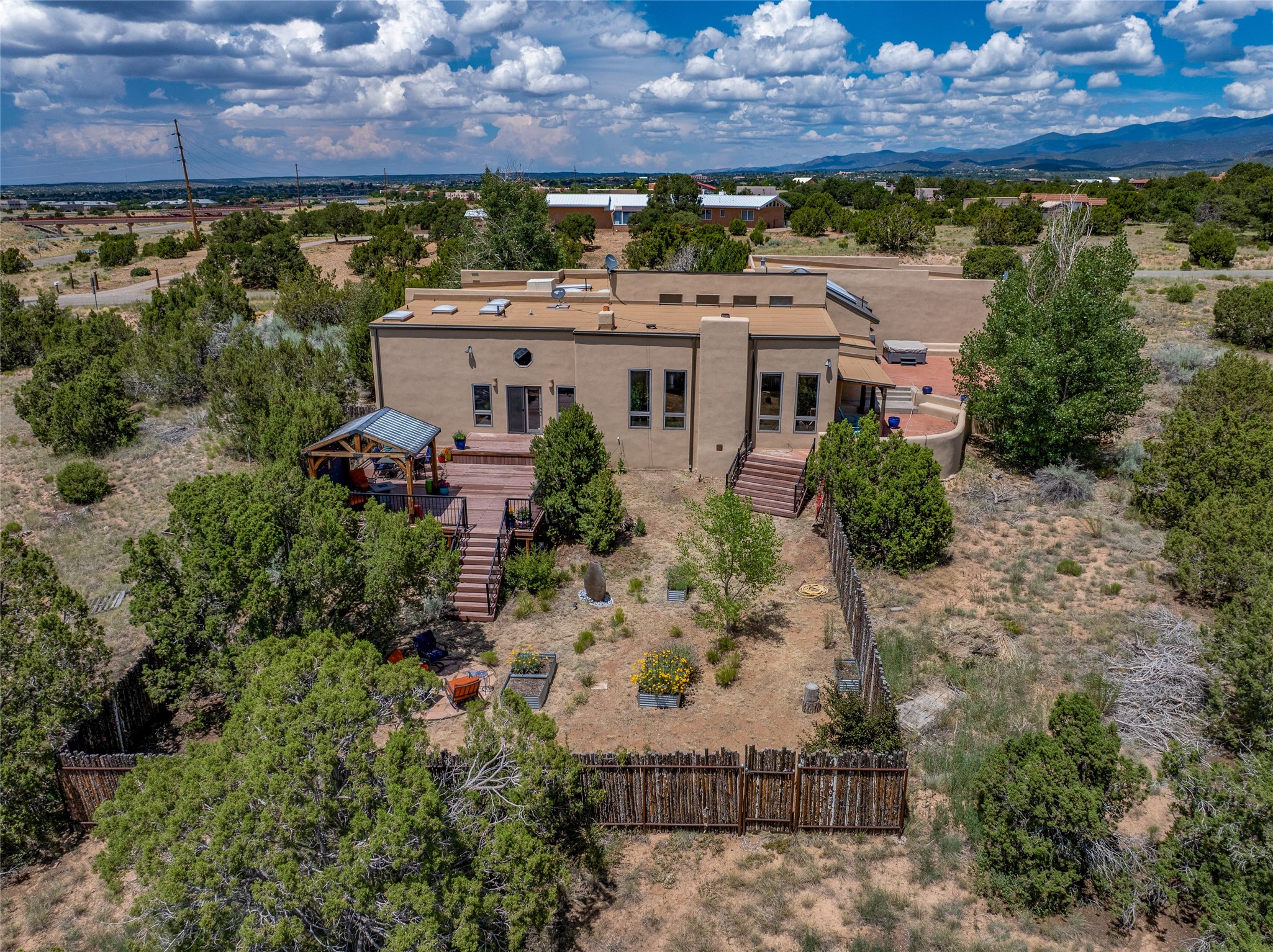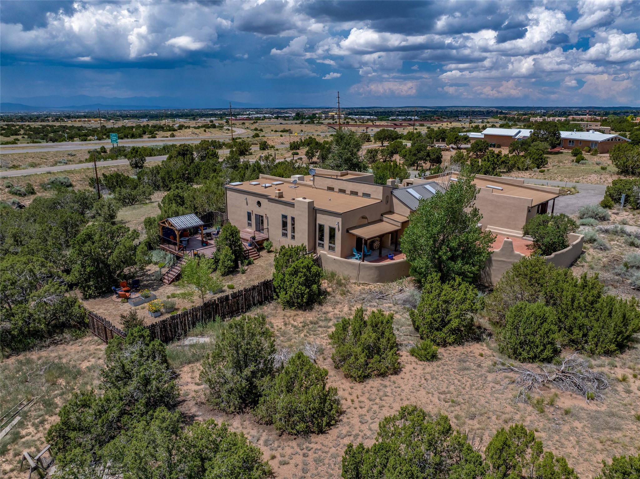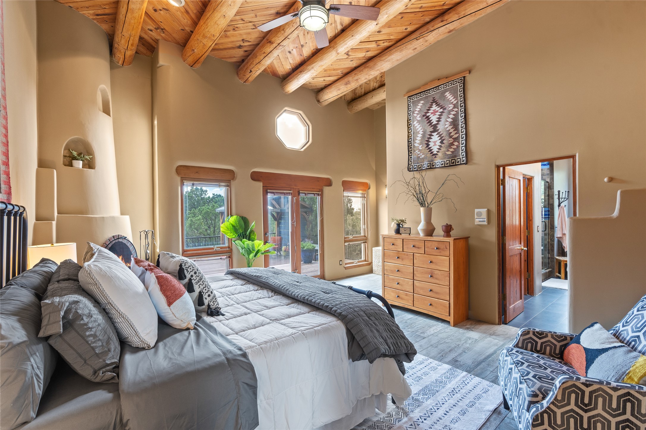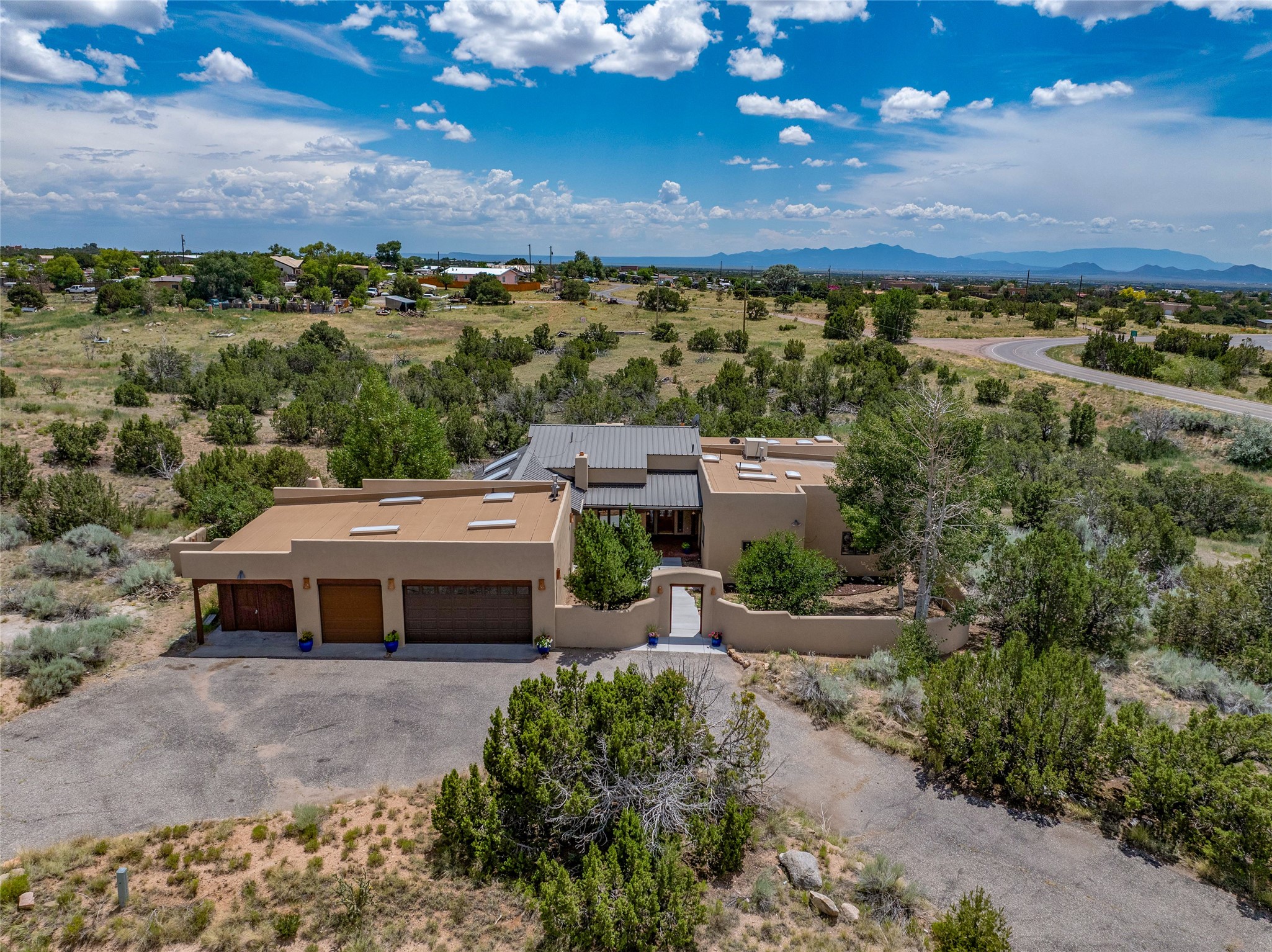Just 10 minutes from downtown Santa Fe, this 3,255 sq. ft. 4-bedroom, 2.5-bath home on 2.5 acres offers the perfect blend of country living and city convenience. With a private well, a 3-car garage plus storage area, and rich Southwestern character, this one-of-a-kind property is a peaceful retreat with personality and presence. Step inside to soaring spaces and abundant natural light. The open-concept living, kitchen, and dining areas are unified yet distinct, each defined by vaulted ceilings and architectural detail. The main living room--anchored by a striking fireplace--features 14-foot viga ceilings and generous windows that fill the space with natural light. The formal dining room, with its vaulted ceiling of vigas and latillas, is illuminated by dramatic clerestory windows. A raised kiva fireplace creates a warm connection between the dining room and kitchen. The kitchen is both vibrant and functional, featuring a vaulted, beamed ceiling, extensive countertops, a central cooking island with bar seating, and a colorful half-circle stained glass window that echoes the kitchen's playful palette. A connected breakfast nook offers the perfect spot for casual dining. The spacious primary suite is a private sanctuary with soaring ceilings, a floor-to-ceiling kiva fireplace, and a 650 sq. ft. private deck with a cozy gazebo for relaxing outdoors. The ensuite bath features high ceilings, vivid blue tile, and a dramatic walk-in shower that feels like a personal spa. The guest wing offers three additional bedrooms--one currently serving as a game room with a pool table--and a beautifully updated full bathroom.With privacy, style, and unmistakable Southwestern charm, this exceptional property is a rare opportunity just minutes from the heart of Santa Fe.