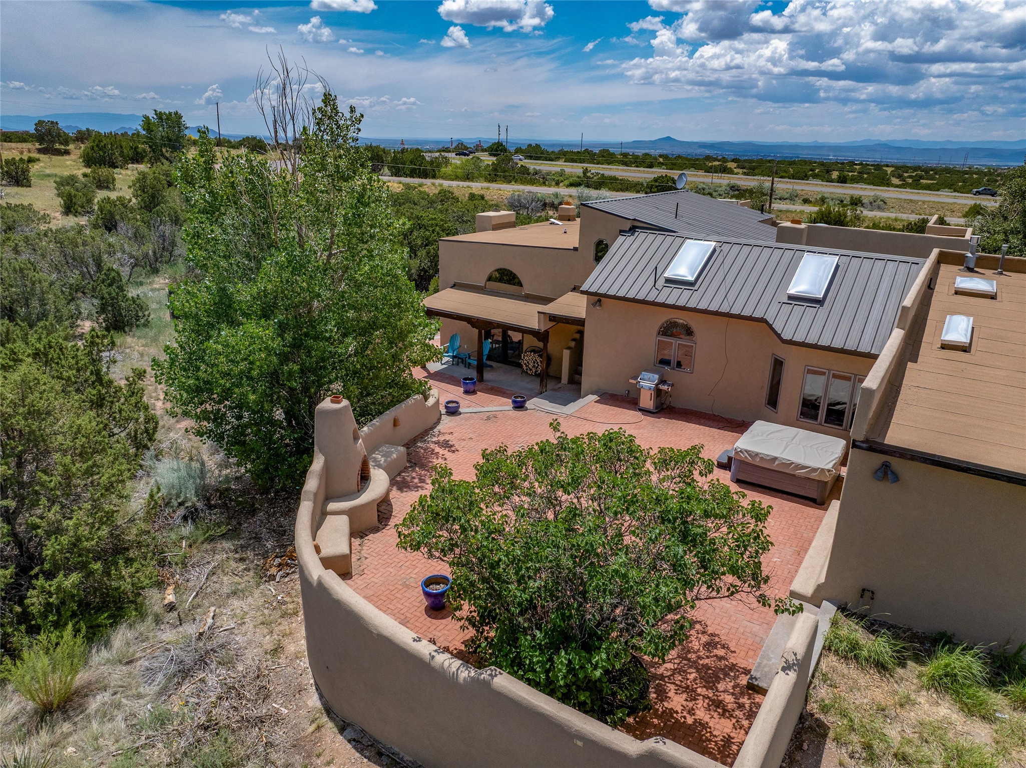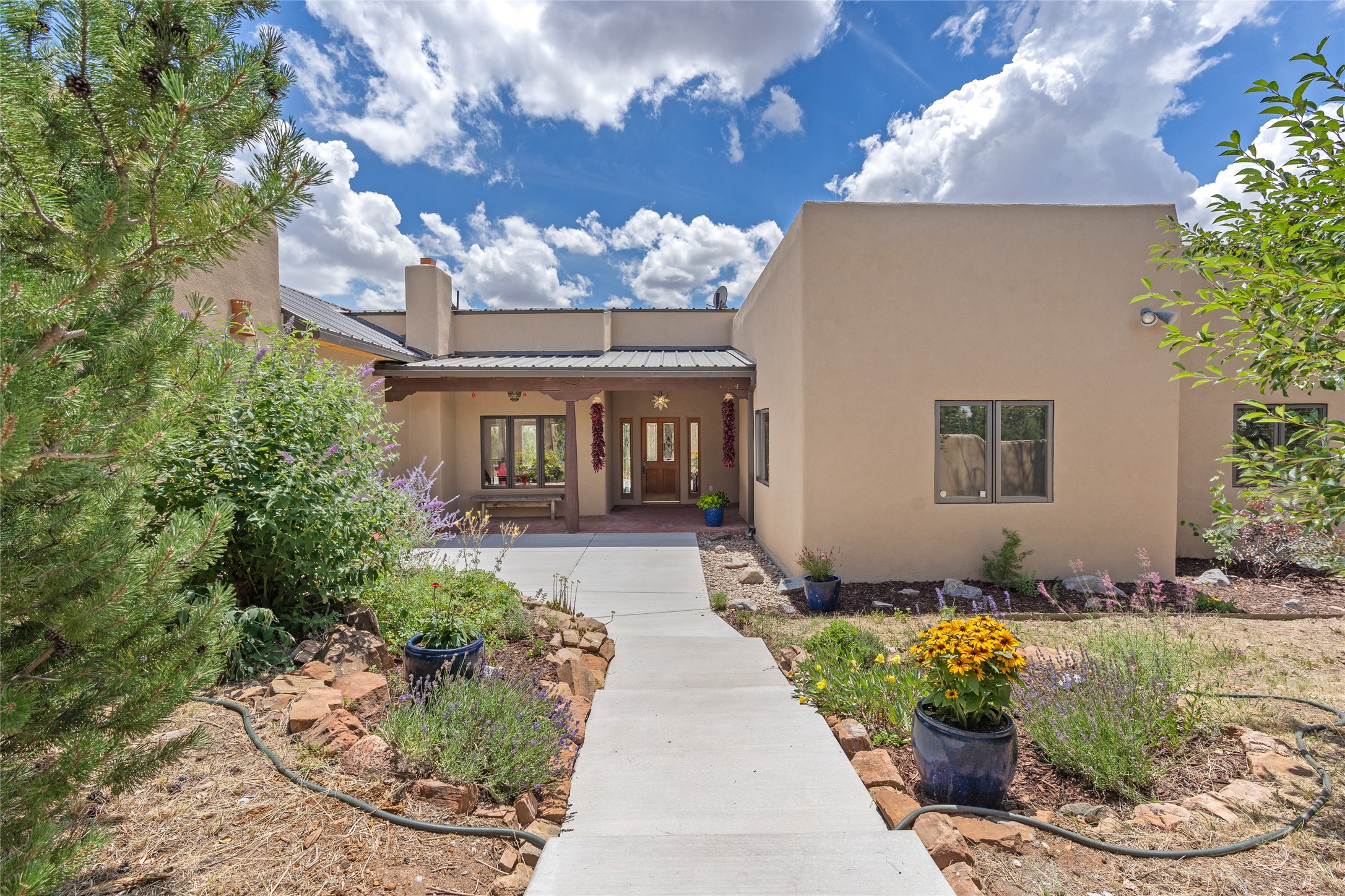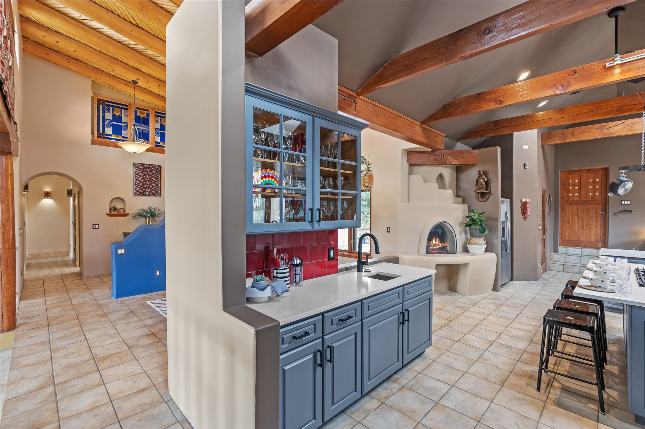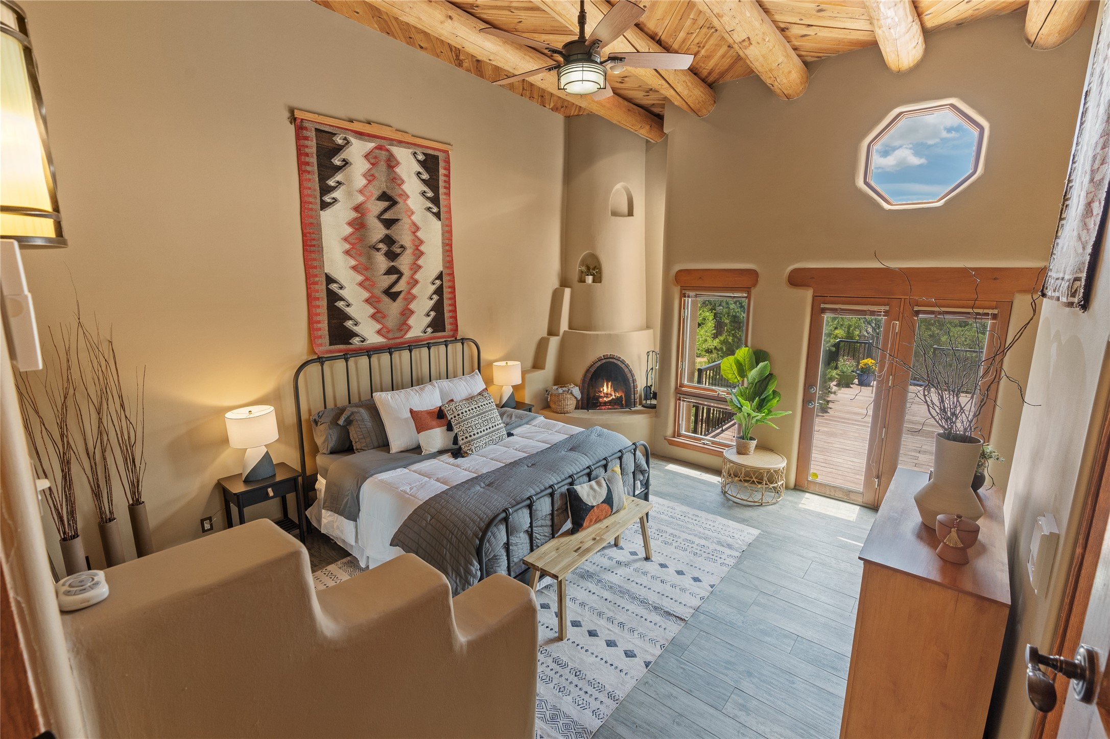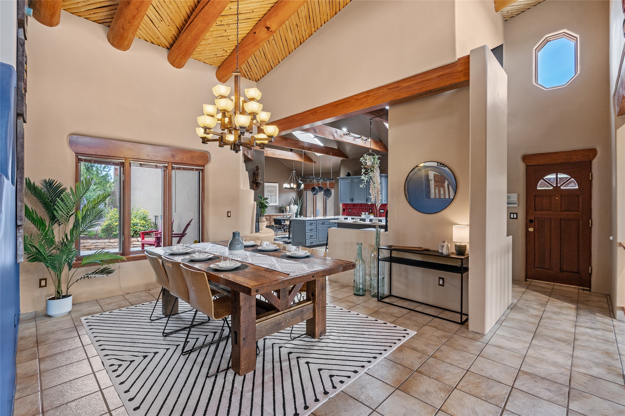 Just 10 minutes from downtown Santa Fe, this 3,255 sq. ft. 4-bedroom, 2.5-bath home on 2.5 acres offers the perfect blend of country living and city convenience. With a private well, a 3-car garage plus storage area, and rich Southwestern character, this one-of-a-kind property is a peaceful retreat with personality and presence. Step inside to soaring spaces and abundant natural light. The open-concept living, kitchen, and dining areas are unified yet distinct, each defined by vaulted ceilings and architectural detail. The main living room--anchored by a striking fireplace--features 14-foot viga ceilings and generous windows that fill the space with natural light. The formal dining room, with its vaulted ceiling of vigas and latillas, is illuminated by dramatic clerestory windows. A raised kiva fireplace creates a warm connection between the dining room and kitchen. The kitchen is both vibrant and functional, featuring a vaulted, beamed ceiling, extensive countertops, a central cooking island with bar seating, and a colorful half-circle stained glass window that echoes the kitchen's playful palette. A connected breakfast nook offers the perfect spot for casual dining. The spacious primary suite is a private sanctuary with soaring ceilings, a floor-to-ceiling kiva fireplace, and a 650 sq. ft. private deck with a cozy gazebo for relaxing outdoors. The ensuite bath features high ceilings, vivid blue tile, and a dramatic walk-in shower that feels like a personal spa. The guest wing offers three additional bedrooms--one currently serving as a game room with a pool table--and a beautifully updated full bathroom.With privacy, style, and unmistakable Southwestern charm, this exceptional property is a rare opportunity just minutes from the heart of Santa Fe.