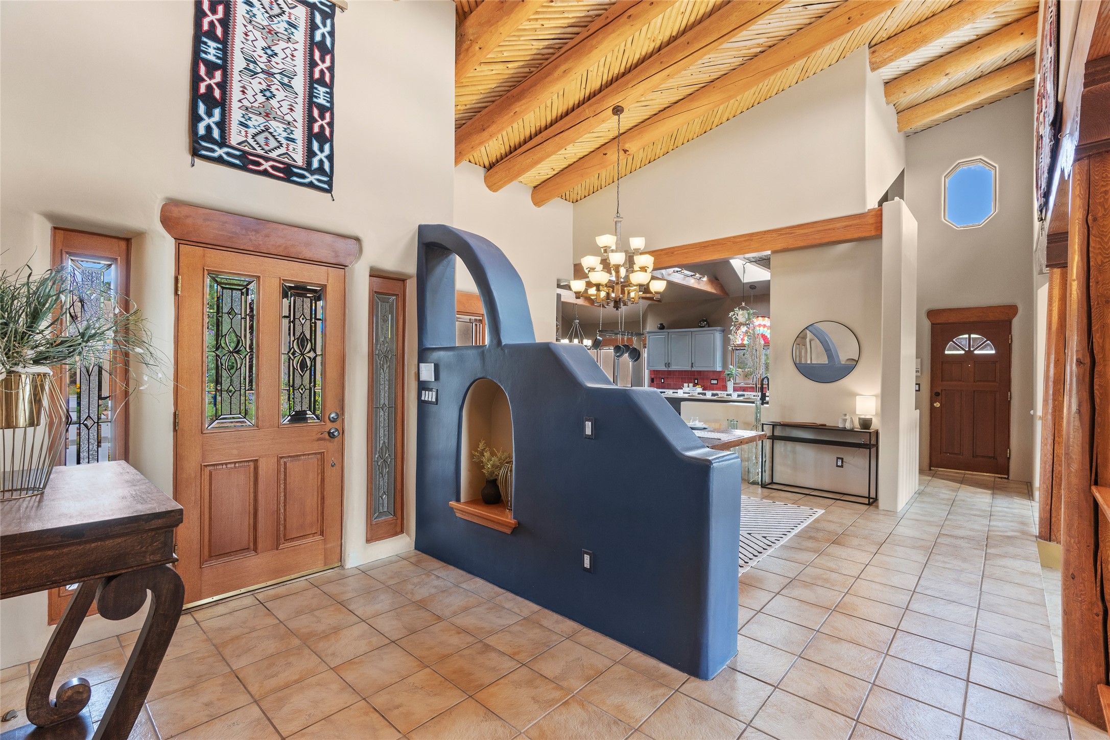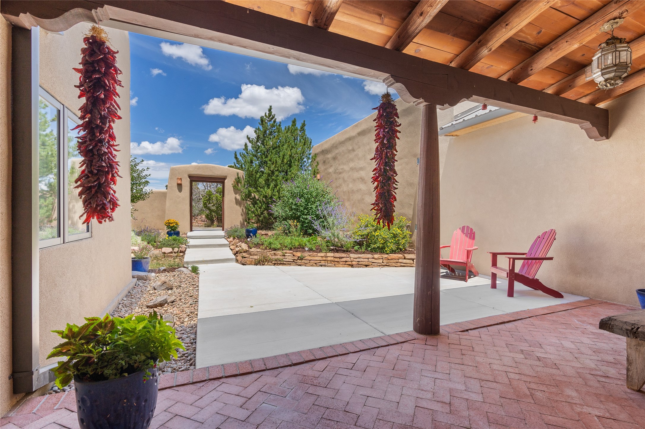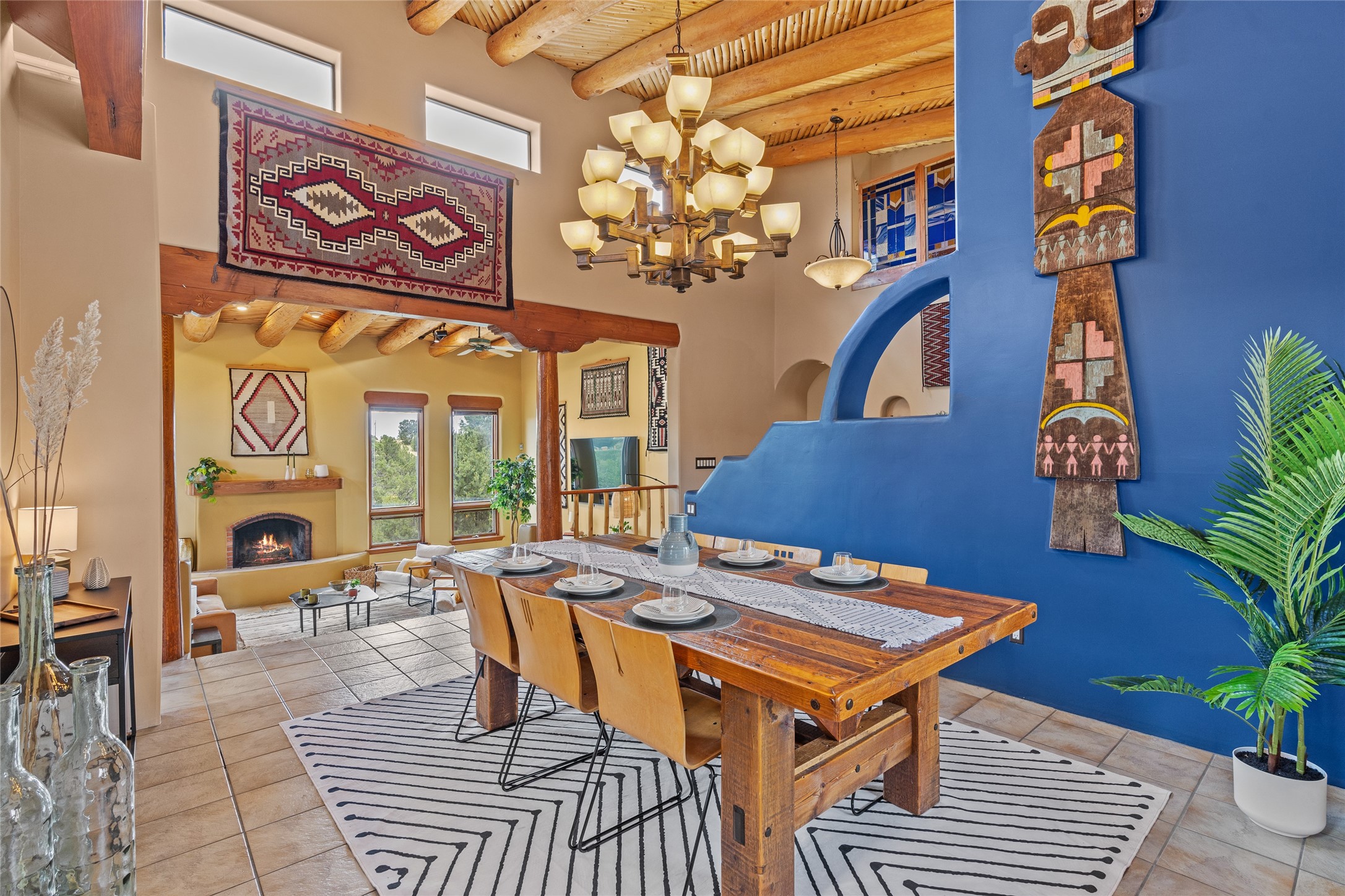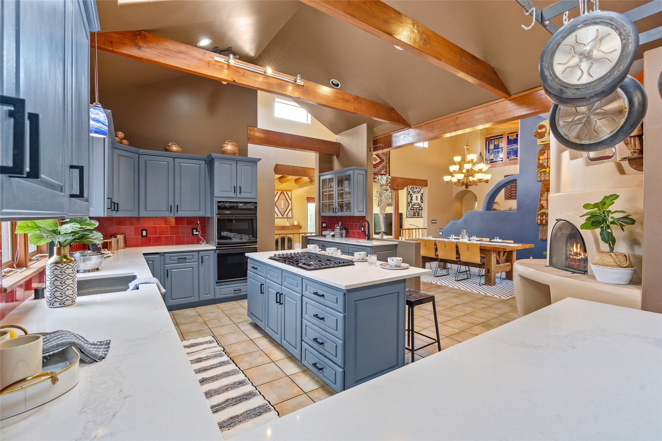 Just 10 minutes from downtown Santa Fe, this 3,255 sq. ft. 4-bedroom, 2.5-bath home on 2.5 acres offers the perfect blend of country living and city convenience. With a private well, a 3-car garage plus storage area, and rich Southwestern character, this one-of-a-kind property is a peaceful retreat with personality and presence. Step inside to soaring spaces and abundant natural light. The open-concept living, kitchen, and dining areas are unified yet distinct, each defined by vaulted ceilings and architectural detail. The main living room--anchored by a striking fireplace--features 14-foot viga ceilings and generous windows that fill the space with natural light. The formal dining room, with its vaulted ceiling of vigas and latillas, is illuminated by dramatic clerestory windows. A raised kiva fireplace creates a warm connection between the dining room and kitchen. The kitchen is both vibrant and functional, featuring a vaulted, beamed ceiling, extensive countertops, a central cooking island with bar seating, and a colorful half-circle stained glass window that echoes the kitchen's playful palette. A connected breakfast nook offers the perfect spot for casual dining. The spacious primary suite is a private sanctuary with soaring ceilings, a floor-to-ceiling kiva fireplace, and a 650 sq. ft. private deck with a cozy gazebo for relaxing outdoors. The ensuite bath features high ceilings, vivid blue tile, and a dramatic walk-in shower that feels like a personal spa. The guest wing offers three additional bedrooms--one currently serving as a game room with a pool table--and a beautifully updated full bathroom.With privacy, style, and unmistakable Southwestern charm, this exceptional property is a rare opportunity just minutes from the heart of Santa Fe.