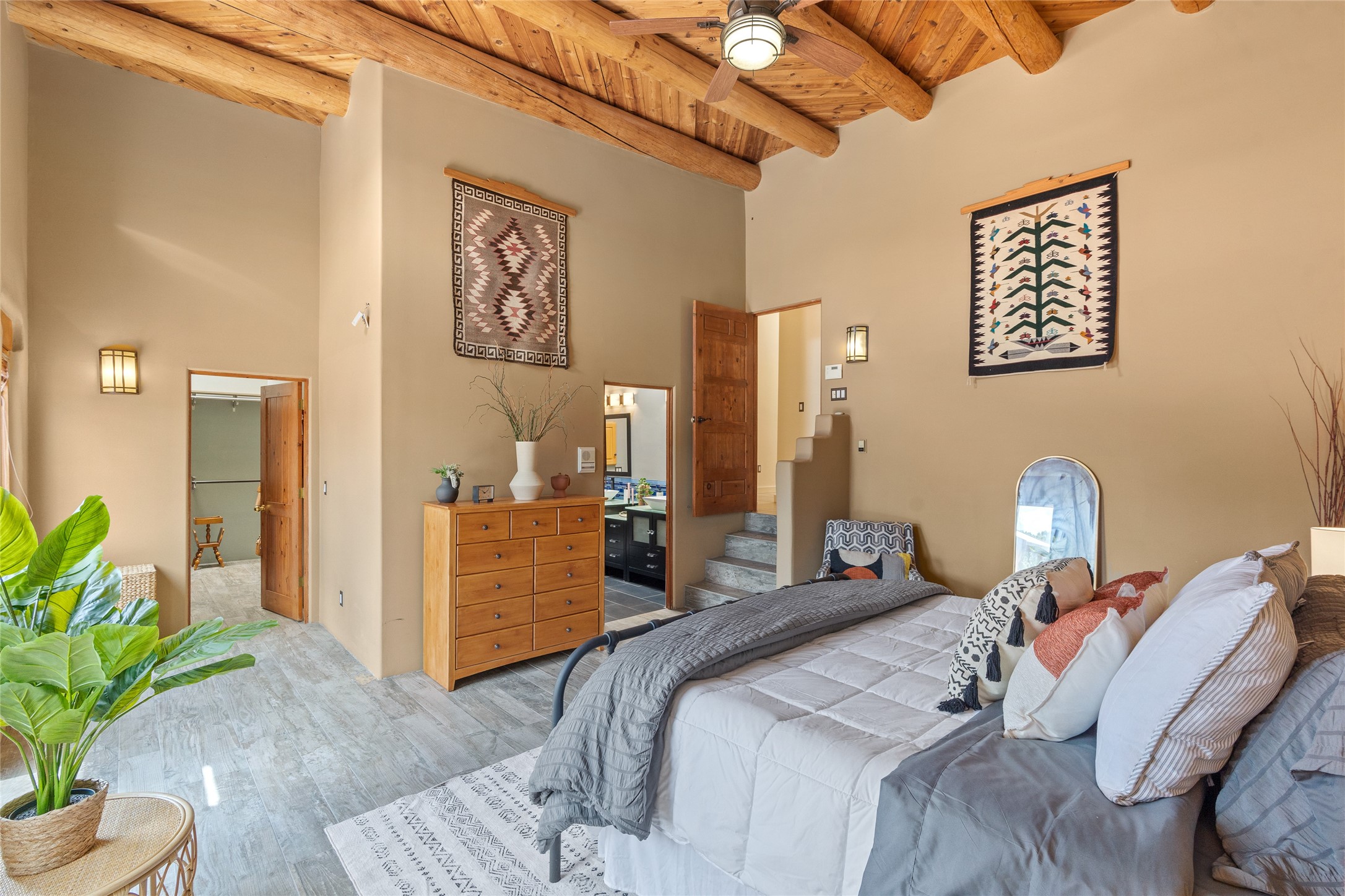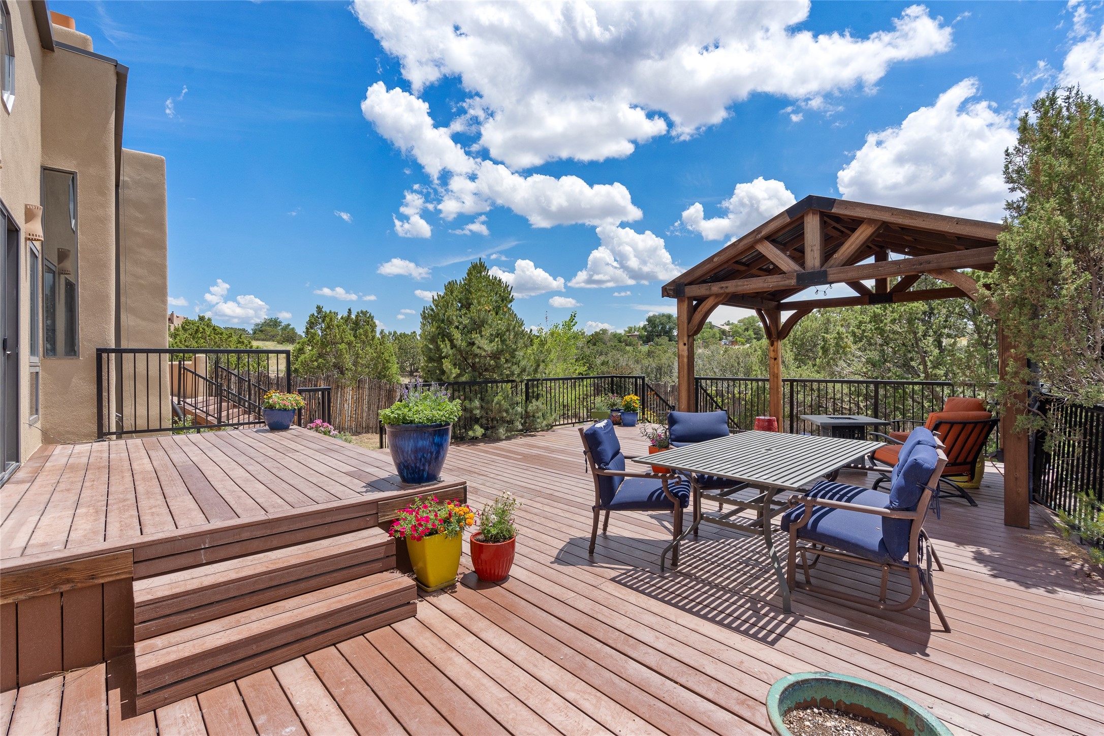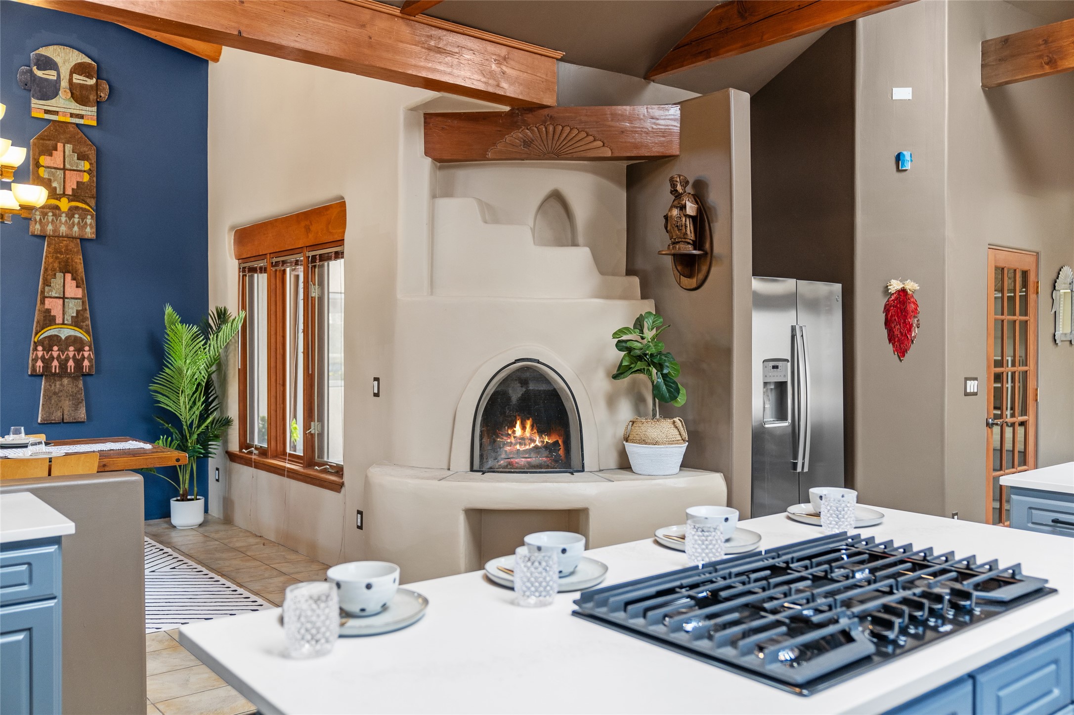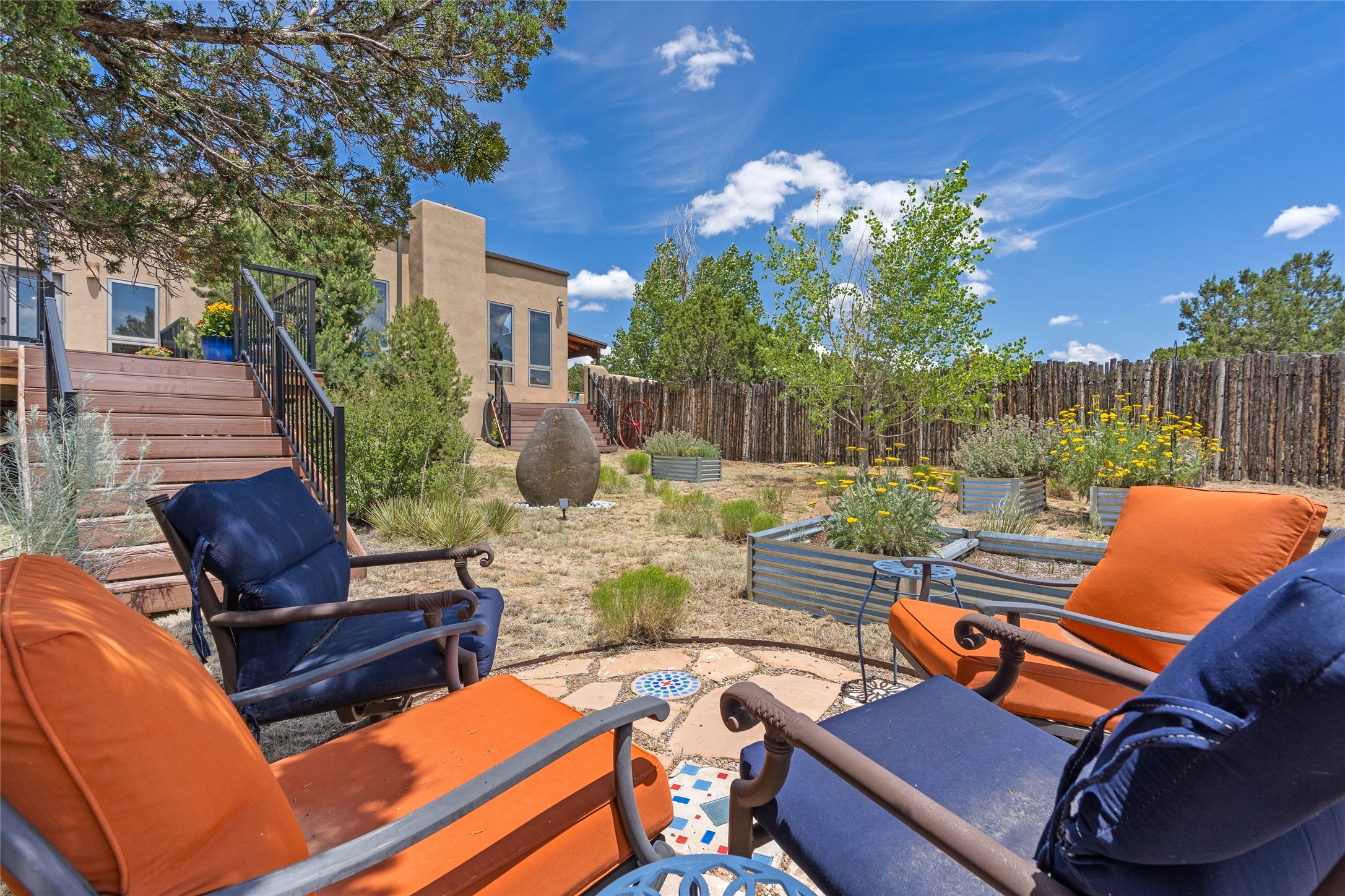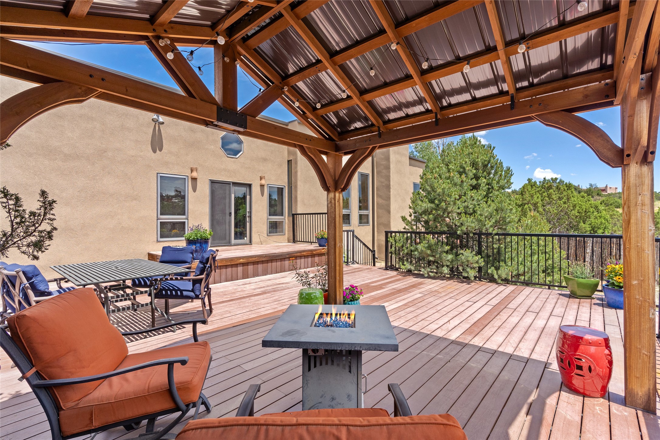 Just 10 minutes from downtown Santa Fe, this 3,255 sq. ft. 4-bedroom, 2.5-bath home on 2.5 acres offers the perfect blend of country living and city convenience. With a private well, a 3-car garage plus storage area, and rich Southwestern character, this one-of-a-kind property is a peaceful retreat with personality and presence. Step inside to soaring spaces and abundant natural light. The open-concept living, kitchen, and dining areas are unified yet distinct, each defined by vaulted ceilings and architectural detail. The main living room--anchored by a striking fireplace--features 14-foot viga ceilings and generous windows that fill the space with natural light. The formal dining room, with its vaulted ceiling of vigas and latillas, is illuminated by dramatic clerestory windows. A raised kiva fireplace creates a warm connection between the dining room and kitchen. The kitchen is both vibrant and functional, featuring a vaulted, beamed ceiling, extensive countertops, a central cooking island with bar seating, and a colorful half-circle stained glass window that echoes the kitchen's playful palette. A connected breakfast nook offers the perfect spot for casual dining. The spacious primary suite is a private sanctuary with soaring ceilings, a floor-to-ceiling kiva fireplace, and a 650 sq. ft. private deck with a cozy gazebo for relaxing outdoors. The ensuite bath features high ceilings, vivid blue tile, and a dramatic walk-in shower that feels like a personal spa. The guest wing offers three additional bedrooms--one currently serving as a game room with a pool table--and a beautifully updated full bathroom.With privacy, style, and unmistakable Southwestern charm, this exceptional property is a rare opportunity just minutes from the heart of Santa Fe.