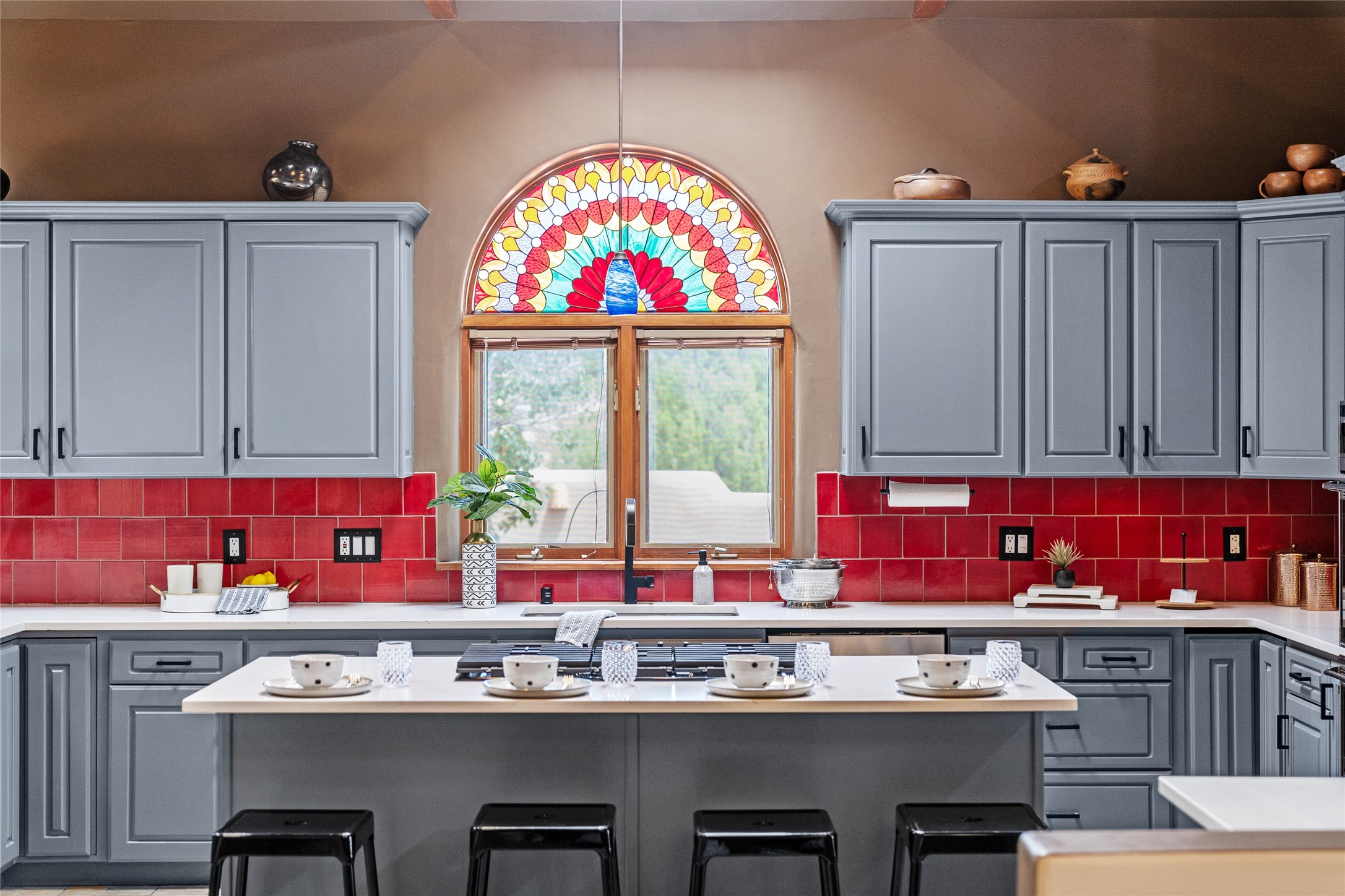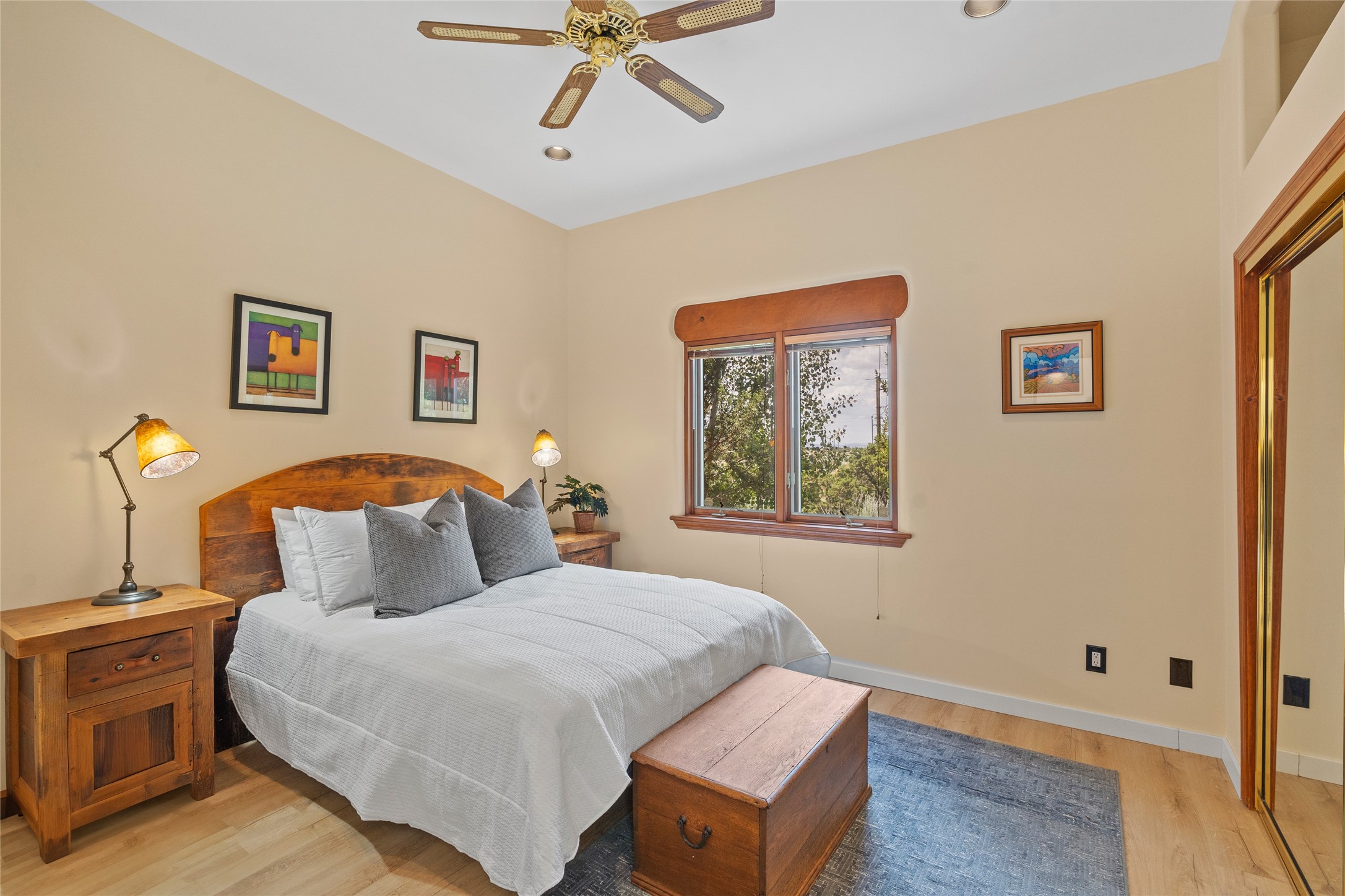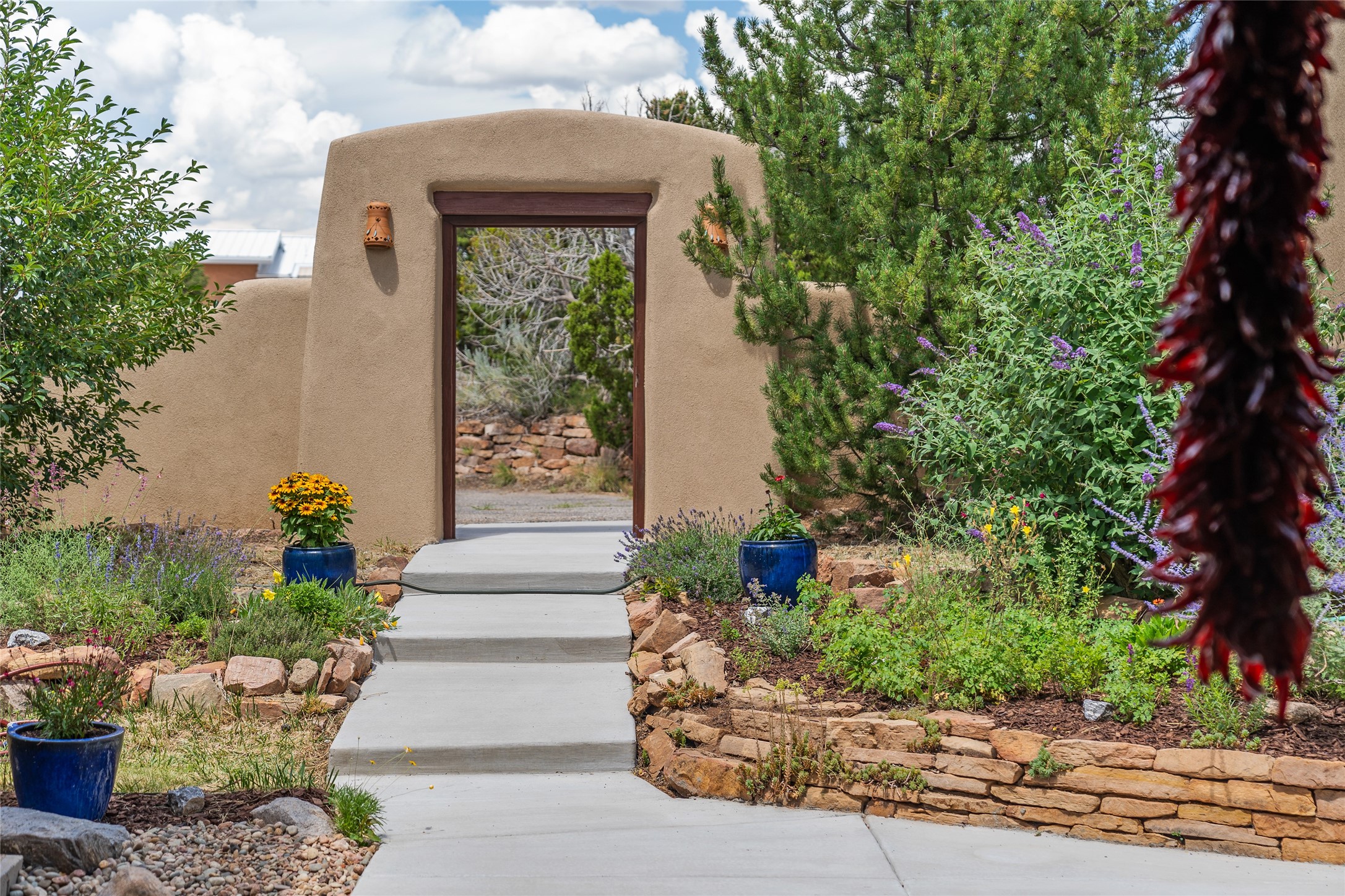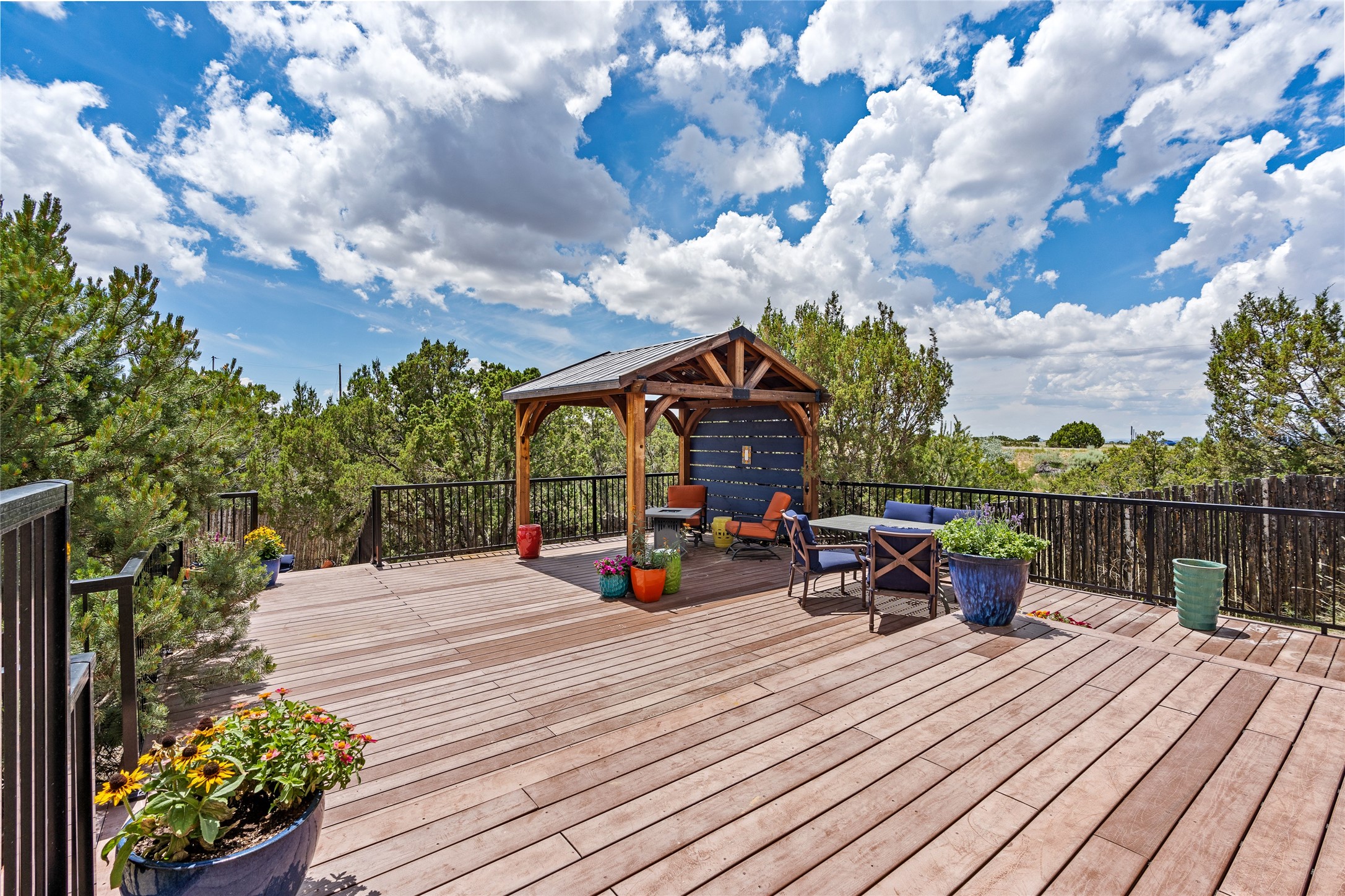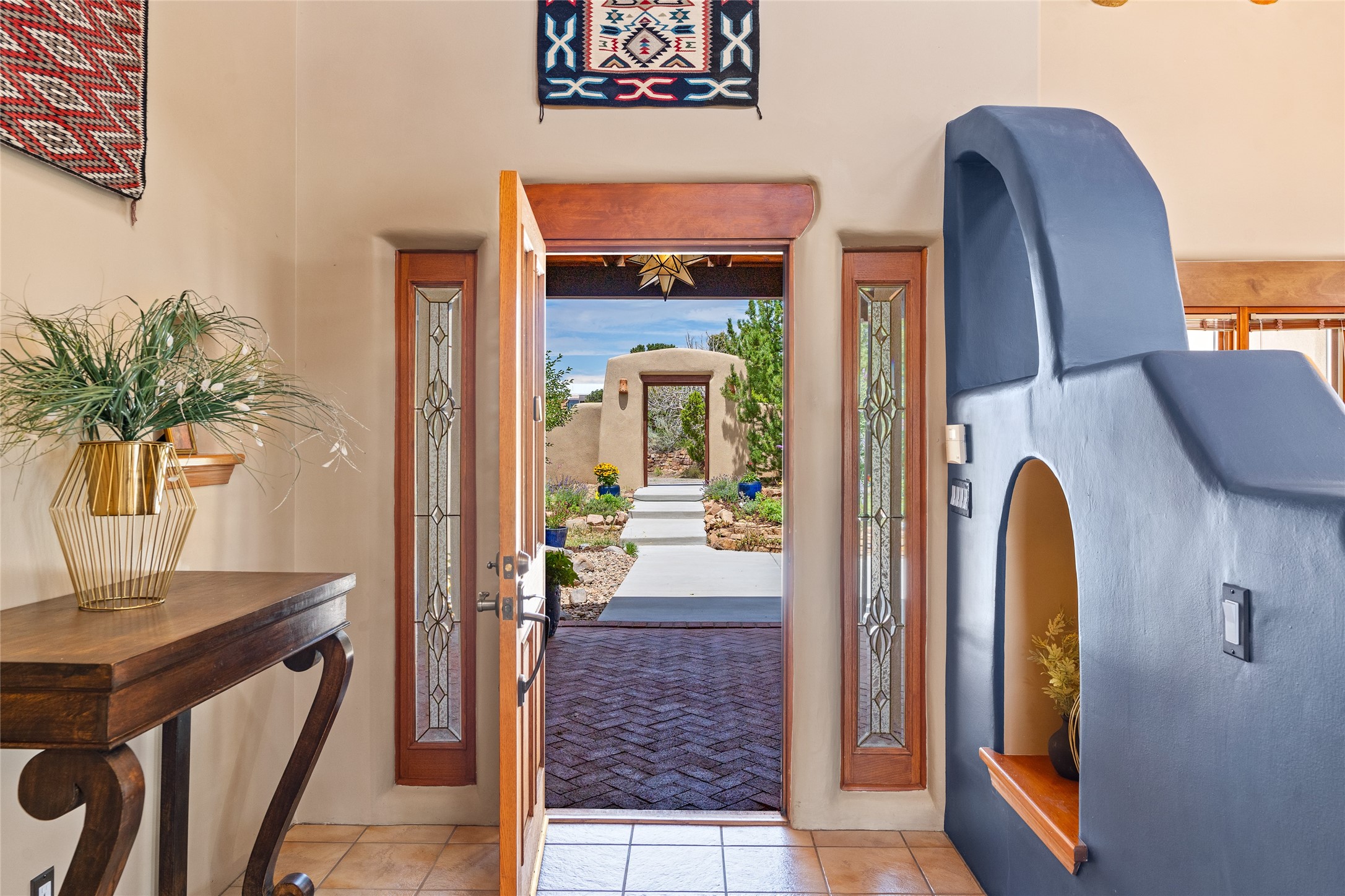 Just 10 minutes from downtown Santa Fe, this 3,255 sq. ft. 4-bedroom, 2.5-bath home on 2.5 acres offers the perfect blend of country living and city convenience. With a private well, a 3-car garage plus storage area, and rich Southwestern character, this one-of-a-kind property is a peaceful retreat with personality and presence. Step inside to soaring spaces and abundant natural light. The open-concept living, kitchen, and dining areas are unified yet distinct, each defined by vaulted ceilings and architectural detail. The main living room--anchored by a striking fireplace--features 14-foot viga ceilings and generous windows that fill the space with natural light. The formal dining room, with its vaulted ceiling of vigas and latillas, is illuminated by dramatic clerestory windows. A raised kiva fireplace creates a warm connection between the dining room and kitchen. The kitchen is both vibrant and functional, featuring a vaulted, beamed ceiling, extensive countertops, a central cooking island with bar seating, and a colorful half-circle stained glass window that echoes the kitchen's playful palette. A connected breakfast nook offers the perfect spot for casual dining. The spacious primary suite is a private sanctuary with soaring ceilings, a floor-to-ceiling kiva fireplace, and a 650 sq. ft. private deck with a cozy gazebo for relaxing outdoors. The ensuite bath features high ceilings, vivid blue tile, and a dramatic walk-in shower that feels like a personal spa. The guest wing offers three additional bedrooms--one currently serving as a game room with a pool table--and a beautifully updated full bathroom.With privacy, style, and unmistakable Southwestern charm, this exceptional property is a rare opportunity just minutes from the heart of Santa Fe.