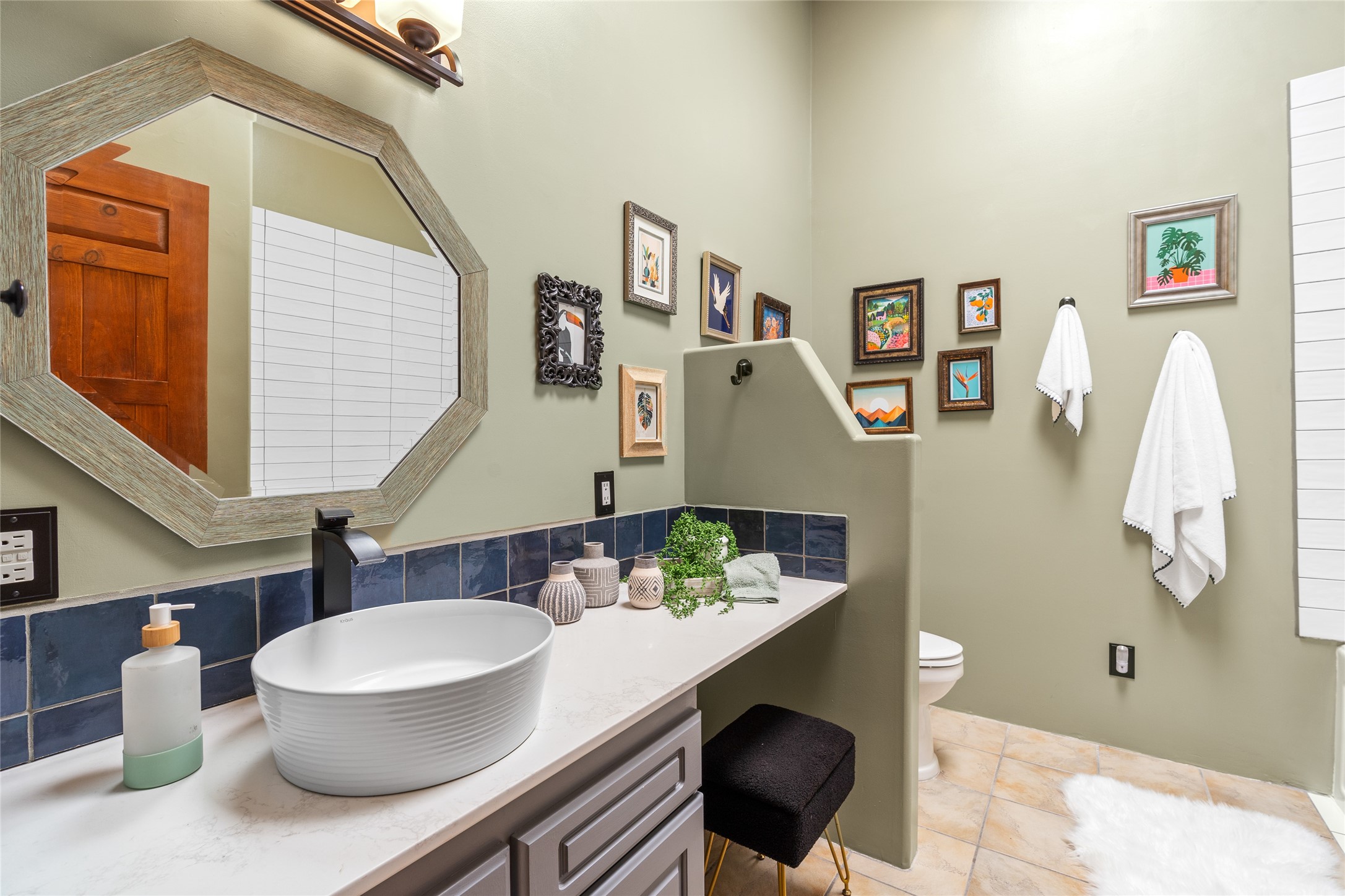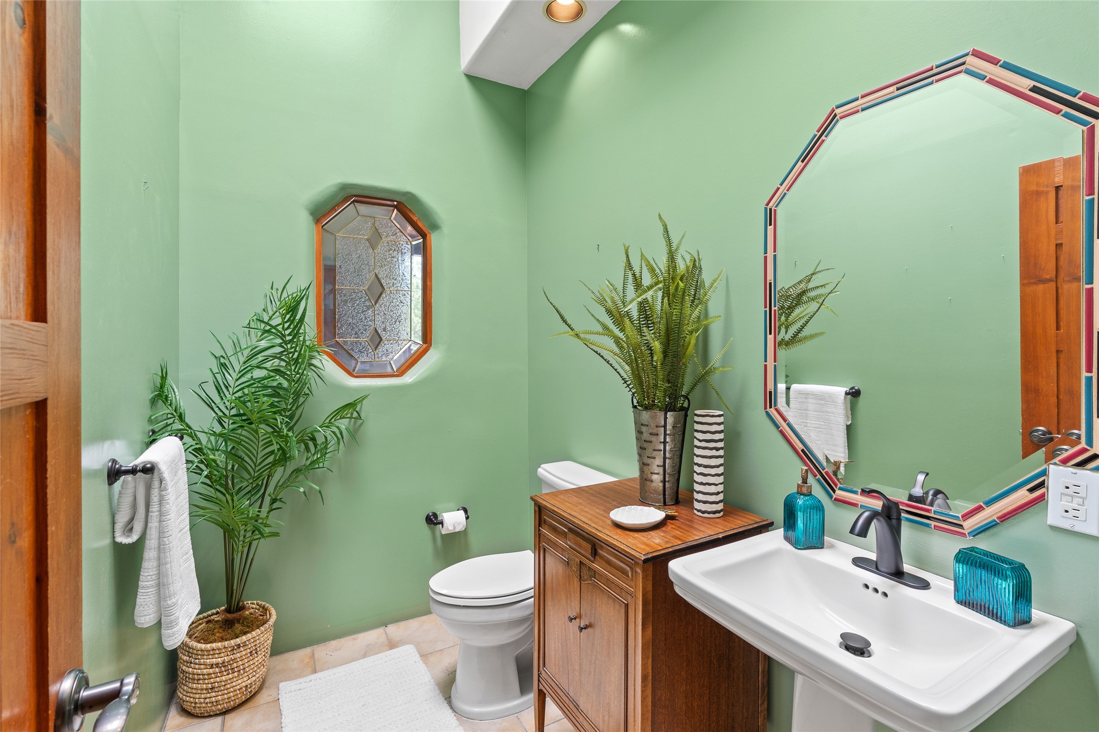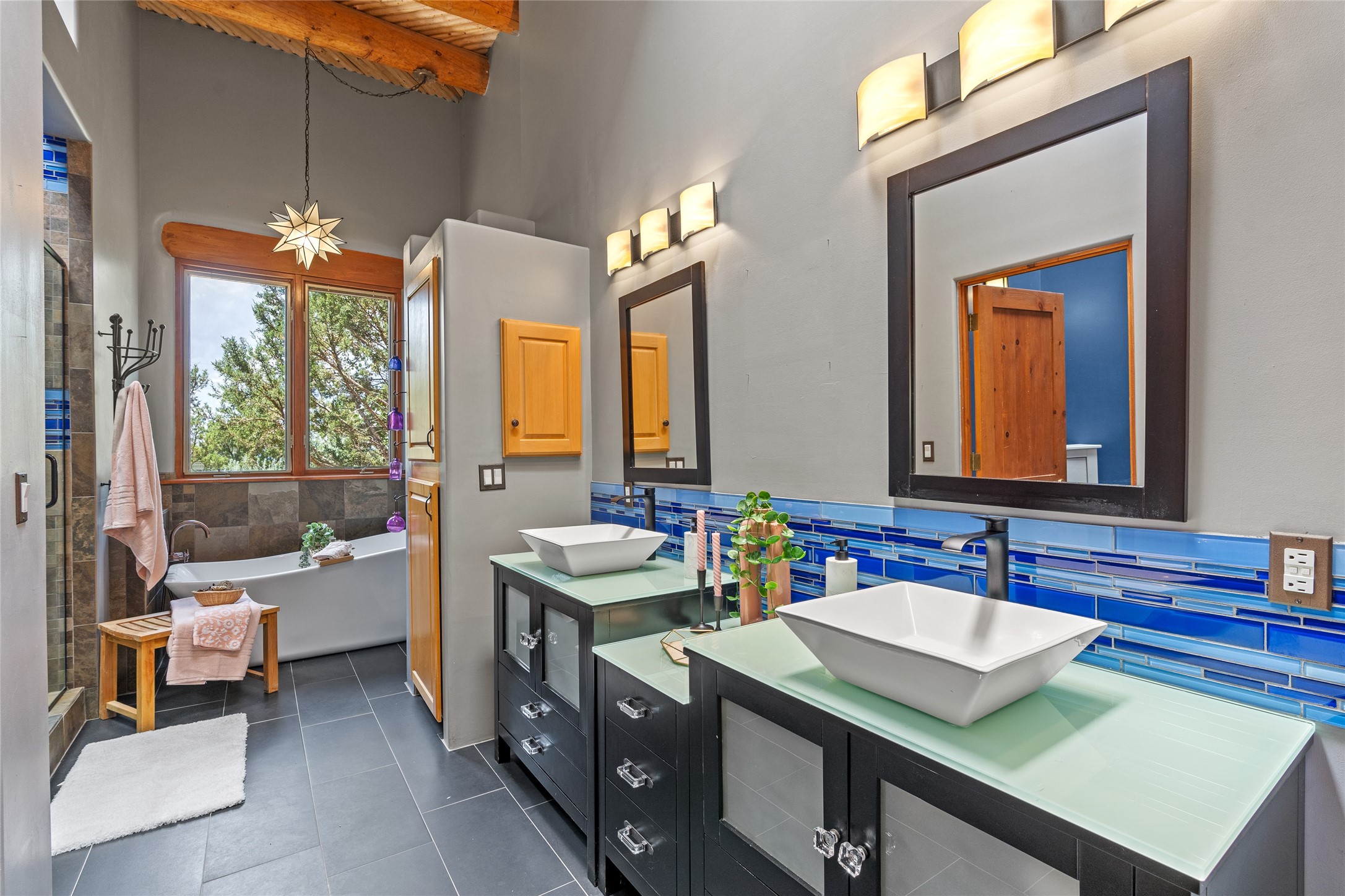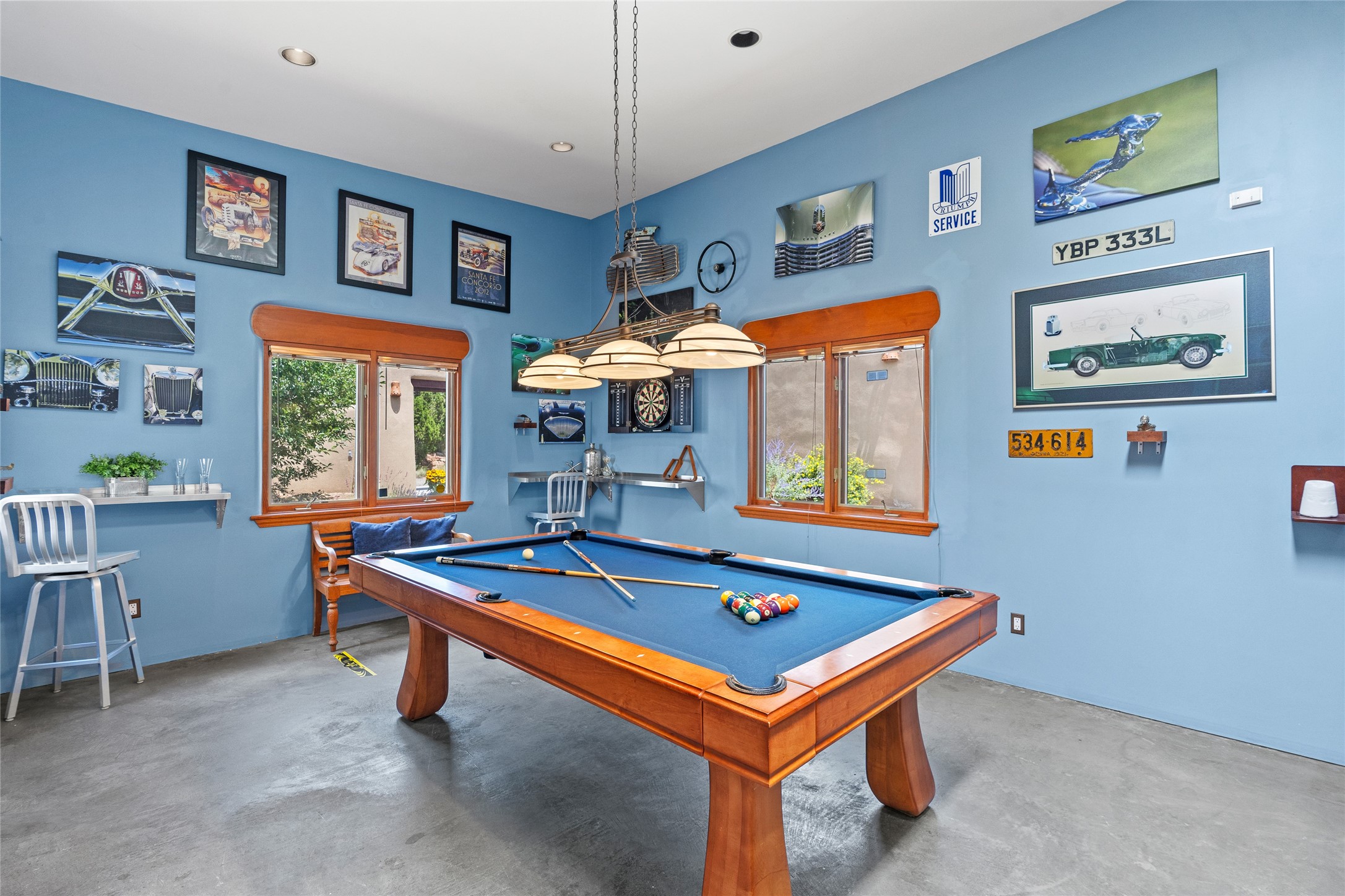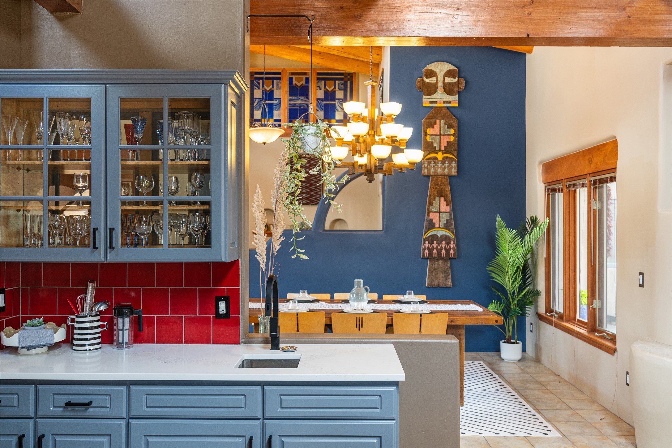 Just 10 minutes from downtown Santa Fe, this 3,255 sq. ft. 4-bedroom, 2.5-bath home on 2.5 acres offers the perfect blend of country living and city convenience. With a private well, a 3-car garage plus storage area, and rich Southwestern character, this one-of-a-kind property is a peaceful retreat with personality and presence. Step inside to soaring spaces and abundant natural light. The open-concept living, kitchen, and dining areas are unified yet distinct, each defined by vaulted ceilings and architectural detail. The main living room--anchored by a striking fireplace--features 14-foot viga ceilings and generous windows that fill the space with natural light. The formal dining room, with its vaulted ceiling of vigas and latillas, is illuminated by dramatic clerestory windows. A raised kiva fireplace creates a warm connection between the dining room and kitchen. The kitchen is both vibrant and functional, featuring a vaulted, beamed ceiling, extensive countertops, a central cooking island with bar seating, and a colorful half-circle stained glass window that echoes the kitchen's playful palette. A connected breakfast nook offers the perfect spot for casual dining. The spacious primary suite is a private sanctuary with soaring ceilings, a floor-to-ceiling kiva fireplace, and a 650 sq. ft. private deck with a cozy gazebo for relaxing outdoors. The ensuite bath features high ceilings, vivid blue tile, and a dramatic walk-in shower that feels like a personal spa. The guest wing offers three additional bedrooms--one currently serving as a game room with a pool table--and a beautifully updated full bathroom.With privacy, style, and unmistakable Southwestern charm, this exceptional property is a rare opportunity just minutes from the heart of Santa Fe.