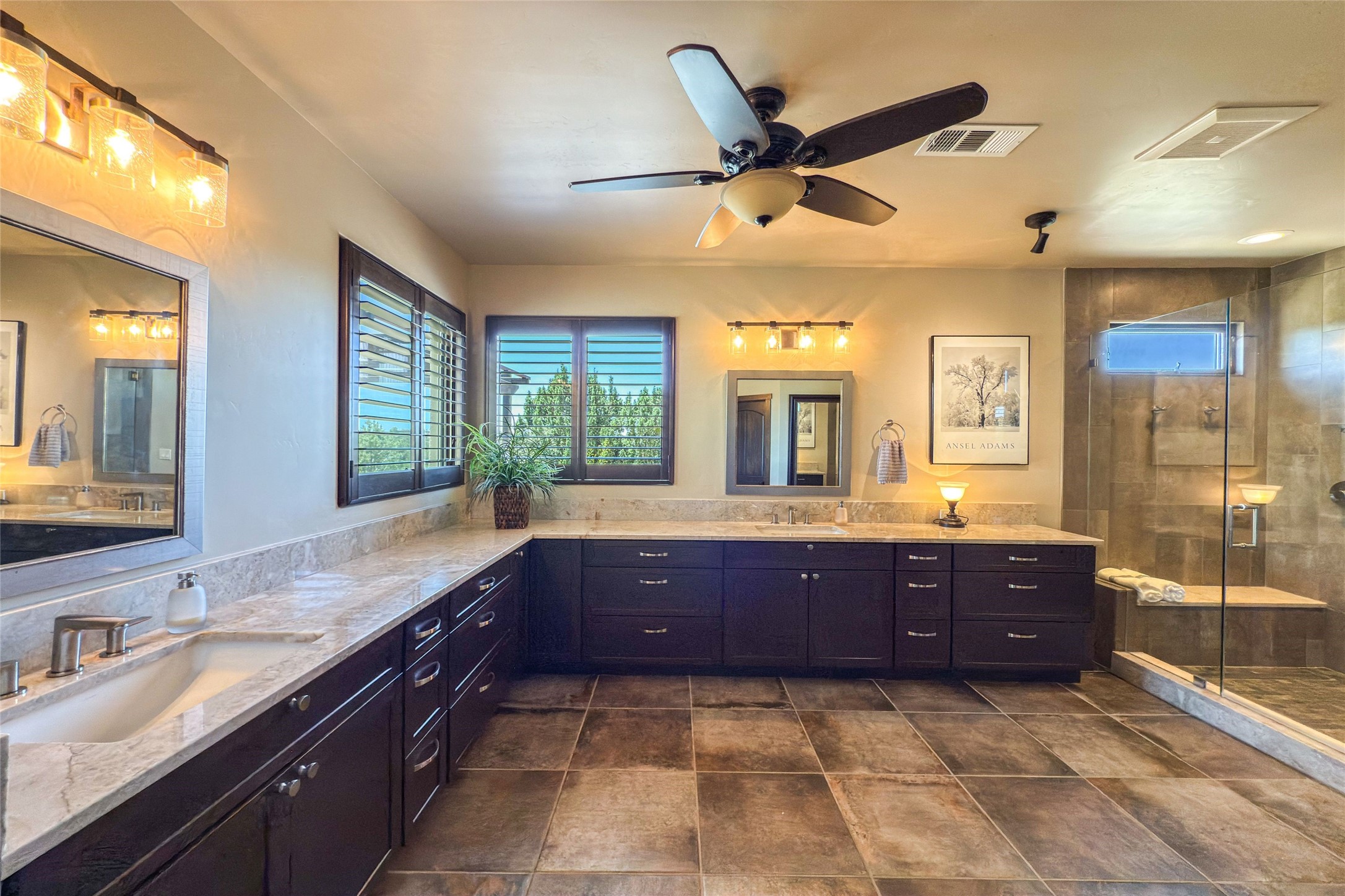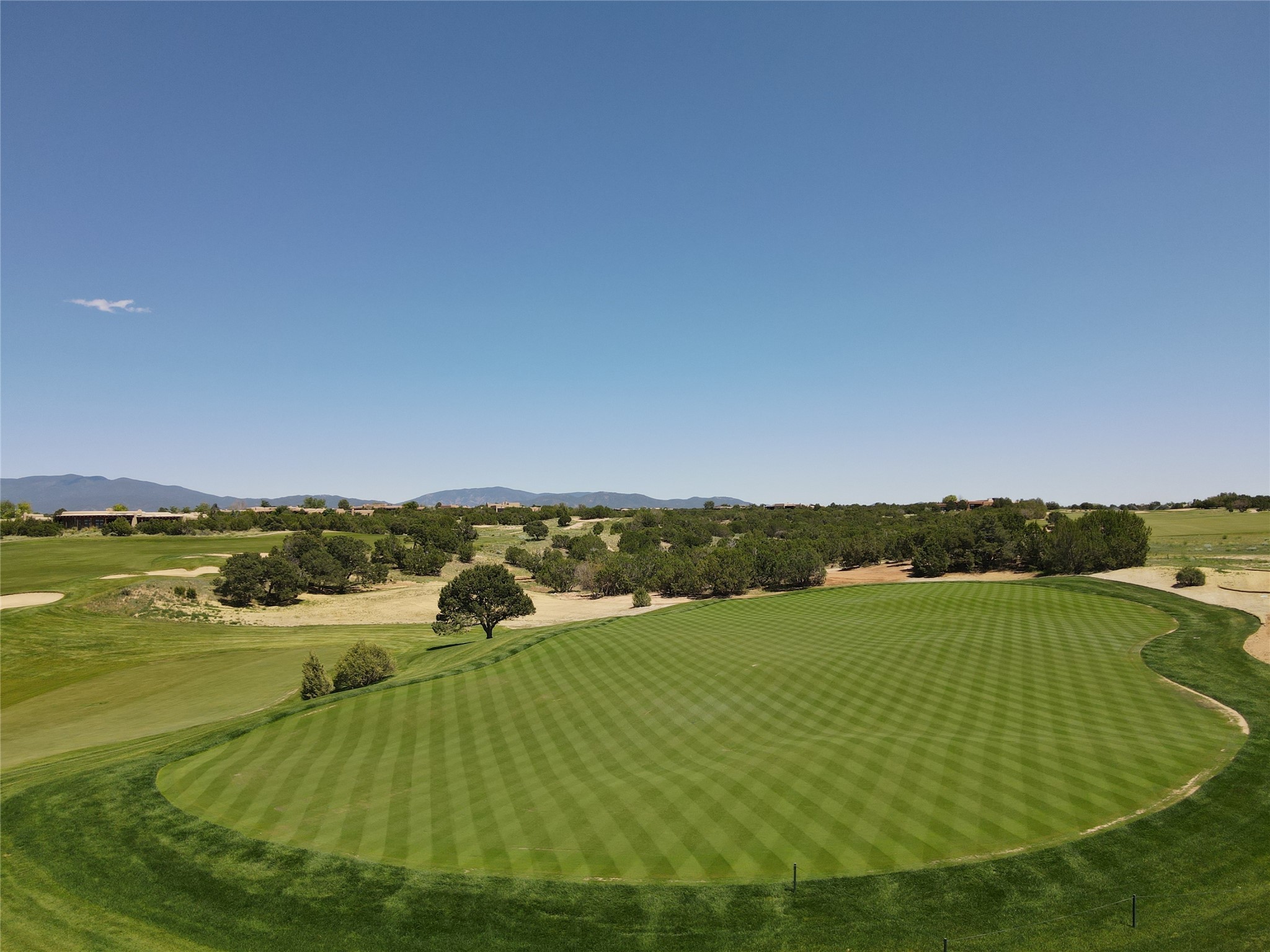 Peaceful elegance with sunset views. Welcome to a serene, custom-crafted sanctuary where timeless design meets contemporary comfort. Nestled in a quiet setting, this exceptional property offers stunning Sangre and Jemez mountain views, just minutes from the exclusive amenities of Las Campanas, including the Ranch Estates equestrian facilities. Every detail of this thoughtfully designed home reflects architectural elegance and ease of living. Distinctive arches, stained ceiling beams, and porcelain tile flooring create an inviting aesthetic. The curved hallways eliminate visible doorways in main areas, encouraging seamless, tranquil flow. The living room features an Anasazi stacked stone fireplace, expansive bay windows, and programmable remote-controlled shades. The chef's kitchen offers a large waterfall island, JennAir appliances, Fulgor range, custom cabinetry, and Anasazi stone backsplash--ideal for both daily use and stylish entertaining. A State-of-the-art sound studio capable of professional music production features hardwood flooring and was built using a sophisticated, advanced sound proofing wall spring system which effectively blocks noise and vibration transfer. The studio has a dedicated 20-amp panel, and mini split for comfort. This space would make an excellent media room for anyone! The spacious primary suite includes a gas kiva fireplace, large picture windows with Sangre views, portal access, and a spa-like bath with Caesarstone finishes, corner windows, and oversized shower. Two additional ensuite bedrooms--one with bay windows and one flex/guest space--offer comfort and versatility. Outdoor living includes a built-in grill, granite counters, water feature, and flagstone paths winding through native landscaping and a 4-cistern-fed irrigation system. Additional highlights include custom wood shutters on all windows, skylights throughout, stained doors/baseboards, new paint, and new tankless water heater. A rare blend of elegance, privacy, and ease.