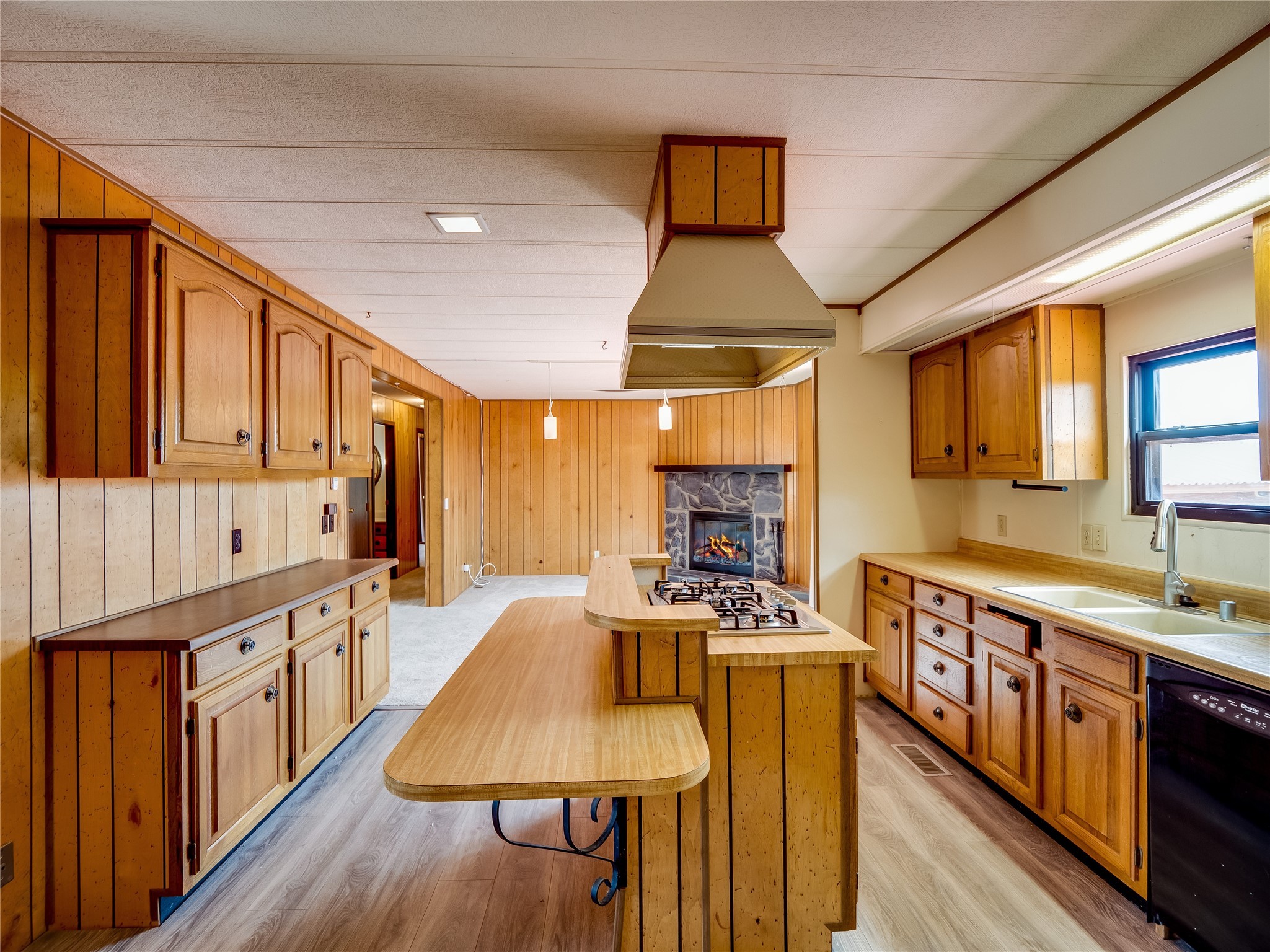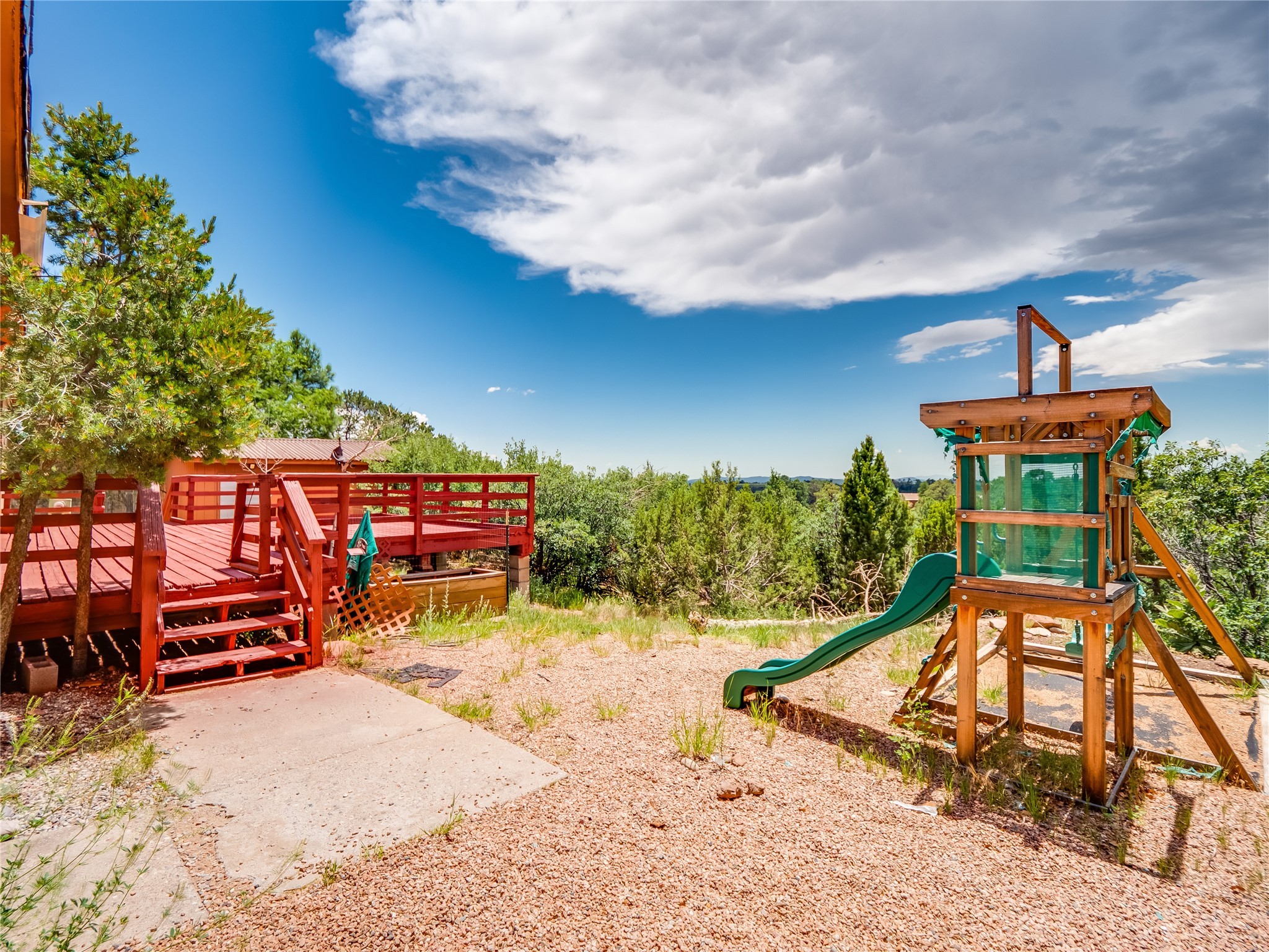 Charming Single-Story Home on the Canyon with Mountain Views in Tsikumu Village! This home offers incredible mountain views and a peaceful setting just moments from schools, trails, and stables. With a low-maintenance front yard shaded by mature trees and shrubs, this property offers curb appeal without the work. A step-up porch welcomes you into the home, where you'll find a spacious living and dining room featuring warm wood-paneled walls and newly installed lush carpet that runs throughout the interior. Adjacent to the main living area is a cozy family room with a stunning stone wood-burning fireplace, perfect for chilly nights, and sliding glass doors that lead to the expansive backyard deck. The nearby kitchen offers both charm and function with laminate wood flooring, wood cabinets with black hardware, generous counter space, and a center island with bar seating and a gas cooktop with overhead hood--ideal for both casual meals and entertaining. Off the kitchen is a laundry room complete with a utility sink, storage closets, and direct access to the back deck for convenience. The large primary en-suite bedroom features a wall of closets with elegant glass sliding doors and plenty of natural light. The attached bathroom includes a double sink vanity, a dedicated makeup vanity, a walk-in shower, and a deep soaking tub--a perfect retreat for relaxation. Down the hallway are two nice-sized guest bedrooms and a full guest bathroom with a single sink vanity and a shower/tub combo with glass door enclosures. Enjoy modern comfort with central A/C for those warm summer days. Step outside to the oversized deck that offers panoramic mountain and canyon views--an entertainer's dream and a stargazer's paradise. The backyard also includes a large storage shed for your tools and gear, and just down the street is a community playground. If you're looking for a unique home with gorgeous views, peaceful surroundings, and easy access to outdoor adventures, this gem is a must-see!