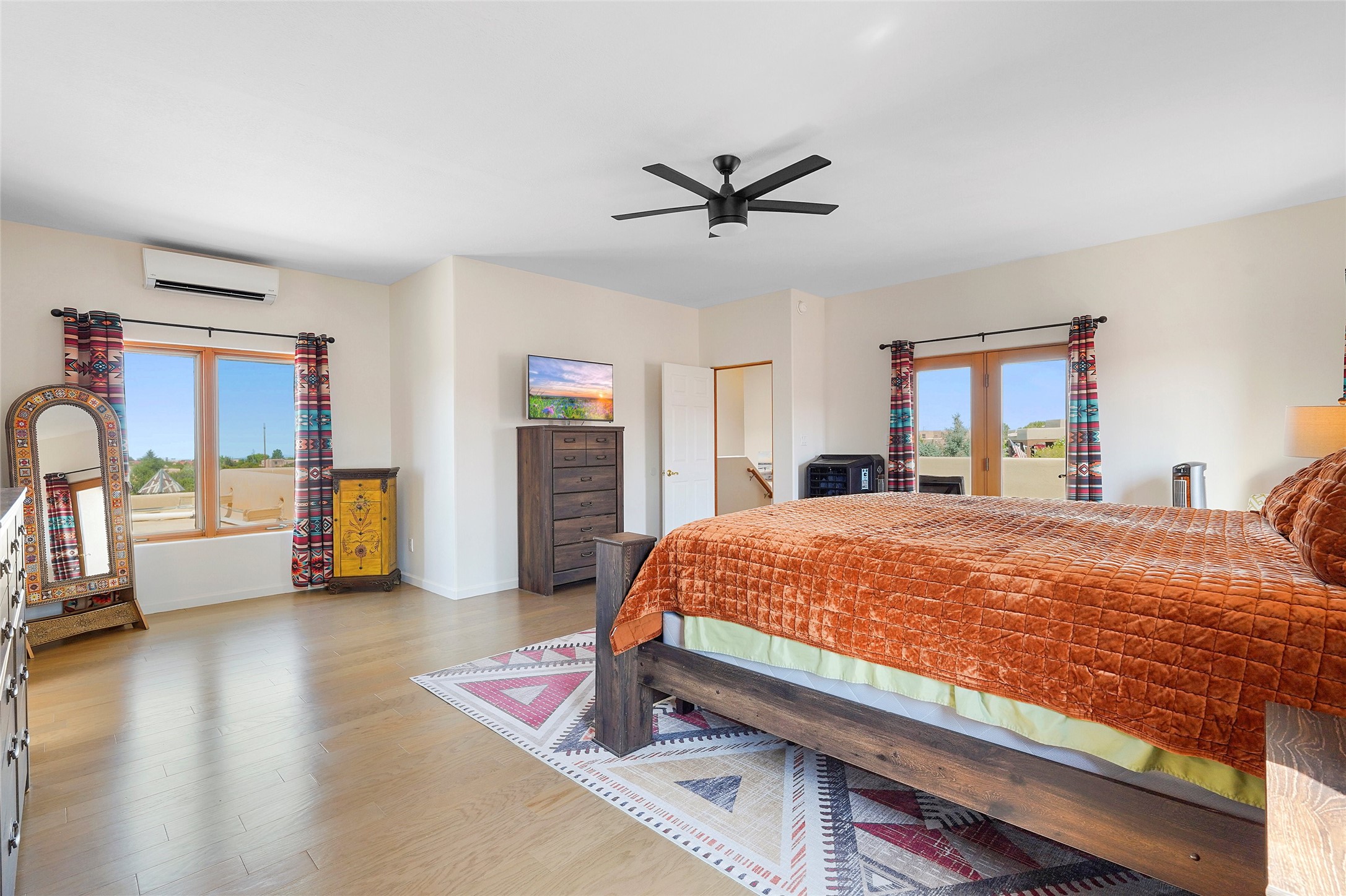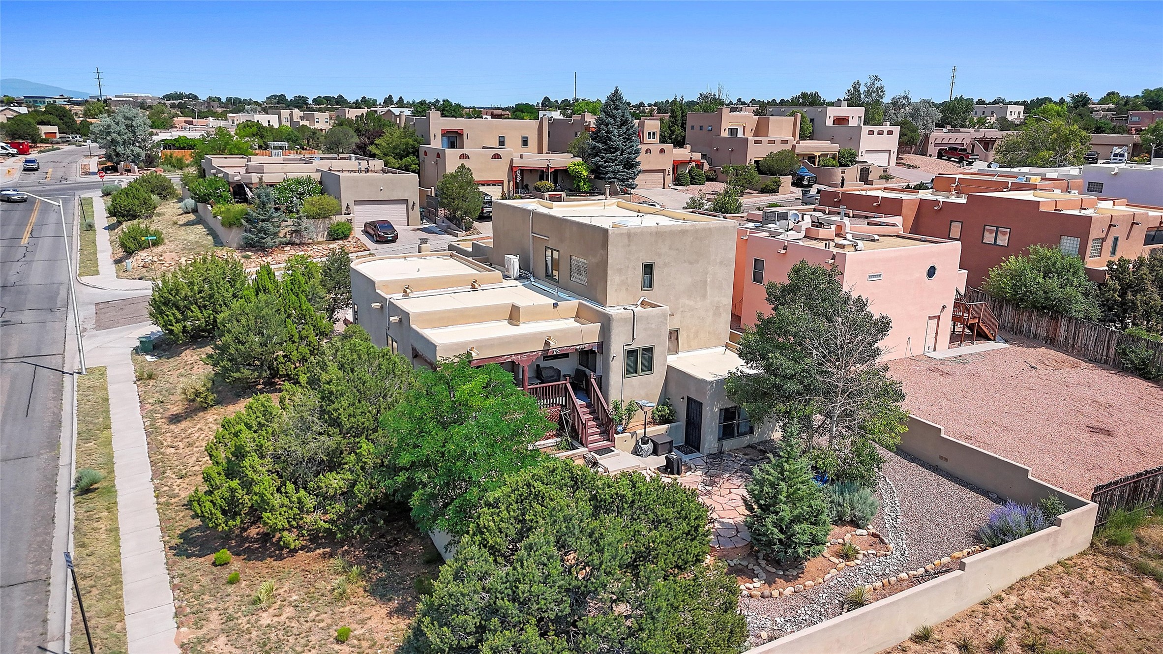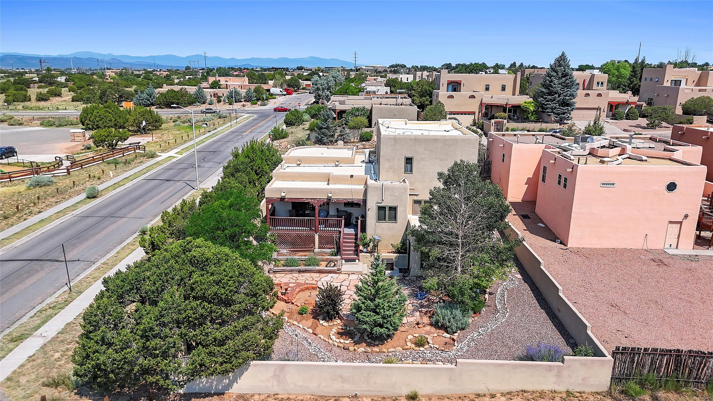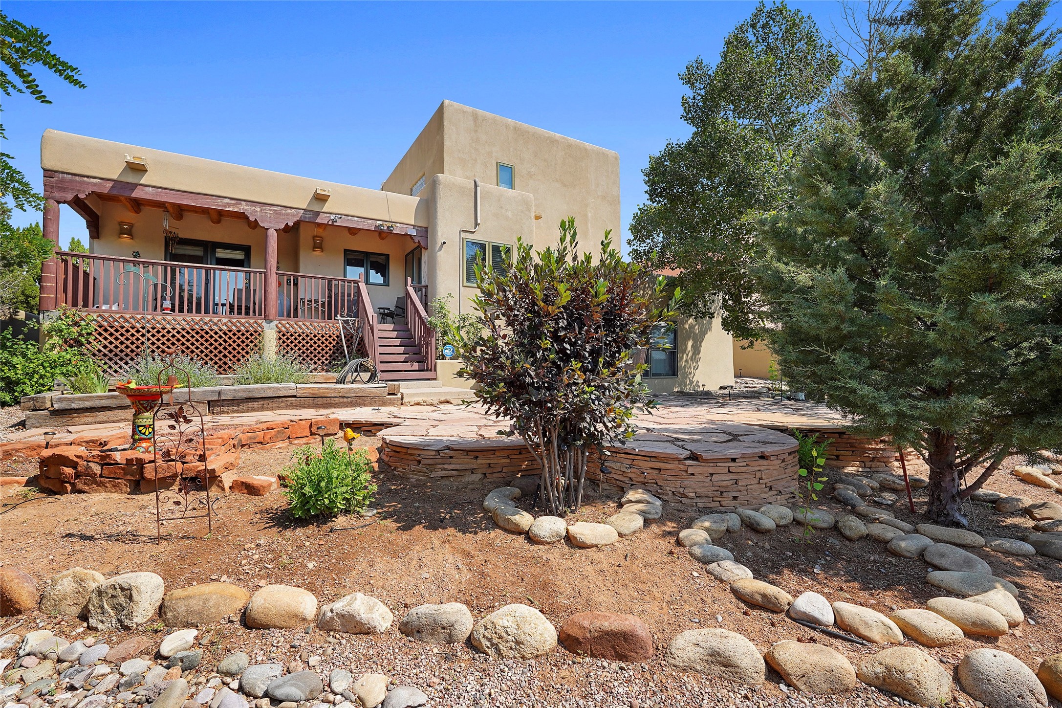 Welcome to this beautifully maintained home in the sought-after Pueblos de Sol subdivision, offering comfortable living and sweeping views. Recent upgrades include a modern kitchen with stainless steel appliances, granite countertops, and a spa-like primary bathroom with a standalone tub and custom stone tile. The primary suite also features a private deck with durable Trex decking. A TPO roof was installed in 2022. Enjoy year-round comfort with 5 mini-splits and radiant heating. Outdoor living shines with multiple decks, a charming courtyard, mature trees, and drip irrigation. A separate-entry studio/guesthouse with full bath offers rental or creative flexibility. Don't miss this Santa Fe gem! Trails and parks nearby!