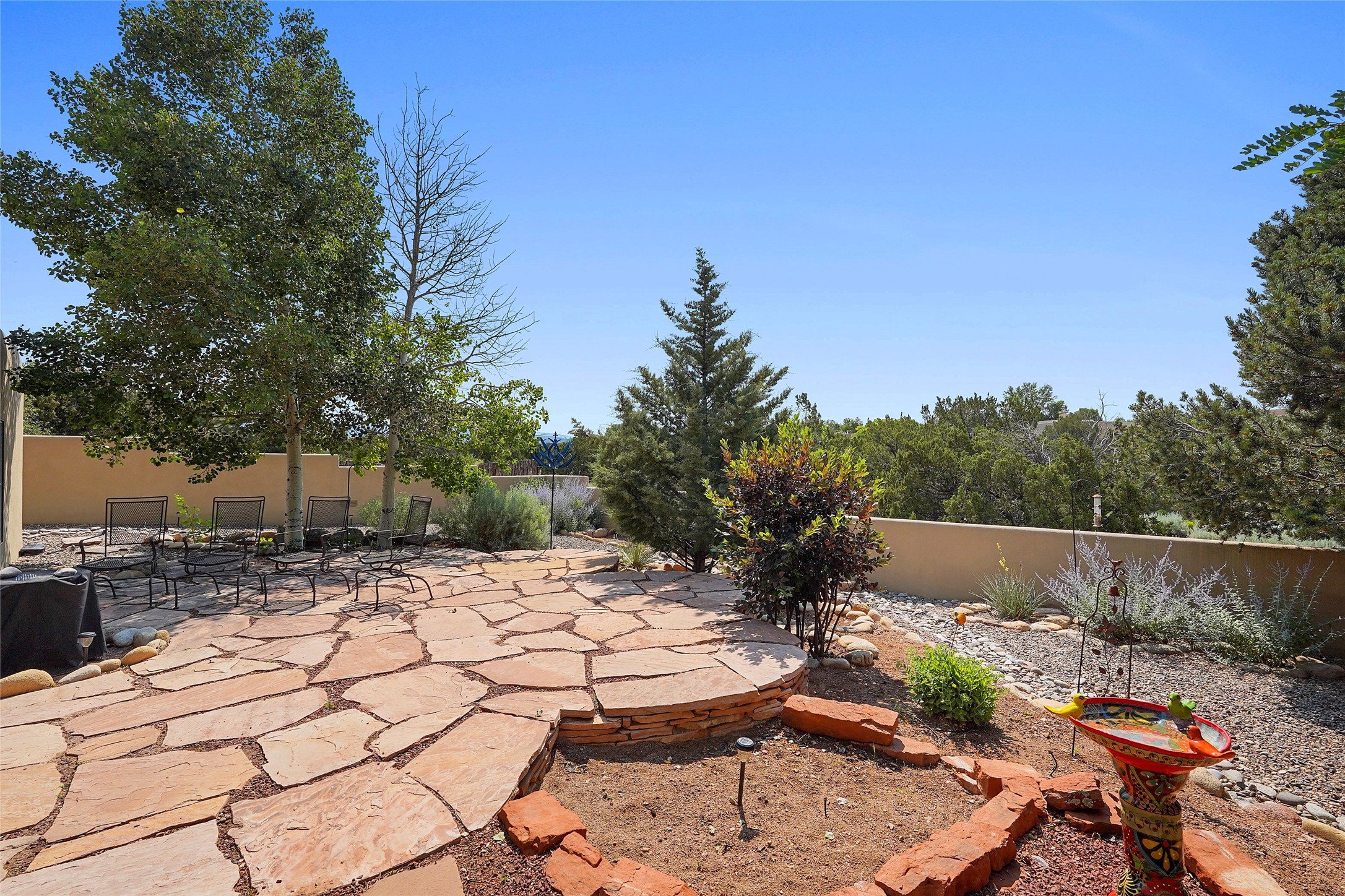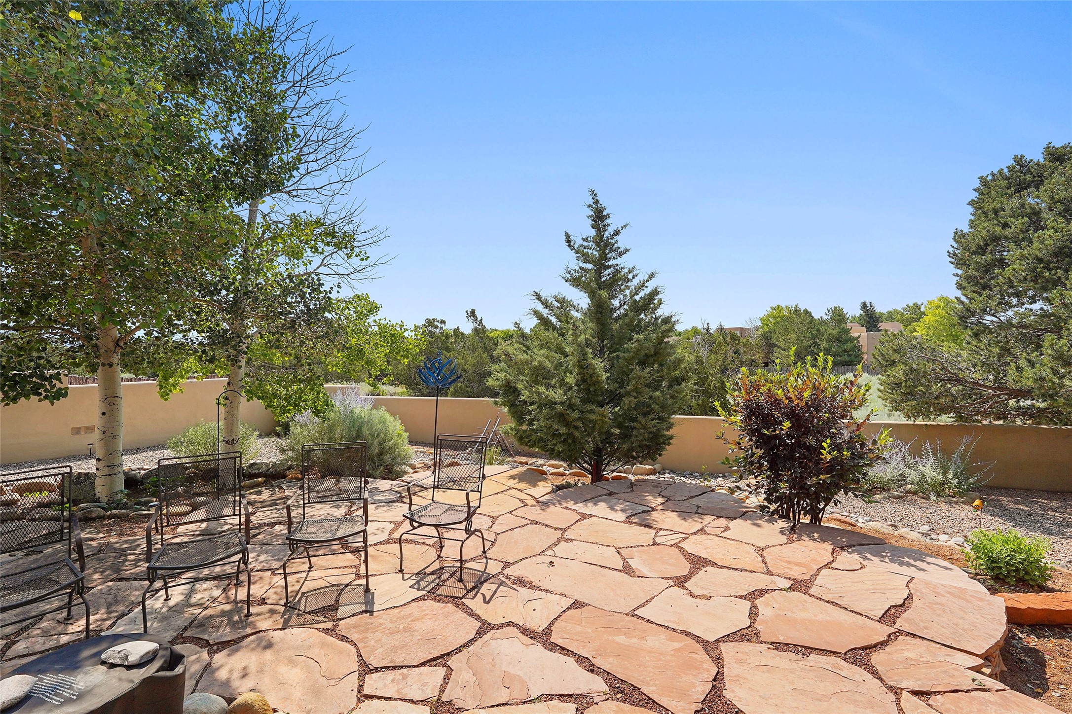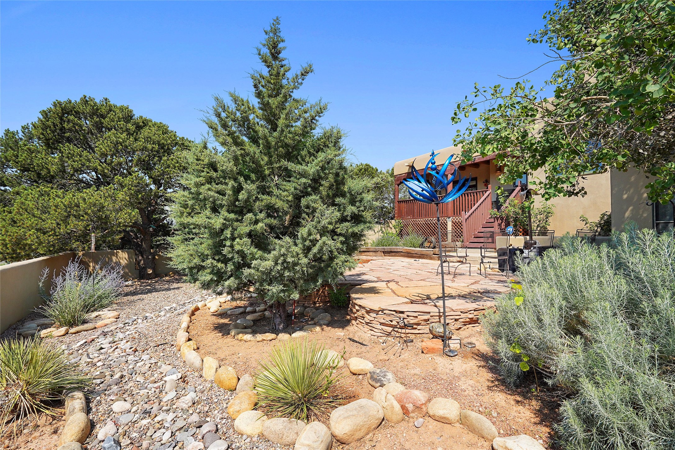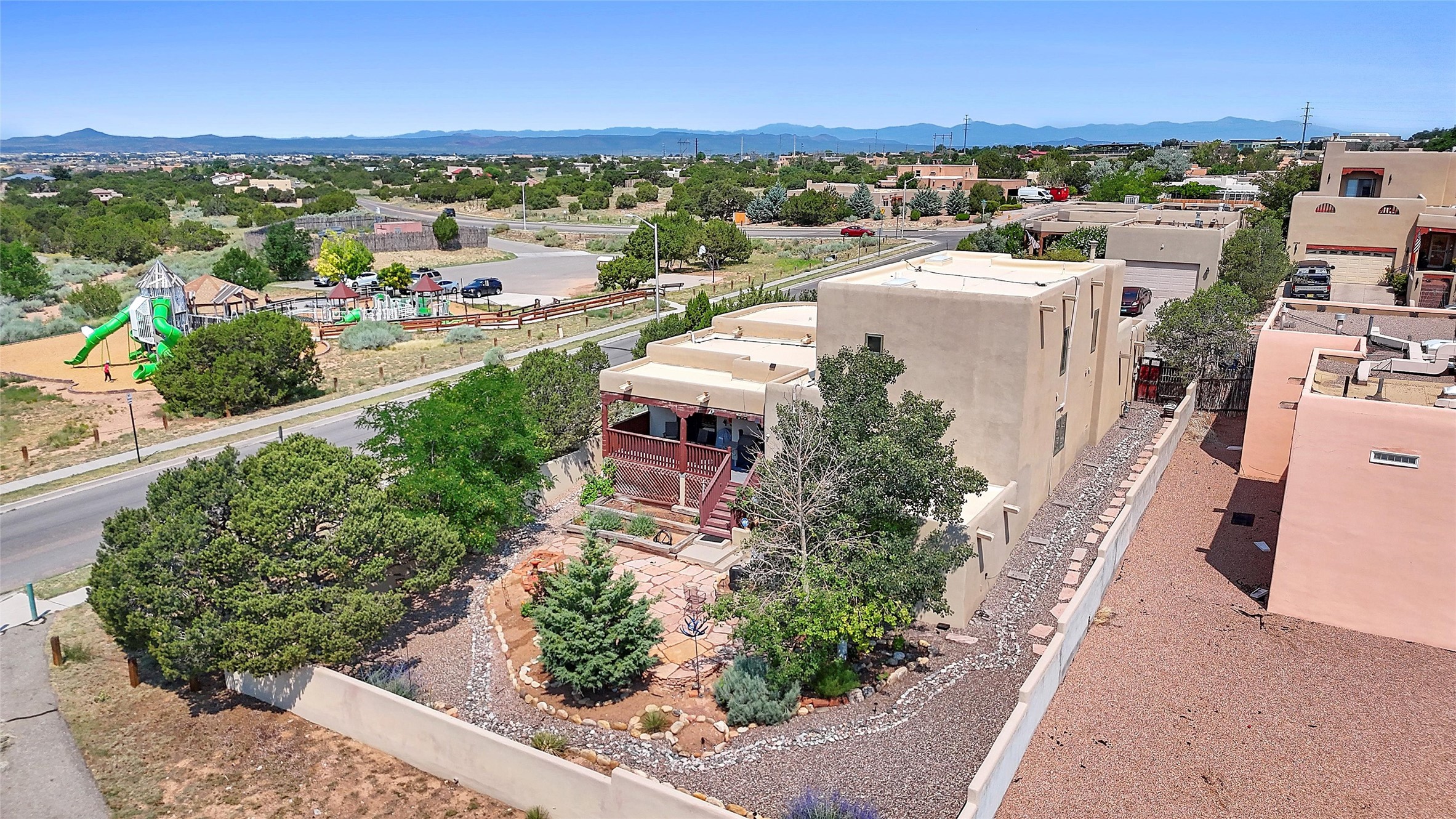 Welcome to this beautifully maintained home in the sought-after Pueblos de Sol subdivision, offering comfortable living and sweeping views. Recent upgrades include a modern kitchen with stainless steel appliances, granite countertops, and a spa-like primary bathroom with a standalone tub and custom stone tile. The primary suite also features a private deck with durable Trex decking. A TPO roof was installed in 2022. Enjoy year-round comfort with 5 mini-splits and radiant heating. Outdoor living shines with multiple decks, a charming courtyard, mature trees, and drip irrigation. A separate-entry studio/guesthouse with full bath offers rental or creative flexibility. Don't miss this Santa Fe gem! Trails and parks nearby!