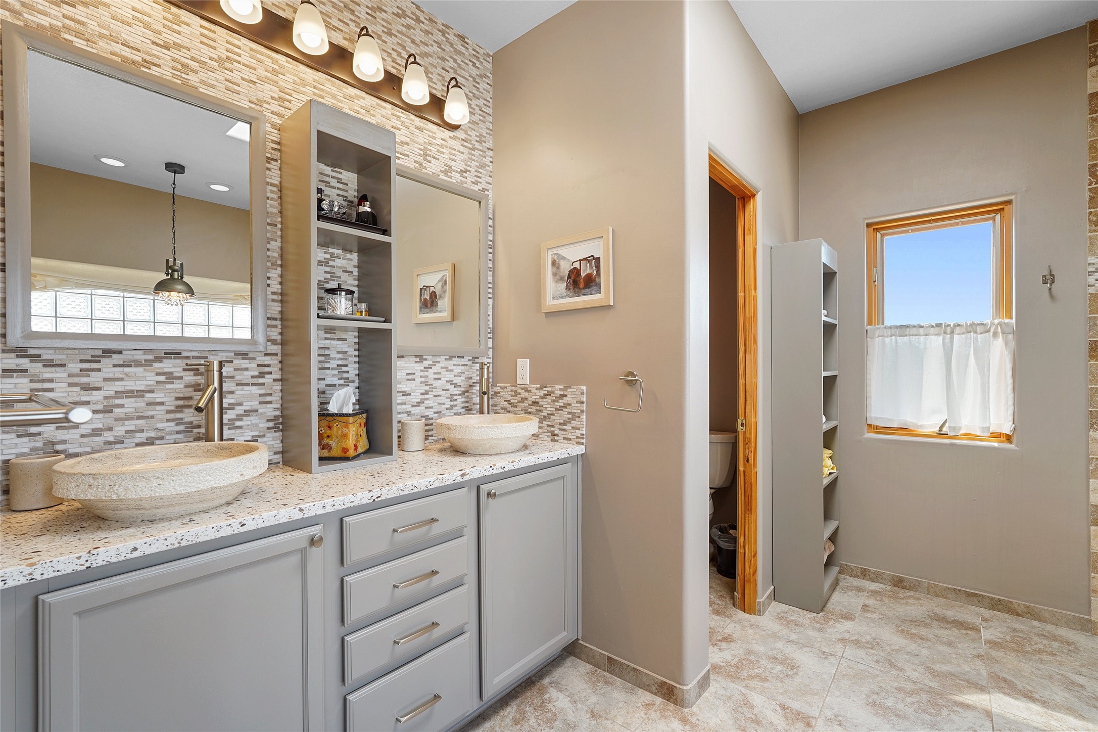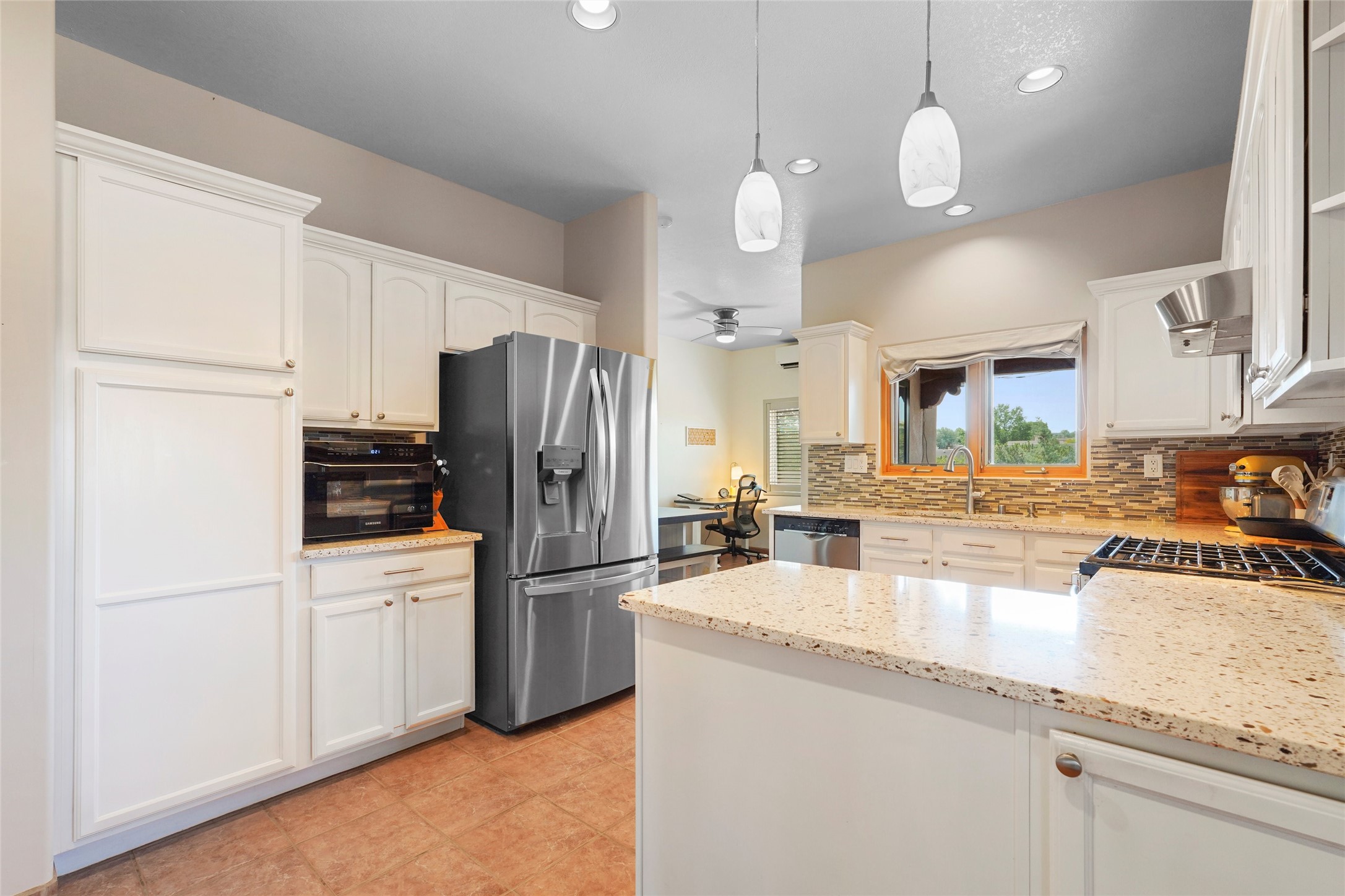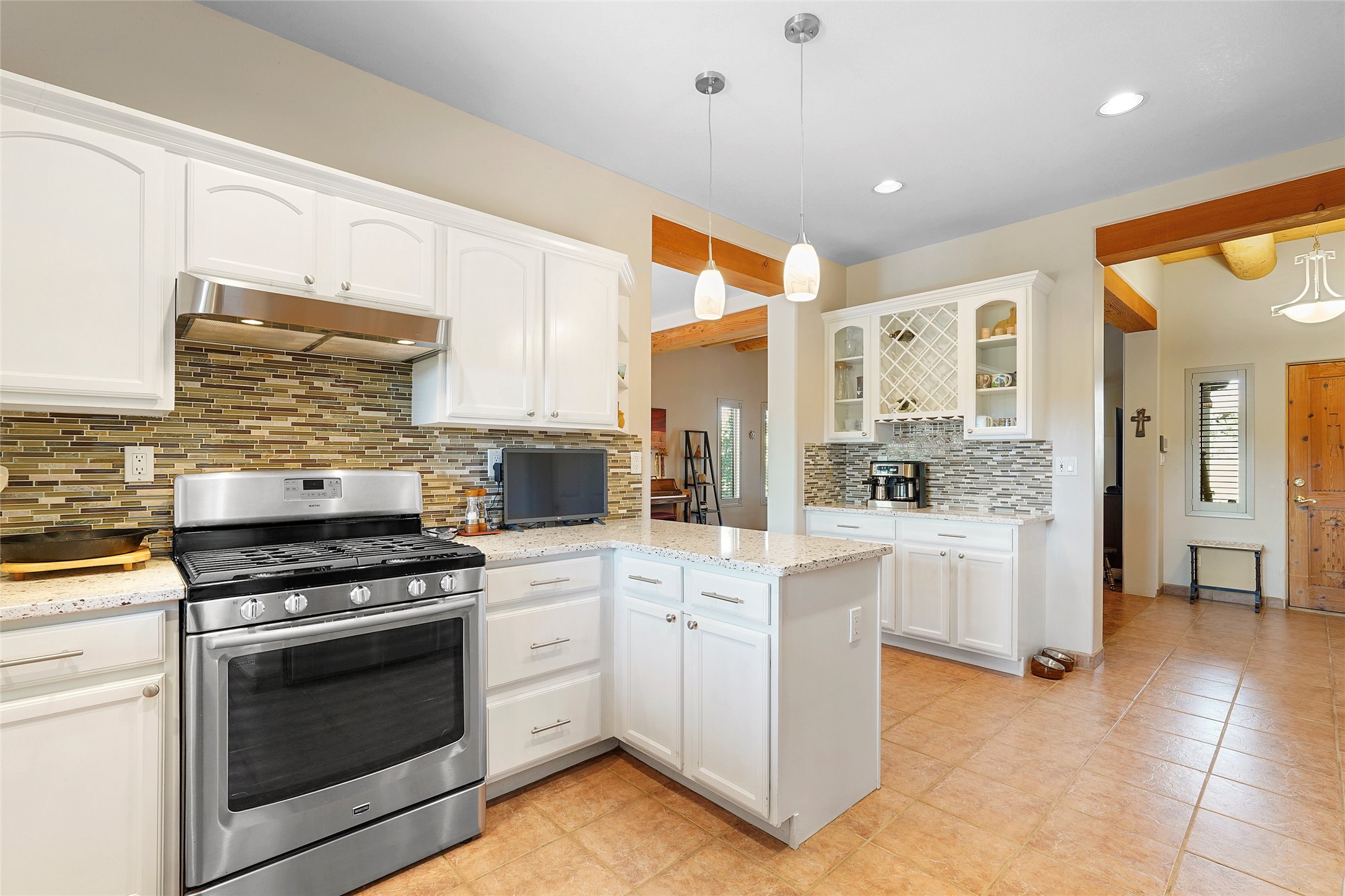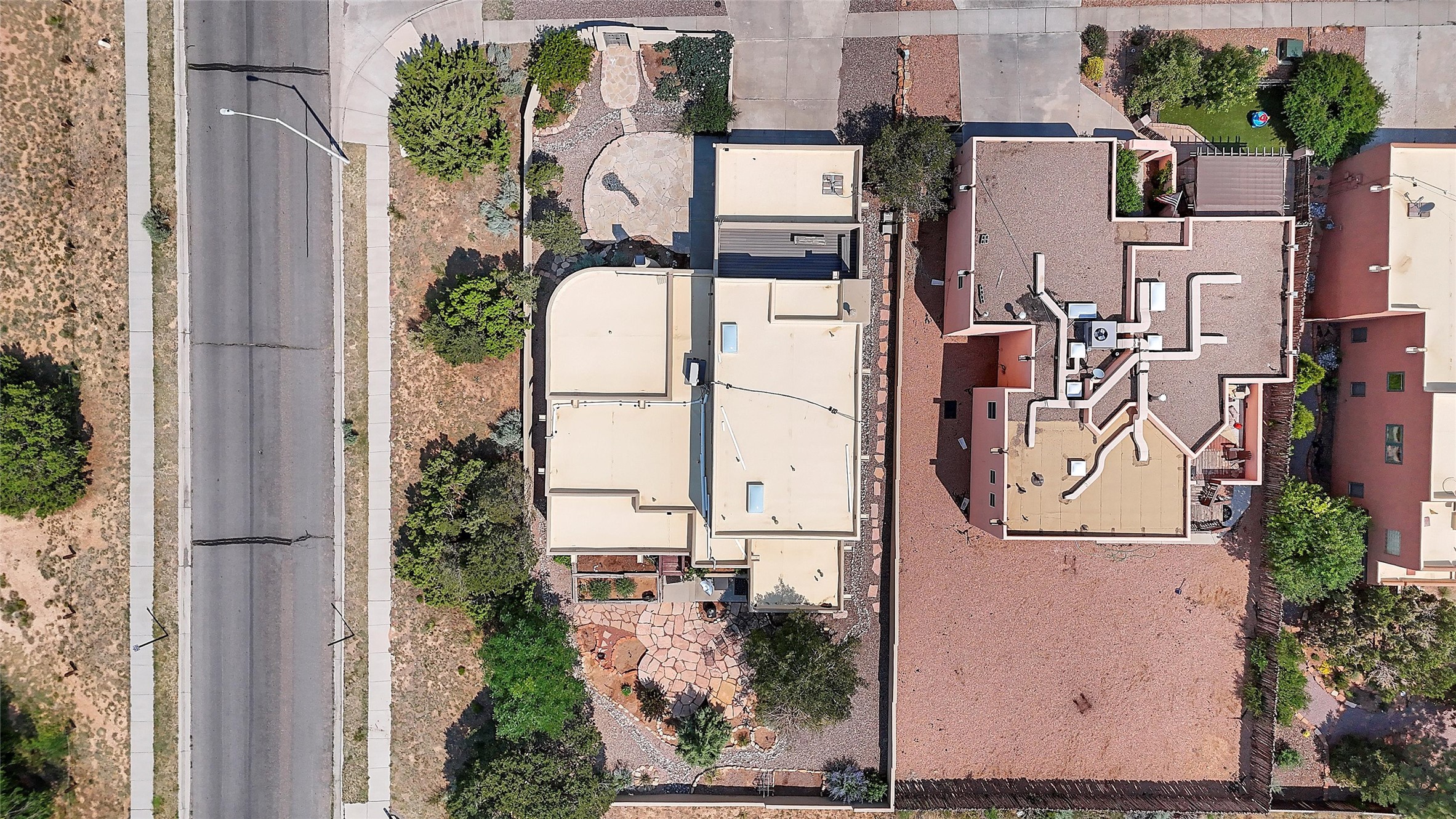 Welcome to this beautifully maintained home in the sought-after Pueblos de Sol subdivision, offering comfortable living and sweeping views. Recent upgrades include a modern kitchen with stainless steel appliances, granite countertops, and a spa-like primary bathroom with a standalone tub and custom stone tile. The primary suite also features a private deck with durable Trex decking. A TPO roof was installed in 2022. Enjoy year-round comfort with 5 mini-splits and radiant heating. Outdoor living shines with multiple decks, a charming courtyard, mature trees, and drip irrigation. A separate-entry studio/guesthouse with full bath offers rental or creative flexibility. Don't miss this Santa Fe gem! Trails and parks nearby!