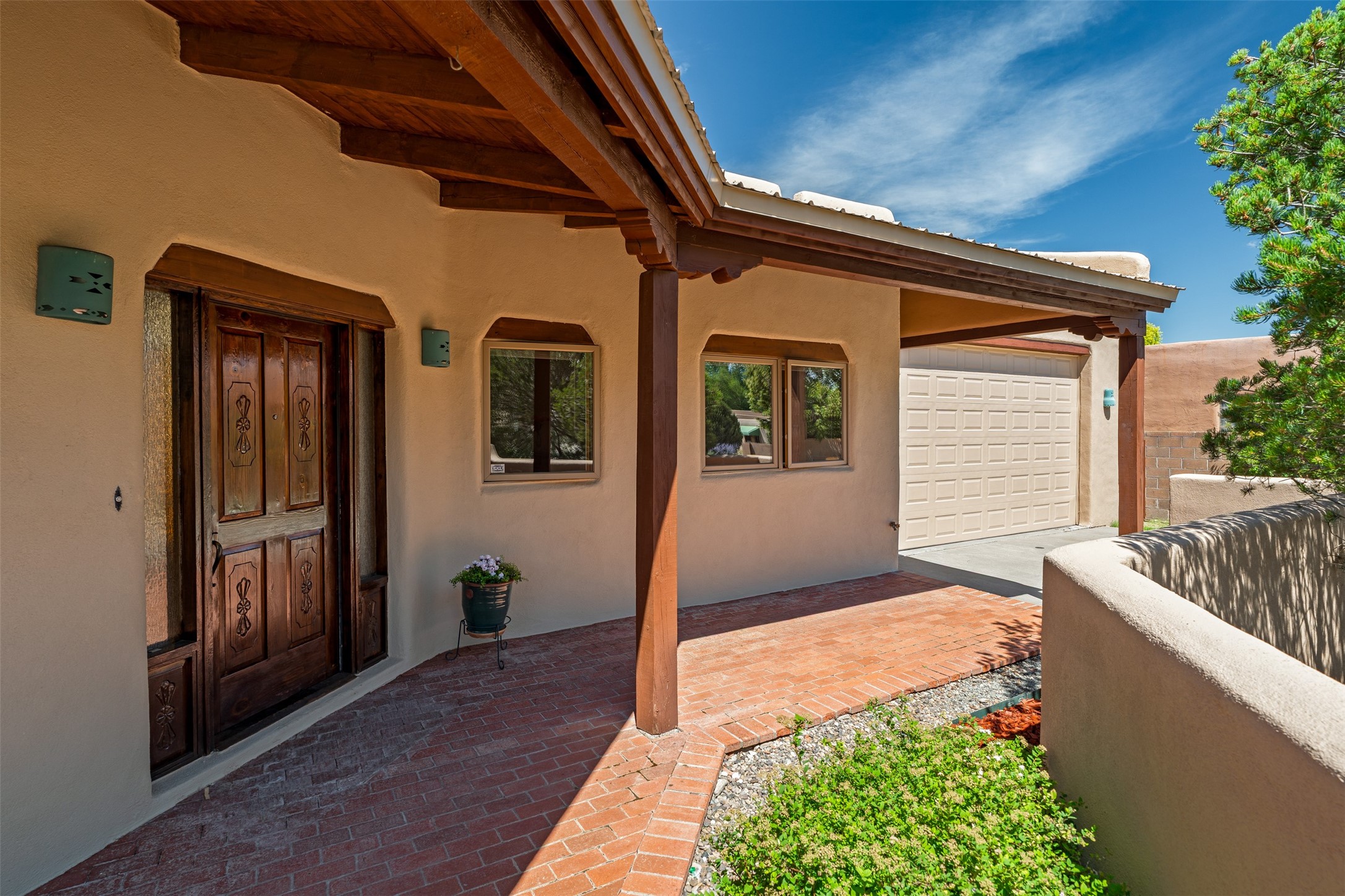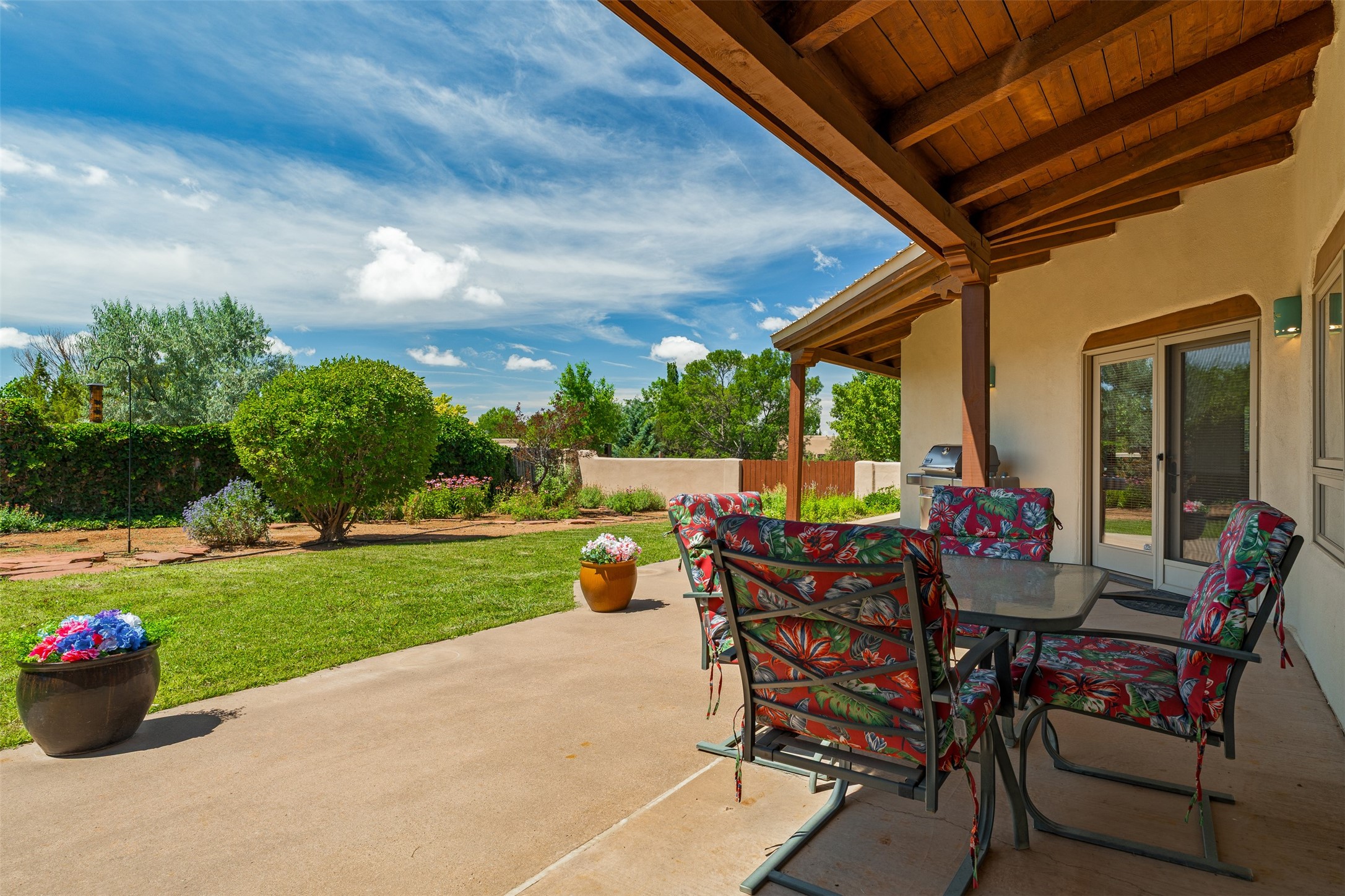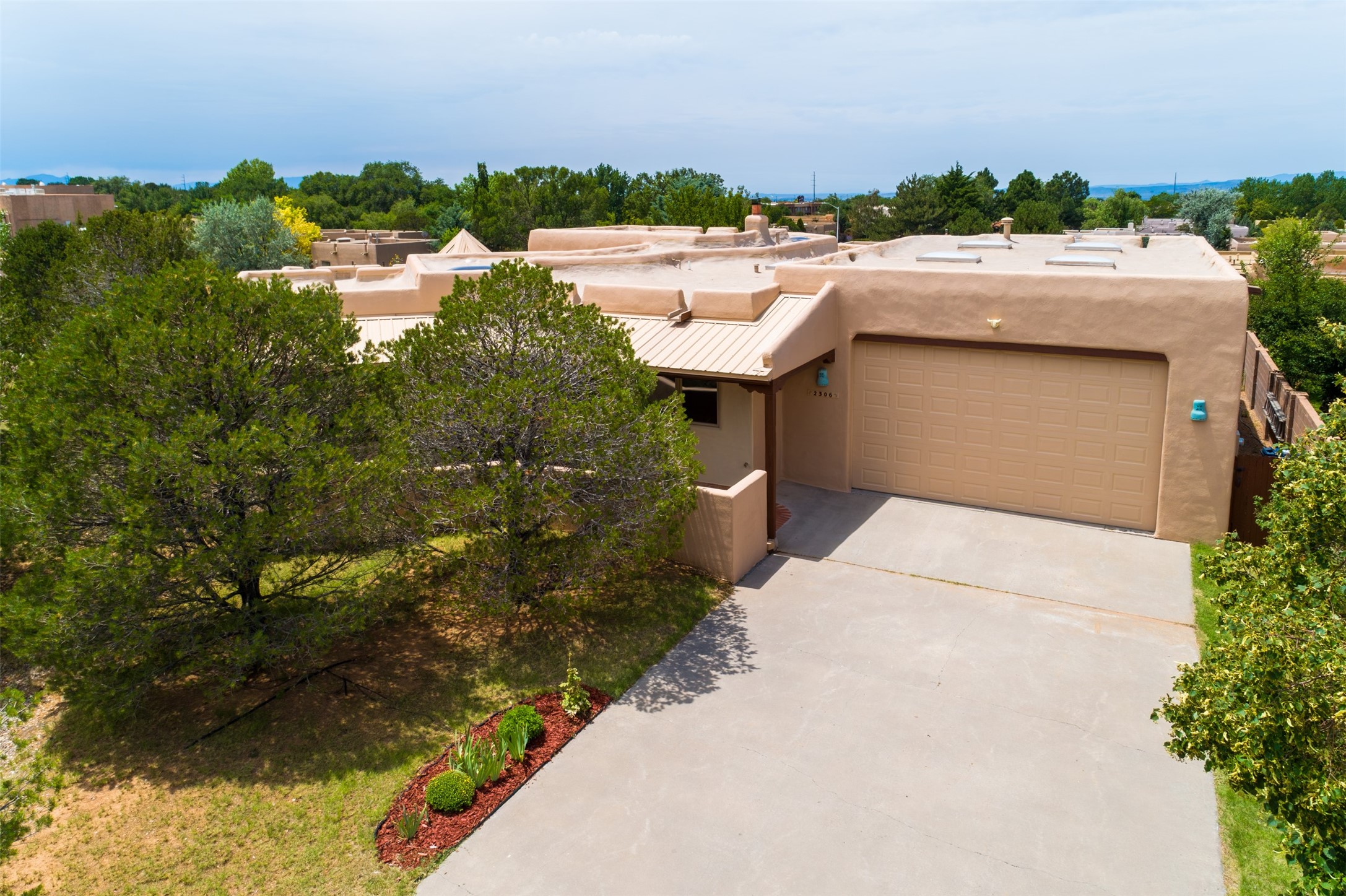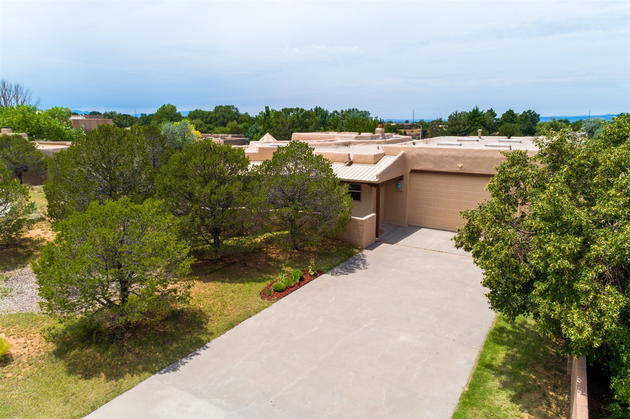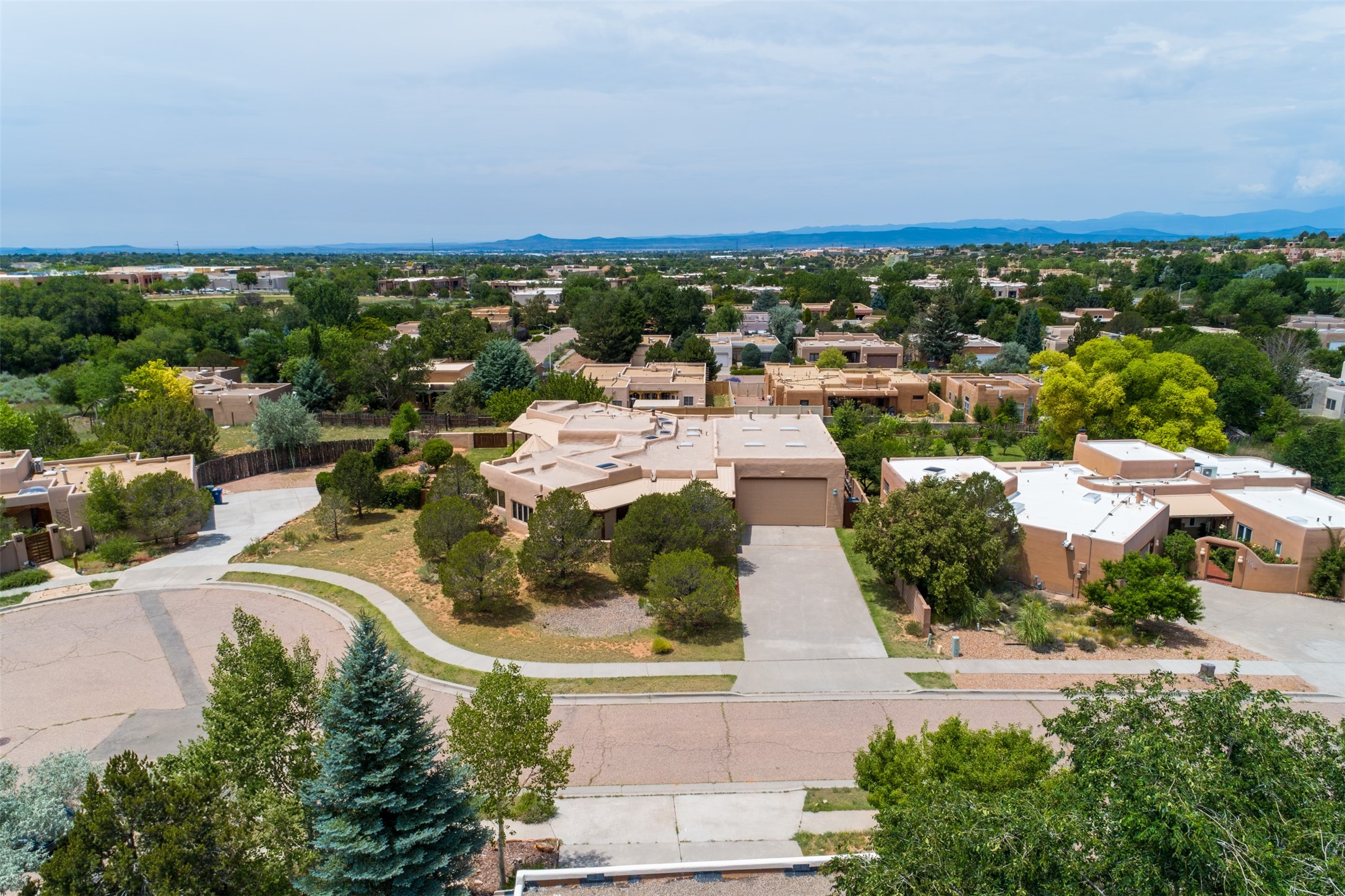 This one owner well maintained home is nestled on a quiet cul de sac street in an established neighborhood and offers an oasis of tranquility. It offers unparalleled charm and every detail has been thoughtfully crafted for luxurious living. From the moment you step into the spacious entry, you'll be captivated by the high ceilings throughout and the unique architectural elements. Enjoy the timeless Santa Fe charm vigas bring and especially when they are topped with split cedar as the grand hallway has been. Gather around the beautifully designed wood fireplace in the cozy living room, or enjoy morning coffee in the circular breakfast area with its enchanting wood-coned ceiling. The heart of the home, an updated kitchen with an island flows seamlessly into a formal dining area, perfect for entertaining. Retreat to the roomy primary bedroom or one of two spacious secondary bedrooms, each boasting an en-suite bathroom and generous closets. Outside, discover a private haven with established, irrigated front and back landscaping with a beautiful rose garden, and an enclosed backyard. Practical amenities such as an extra-long driveway, an oversized 1100 square foot 2-car garage with a 10-foot high double door. The garage is finished and has high ceilings and can accommodate many uses and greatly adds to the home's appeal. Bask in abundant natural light and enjoy the peace of mind that comes with living in an elegantly crafted home.