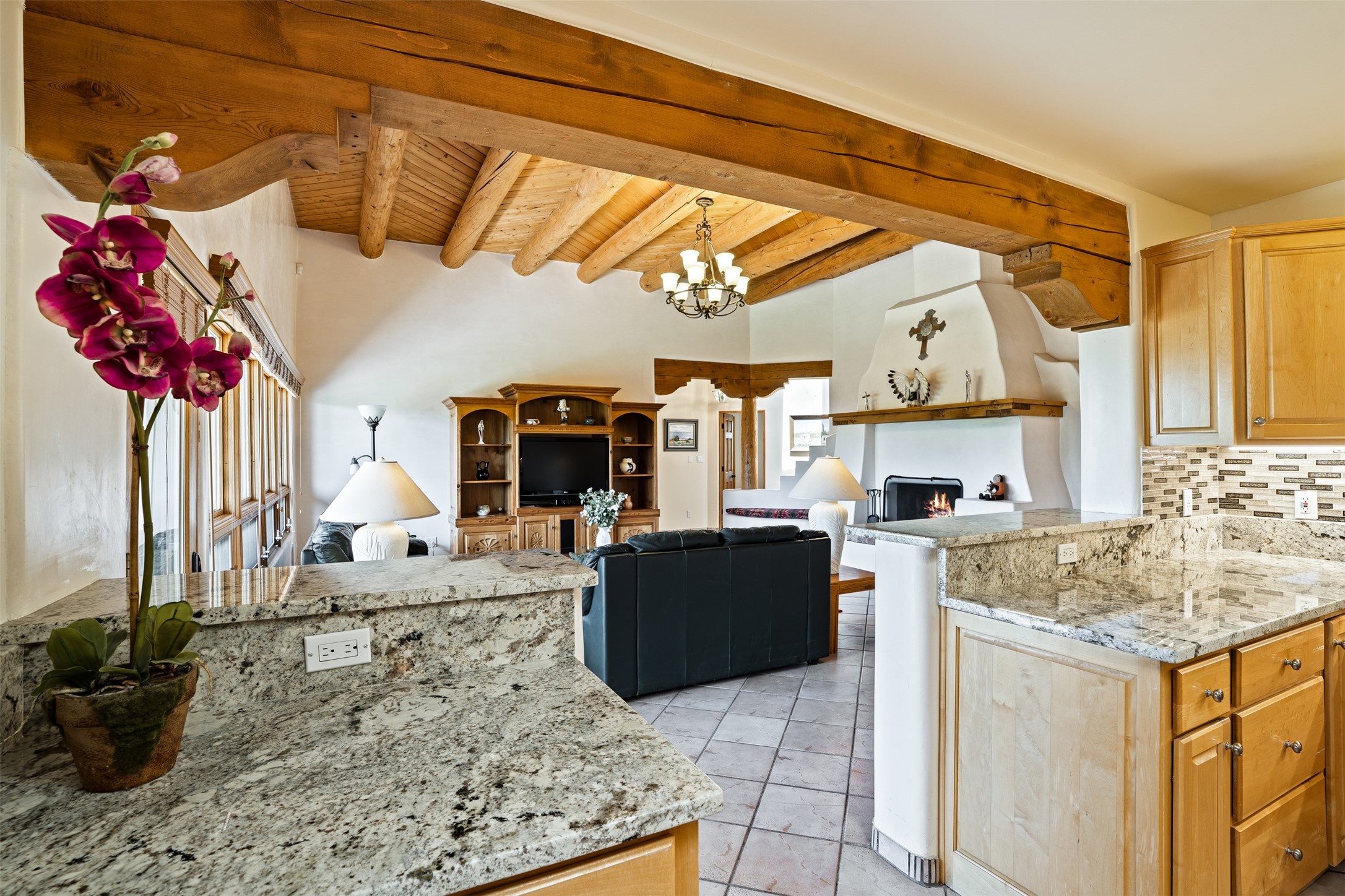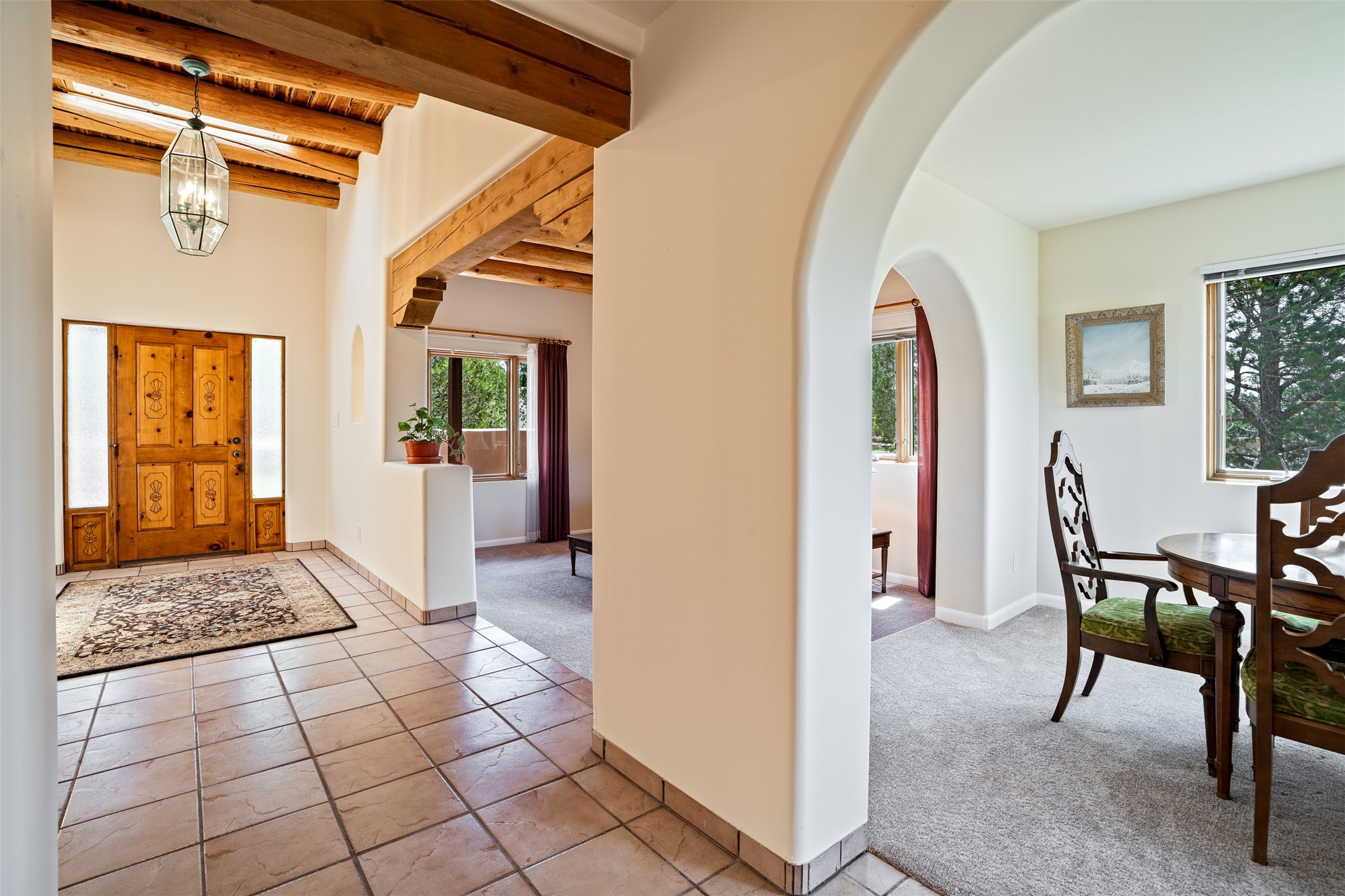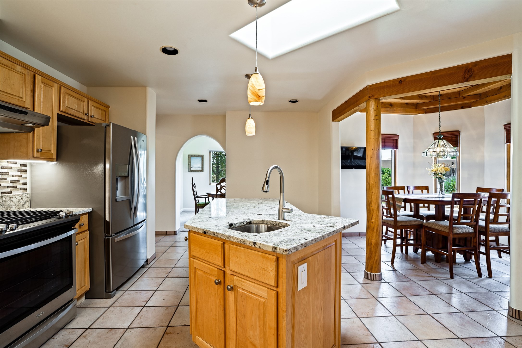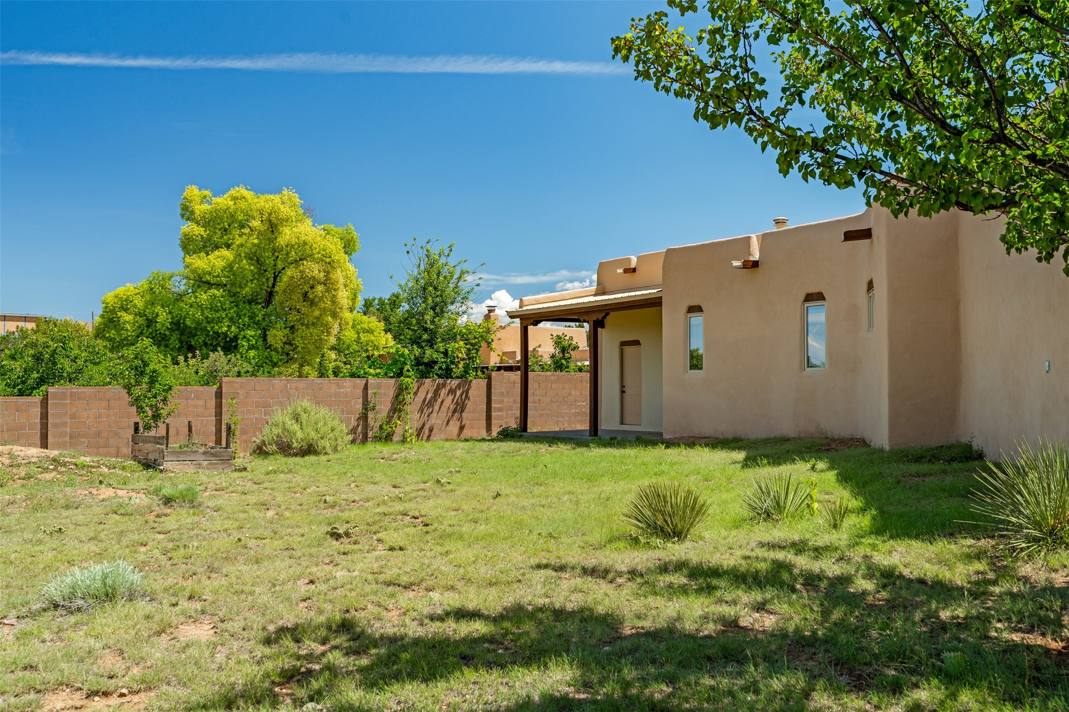 This one owner well maintained home is nestled on a quiet cul de sac street in an established neighborhood and offers an oasis of tranquility. It offers unparalleled charm and every detail has been thoughtfully crafted for luxurious living. From the moment you step into the spacious entry, you'll be captivated by the high ceilings throughout and the unique architectural elements. Enjoy the timeless Santa Fe charm vigas bring and especially when they are topped with split cedar as the grand hallway has been. Gather around the beautifully designed wood fireplace in the cozy living room, or enjoy morning coffee in the circular breakfast area with its enchanting wood-coned ceiling. The heart of the home, an updated kitchen with an island flows seamlessly into a formal dining area, perfect for entertaining. Retreat to the roomy primary bedroom or one of two spacious secondary bedrooms, each boasting an en-suite bathroom and generous closets. Outside, discover a private haven with established, irrigated front and back landscaping with a beautiful rose garden, and an enclosed backyard. Practical amenities such as an extra-long driveway, an oversized 1100 square foot 2-car garage with a 10-foot high double door. The garage is finished and has high ceilings and can accommodate many uses and greatly adds to the home's appeal. Bask in abundant natural light and enjoy the peace of mind that comes with living in an elegantly crafted home.