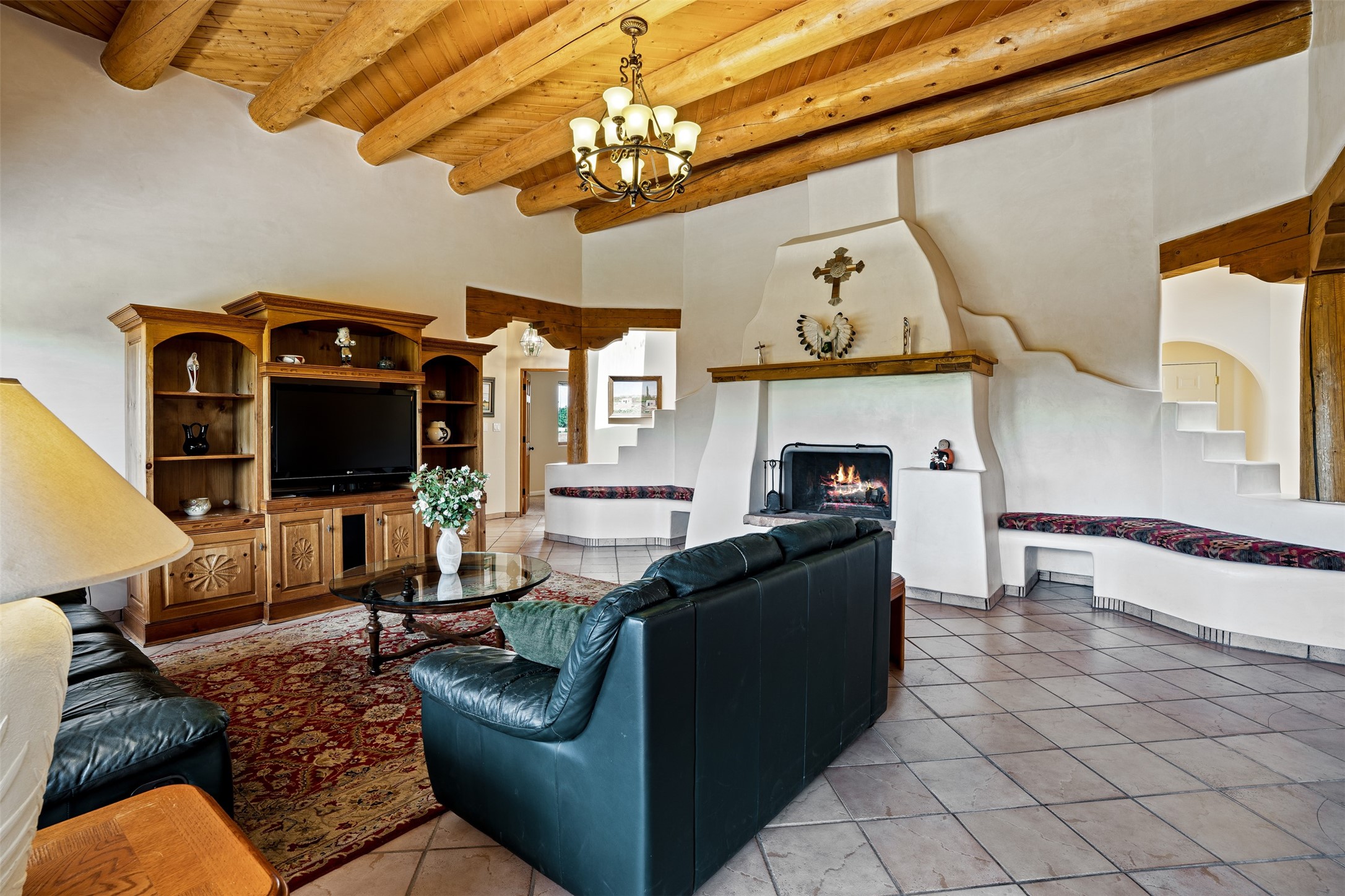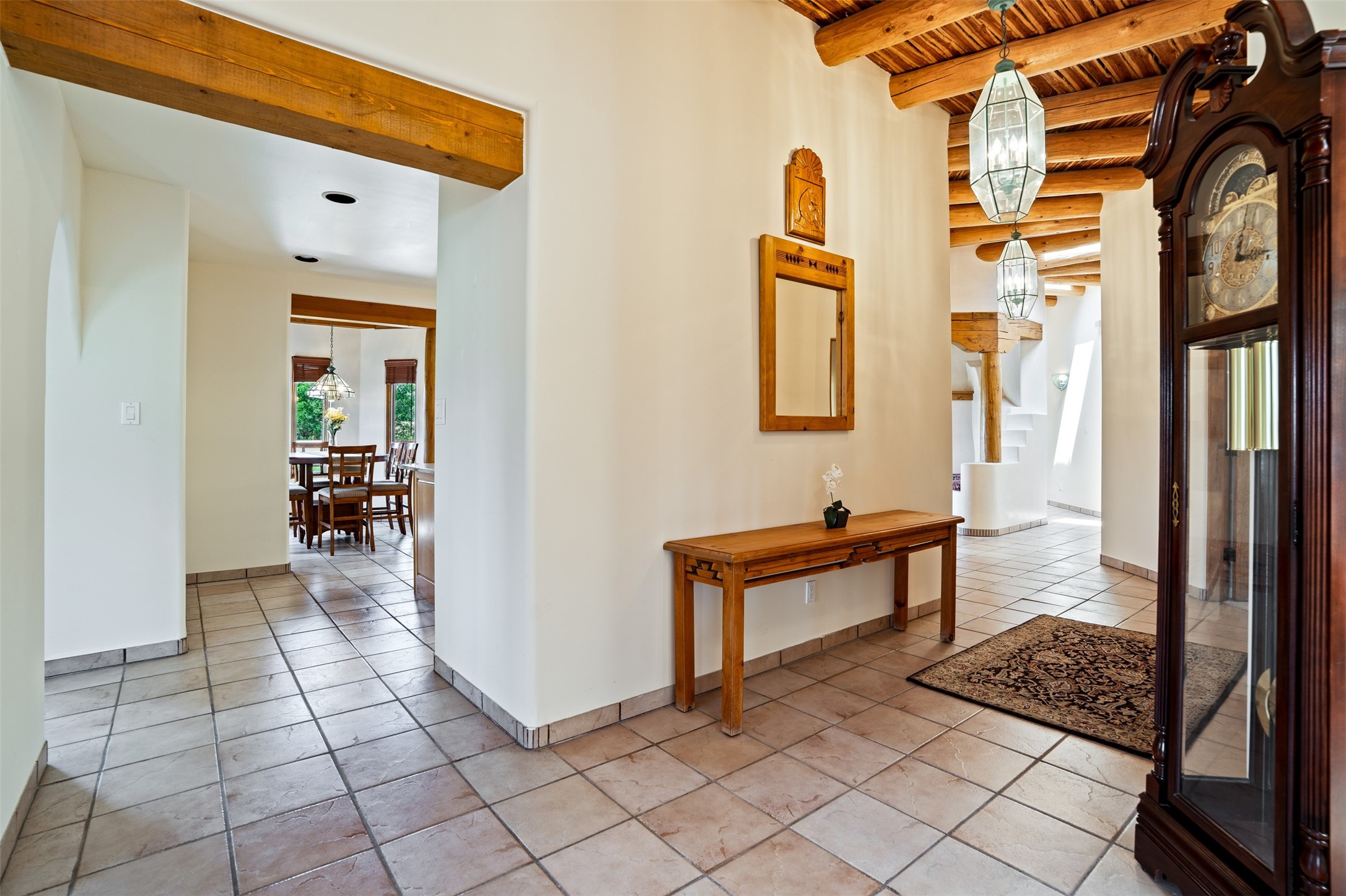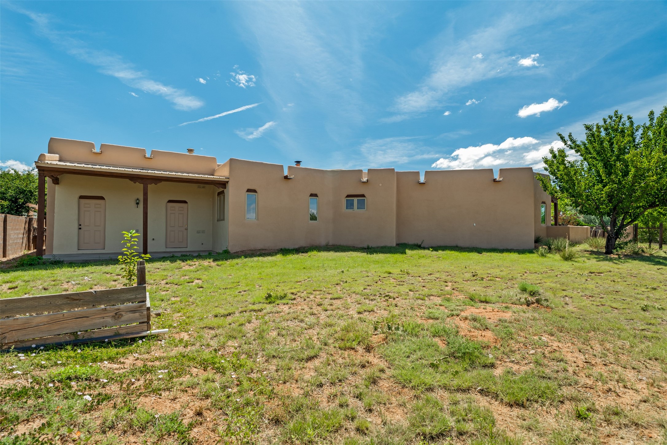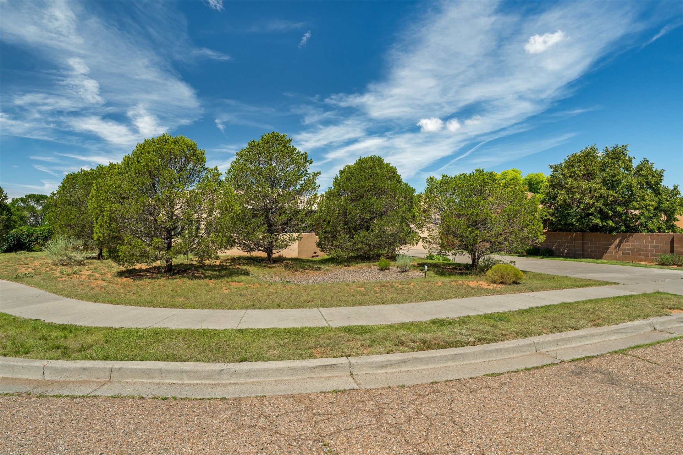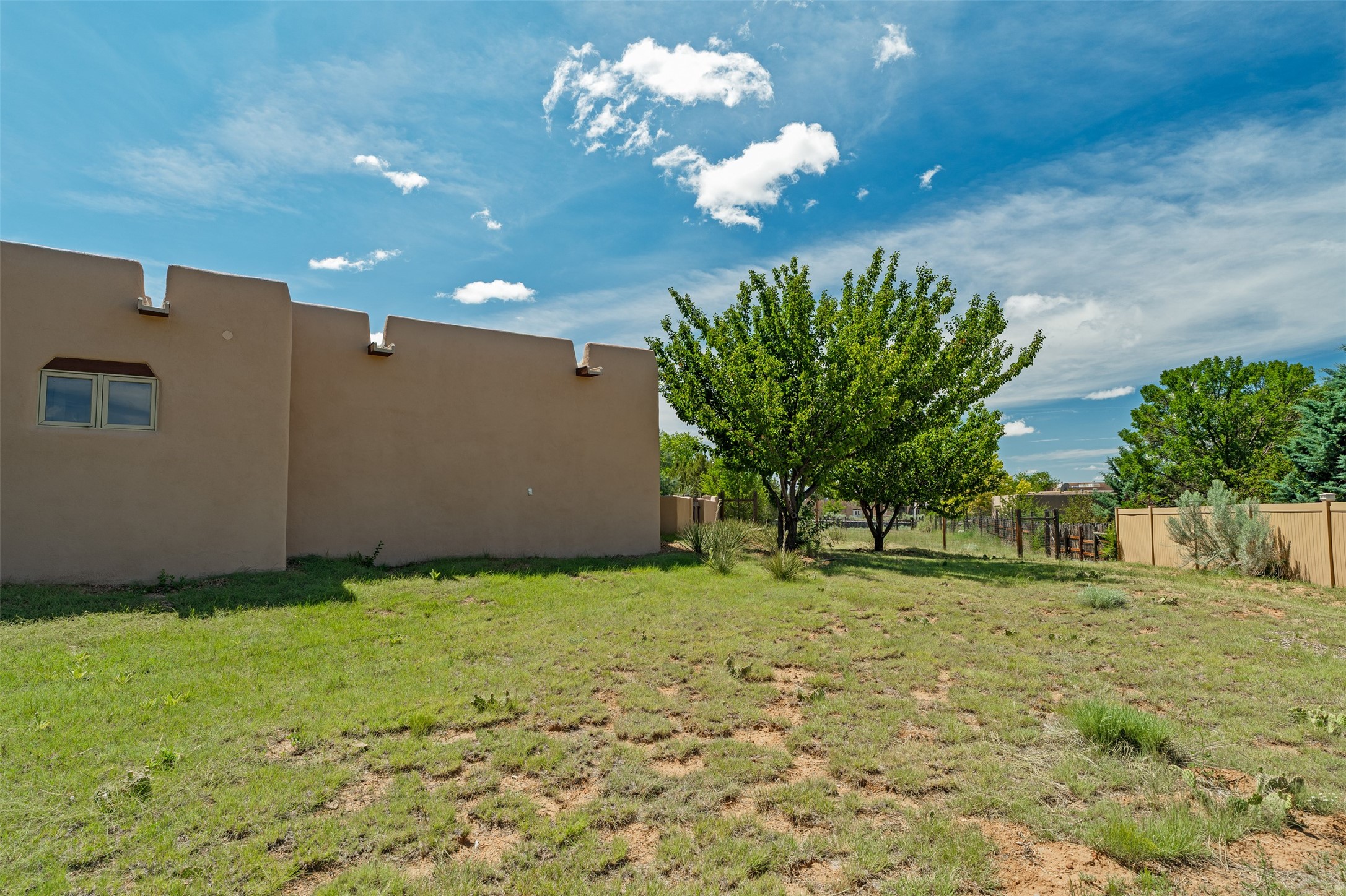 This one owner well maintained home is nestled on a quiet cul de sac street in an established neighborhood and offers an oasis of tranquility. It offers unparalleled charm and every detail has been thoughtfully crafted for luxurious living. From the moment you step into the spacious entry, you'll be captivated by the high ceilings throughout and the unique architectural elements. Enjoy the timeless Santa Fe charm vigas bring and especially when they are topped with split cedar as the grand hallway has been. Gather around the beautifully designed wood fireplace in the cozy living room, or enjoy morning coffee in the circular breakfast area with its enchanting wood-coned ceiling. The heart of the home, an updated kitchen with an island flows seamlessly into a formal dining area, perfect for entertaining. Retreat to the roomy primary bedroom or one of two spacious secondary bedrooms, each boasting an en-suite bathroom and generous closets. Outside, discover a private haven with established, irrigated front and back landscaping with a beautiful rose garden, and an enclosed backyard. Practical amenities such as an extra-long driveway, an oversized 1100 square foot 2-car garage with a 10-foot high double door. The garage is finished and has high ceilings and can accommodate many uses and greatly adds to the home's appeal. Bask in abundant natural light and enjoy the peace of mind that comes with living in an elegantly crafted home.