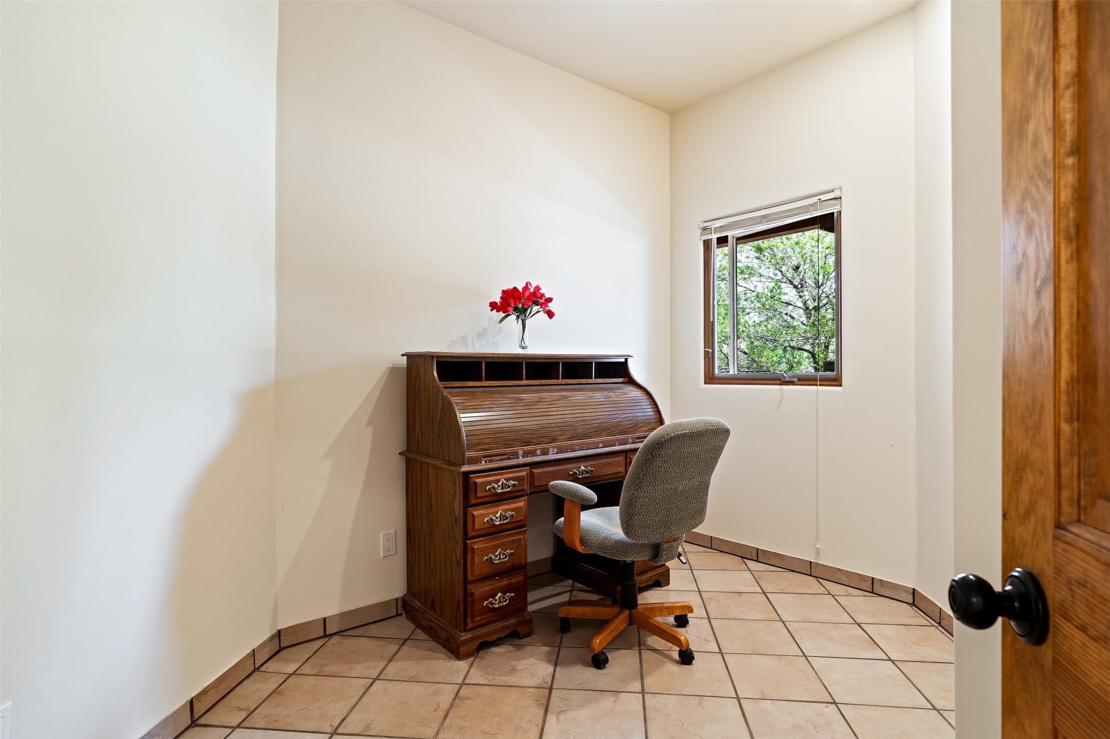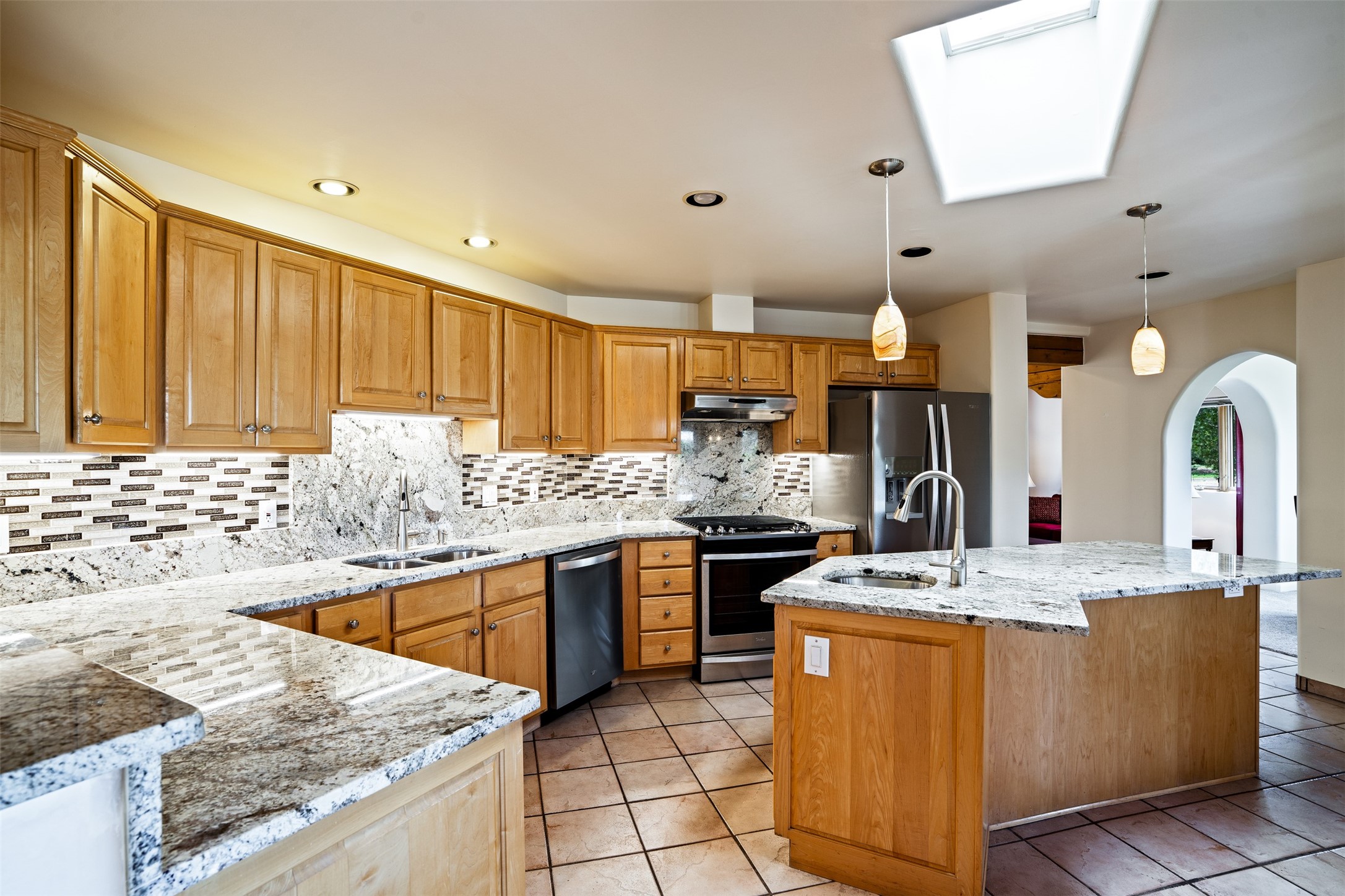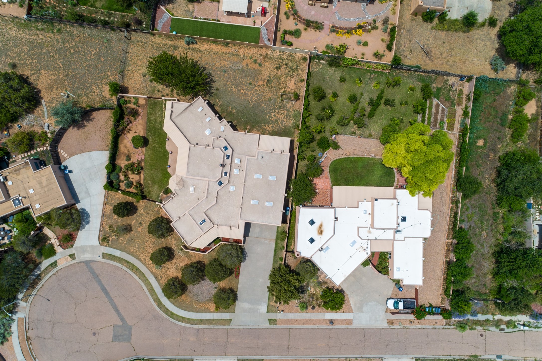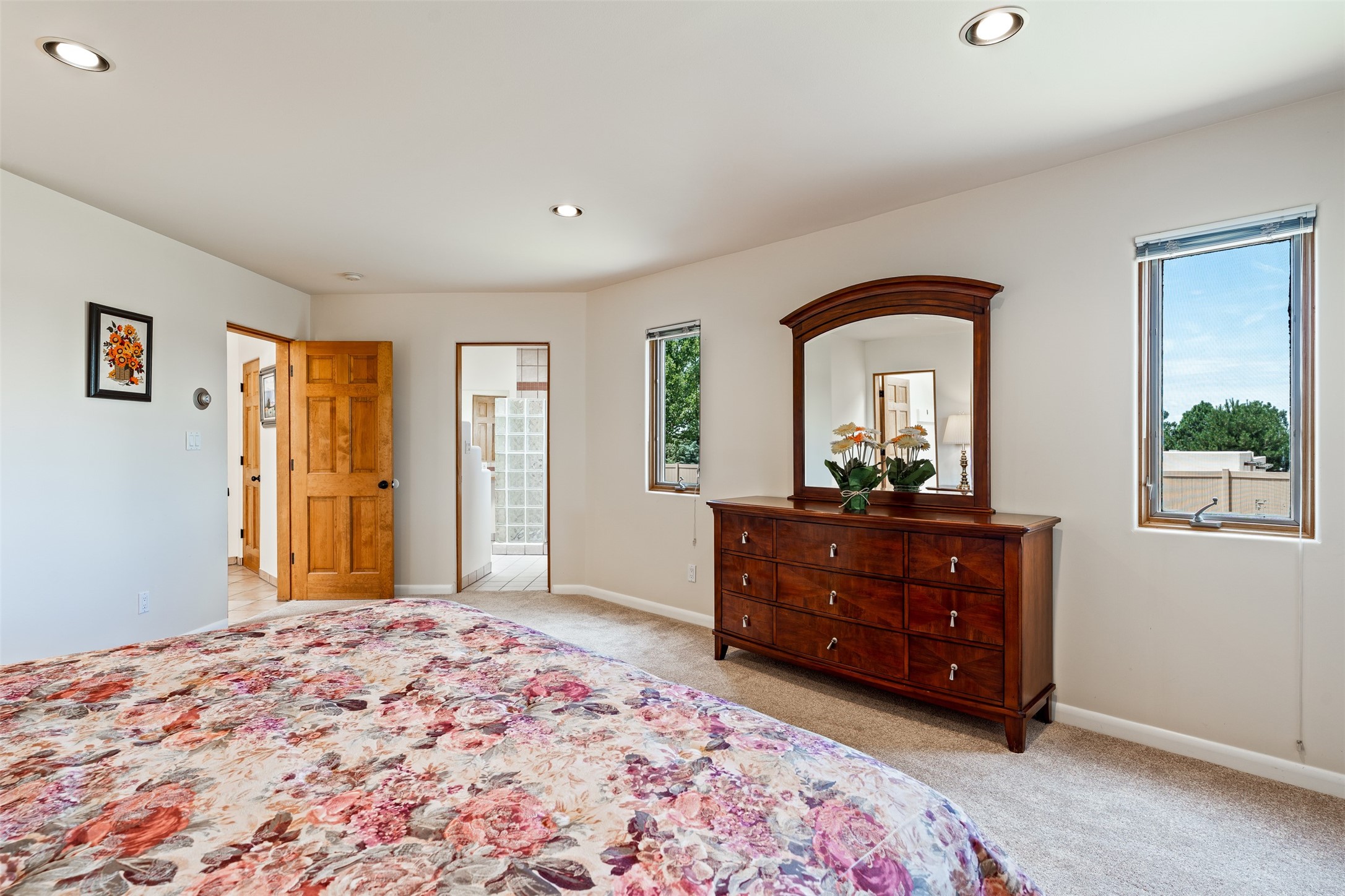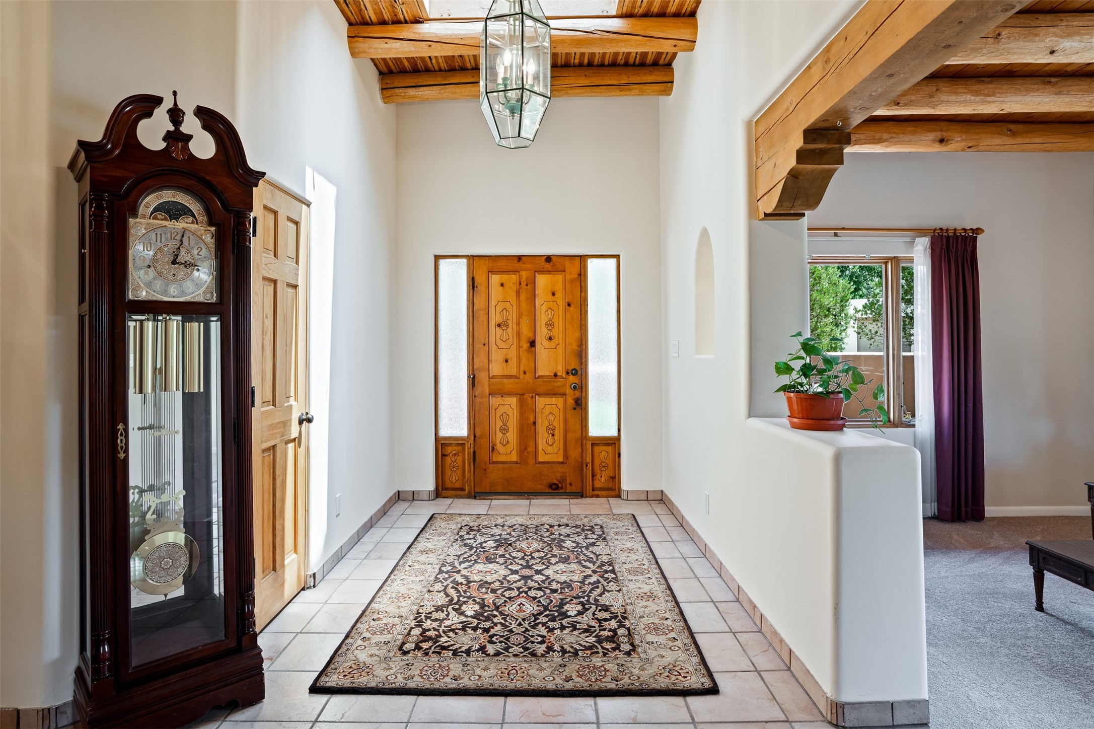 This one owner well maintained home is nestled on a quiet cul de sac street in an established neighborhood and offers an oasis of tranquility. It offers unparalleled charm and every detail has been thoughtfully crafted for luxurious living. From the moment you step into the spacious entry, you'll be captivated by the high ceilings throughout and the unique architectural elements. Enjoy the timeless Santa Fe charm vigas bring and especially when they are topped with split cedar as the grand hallway has been. Gather around the beautifully designed wood fireplace in the cozy living room, or enjoy morning coffee in the circular breakfast area with its enchanting wood-coned ceiling. The heart of the home, an updated kitchen with an island flows seamlessly into a formal dining area, perfect for entertaining. Retreat to the roomy primary bedroom or one of two spacious secondary bedrooms, each boasting an en-suite bathroom and generous closets. Outside, discover a private haven with established, irrigated front and back landscaping with a beautiful rose garden, and an enclosed backyard. Practical amenities such as an extra-long driveway, an oversized 1100 square foot 2-car garage with a 10-foot high double door. The garage is finished and has high ceilings and can accommodate many uses and greatly adds to the home's appeal. Bask in abundant natural light and enjoy the peace of mind that comes with living in an elegantly crafted home.