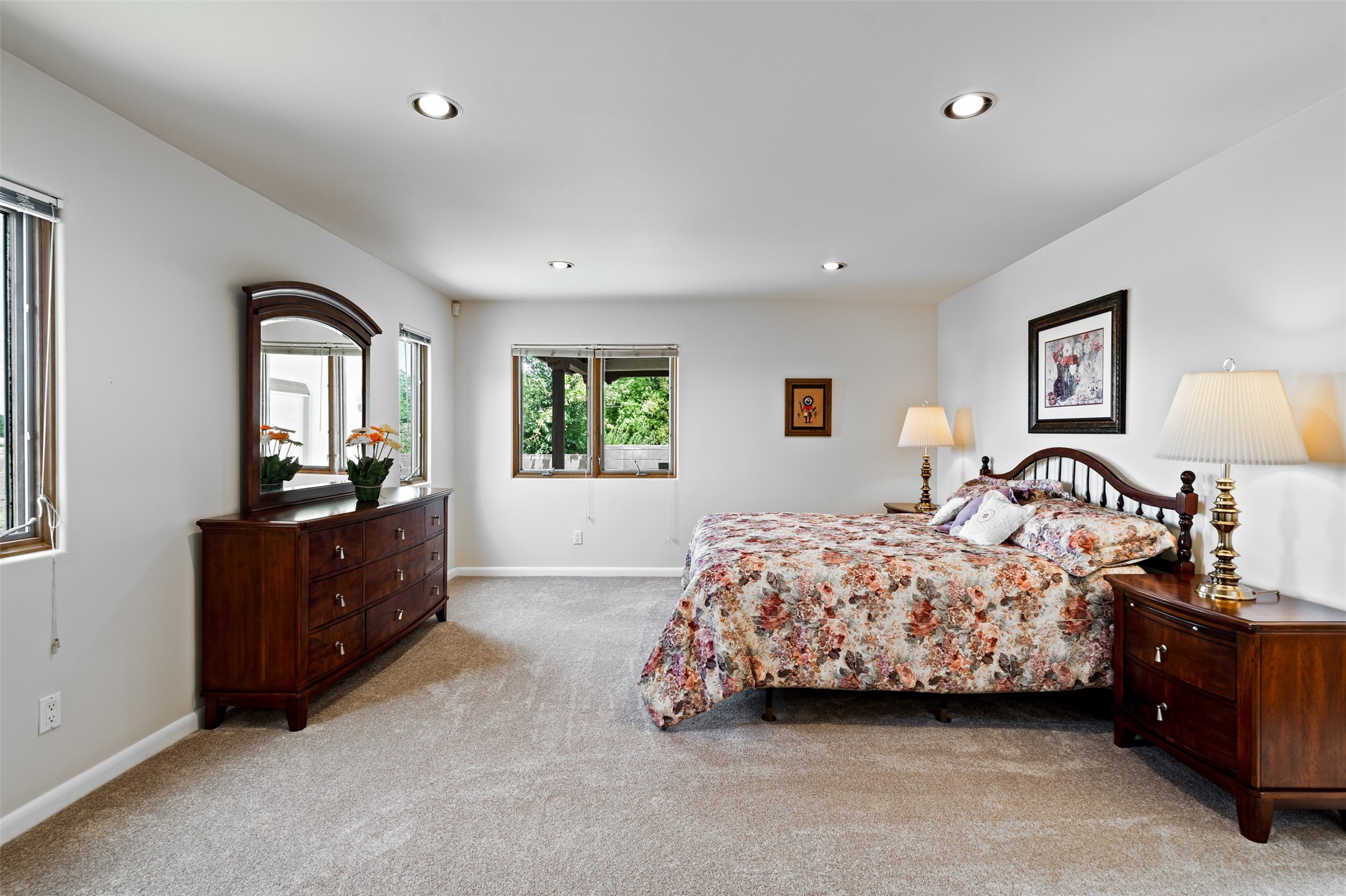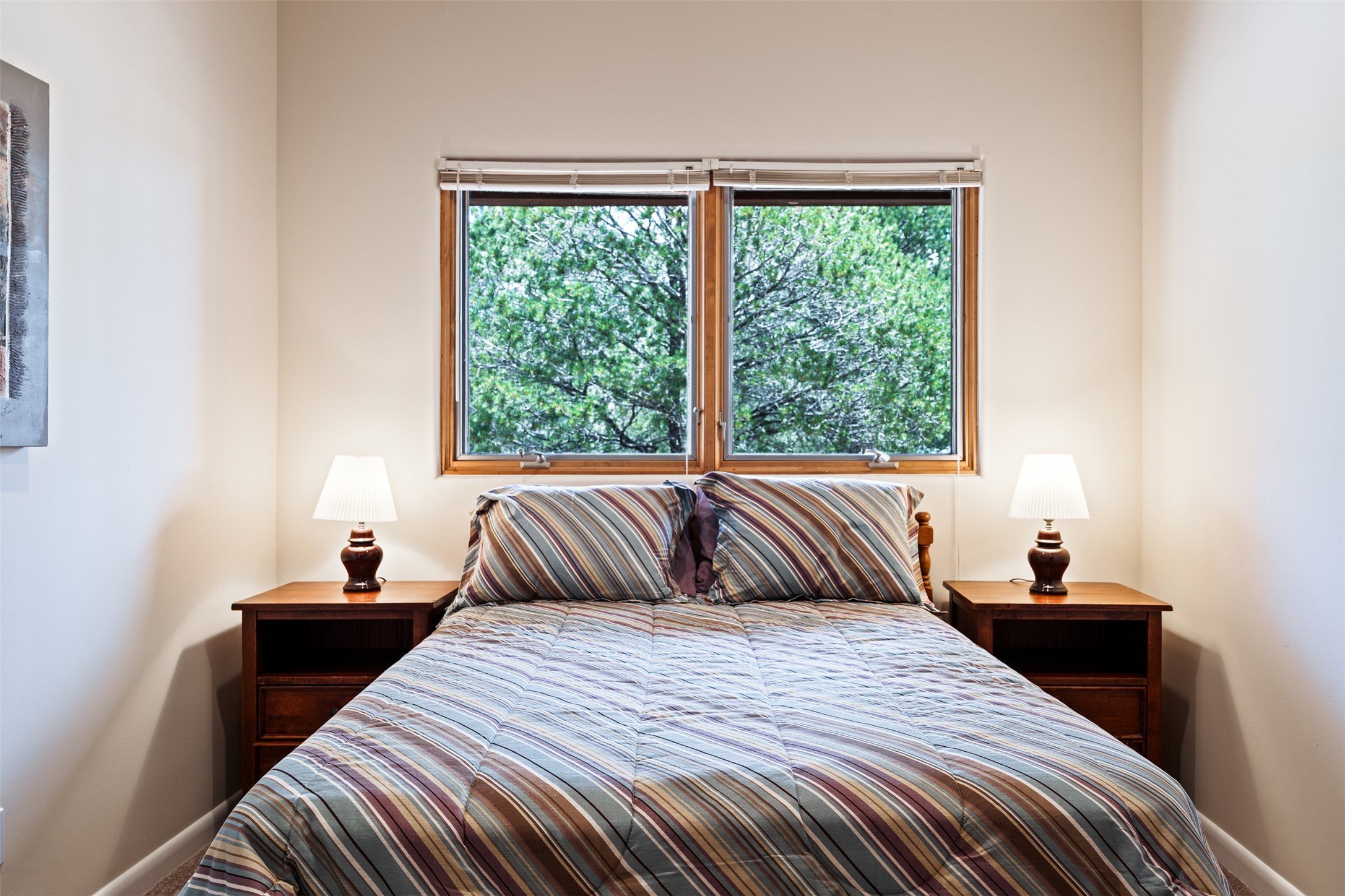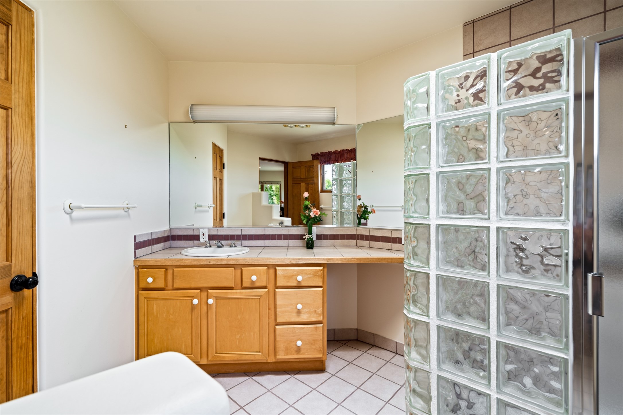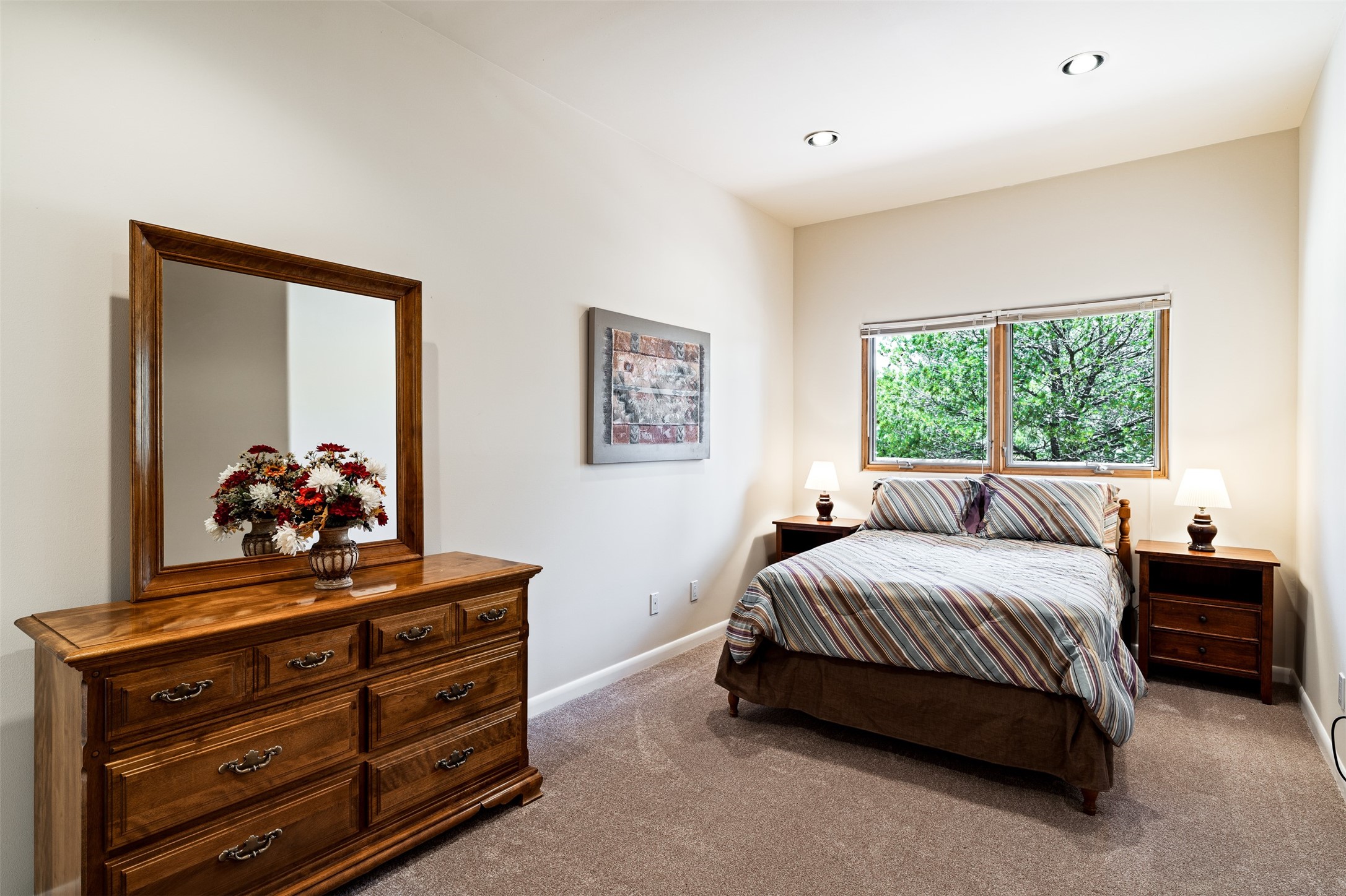 This one owner well maintained home is nestled on a quiet cul de sac street in an established neighborhood and offers an oasis of tranquility. It offers unparalleled charm and every detail has been thoughtfully crafted for luxurious living. From the moment you step into the spacious entry, you'll be captivated by the high ceilings throughout and the unique architectural elements. Enjoy the timeless Santa Fe charm vigas bring and especially when they are topped with split cedar as the grand hallway has been. Gather around the beautifully designed wood fireplace in the cozy living room, or enjoy morning coffee in the circular breakfast area with its enchanting wood-coned ceiling. The heart of the home, an updated kitchen with an island flows seamlessly into a formal dining area, perfect for entertaining. Retreat to the roomy primary bedroom or one of two spacious secondary bedrooms, each boasting an en-suite bathroom and generous closets. Outside, discover a private haven with established, irrigated front and back landscaping with a beautiful rose garden, and an enclosed backyard. Practical amenities such as an extra-long driveway, an oversized 1100 square foot 2-car garage with a 10-foot high double door. The garage is finished and has high ceilings and can accommodate many uses and greatly adds to the home's appeal. Bask in abundant natural light and enjoy the peace of mind that comes with living in an elegantly crafted home.