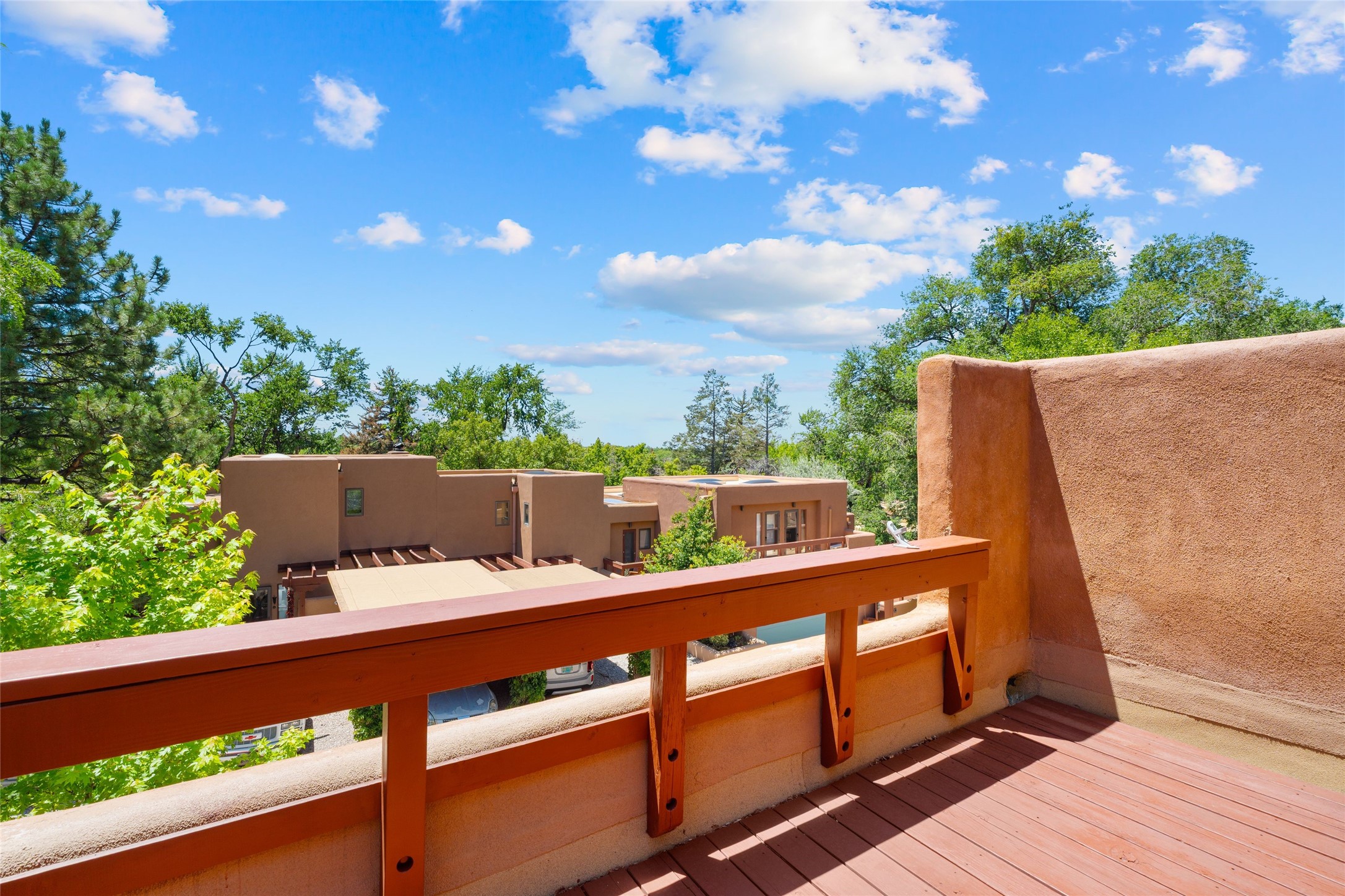 Nestled in the heart of historic Santa Fe just steps from Canyon Road, galleries, restaurants and the historic Plaza, this refined condominium in the highly sought after La Vereda Compound offers a rare blend of traditional charm and modern sophistication. Boasting 2 spacious bedrooms, a large office (perfect for remote work or guest overflow), 2 full bathrooms, and a half bath, this home is thoughtfully designed for comfort, convenience, and style. The updated kitchen features high-end appliances including a gas oven/range, contemporary cabinetry, and premium finishes, making is a delight for home chefs and entertainers alike. The high ceiled living and dining area are warm and inviting, with classic Santa Fe touches throughout. An added bonus to this property is the solarium off the living and dining rooms which provides extra living space as well as passive solar heat. There is a large laundry room and an extra utility/storage room. Upstairs, the primary suite opens to a private balcony with lovely views - an ideal spot for morning coffee or sunset unwinding. Enjoy serene surroundings and beautifully maintained grounds in a quiet community. Whether your seeking a peaceful getaway, a lock-and-leave second residence, or a sophisticated pied-a-terre, this La Vereda gem offers the quintessential Santa Fe lifestyle.