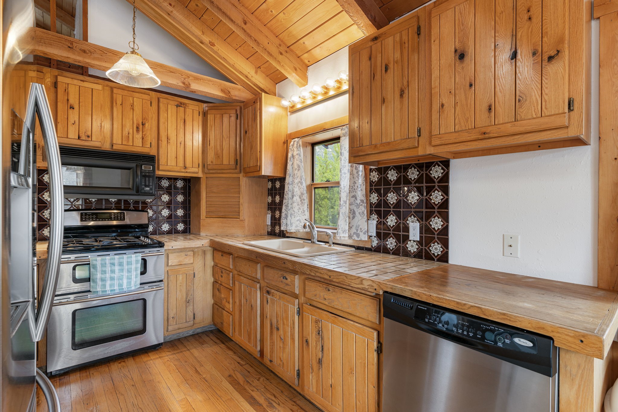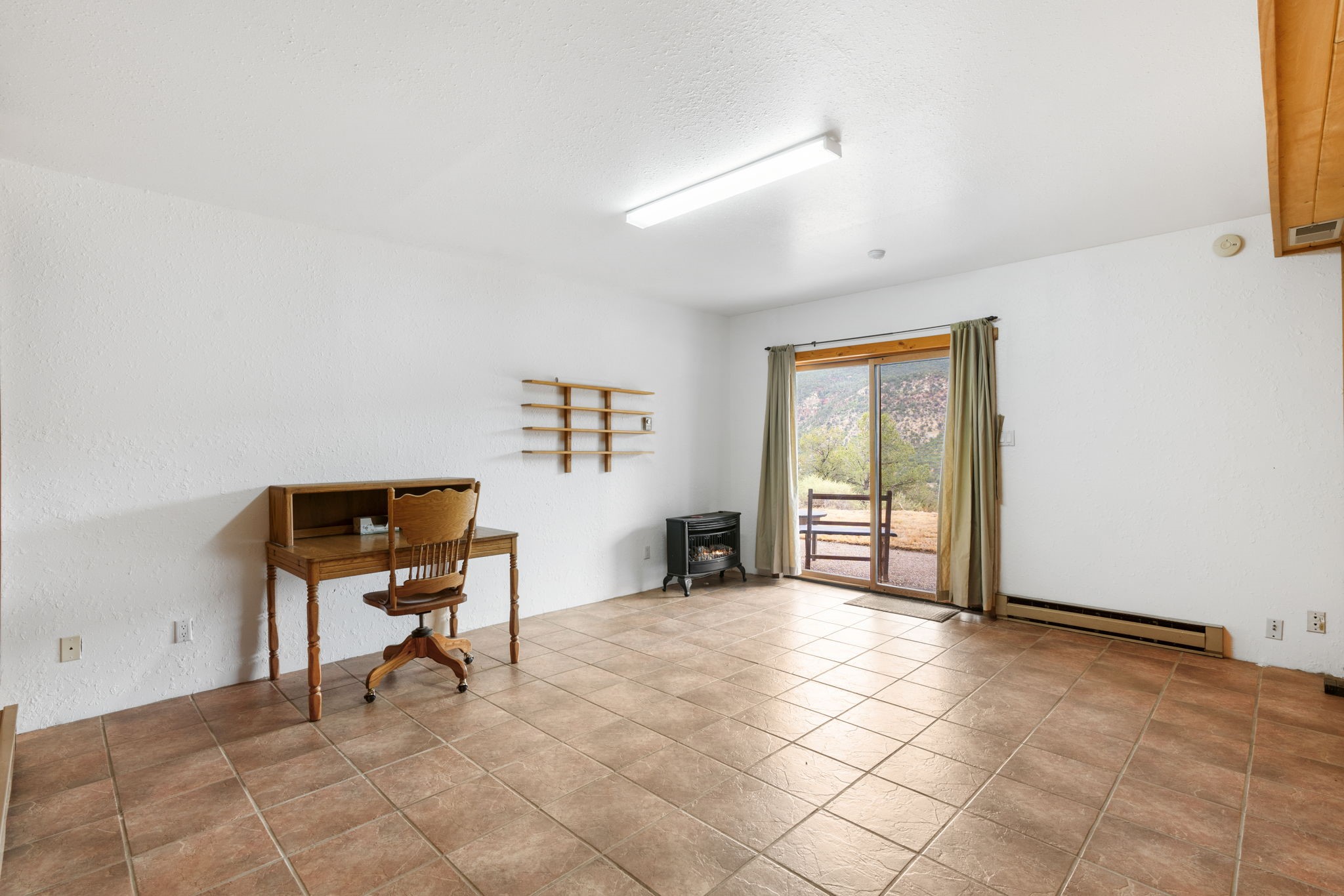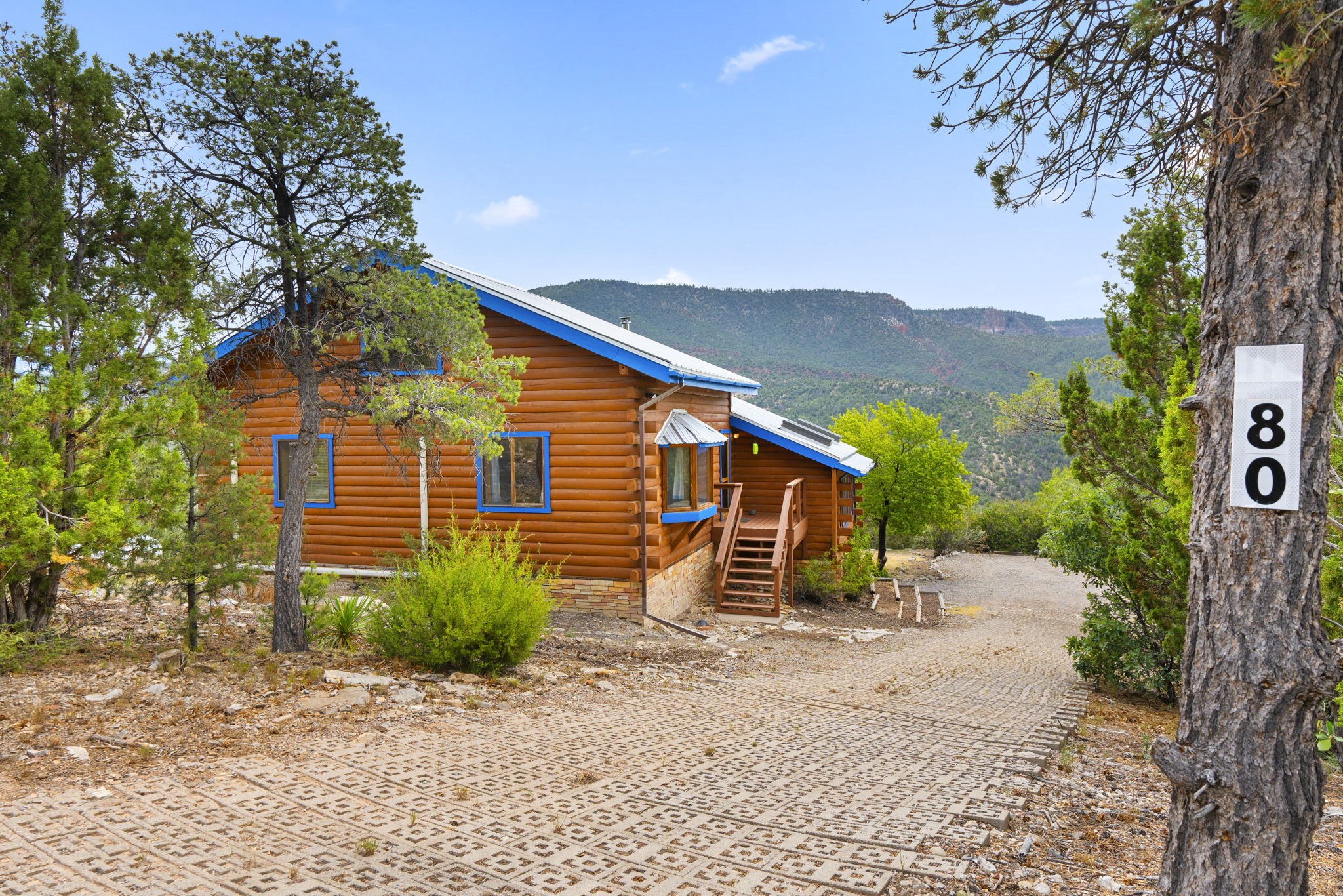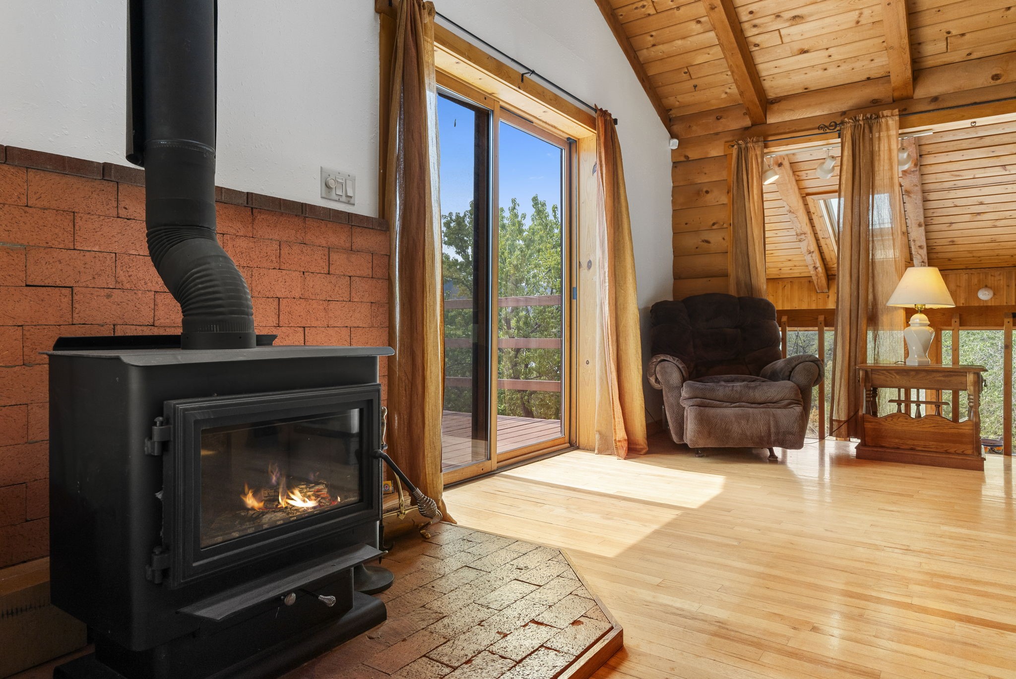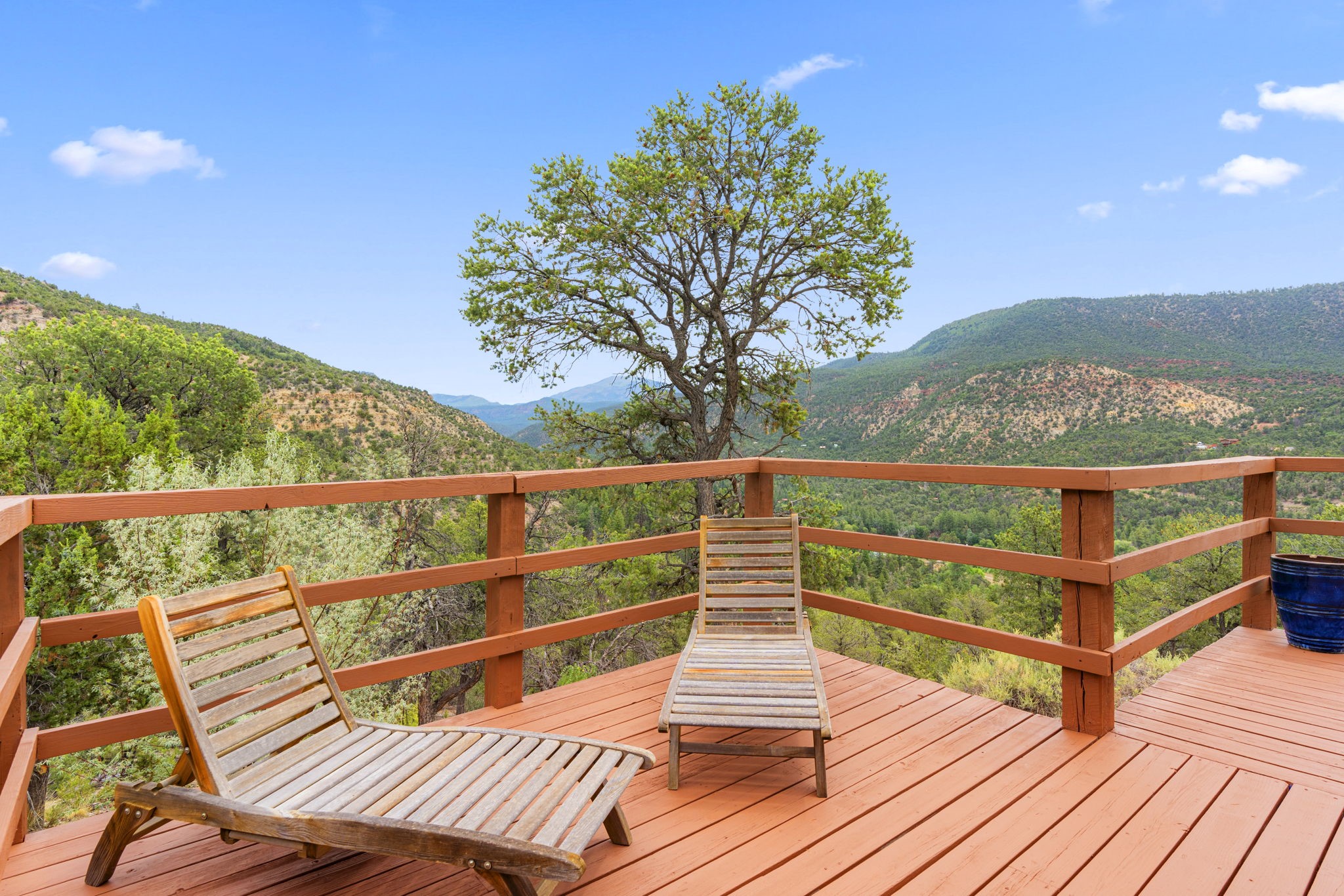 Breathtaking setting for this home in Jemez Springs perched among soaring mountain views. This spacious home has soaring beamed ceilings, wood floors, light-filled rooms, & loft with ample storage. Open floor plan with inviting living & dining area that expands to sunroom. Ideal for cozy reading rm, yoga/meditation or artist studio. Wood stove & mini splits making it comfortable all year long. Newer appliances in the kitchen. Access to expansive deck to enjoy mountain views and cool breezes. Lower level includes 2 flex spaces, a laundry room & full bathroom. Entry to an oversized one car garage. Could be used for a workshop. Property has a detached shed & covered carport, room for 2 vehicles. Home is on a very private lot at the end of cul-de-sac. Easy commute to LANL, Albuquerque, Fenton Lake. Buyer to confirm square footage.