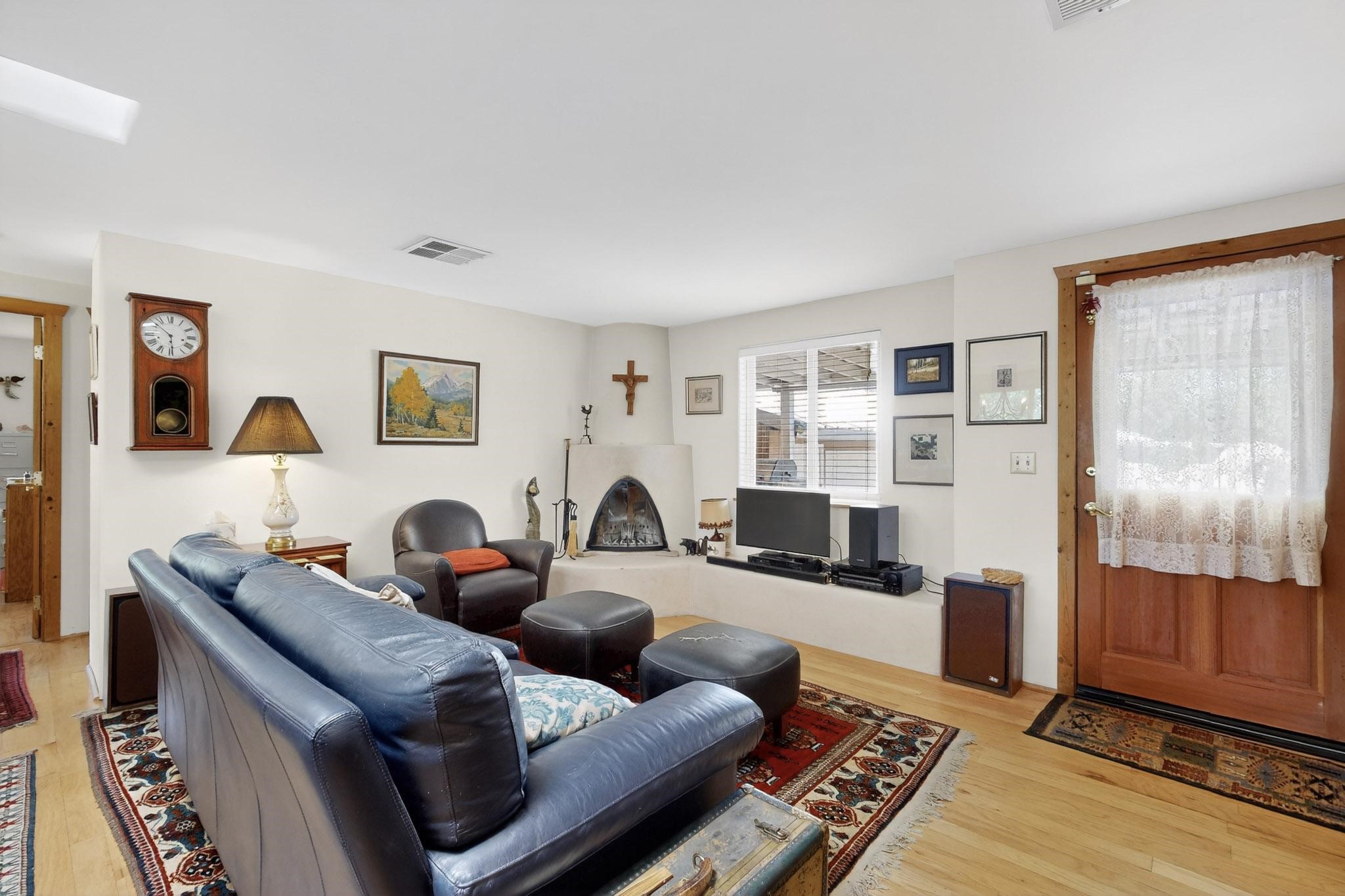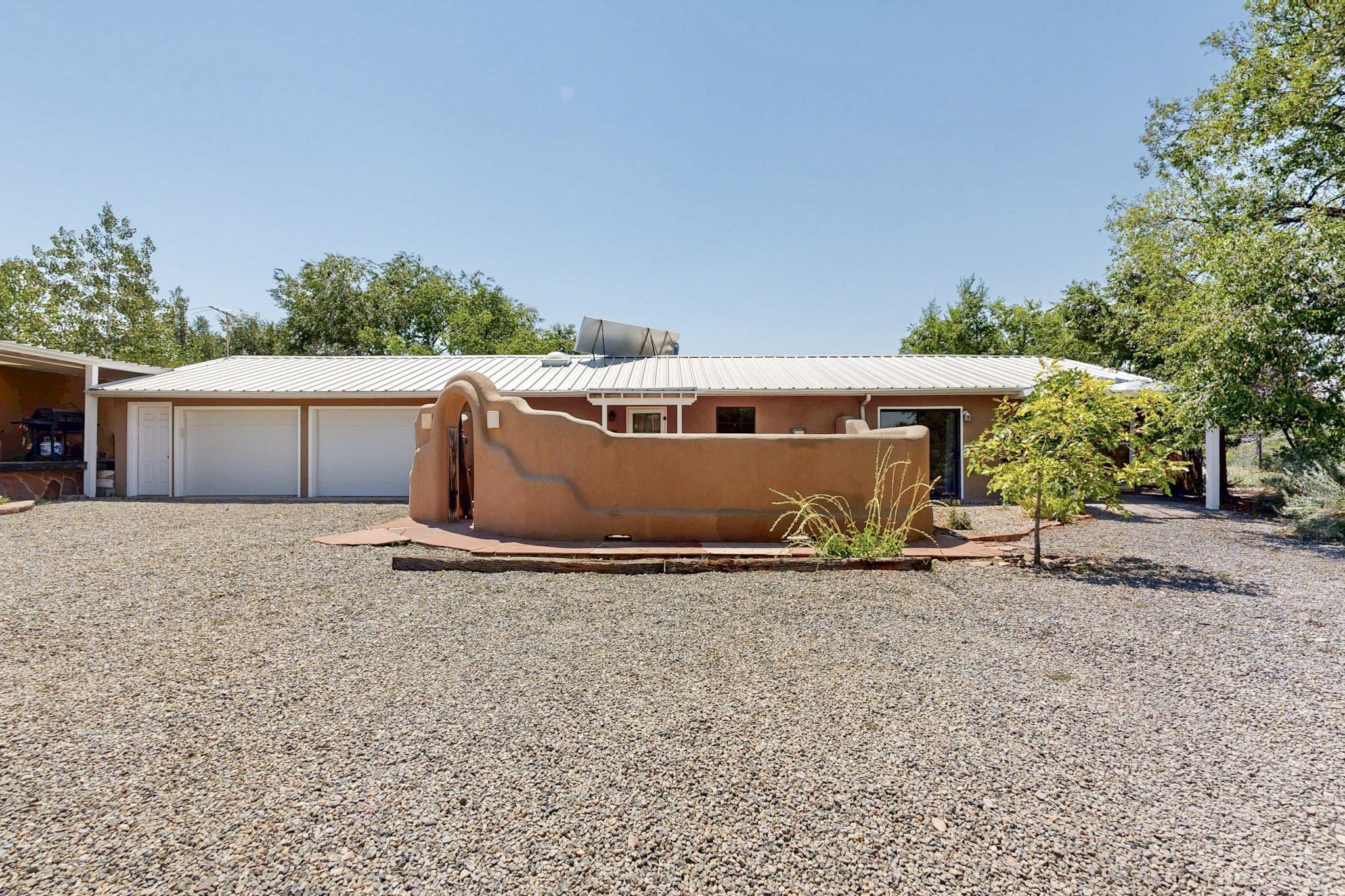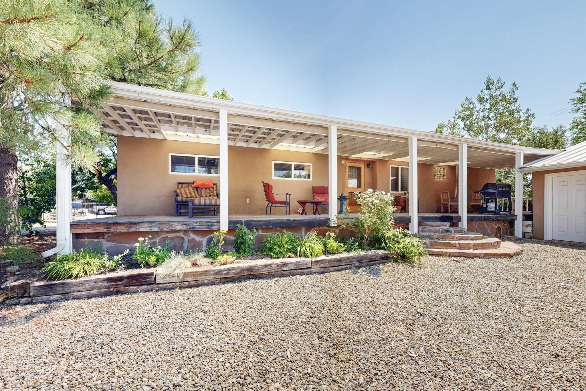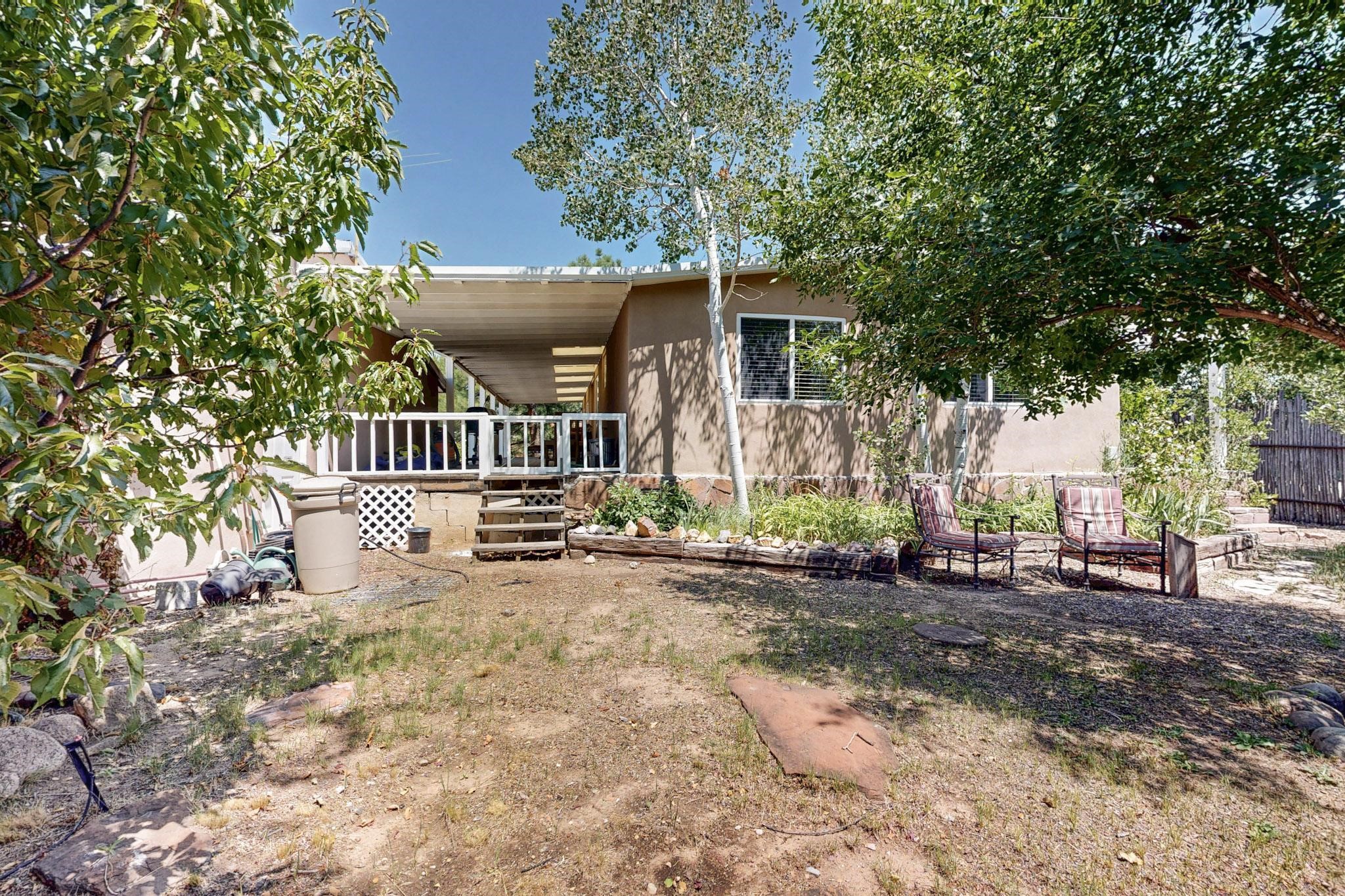 Unique and charming property at the end of Paseo De La Conquistadora on just under a 1/2 acre corner lot. Potentially an ideal ADU (accessory dwelling unit). The property lends itself to multigenerational living with the elderly parents, an offspring and a caregiver living in close proximity but with separate living spaces for privacy. Nestled under mature tree cover this property has three residential dwellings. The site built house is composed of two units. One is a one bedroom with three quarter bath and has its own walled courtyard with flagstone pavers. The smaller unit is an efficiency with a three quarter bath. There is a manufactured home with two bedrooms, two office areas and two baths. It features oak and tile floors and has a nice ambience accented by a kiva fireplace. It also has a 684 square porch running the length of the building. There is a wonderful nicely landscaped side yard that is fenced and very private. The lot has numerous fruit trees, lilacs and tall pines and sits up high above the Santa Fe river and there is a nice view of the Sangres. The Santa Fe river trail is just below the lot. The property has secure access via a remote controlled gate.