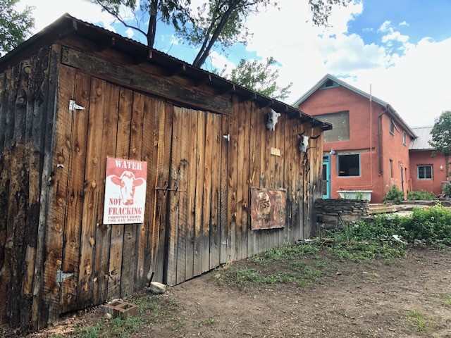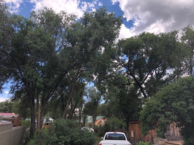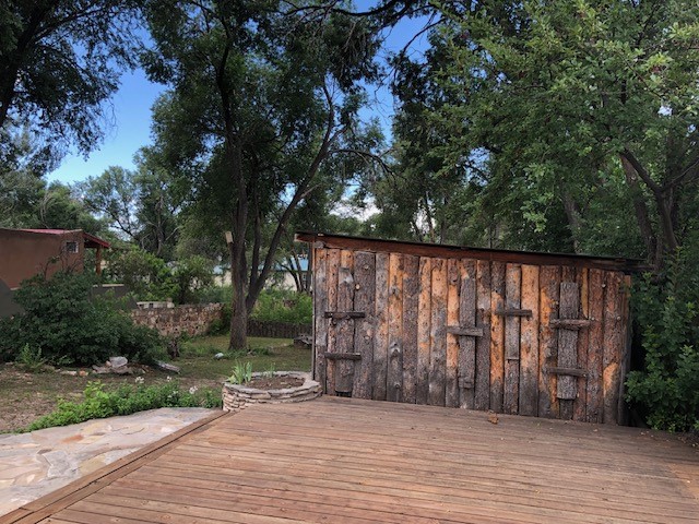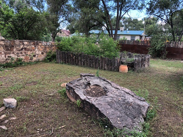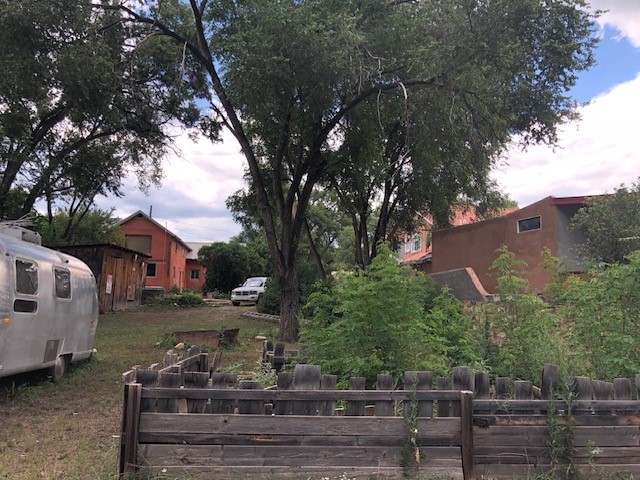This one-of-a-kind adobe house has a fascinating history. It was built as a "bounty house" after the Civil War: soldiers could have a piece of land for free if they built a certain minimum size house on it. The bounty house is the living room of this house - a large room with wood floor and high ceiling made of vigas and latillas. With a red enamel gas stove at the far end, a built-in bookcase near the front door, and Mexican light fixtures, it is a charming entry to the house. The rest of the house was built onto this structure later and includes a bathroom with walk-in tub, a laundry area, and a large homey kitchen downstairs. The kitchen has a large 5-burner gas stove and large matching refrigerator and freezer. A spiral staircase leads upstairs to the bedroom, which has bathroom facilities in it (sink, toilet, and claw-foot tub), and a walk-in closet. The lot is 0.29 acres, green and lush and graced with large old trees. There is a large storage shed with slab floor and a couple of patios off the house. The whole property is walled or fenced, and there is an electric gate. Truly a special property.