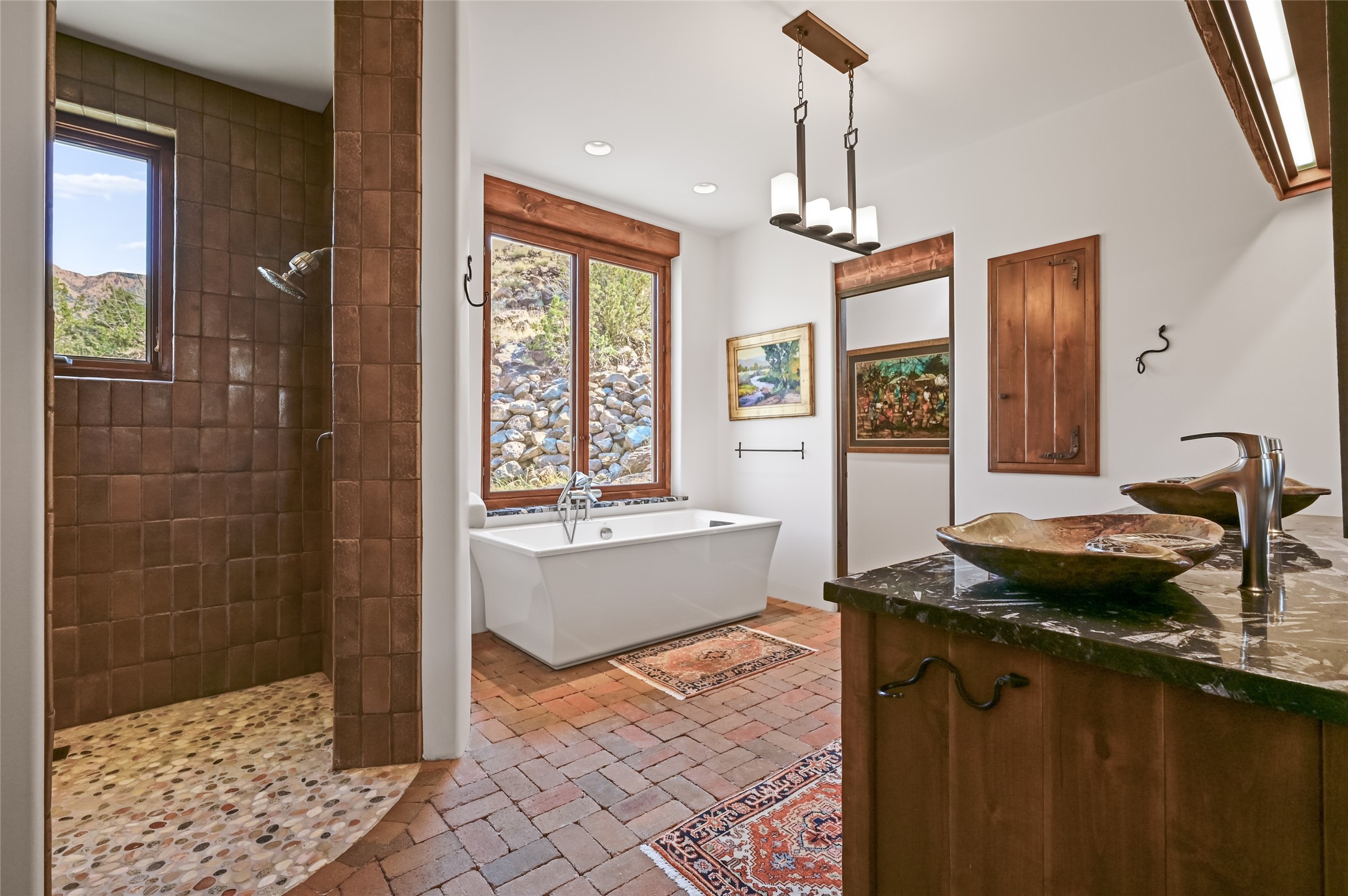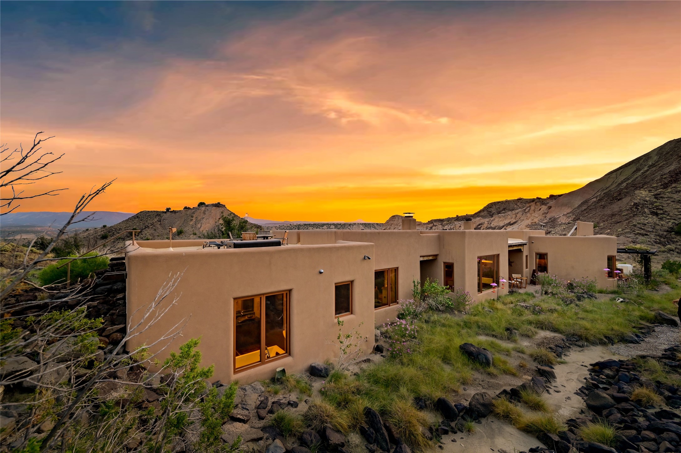 A rare opportunity to own a private wilderness sanctuary, on the market for the first time. This 39-acre self-sustaining refuge, lovingly named Rincn Escondido, "Hidden Corner," is tucked away in the foothills of Sierra Negra and borders Carson National Forest, offering unparalleled privacy just one hour from Santa Fe. Panoramic views of Cerro Pedernal, Sierra Negra, and the Jmez Mountains stretch across rewilded meadows, pollinator gardens, and a tranquil pond with a cascading waterfall.The 4,032 sq ft property combines a 3,059 sq ft residence with a heated garage and storage room, offering an additional 973 sq ft of versatile space. The home blends timeless Southwestern architecture with refined modern finishes, including hand-carved wood doors, artisan detailing, and locally sourced Namb brick floors that flow throughout. Each room is designed to maximize natural light and frame dramatic vistas. A chef's kitchen features a Sub-Zero fridge/freezer, Wolf oven, induction cooktop, and custom craftsmanship, while the spa-inspired primary suite offers a deep soaking tub and walk-in shower.Built for environmental stewardship, the home is fully powered by a grid-tied 20.16 kW photovoltaic system with four Tesla Powerwall 3 batteries and solar-thermal hot water. Passive solar design, radiant in-floor heating and cooling, and high-efficiency systems ensure year-round comfort.Whether a spiritual retreat, sustainable homestead, or luxury escape, this private refuge is more than a home--it is a living sanctuary.Video Link: https://youtu.be/VyCAPihgIhU