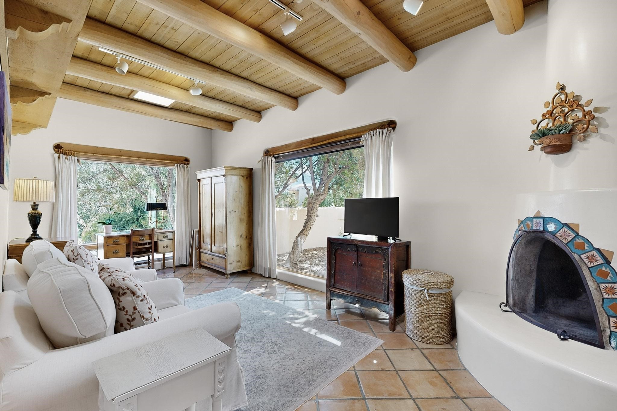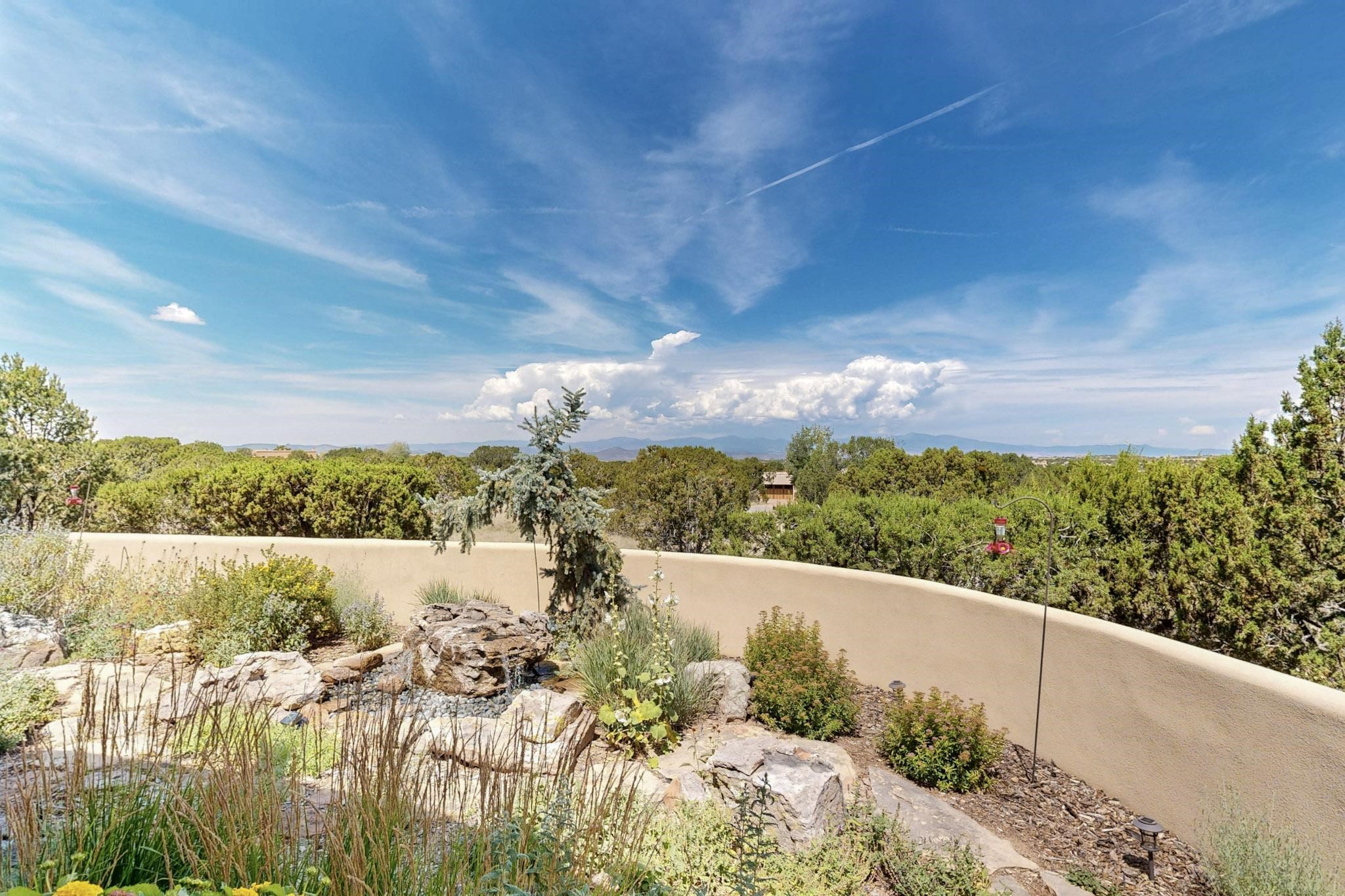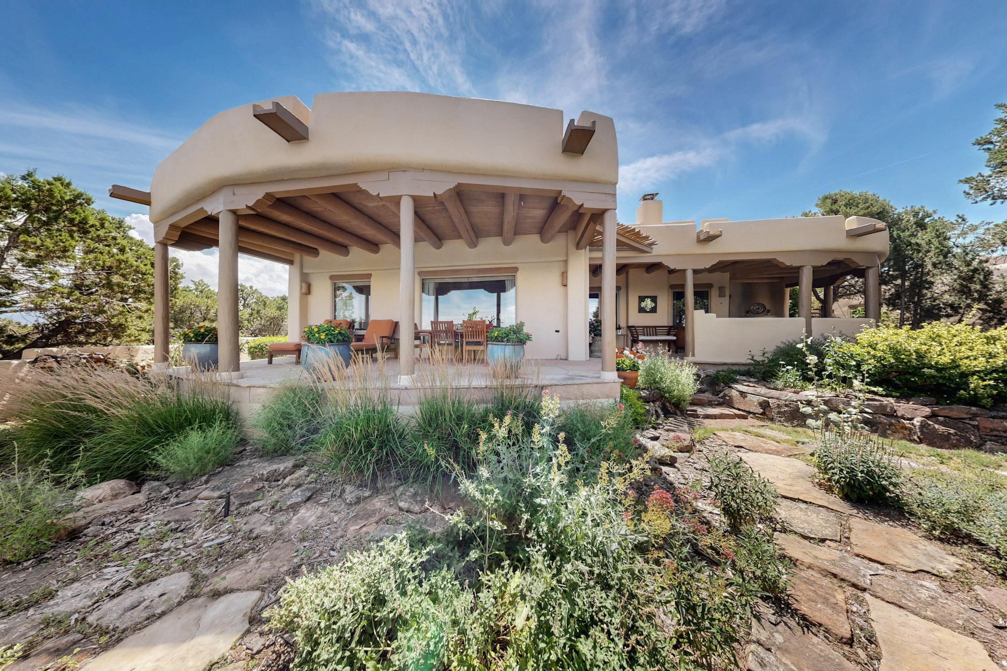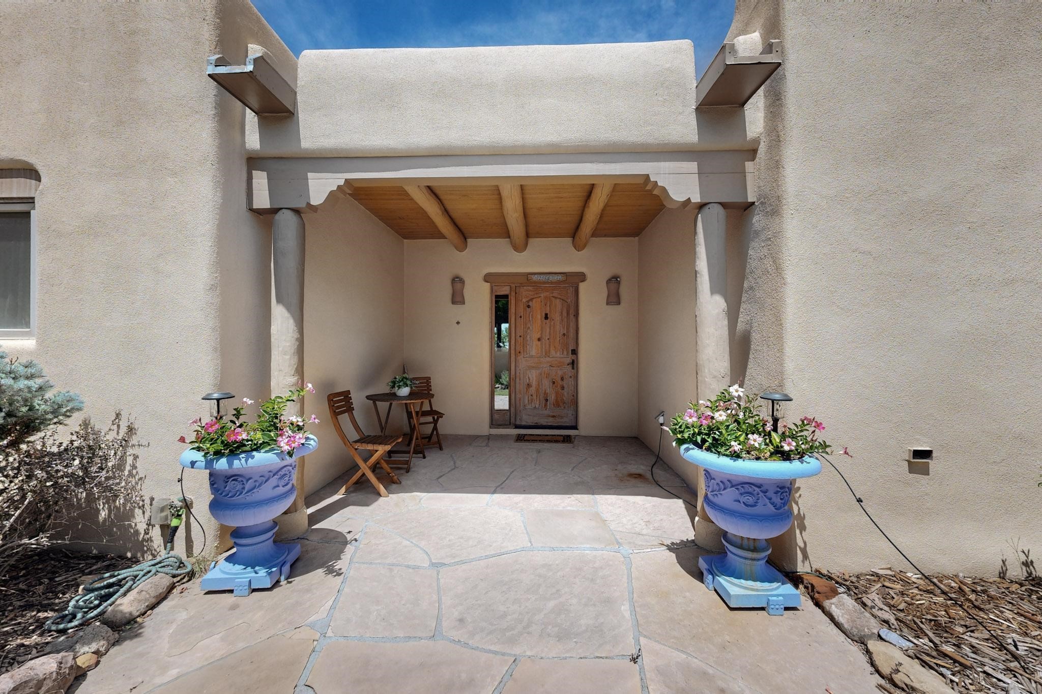 Vast sweeping panoramic western views define this exceptional property. The main house includes a primary bedroom suite with a fireplace, comfortable sitting area and a spa bath for relaxation. Large windows showcase the expansive western vistas, and doors lead to the portal. An additional room serves as either a TV room/office or bedroom and features its own fireplace and stunning views of the Sangres. The open floor plan seamlessly connects the living room, dining room, and kitchen, all centered around the fireplace. A unique and charming casita complements the main residence, equipped with a kitchenette, bath, and a cozy fireplace, making it ideal for guests or extended living. The wraparound portal, featuring a fireplace, showcases sweeping western views, offering the ideal setting to enjoy breathtaking sunsets. Relax to the soothing sounds of the stone fountain and enjoy watching the birds and butterflies in the fragrant colorful garden. A large patio area including a built-in grill, features additional space for relaxing and entertaining. The rooftop deck offers spectacular 360-degree views and the gated and walled property offers privacy.