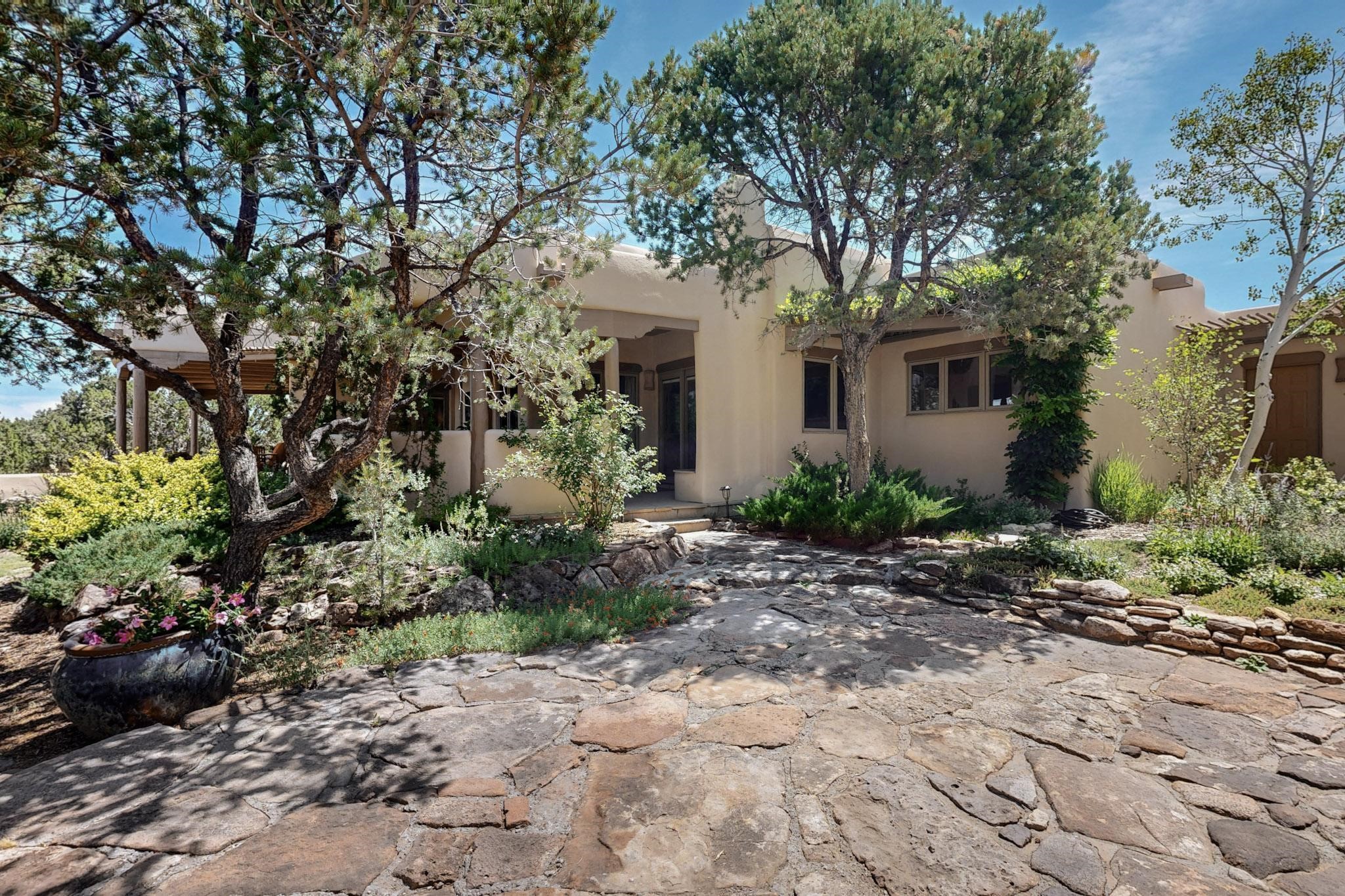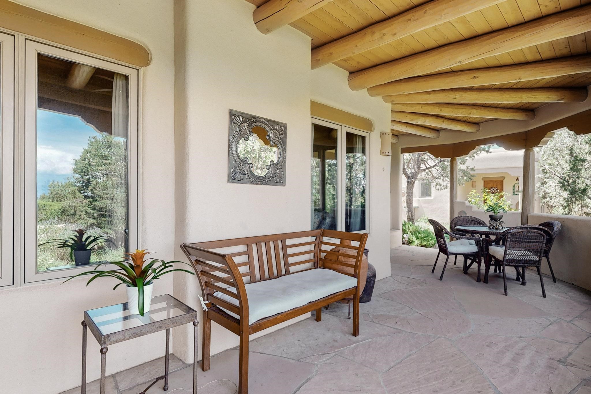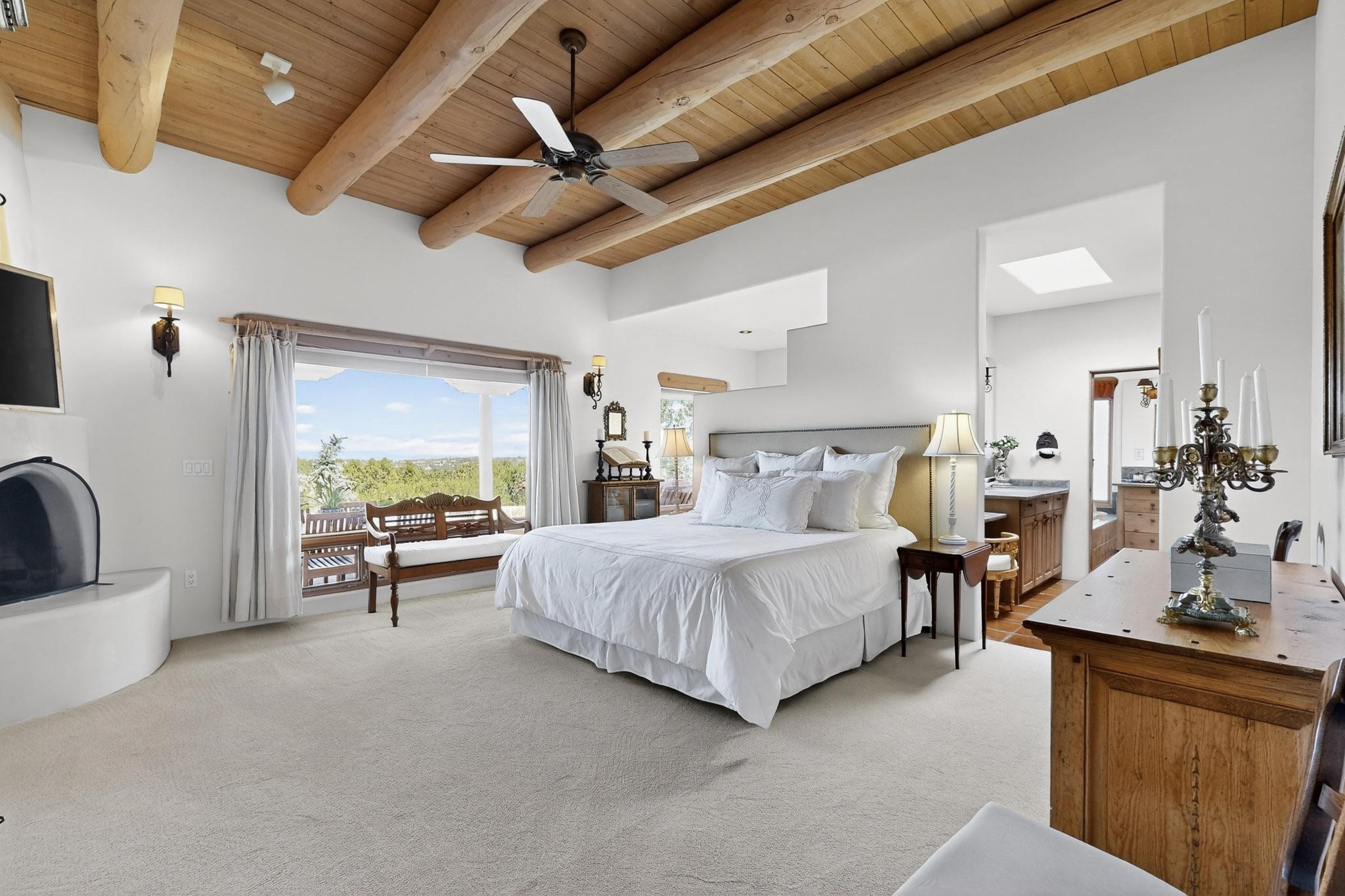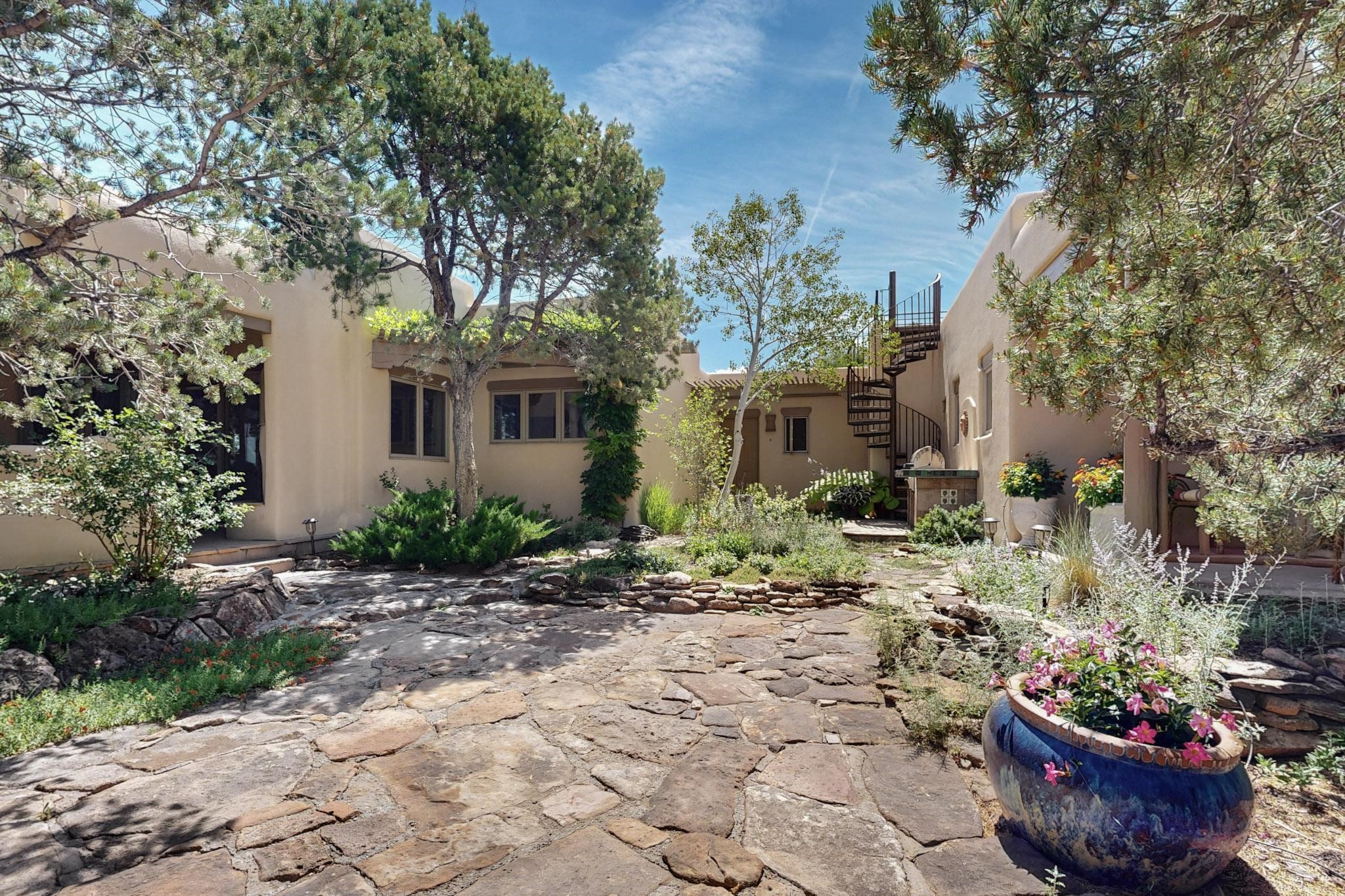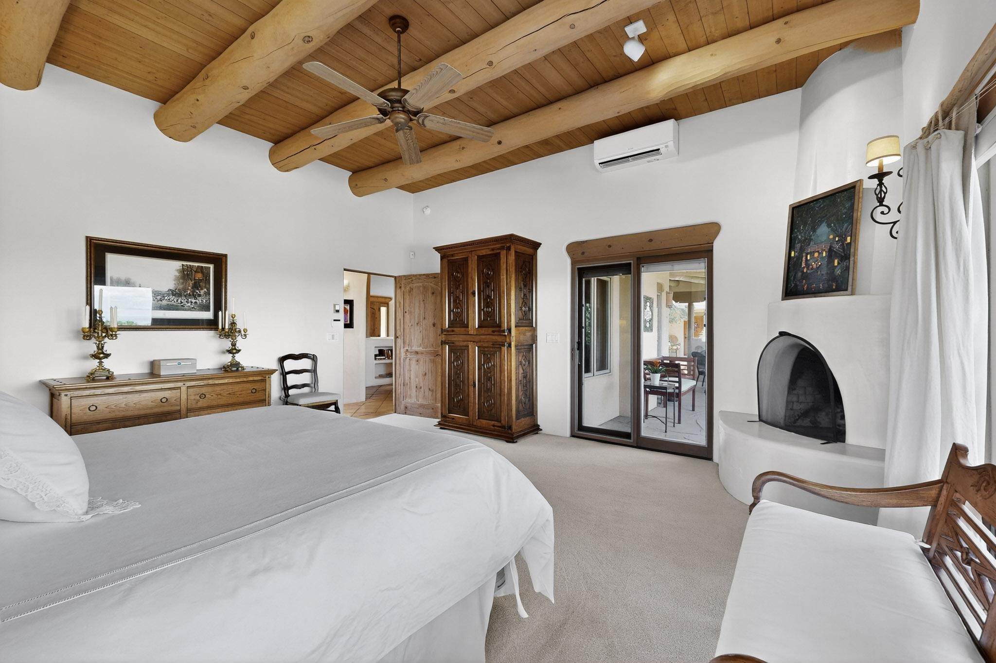 Vast sweeping panoramic western views define this exceptional property. The main house includes a primary bedroom suite with a fireplace, comfortable sitting area and a spa bath for relaxation. Large windows showcase the expansive western vistas, and doors lead to the portal. An additional room serves as either a TV room/office or bedroom and features its own fireplace and stunning views of the Sangres. The open floor plan seamlessly connects the living room, dining room, and kitchen, all centered around the fireplace. A unique and charming casita complements the main residence, equipped with a kitchenette, bath, and a cozy fireplace, making it ideal for guests or extended living. The wraparound portal, featuring a fireplace, showcases sweeping western views, offering the ideal setting to enjoy breathtaking sunsets. Relax to the soothing sounds of the stone fountain and enjoy watching the birds and butterflies in the fragrant colorful garden. A large patio area including a built-in grill, features additional space for relaxing and entertaining. The rooftop deck offers spectacular 360-degree views and the gated and walled property offers privacy.