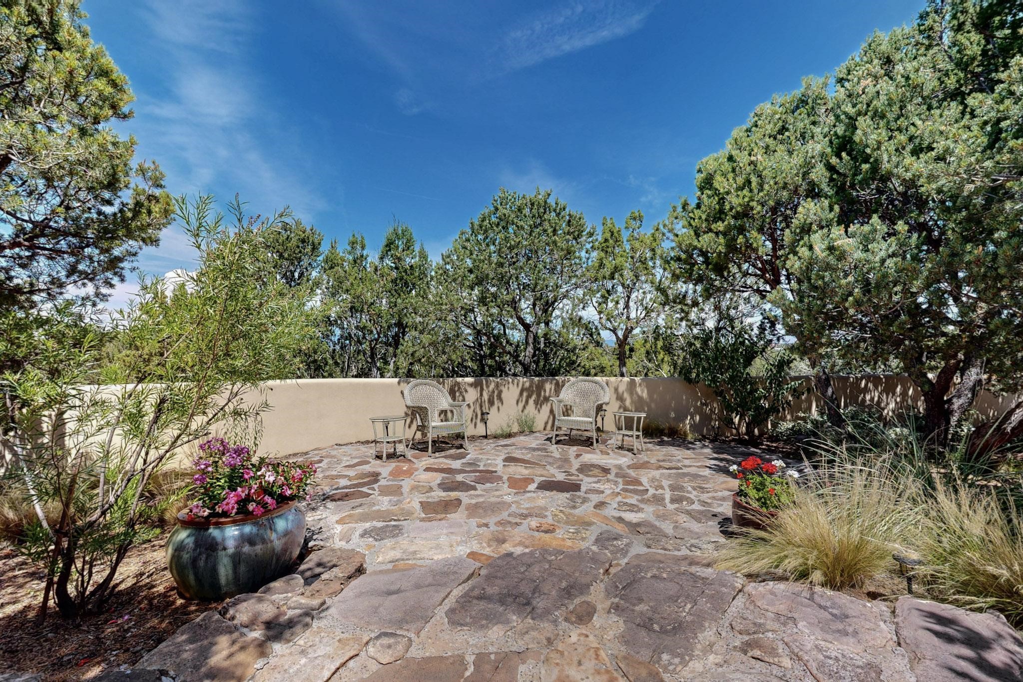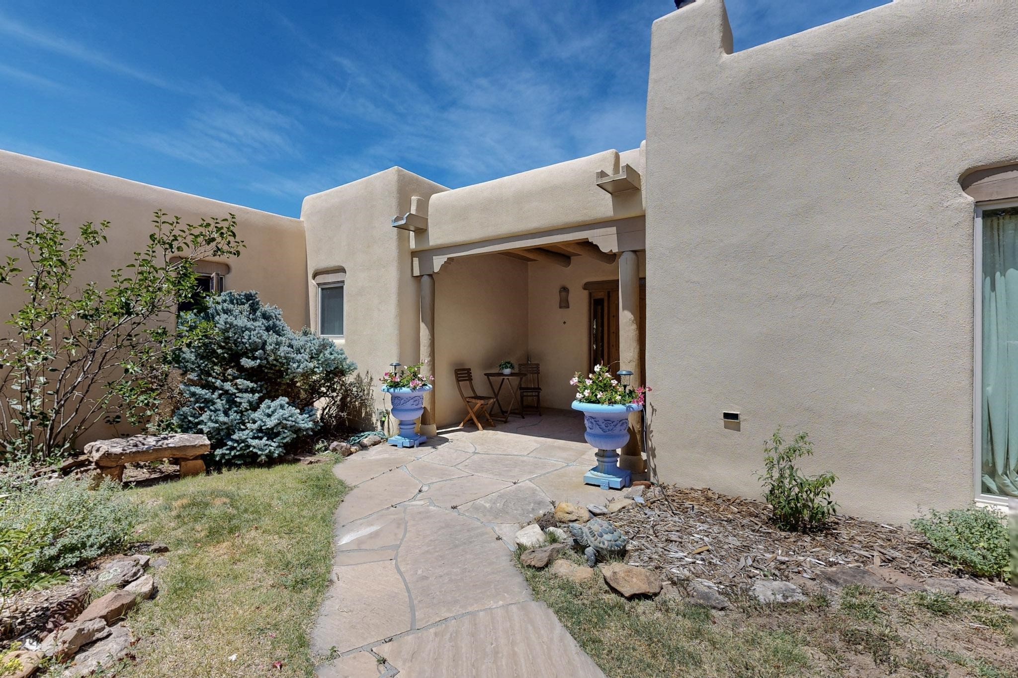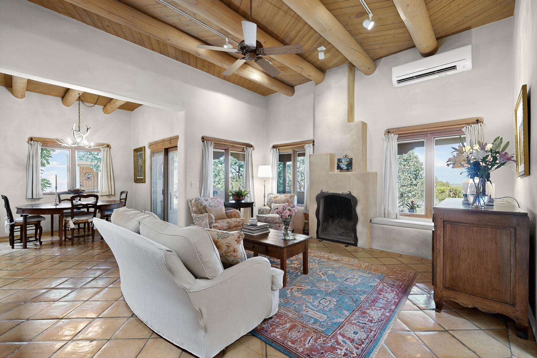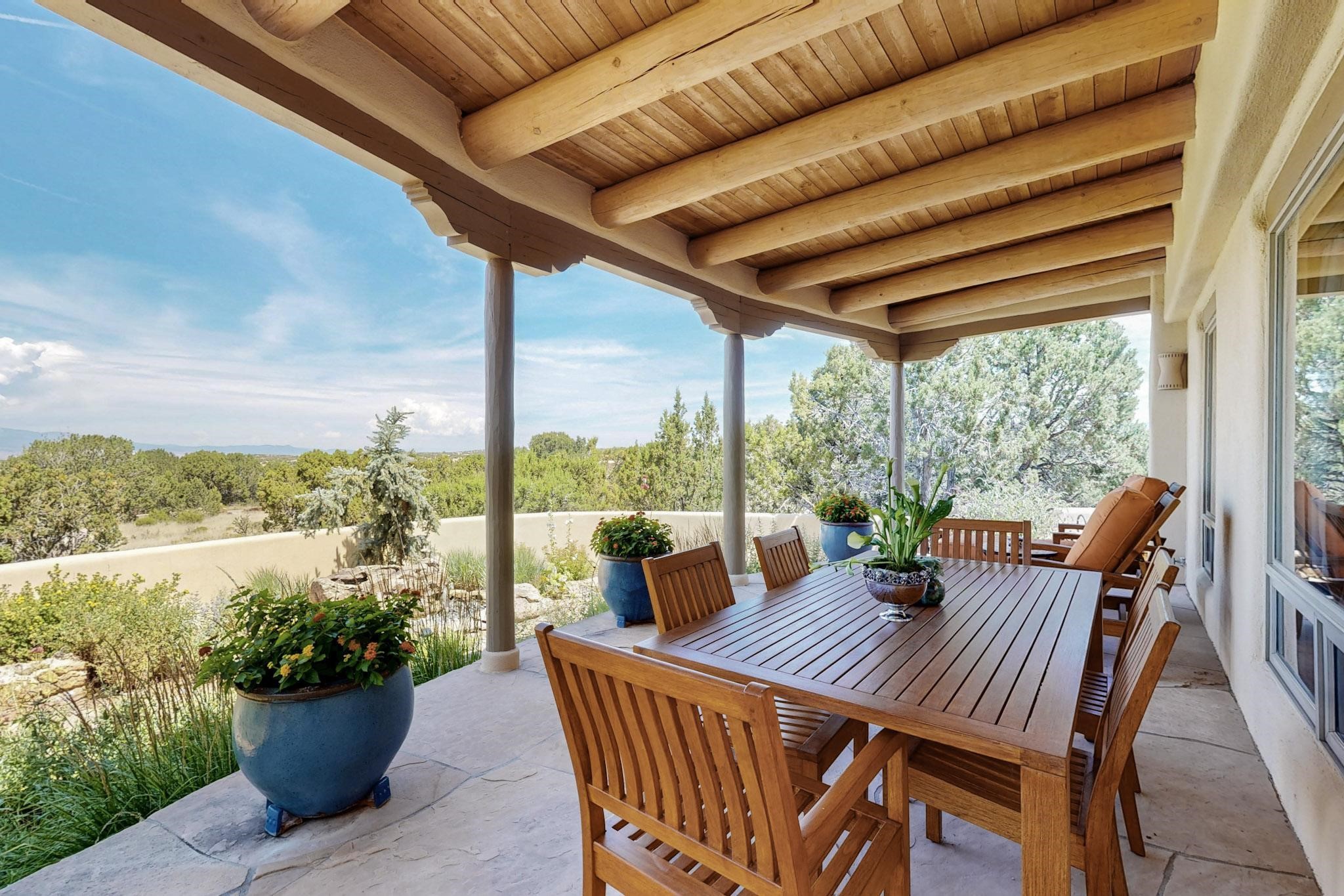 Vast sweeping panoramic western views define this exceptional property. The main house includes a primary bedroom suite with a fireplace, comfortable sitting area and a spa bath for relaxation. Large windows showcase the expansive western vistas, and doors lead to the portal. An additional room serves as either a TV room/office or bedroom and features its own fireplace and stunning views of the Sangres. The open floor plan seamlessly connects the living room, dining room, and kitchen, all centered around the fireplace. A unique and charming casita complements the main residence, equipped with a kitchenette, bath, and a cozy fireplace, making it ideal for guests or extended living. The wraparound portal, featuring a fireplace, showcases sweeping western views, offering the ideal setting to enjoy breathtaking sunsets. Relax to the soothing sounds of the stone fountain and enjoy watching the birds and butterflies in the fragrant colorful garden. A large patio area including a built-in grill, features additional space for relaxing and entertaining. The rooftop deck offers spectacular 360-degree views and the gated and walled property offers privacy.