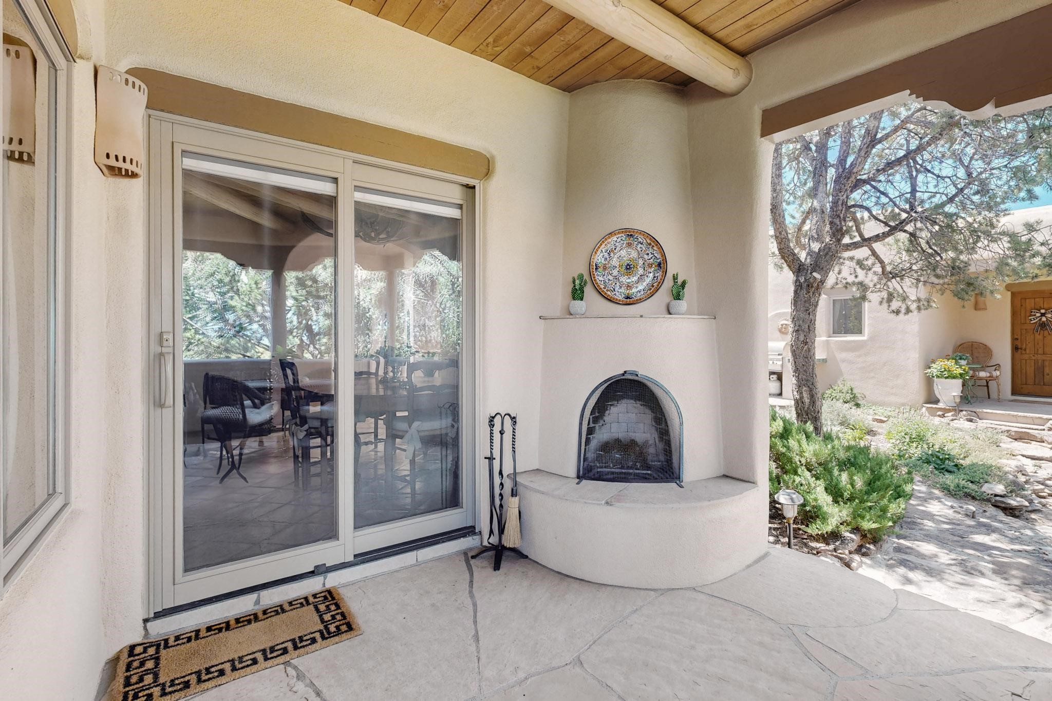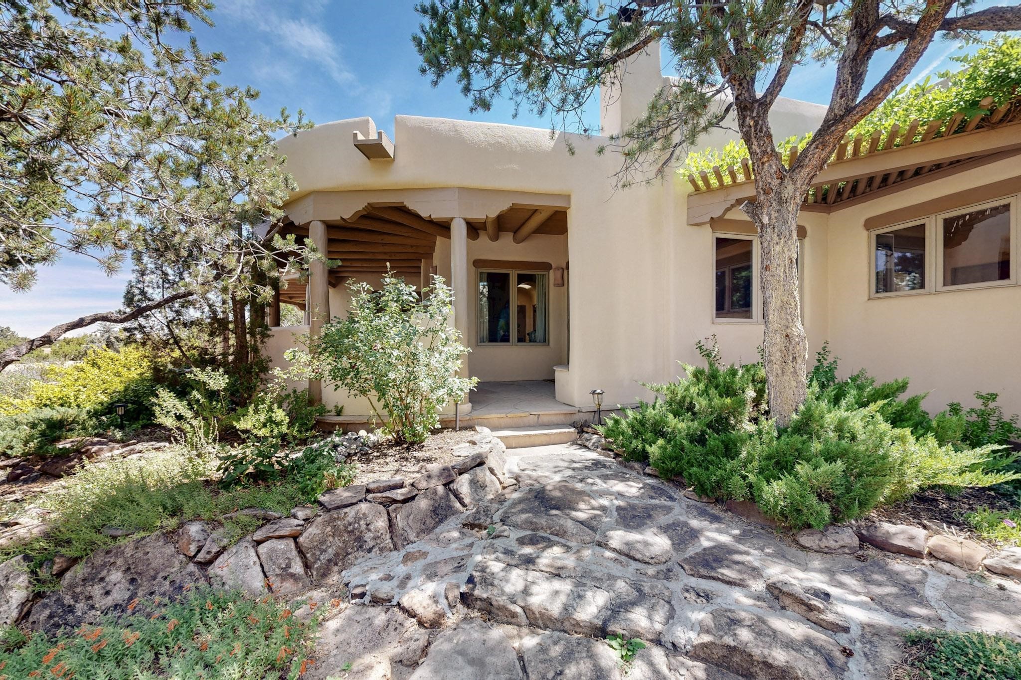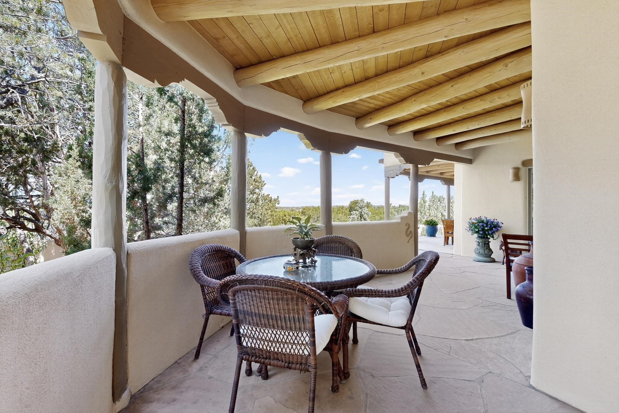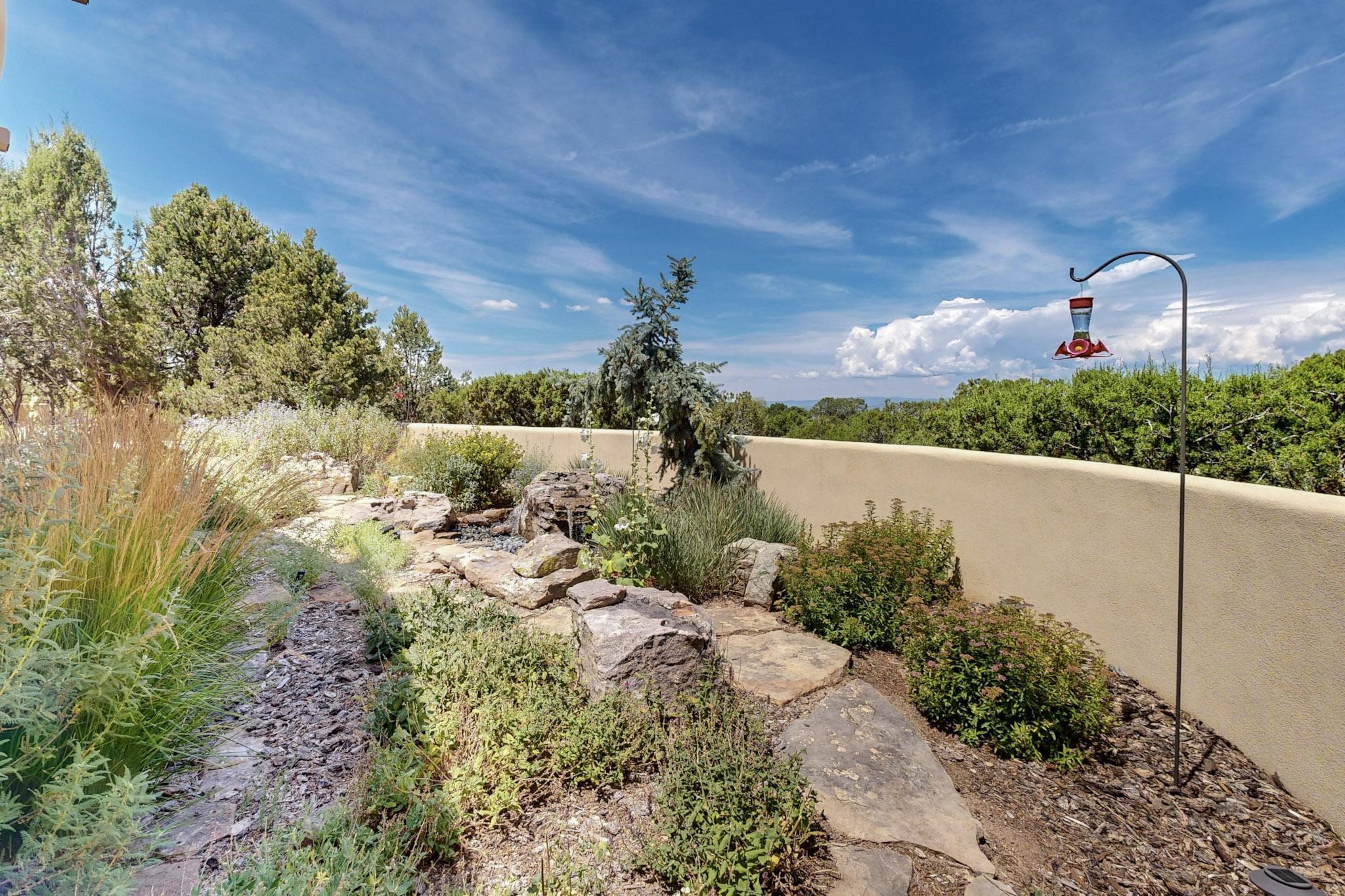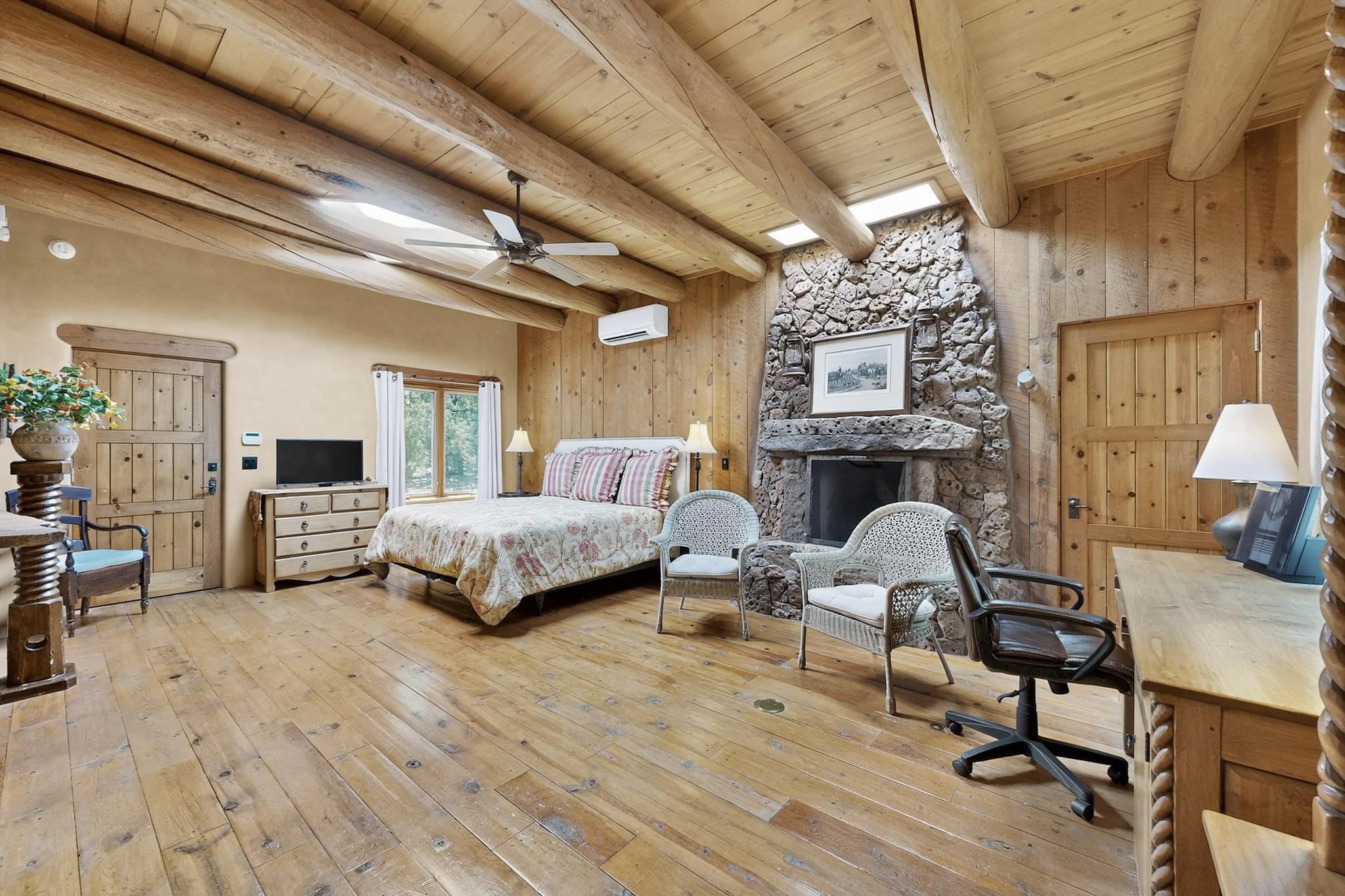 Vast sweeping panoramic western views define this exceptional property. The main house includes a primary bedroom suite with a fireplace, comfortable sitting area and a spa bath for relaxation. Large windows showcase the expansive western vistas, and doors lead to the portal. An additional room serves as either a TV room/office or bedroom and features its own fireplace and stunning views of the Sangres. The open floor plan seamlessly connects the living room, dining room, and kitchen, all centered around the fireplace. A unique and charming casita complements the main residence, equipped with a kitchenette, bath, and a cozy fireplace, making it ideal for guests or extended living. The wraparound portal, featuring a fireplace, showcases sweeping western views, offering the ideal setting to enjoy breathtaking sunsets. Relax to the soothing sounds of the stone fountain and enjoy watching the birds and butterflies in the fragrant colorful garden. A large patio area including a built-in grill, features additional space for relaxing and entertaining. The rooftop deck offers spectacular 360-degree views and the gated and walled property offers privacy.