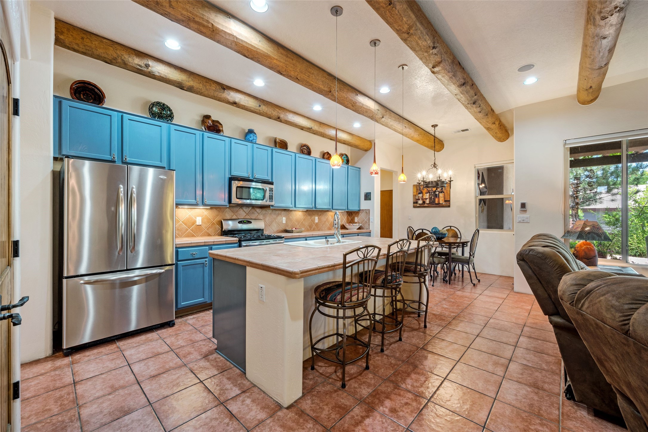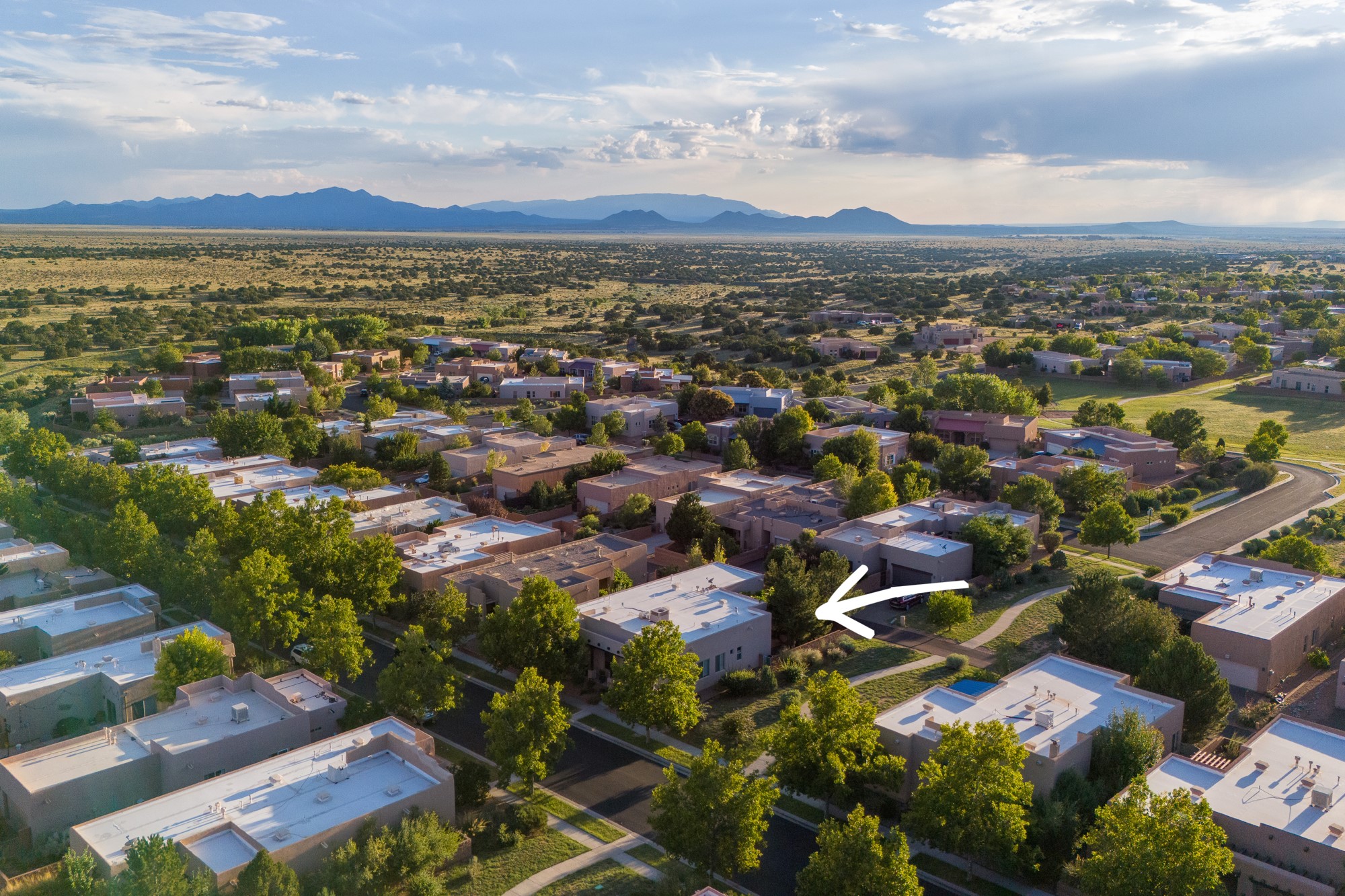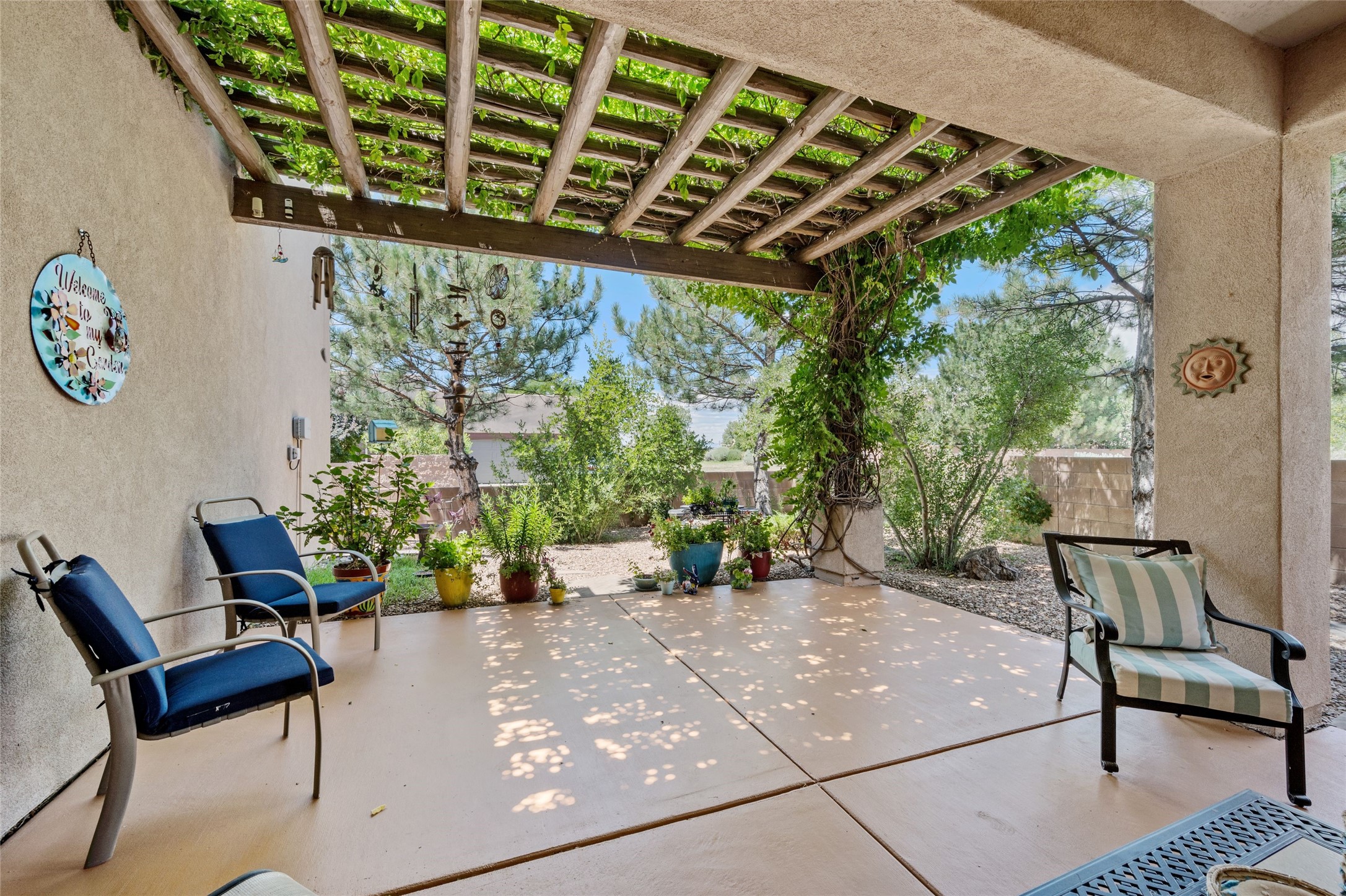 Exceptional 3-Bedroom, 2-Bath Home - Truchas Floor PlanBeautifully maintained and thoughtfully upgraded, this home showcases over $140K in enhancements completed prior to 2009 along with timeless design details. The Truchas Floor Plan is a popular single-level, split-bedroom layout designed for both privacy and flow--featuring an open central living space flanked by a secluded primary suite on one side and two guest bedrooms on the other.The private primary suite includes custom lighting, window treatments, and professional closet organizers. Architectural highlights include viga & beam ceilings, solid alder doors, a gas kiva fireplace, and insulated windows.The gourmet kitchen is equipped with stainless steel Maytag appliances--including a built-in microwave--plus a large sink, a 'Good Water' filtration system and softener, and abundant storage. The open living area includes built-in surround sound for the television system, ideal for entertaining. Year-round comfort is ensured with radiant heating, refrigerated air, and all-tile flooring.Additional features include an extended insulated garage and beautifully landscaped grounds with irrigation system, an extended covered portal for outdoor living, and security system with motion activated lights. Dryer replaced in 2022. Energy Star-rated for efficiency, with exceptional quality.Located next to a green space walkway to a children's park within Rancho Viejo, a master-planned Santa Fe community known for its scenic open spaces, village-style design, and over 12 miles of walking trails, this home offers both a peaceful setting and convenient access to shopping, schools, parks, and downtown Santa Fe.