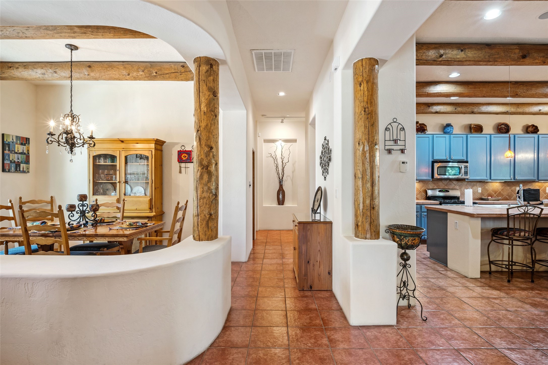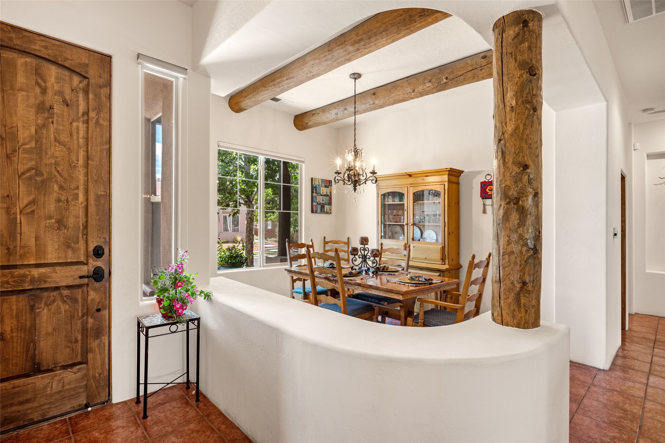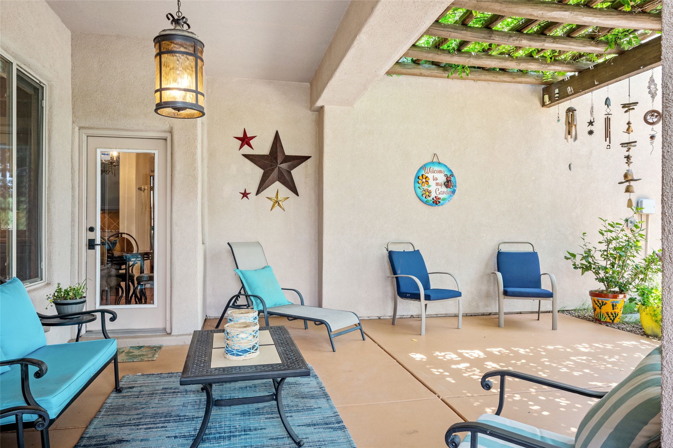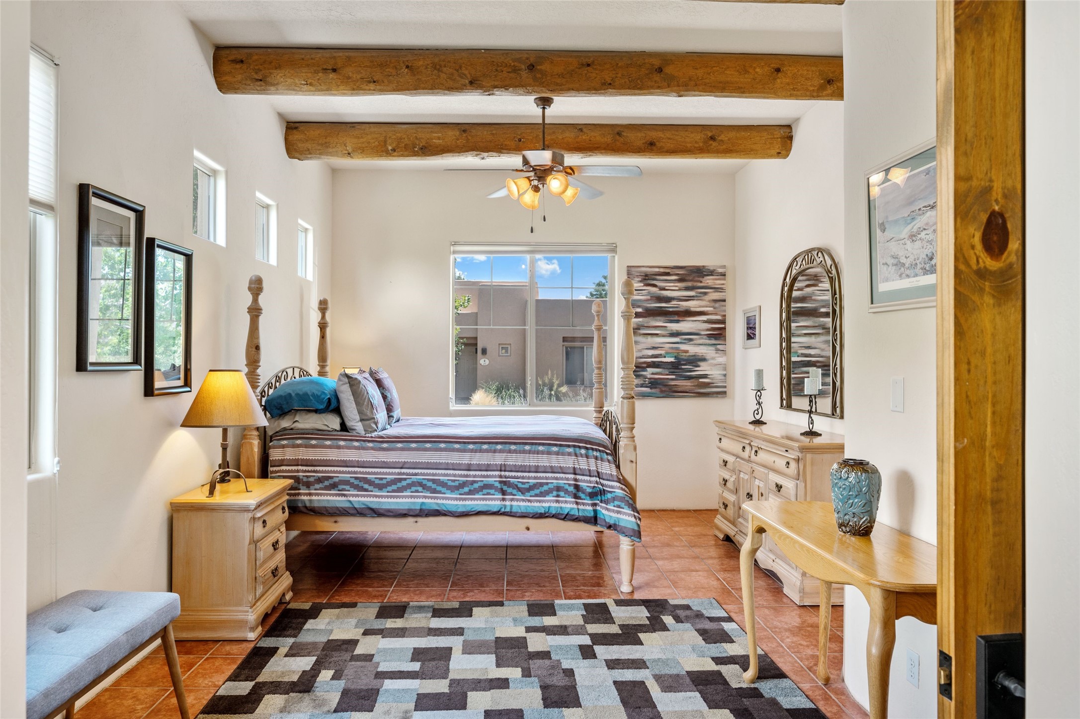 Exceptional 3-Bedroom, 2-Bath Home - Truchas Floor PlanBeautifully maintained and thoughtfully upgraded, this home showcases over $140K in enhancements completed prior to 2009 along with timeless design details. The Truchas Floor Plan is a popular single-level, split-bedroom layout designed for both privacy and flow--featuring an open central living space flanked by a secluded primary suite on one side and two guest bedrooms on the other.The private primary suite includes custom lighting, window treatments, and professional closet organizers. Architectural highlights include viga & beam ceilings, solid alder doors, a gas kiva fireplace, and insulated windows.The gourmet kitchen is equipped with stainless steel Maytag appliances--including a built-in microwave--plus a large sink, a 'Good Water' filtration system and softener, and abundant storage. The open living area includes built-in surround sound for the television system, ideal for entertaining. Year-round comfort is ensured with radiant heating, refrigerated air, and all-tile flooring.Additional features include an extended insulated garage and beautifully landscaped grounds with irrigation system, an extended covered portal for outdoor living, and security system with motion activated lights. Dryer replaced in 2022. Energy Star-rated for efficiency, with exceptional quality.Located next to a green space walkway to a children's park within Rancho Viejo, a master-planned Santa Fe community known for its scenic open spaces, village-style design, and over 12 miles of walking trails, this home offers both a peaceful setting and convenient access to shopping, schools, parks, and downtown Santa Fe.