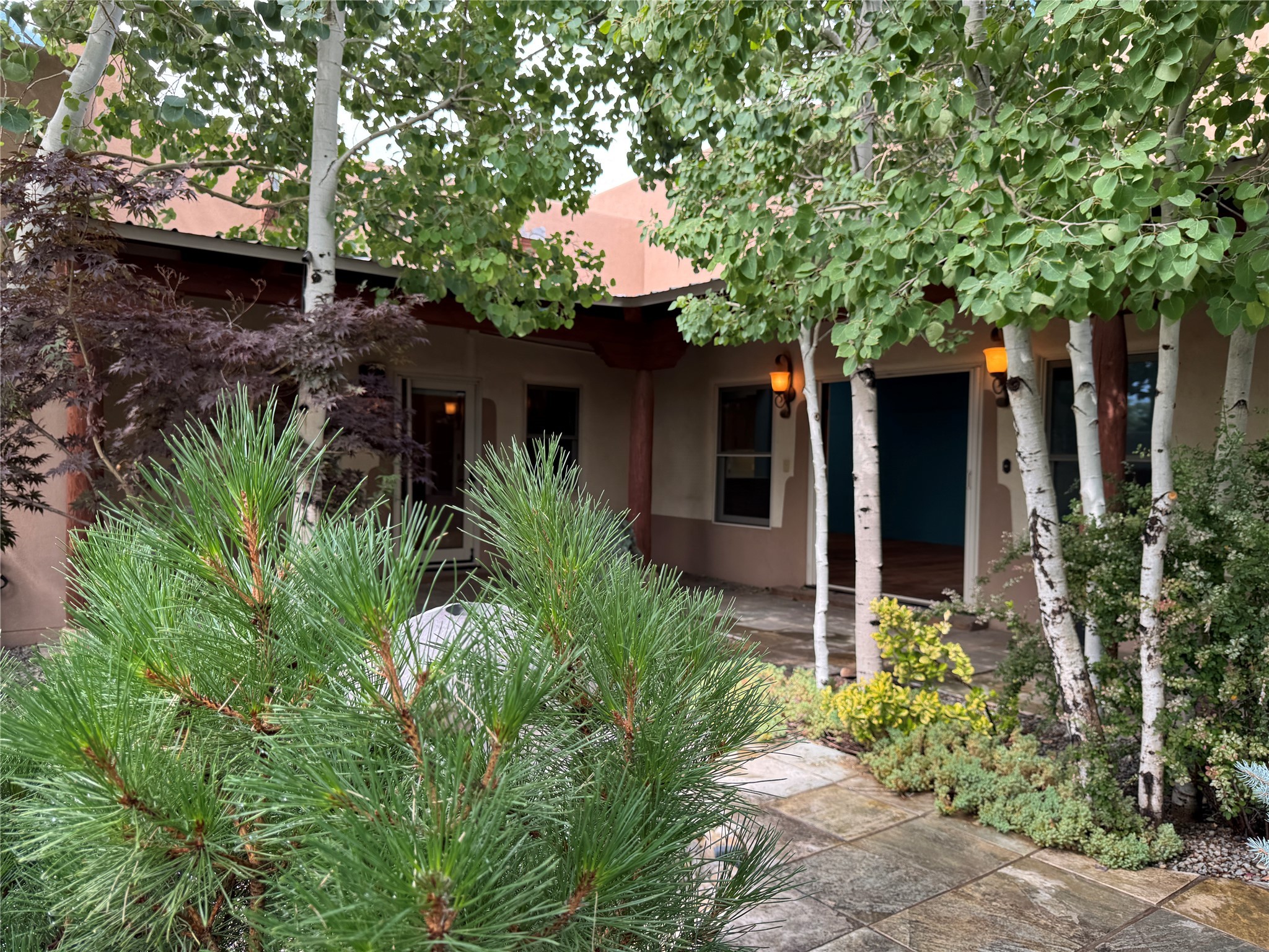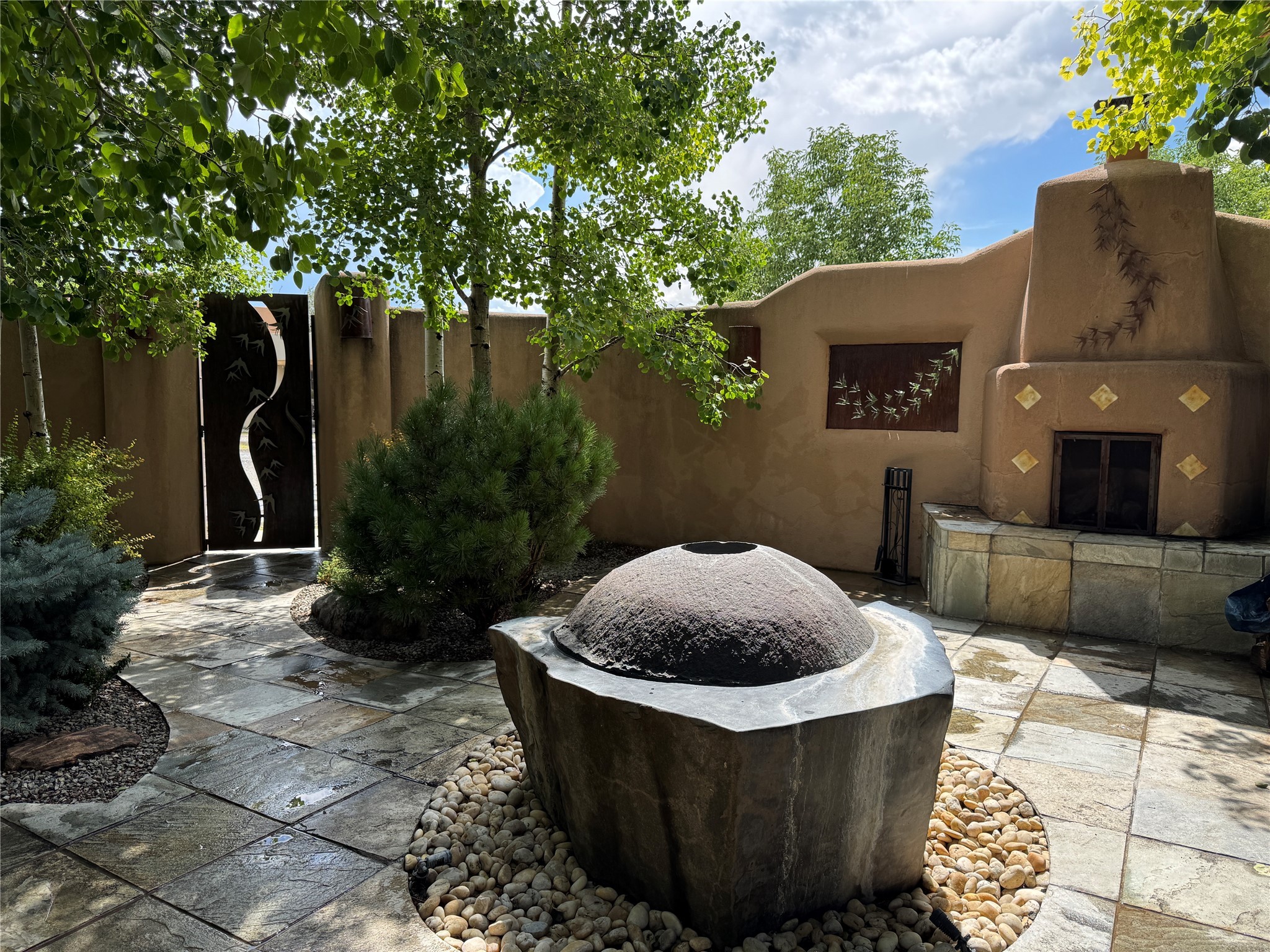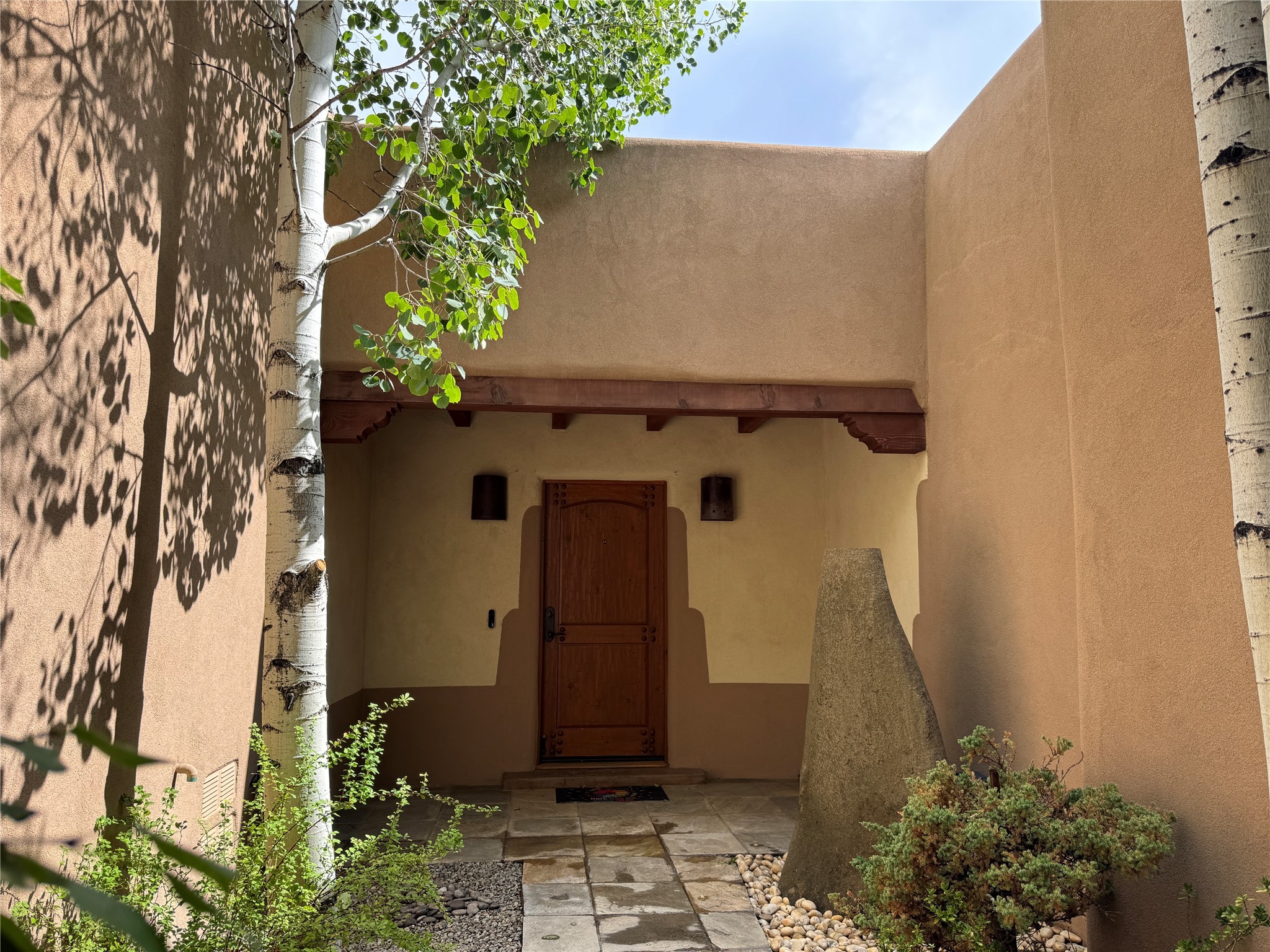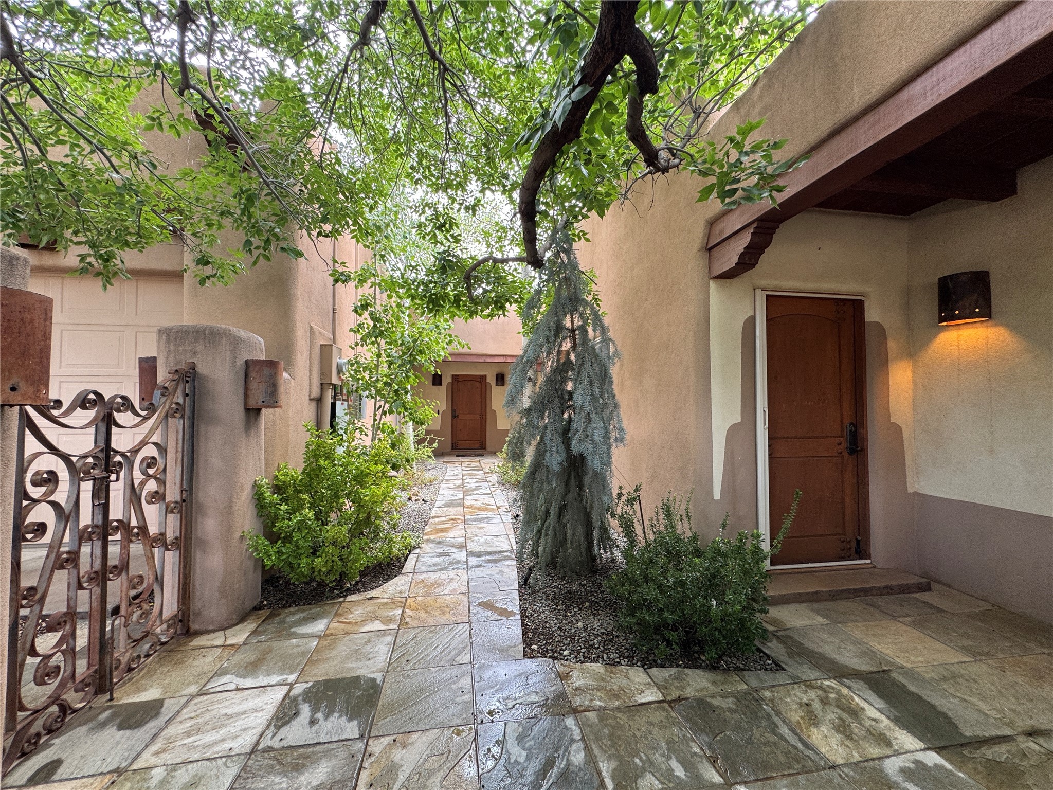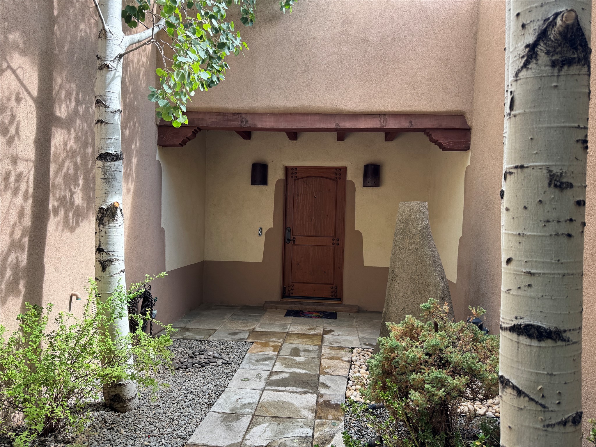 Check out the magical courtyards in the coveted Oshara Village community home featuring abundant natural light and open concept living. The main house has 2 bedrooms and 2 bathrooms. High ceilings with skylights bring the outdoors in and large traditional southwestern vigas remind you that you are in the Southwest. The beautifully remodeled chef's kitchen features a KitchenAid gas stove and oven alongside a Samsung smart refrigerator. The spacious living room has gallery lighting throughout, perfect for your art collection. The wood burning kiva creates a quintessential Santa Fe ambiance with hand chiseled solid wood doors, top of the line window shades, stone tile are found throughout this dreamy home. Enjoy the privacy of room separation from guests with the second bedroom having its own entrance via the courtyard. At the end of the day relax in your Jason Hydrotherapy tub in a spa-like main bathroom with a Japanese smart heated toilet. The walk-in closet is ready for your wardrobe for all four seasons. Other features include miniSplit cooling and heating, tankless water heater, $50K Solar Panel system (paid off), and 2 car garage with finished floor including 2 Tesla generator batteries and an electric charging station, ready for your green vehicle. Natural landscaping with mature aspen trees, gorgeous water features, and outdoor fireplace create your own oasis for entertaining or sipping that first cup of coffee/tea in the morning, listening to the birds in one of the most beautiful courtyards in Santa Fe. This property also includes a 30 sf heated casita/guest house with a separate entrance featuring a mini kitchen with Wolf burners , mini fridge and a kitchen sink. Two minutes and you are at Pantry Dos Restaurant and a few minutes drive to the Community College, Genoveva Chavez Center, stores, grocery stores, cafes, restaurants and much more. Come experience 3 Craftsman Road, your private oasis in the desert awaits!