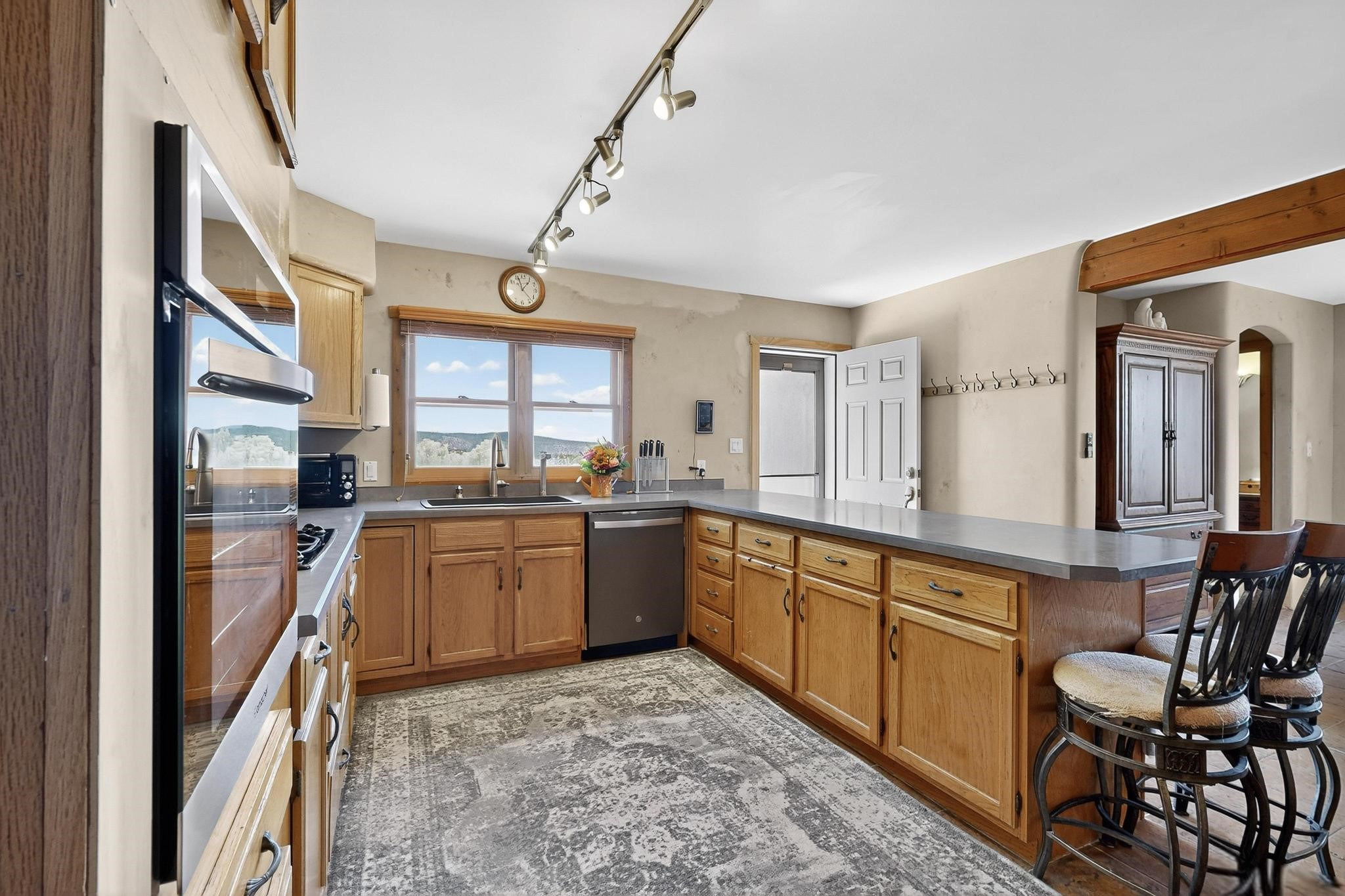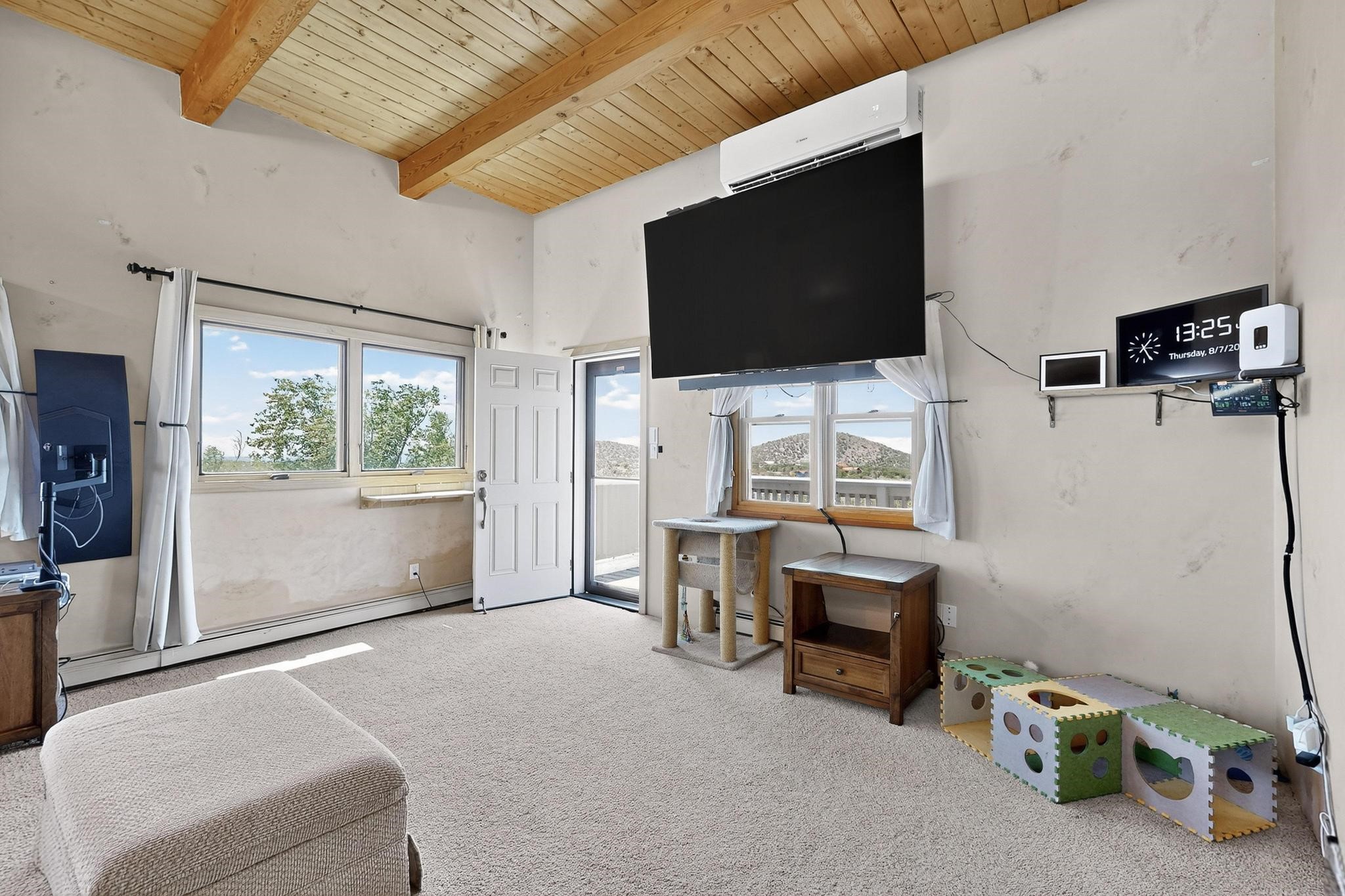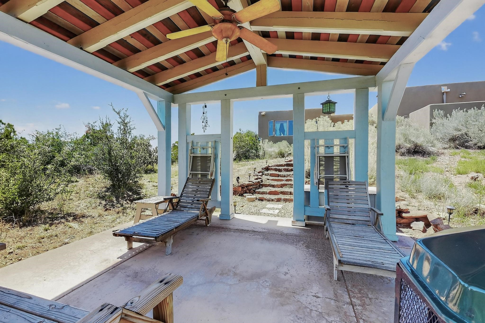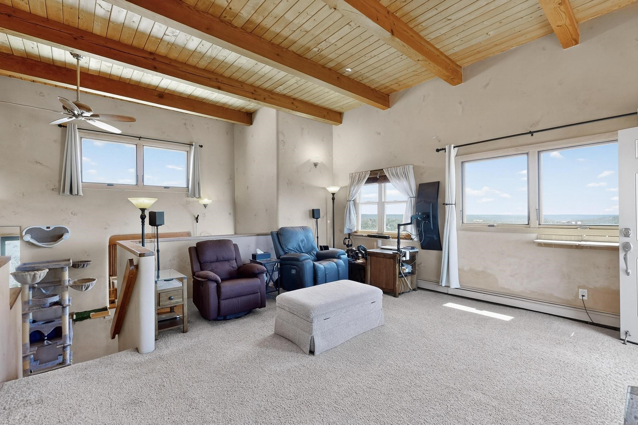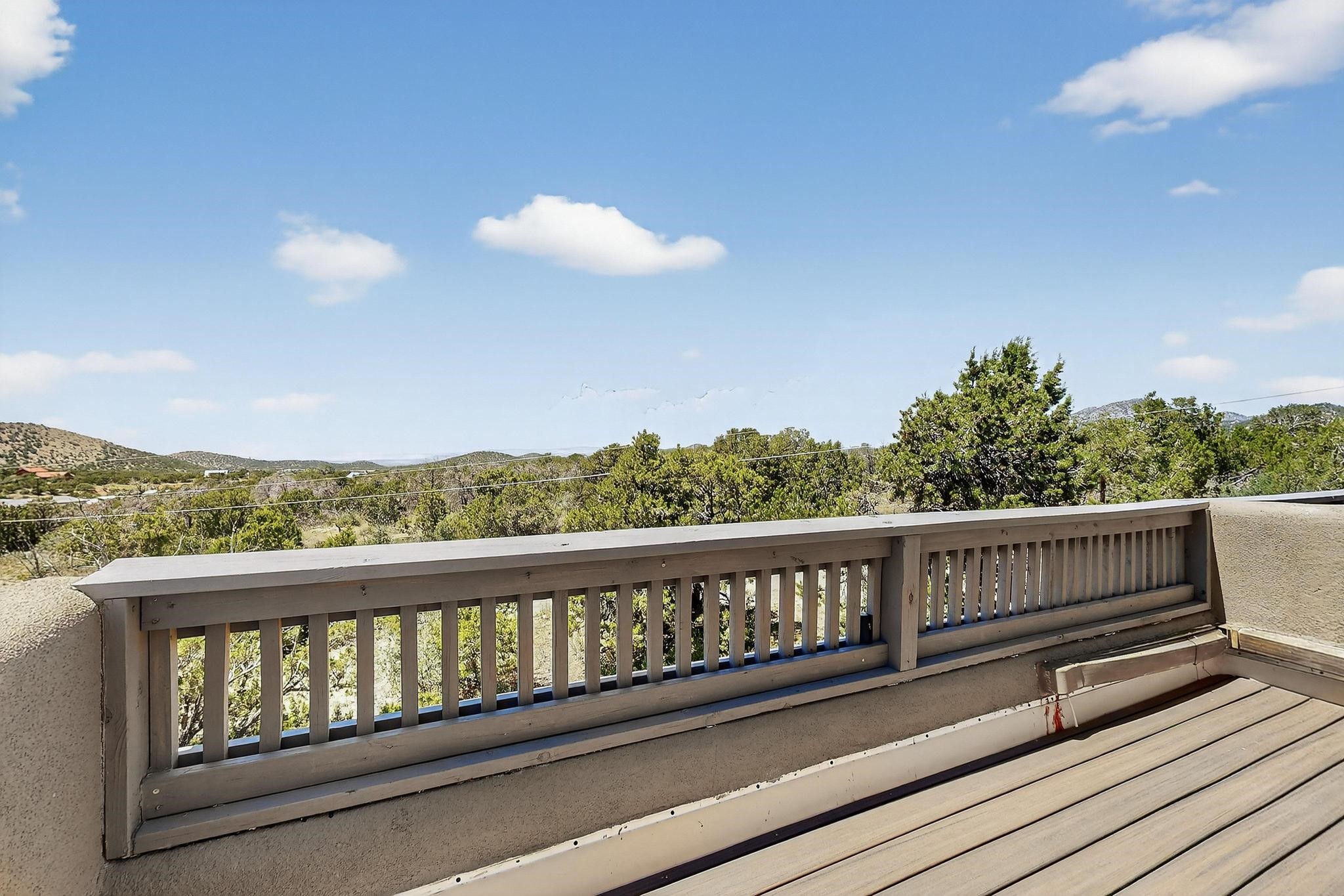 Priced to Sell! Wonderful passive solar trilevel design nestled on a hilltop with decks and a lighted gazebo enjoy the sweeping Sangre's and Pecos mountain views. A flexible floorpan with the owners suite, kitchen, dining and living areas on the main level. A TV / family room, and an office upstairs with a view deck. A walk out lower level includesl 2 guest bedrooms, a full bath and laundry. The 36' x 29' heated garage also has a workshop and storage room. In 2023 the stucco and roof were replaced, 3 Bosch mini splits added, a new tankless hot water heater, plus new windows and storm doors. 2 trex/wood decks, rain downspouts and the kitchen appliances. In 2024 the well pump was replaced, and there is a 1500 gallon underground cistern. The underground 500 gallon propane tank is owned, the hot tub is ready with fabulous views. All this on 5 acres, No HOA, horses and chickens welcome, only minutes to Eldorado area local shopping and services, or into historic Santa Fe.