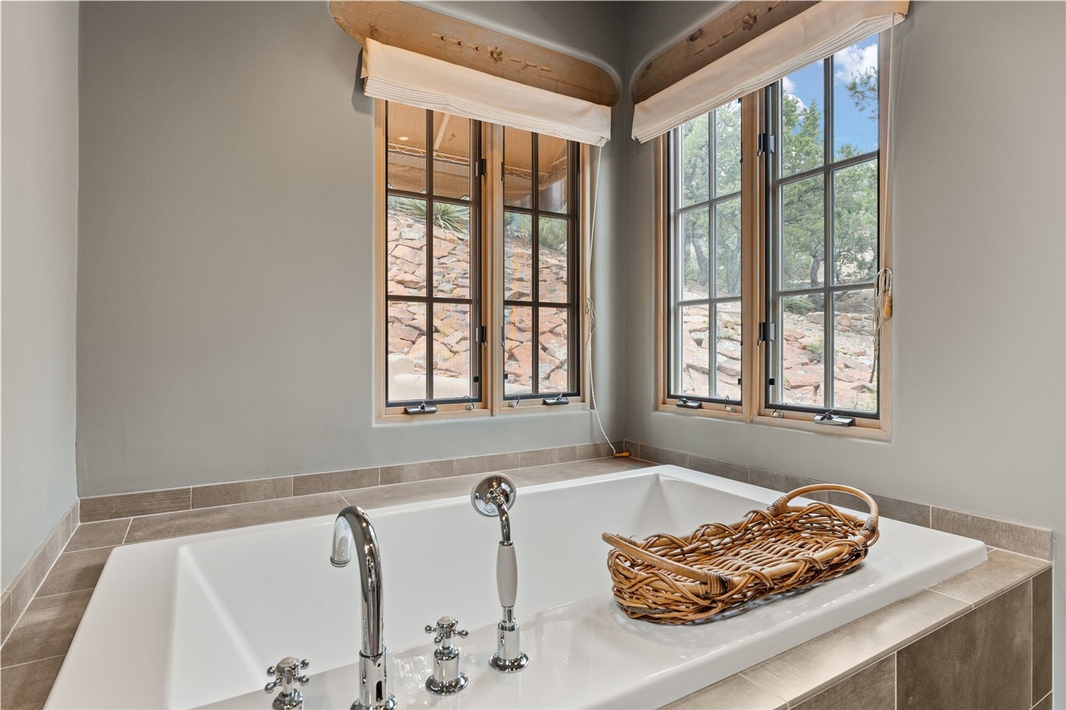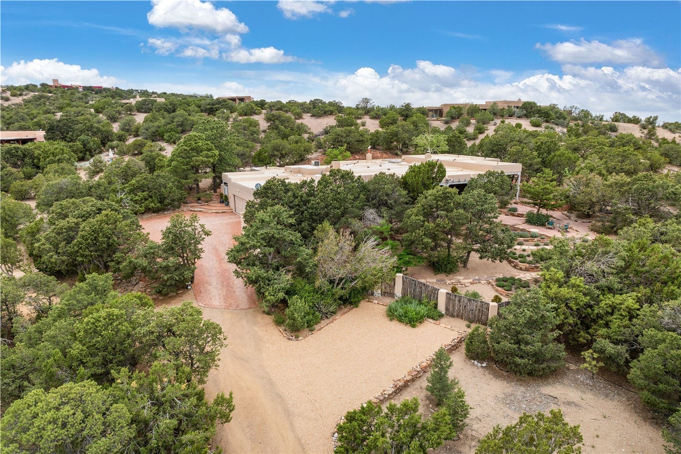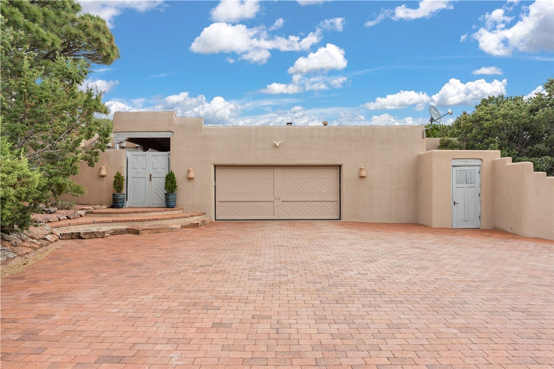 Gated Sangre de Cristo Estates 3 bedroom, 3.5 bath, single level, custom-built home with spectacular Sangre de Cristo Mountain views. Quality design features throughout include high ceilings, spacious rooms, vigas and beams, wood and brick floors, diamond finish plaster walls and arched doorways. Many recent improvements such as new (2023) membrane roof, completely renovated kitchen and baths, and brick driveways. Light and airy living room with stately fireplace. Spacious gourmet kitchen with high-end Bosch appliances, center island with Wolf gas range top, plentiful cabinetry and an informal breakfast room. Dining room with French doors and built in cabinetry. Dedicated personal library with a wood burning kiva fireplace and French doors to the outside in addition to a second living area or media room. There are 3-bedroom suites set apart from one another. Primary suite includes a kiva fireplace, sitting area and a wall of doors to the outside. Bonus flex space can be a personal gym or office. 2-car attached garage. The deep portals provide space for large events or leisurely relaxation in a secluded setting among mature pions and aspens, established landscaping, and sweeping mountain views. Conveniently located with easy access to 84/285 and only minutes away from the Santa Fe Opera and the historic downtown Plaza.