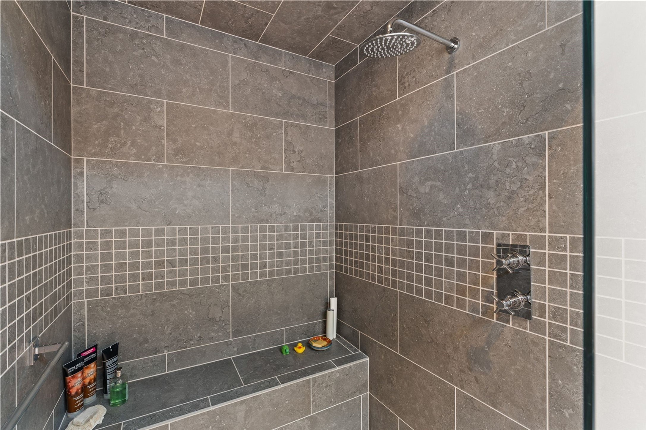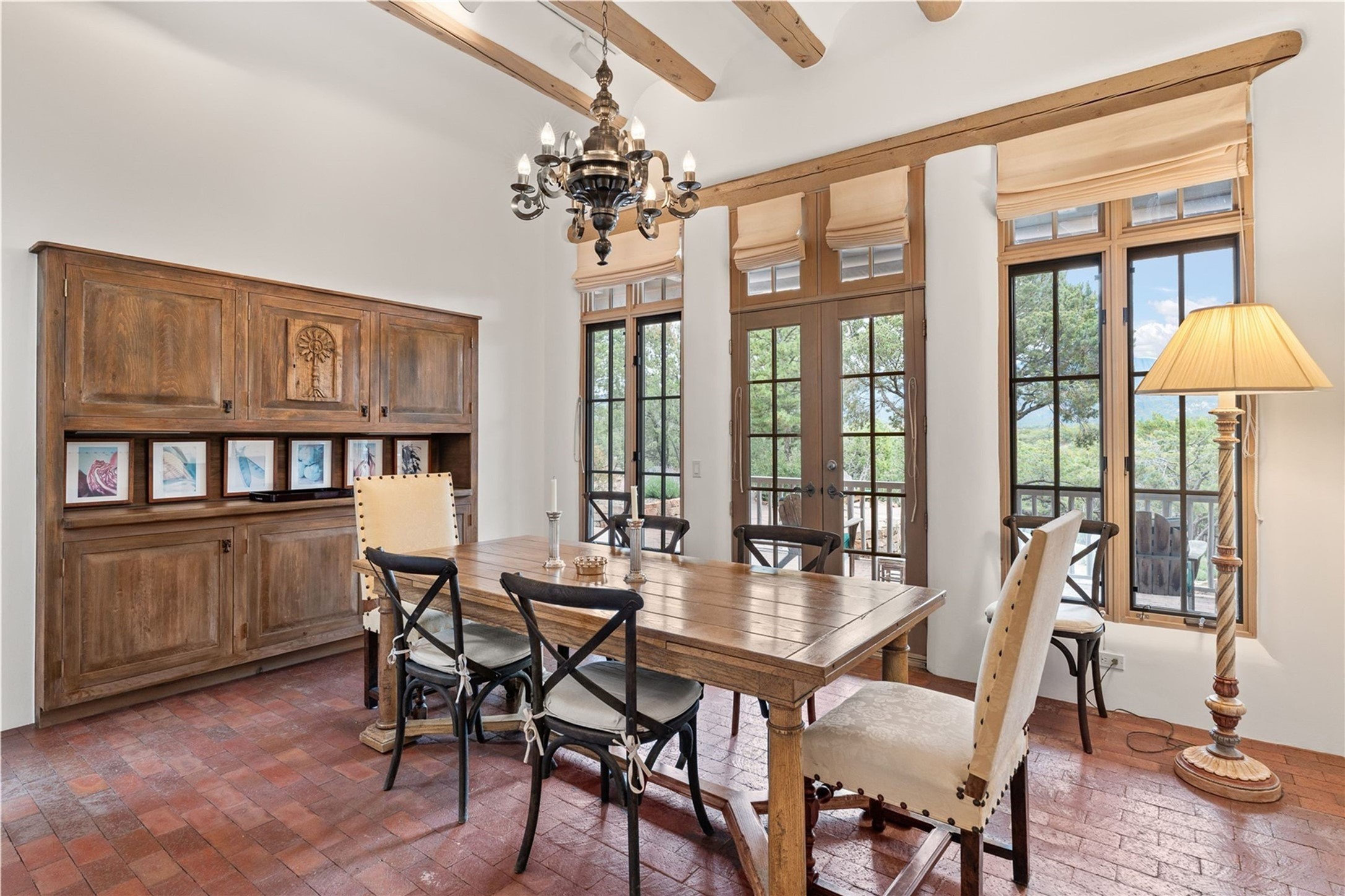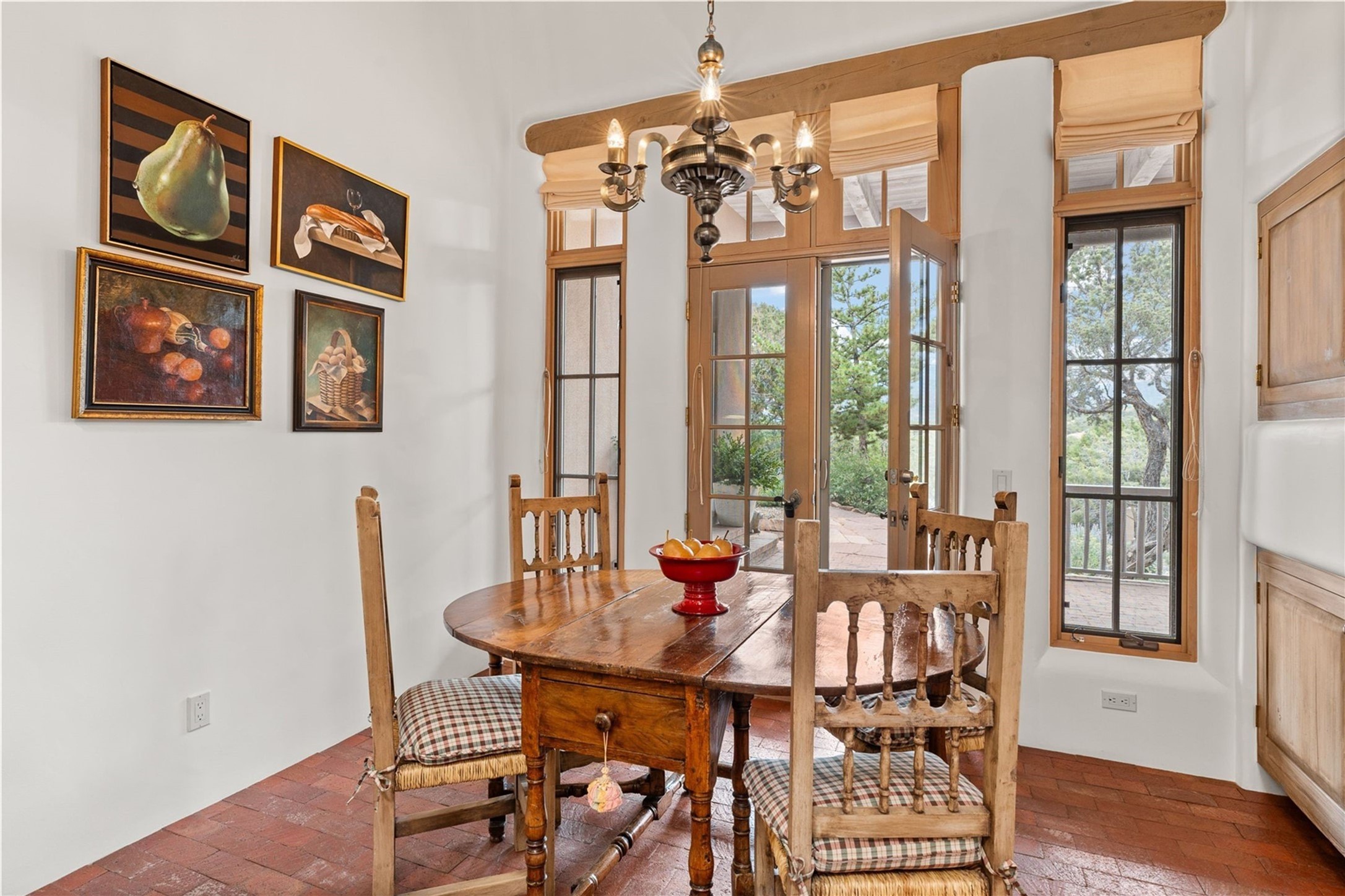 Gated Sangre de Cristo Estates 3 bedroom, 3.5 bath, single level, custom-built home with spectacular Sangre de Cristo Mountain views. Quality design features throughout include high ceilings, spacious rooms, vigas and beams, wood and brick floors, diamond finish plaster walls and arched doorways. Many recent improvements such as new (2023) membrane roof, completely renovated kitchen and baths, and brick driveways. Light and airy living room with stately fireplace. Spacious gourmet kitchen with high-end Bosch appliances, center island with Wolf gas range top, plentiful cabinetry and an informal breakfast room. Dining room with French doors and built in cabinetry. Dedicated personal library with a wood burning kiva fireplace and French doors to the outside in addition to a second living area or media room. There are 3-bedroom suites set apart from one another. Primary suite includes a kiva fireplace, sitting area and a wall of doors to the outside. Bonus flex space can be a personal gym or office. 2-car attached garage. The deep portals provide space for large events or leisurely relaxation in a secluded setting among mature pions and aspens, established landscaping, and sweeping mountain views. Conveniently located with easy access to 84/285 and only minutes away from the Santa Fe Opera and the historic downtown Plaza.