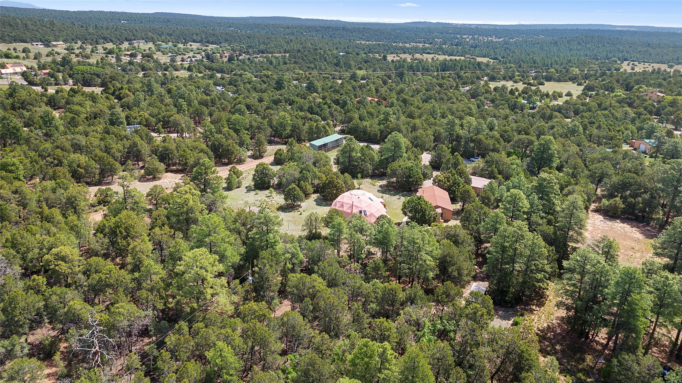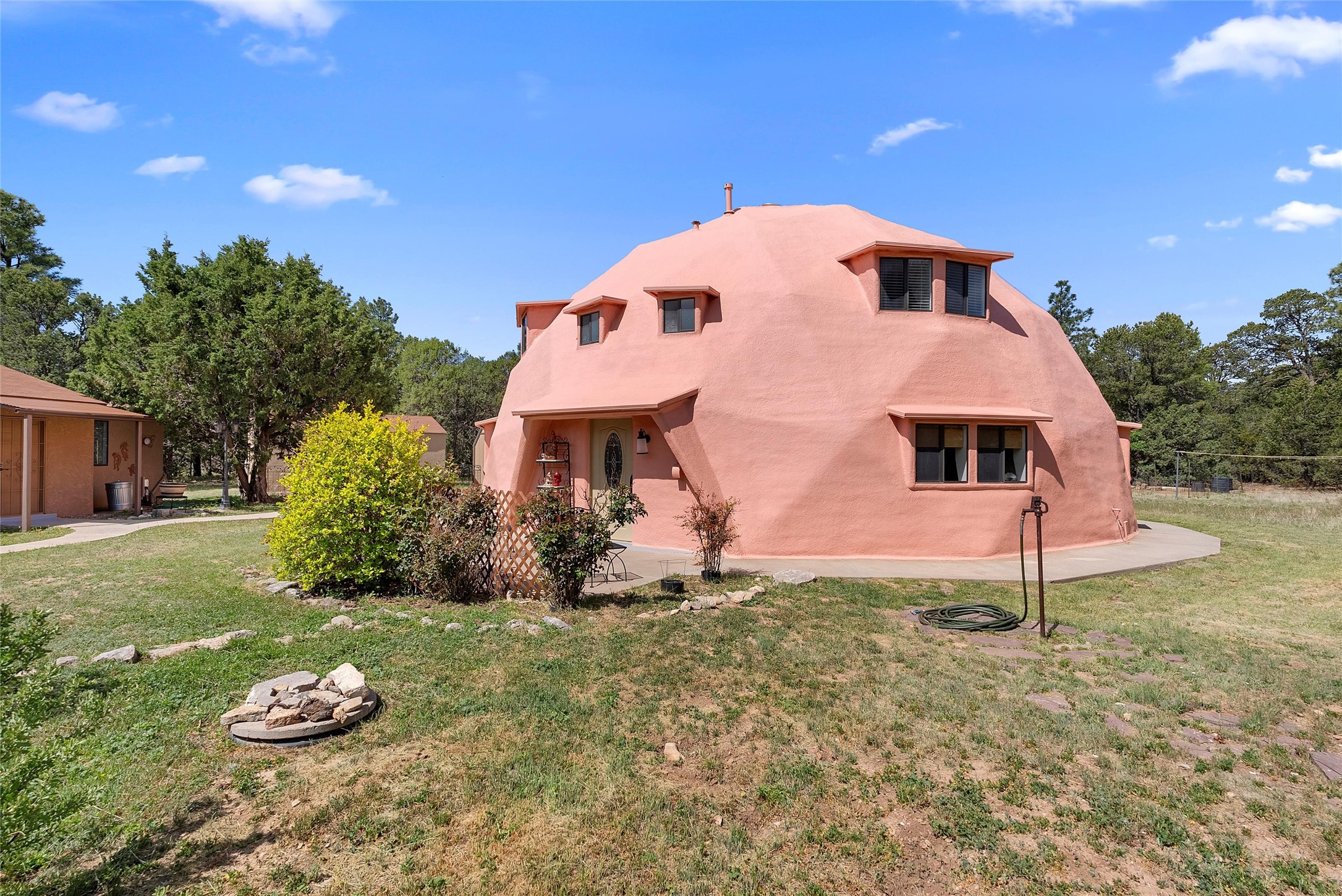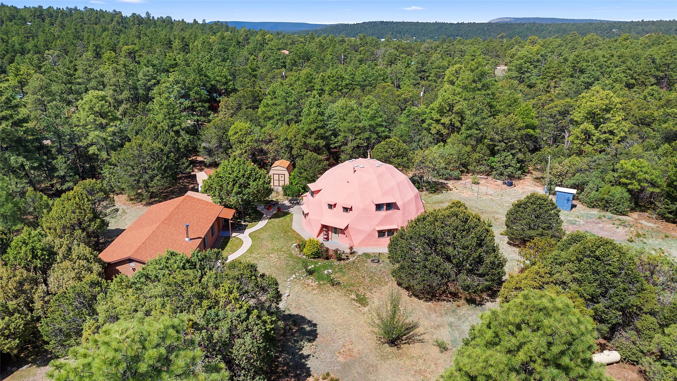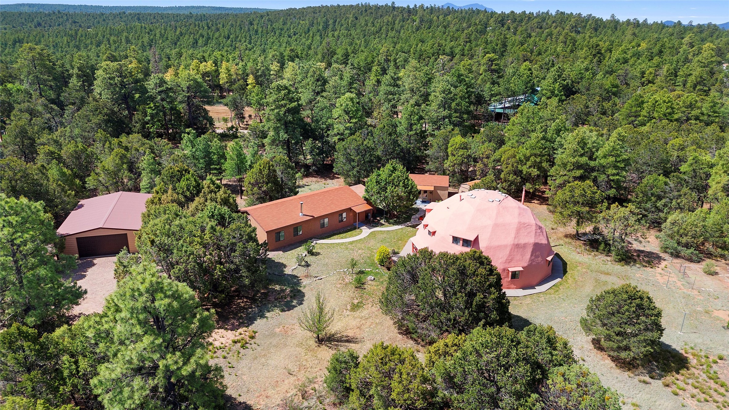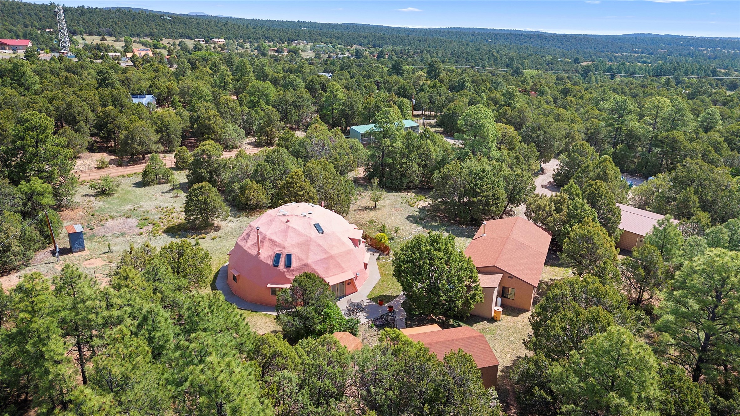UNLIKE ANYTHING ELSE IN THE EAST MOUNTAINS, THIS EXPANSIVE TIJERAS HORSE PROPERTY IS A WORLD OF ITS OWN. Tucked into over four wooded and meadowed acres, it offers a rare blend of space, privacy, and versatility with three distinct residences. The 2-story dome house features exposed beams, tile floors, two fireplaces, and a charming country kitchen. Imagine sitting out on the open patio with 360 degrees of nature. The cozy casita is a perfect studio or guest house, while the spacious cottage--with its open layout, concrete floors, wood stove, and walk-in closet--adds even more flexibility for multi-generational living. A pole barn, detached garage, workshop, plenty of room of animals and toys. Furniture and tools convey--bring your vision and make this one your perfect mountain retreat!