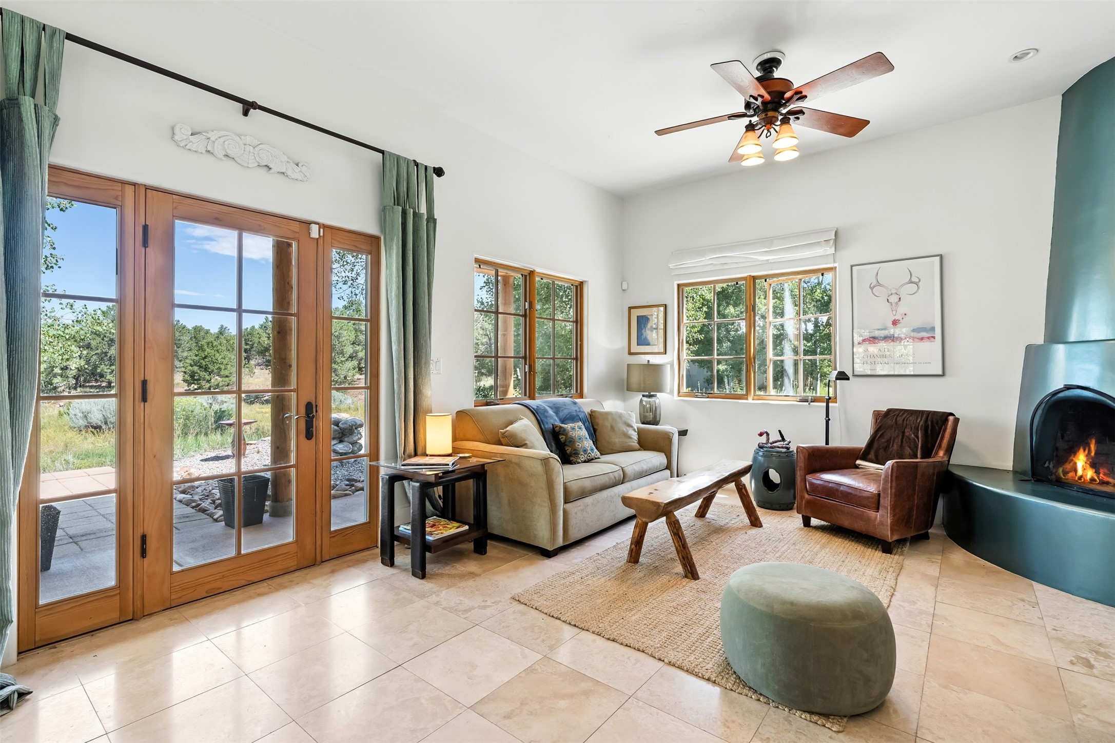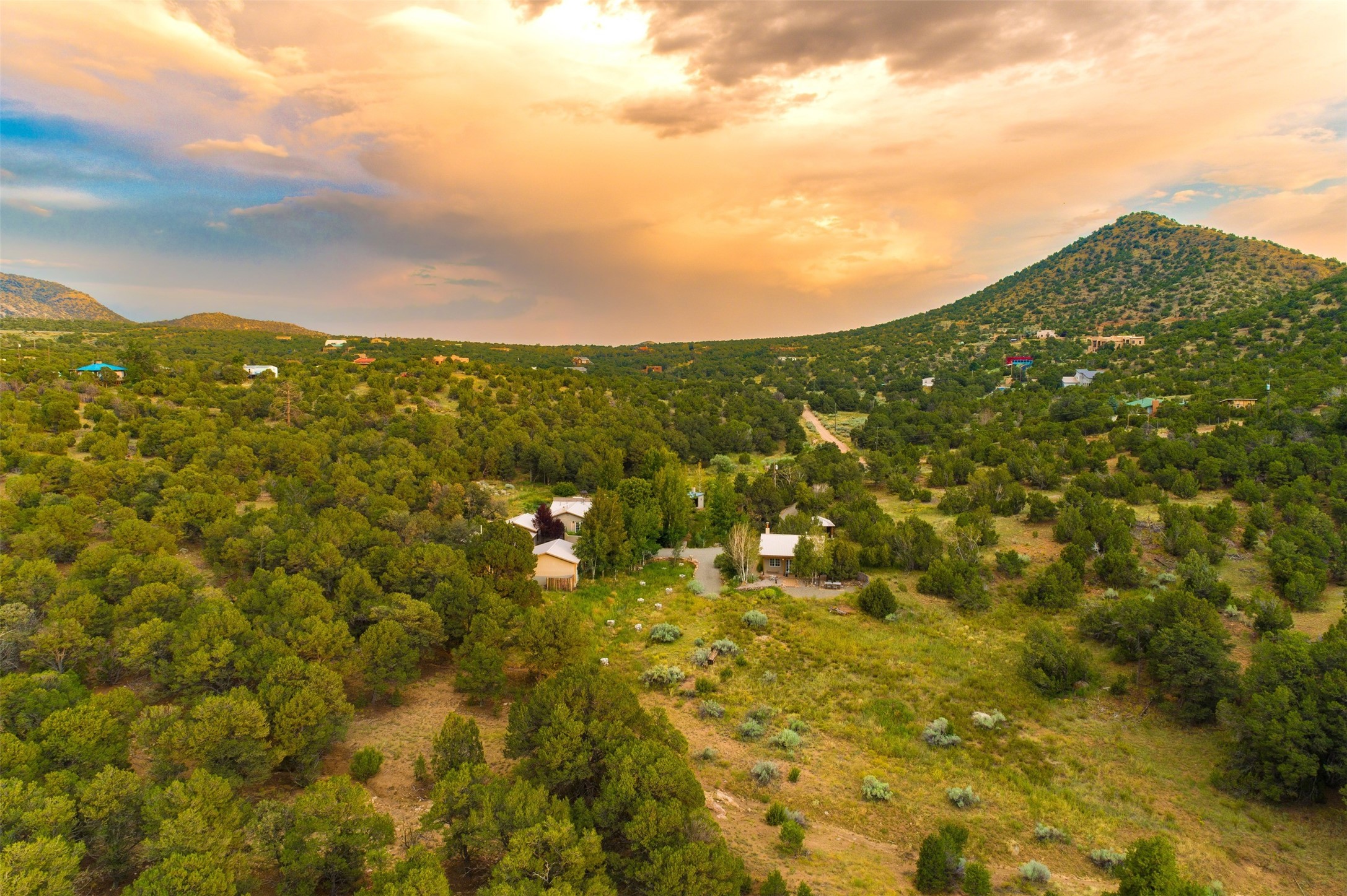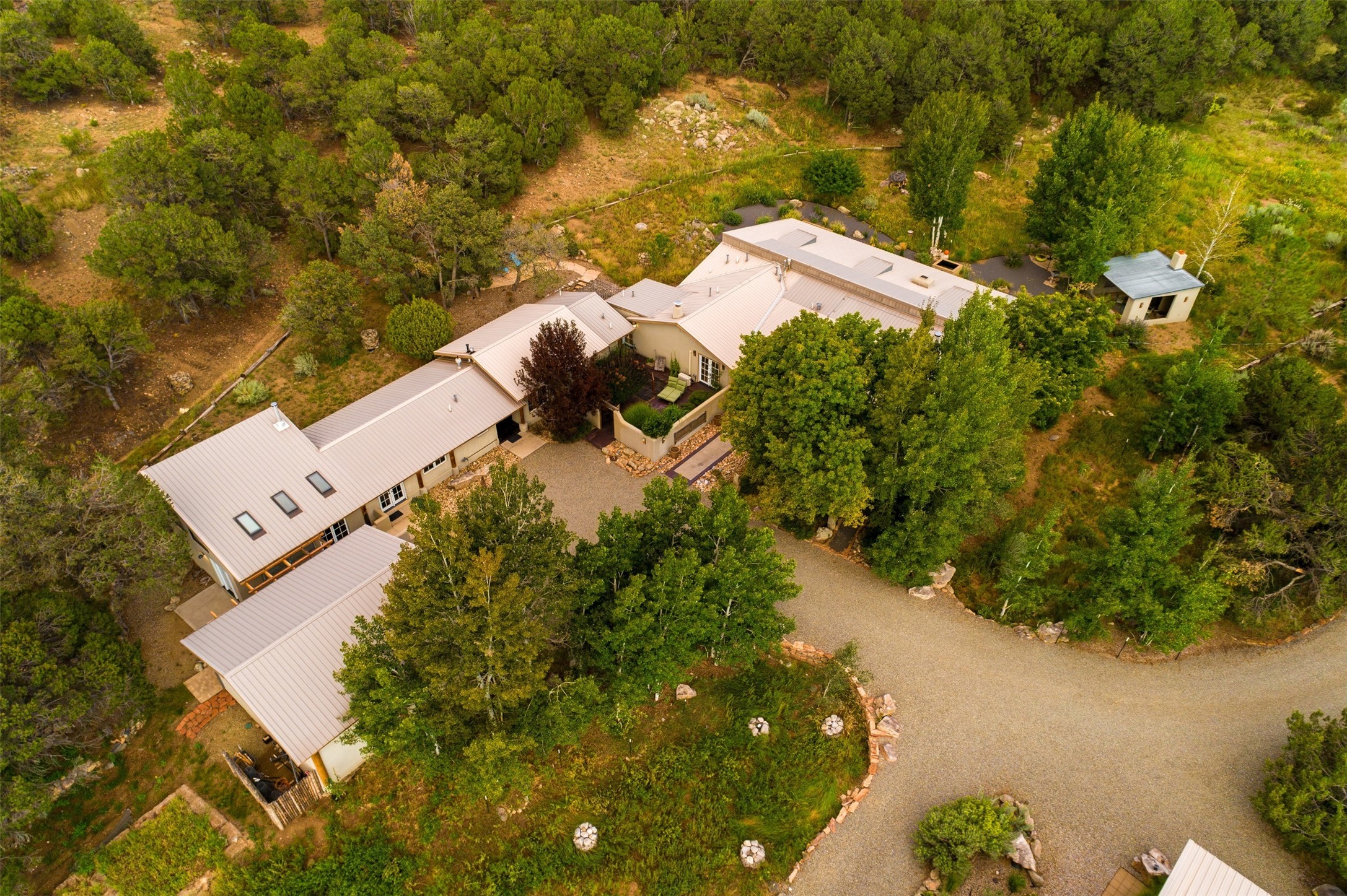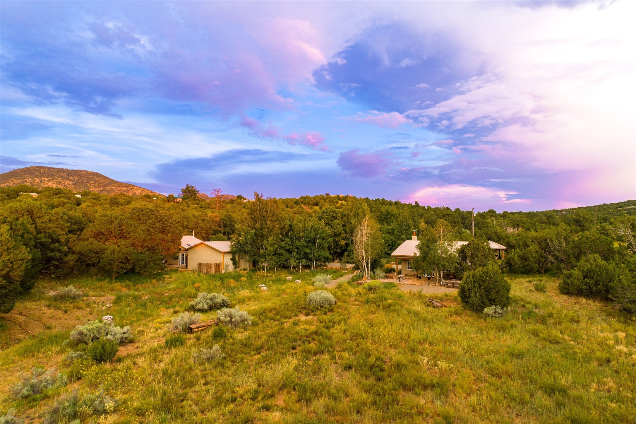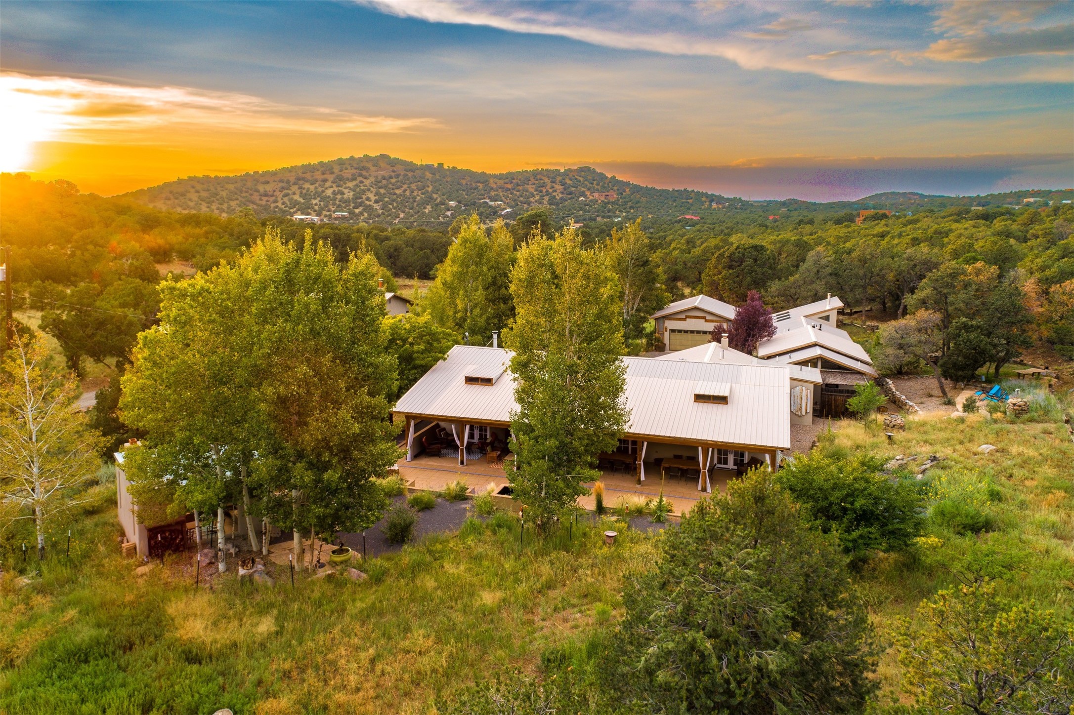 LIVE, WORK, ENTERTAIN, in your own secluded sanctuary located on 7.08 Sunlit Hills acres.10 Sabina Lane is a sophisticated & contemporary COMPOUND offering a wide variety ofliving & working spaces in a stunning pastoral setting, 15 minutes from Santa Fe.MAIN HOUSE - 2,187sqft open concept Great Room w/beamed cathedral ceiling,fireplace, Chef's kitchen w/granite counters, high end appliances, 2 spacious bedrooms w/ensuite bathrooms, laundry area, 5 sets of French door leading to 58 foot long covered portal.GUEST SUITE - 530sqft is steps from the main house & offers an inviting bedroom, spainspired bathroom, custom tiles, soaking tub, is adjoined by a private tranquil terrace.STUDIO/OFFICE - 994sqft amazing work space with vaulted ceiling, view windows, areasfor an office, art or other work related spaces, powder room & covered portal entry. Onewould never need to leave the property to conduct all their business or artistic work.CASITA - 683sqft Set apart from the main house, the casita has a full kitchen w/stonecounters, kiva fireplace, covered portal, stackable washer/dryer. The casitahas produced additional income as an Air B&BGARAGE - 60 sqft Fully finished, 2car capacity, storage areas.GAZEBO -196sqft An inviting space away from the home for meditation & relaxation.PAVILION -241sqft Wonderful retreat area w/fireplace, bancoseating, ceiling fan, designer lighting.The property is accessed through a gated entry, a graveled driveway w/recently addedretaining wall. Many additional aspects - electric convectionstove top, extensive & significant landscaping,10 zone irrigation system,2 owned propane tanks (500 and 250 gallons), 5 fireplaces, an amazing flower filled meadow, healthy pinon, aspen and juniper trees, eclectic river rock pylons, antique wooden bathroom cabinet, a wealth of ceiling fans & mini split in the primarybedroom. For folks seeking a destination, full time live/work situation, please consider 10Sabina Lane.