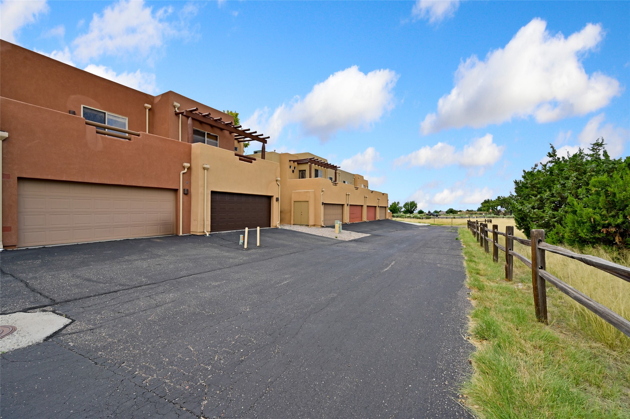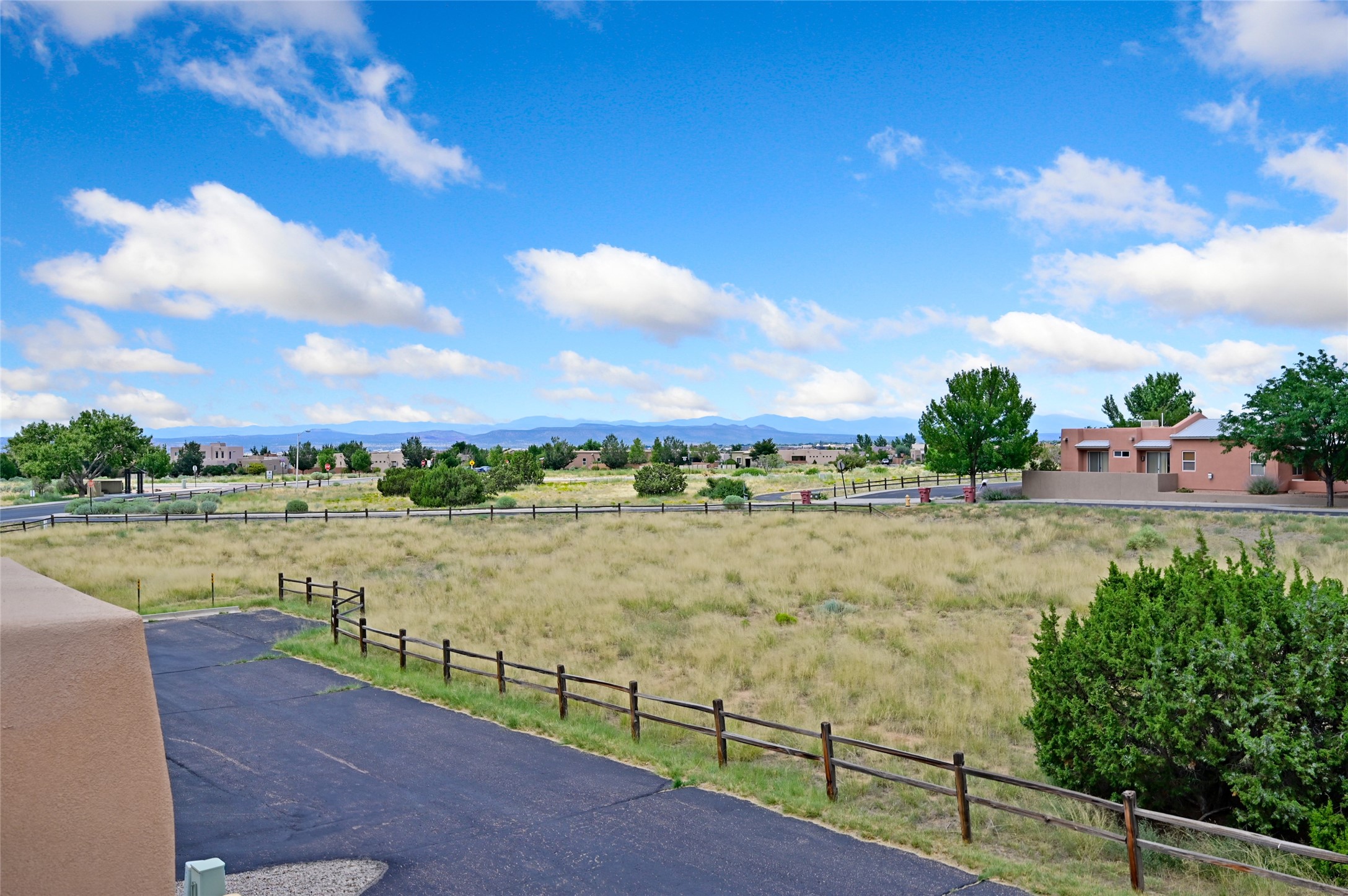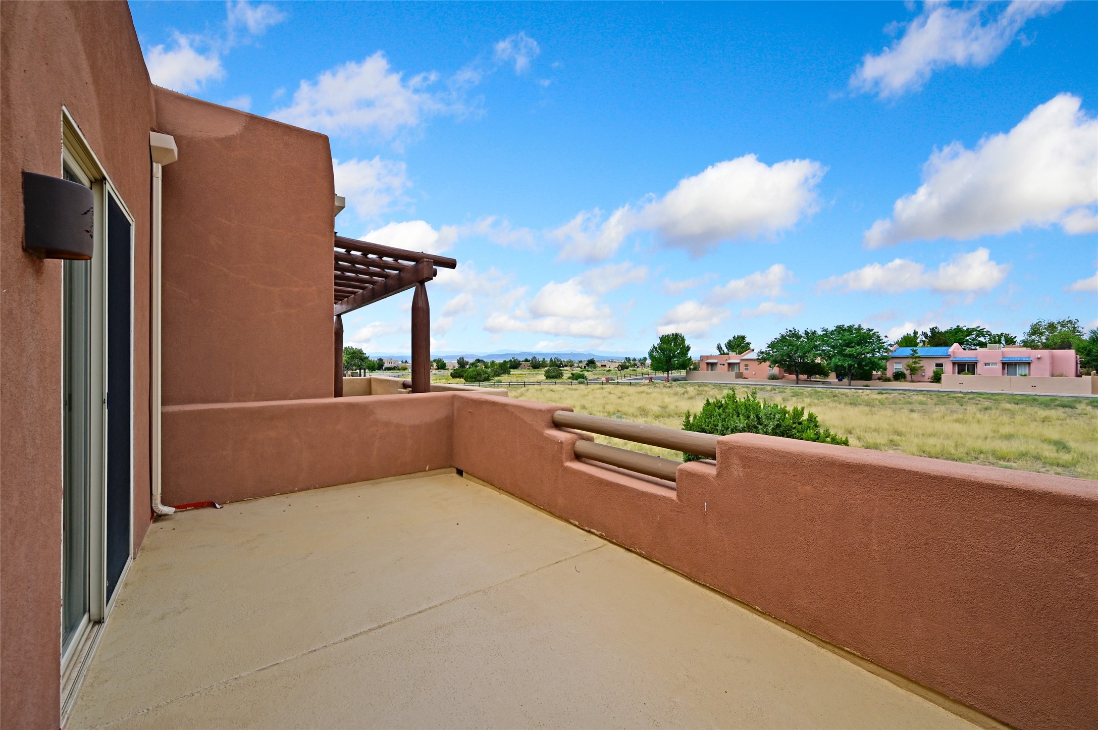 This contemporary pueblo-designed townhome offers 1264 square feet of comfortable living space spread across two levels. On the ground floor, you'll discover a spacious living room featuring a cozy fireplace, a well-appointed kitchen complete with appliances, and a convenient half bathroom. Upstairs, there are two generously sized bedrooms, each boasting its own full bathroom and an extra-large closet providing ample storage. The primary bedroom also includes a private outdoor deck, offering a perfect spot to relax and enjoy the stunning western sunset views. With its private entrance and courtyard, this townhome is designed for very easy and comfortable living. Its location is situated directly across from the Rancho Viejo Village Park Plaza, which provides a peaceful environment with mature trees, lush green grass, and convenient walking trails. The townhome is ideally located on the southwestern side of Santa Fe, surrounded by ample open space perfect for various outdoor activities. Schedule a showing today.
