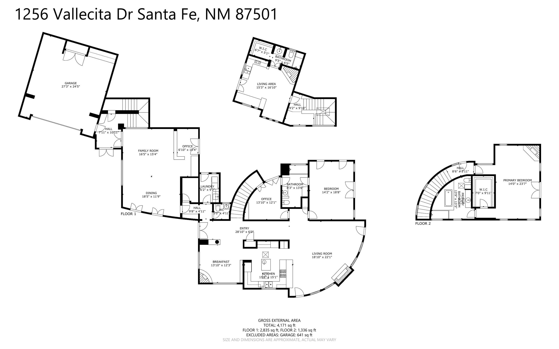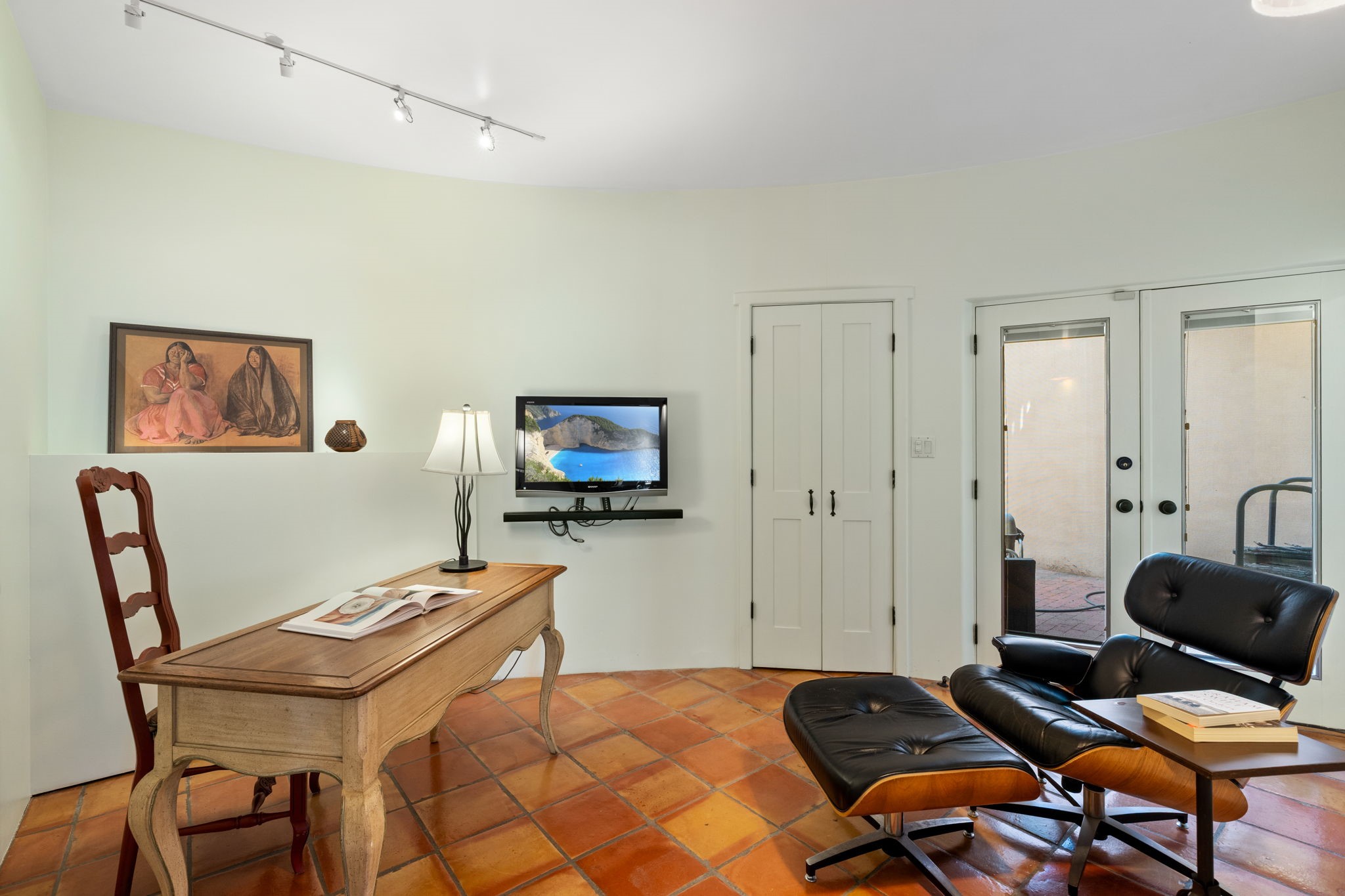 Perched high on a serene hilltop with commanding views of the Sangre de Cristo Mountains, this Santa Fe-style custom estate offers a masterful blend of artistry, comfort, and Southwestern soul. Just minutes from the historic Plaza yet nestled in a private enclave on a full acre, this 4,300-square-foot sanctuary embodies the magic of Northern New Mexico living.Step inside to sun-drenched interiors where massive windows frame mountain vistas. The dining room, with stenciled beams and a corner Kiva fireplace, is perfect for cozy evenings or elegant entertaining. The living room impresses with fan-shaped vigas, a dramatic fireplace, and custom mantle, flowing into a spacious kitchen with granite counters, island, gas stove, copper hood, skylights, and walk-in pantry.Two luxurious Primary Suites ensure privacy. The main-level suite includes a coved ceiling, updated bath, private den, and French doors to a tranquil patio. Upstairs, a curved staircase leads to the second suite with Kiva fireplace, private deck, and bridge walkway to a spectacular 75-foot lap pool.Perfect for gatherings, the entertainment room -- once home to two grand pianos -- opens to the front portal. A charming casita above the two-car garage adds versatility with sleeping space for five, full bath, closet, kitchenette, private patio, and separate entrance.Blending Santa Fe craftsmanship, modern updates, and breathtaking surroundings, this home is more than a residence -- it is a living work of art and a rare opportunity to own a piece of Santa Fe's soul.